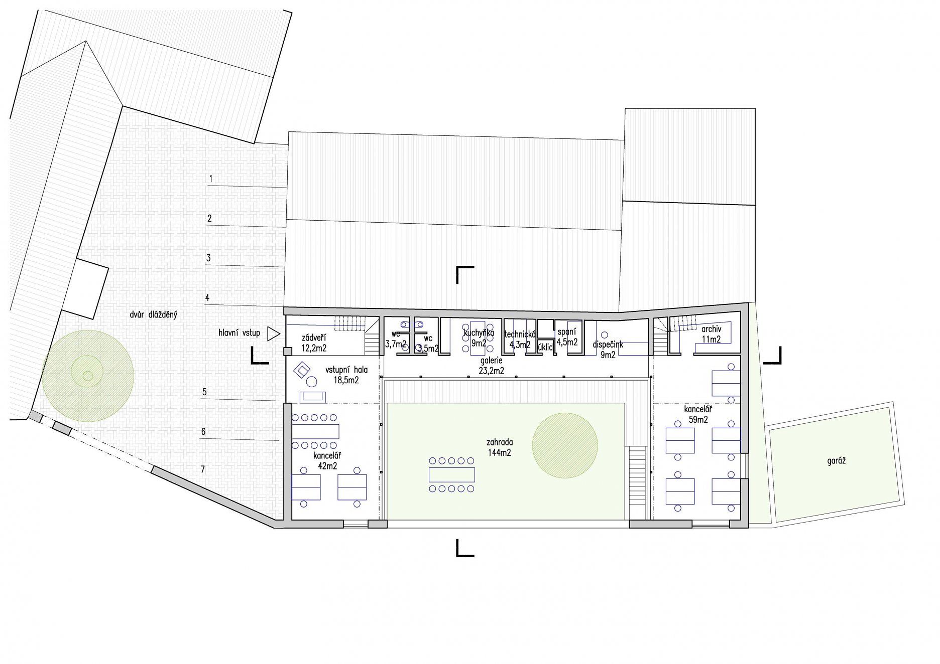 Kancelárie v starej hospodárskej časti Plzne. Na rozdiel od klasických administratívnych alebo polyfunkčných blokov, ktoré sú pre novú zástavbu v tejto oblasti typické, vyniká práca pražského ateliéru ov-a citlivým narábaním s kontextom a snahou o humanizáciu pracovného prostredia.