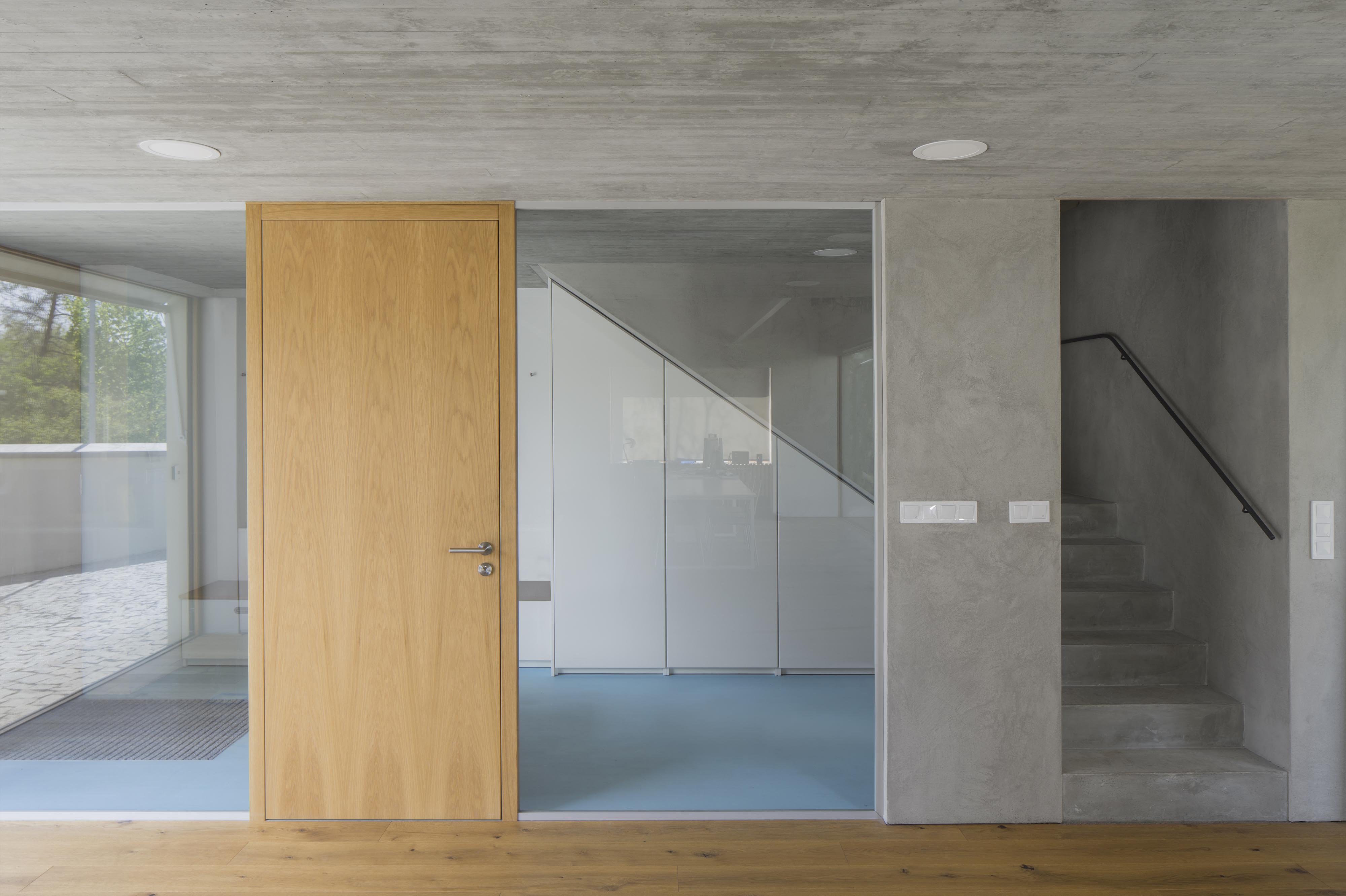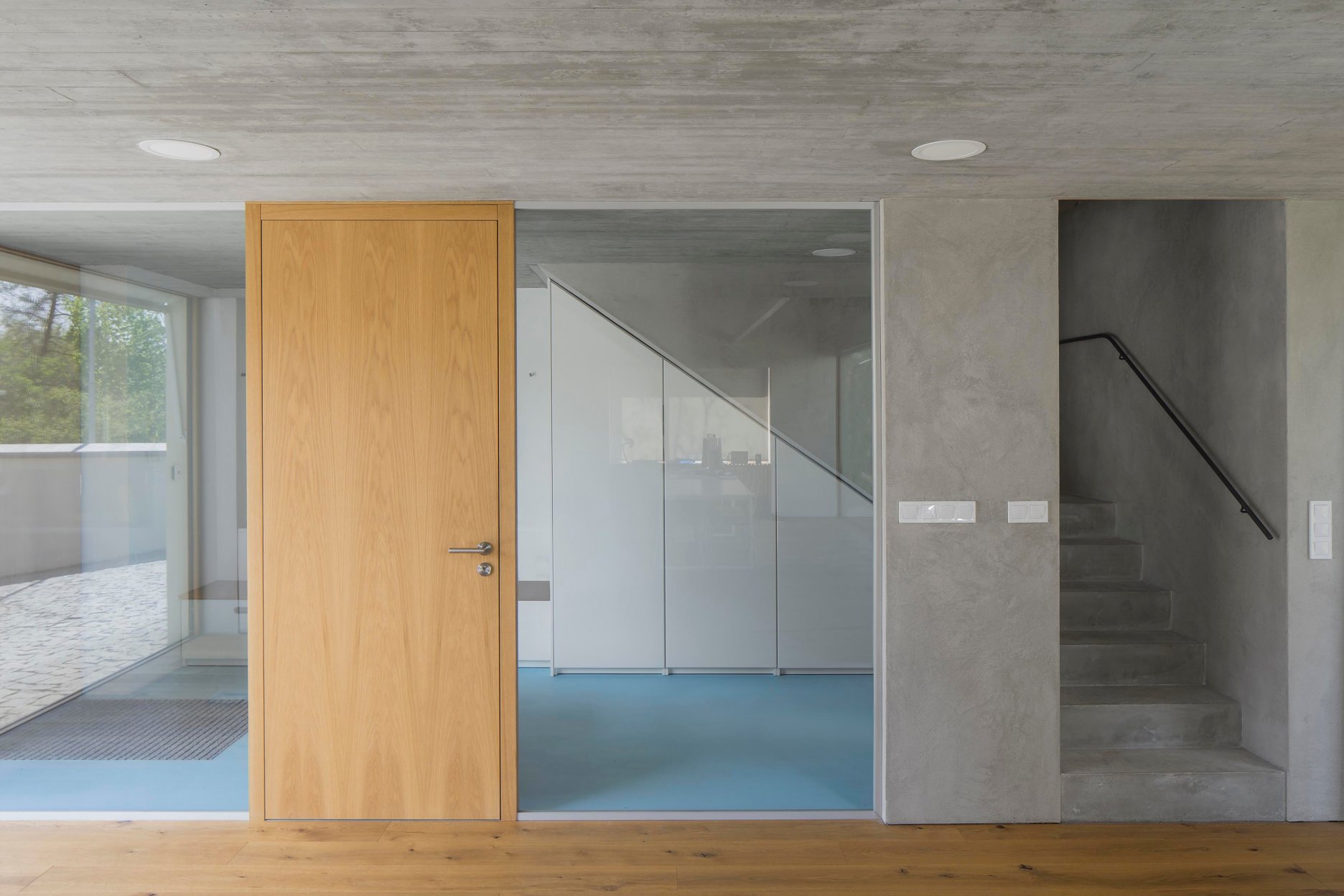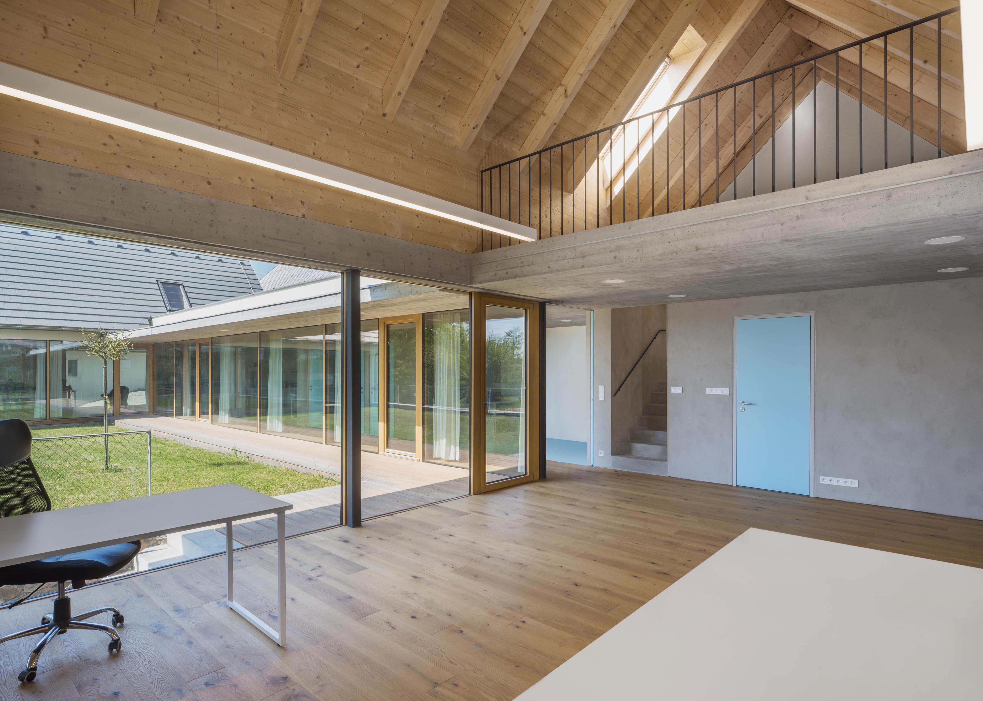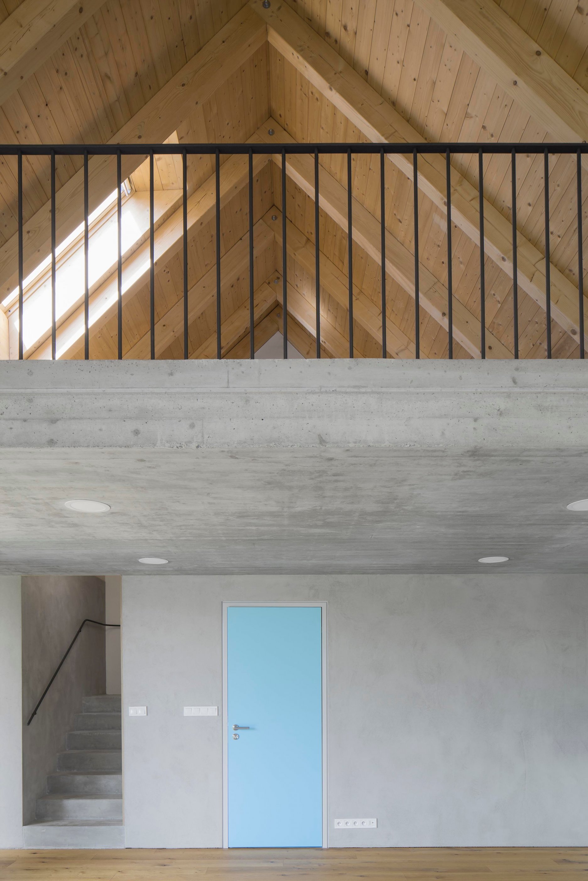 Kancelárie ktoré sú otvorené do krovu, veľkopriestor je možné predeliť posuvnými dverami. Firemná pastelovo modrá farba, použitá v interiéri, dopĺňa prevládajúce priznané povrchy a materiály - betónový strop, drevené parkety a krov...