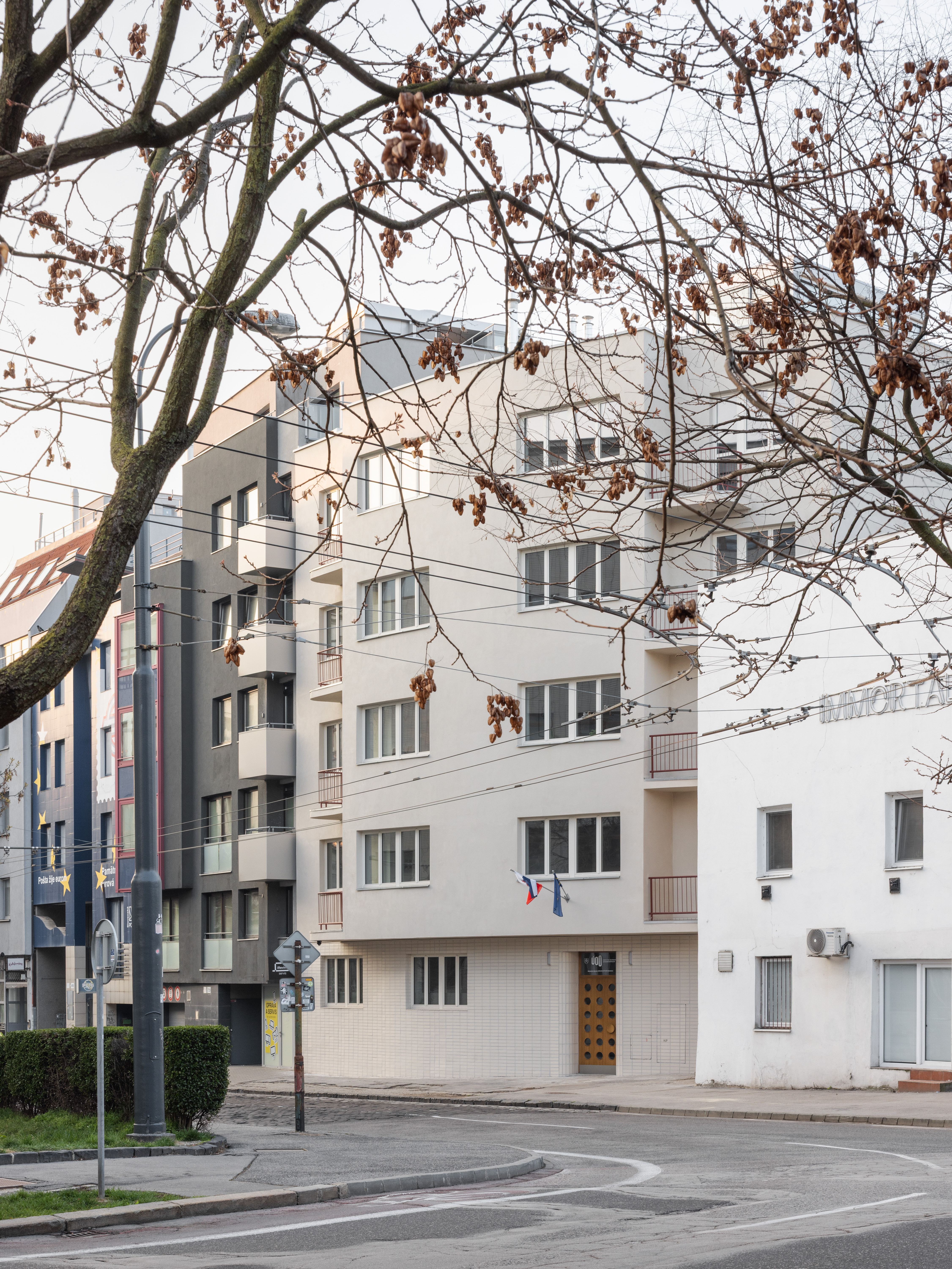 Najväčšou výzvou rekonštrukcie bolo zachovať proporcie budovy a subtílnosti pôvodných konštrukcií bez toho, aby došlo k zmene jej celkového výrazu, a aby súčasne spĺňala požiadavky investora na energetickú úsporu. Dôležitou súčasťou rekonštrukcie bolo použitie kvalitných a trvácnych materiálov, nadviazanie na tradíciu, okolitú architektúru a prirodzené doplnenie mestskej štruktúry. V pôvodnom riešení bolo jasne čitateľné odlíšenie fasády parteru od zvyšku domu. Toto odlíšenie sme posilnili, parter sme obložili kabrincom v jemnej farebnosti. Kabrinec je jeden z prvkov, ktoré nadväzujú na staviteľskú tradíciu v tejto časti mesta (Poštový palác, budova FAD STU,…). Zvyšok fasády je omietnutý organickou omietkou v príbuznej farebnosti. O čosi výraznejším prvkom sú zábradlia – repliky pôvodných oceľových zábradlí v bordovej farbe. Pôvodne presklené vstupné dvere sme nahradili drevenými, plnými, inšpirovanými architektúrou 40. a 50. rokov. Taktiež sme pracovali so zvýraznením vstupu objektu jeho zaoblením, ale aj remeselne spracovaným portálom. Na streche bola vybudovaná spomínaná strešná terasa. Jej organické tvarovanie narúša striktnosť architektúry samotného objektu a súčasne odráža nám blízku hravosť v architektúre.