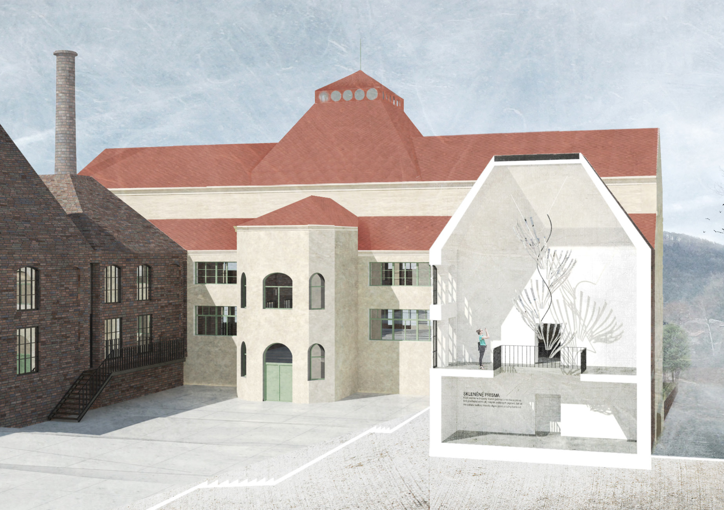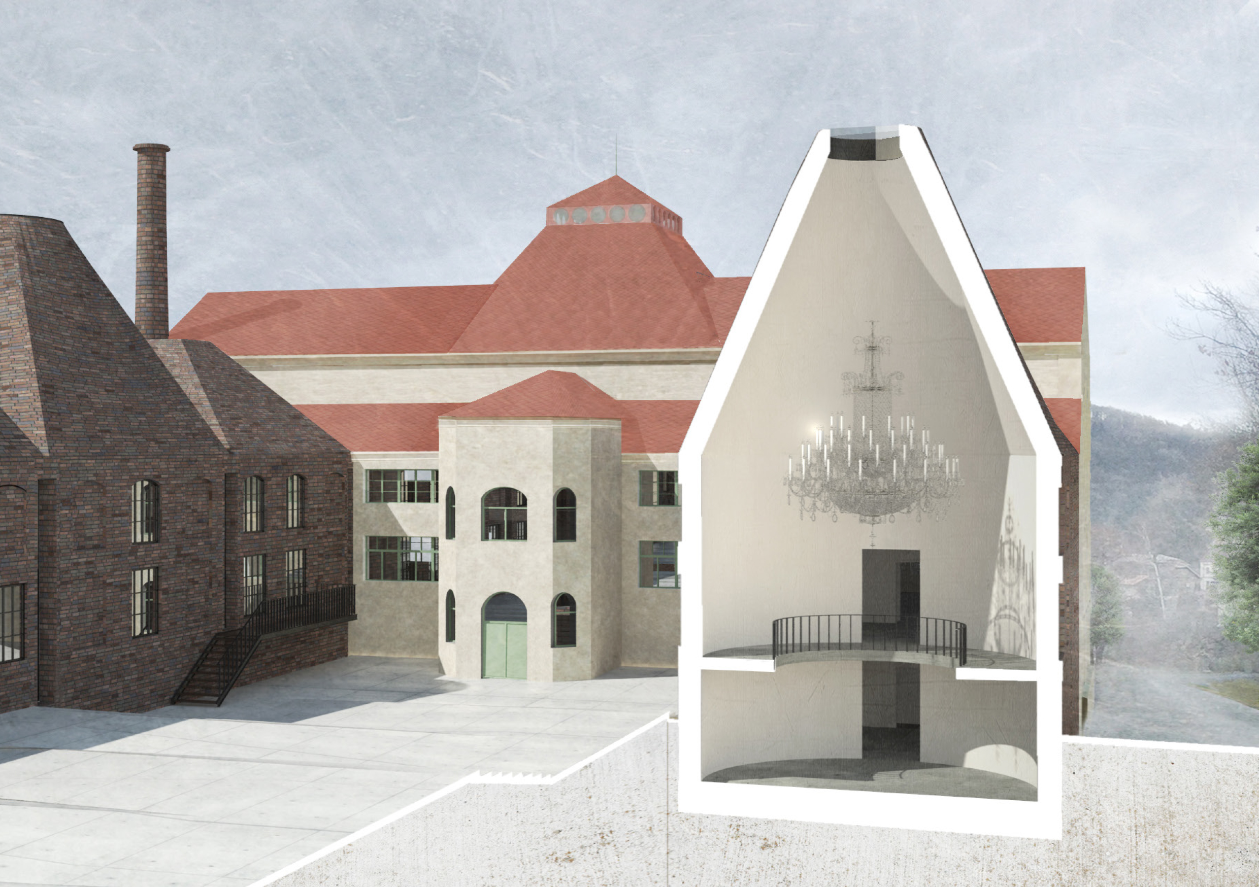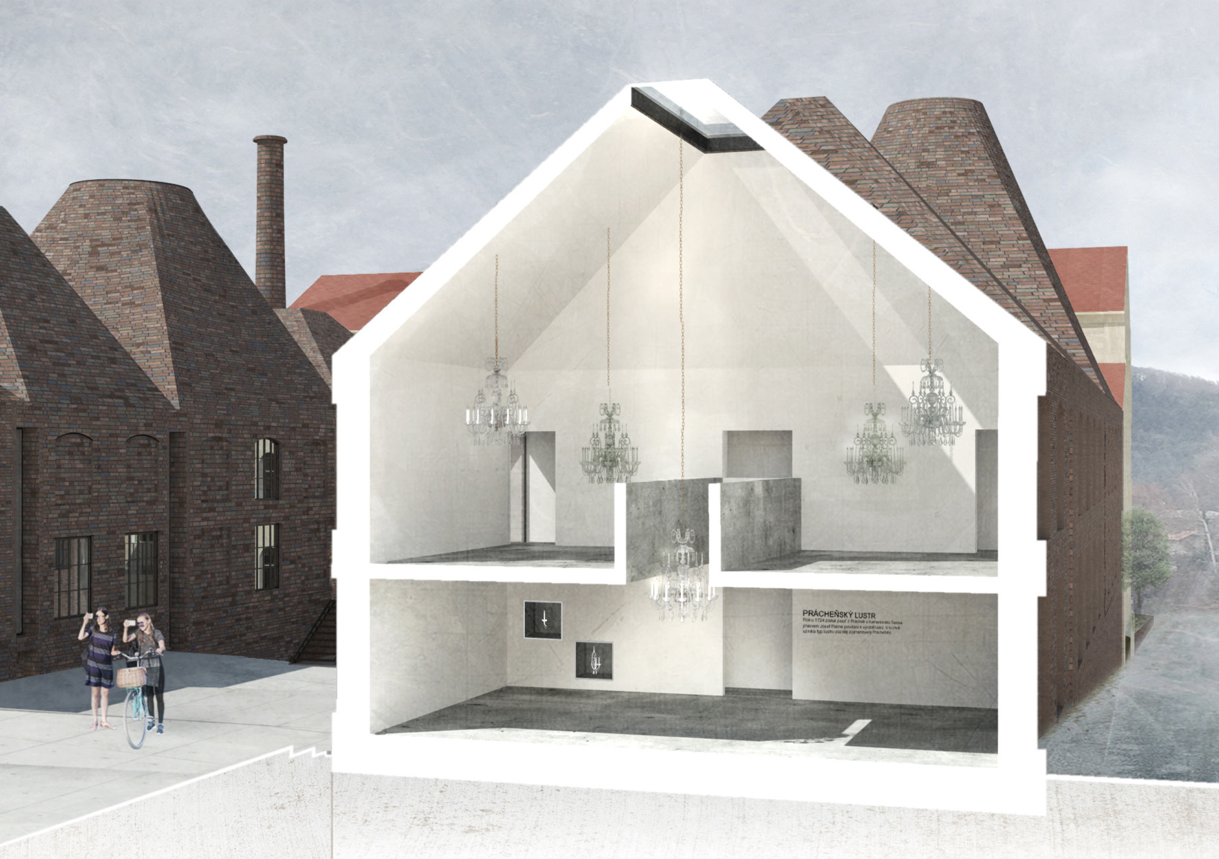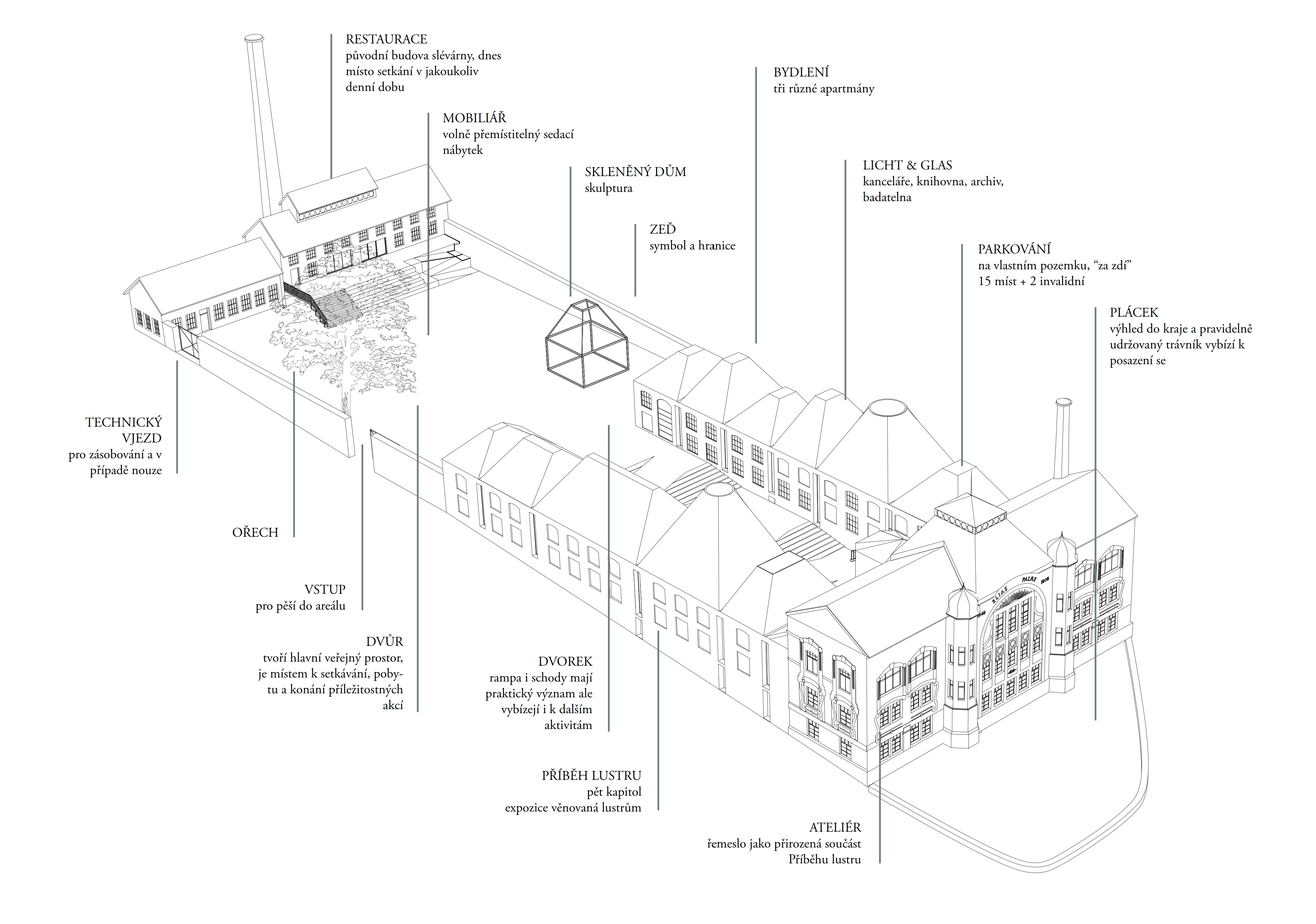 Areál je vymezený zdí, za níž se nacházejí za sebou jdoucí hmoty vycházející z tvarosloví původních sklářských hutních pecí. Vnitřní prostor je utvářen pod vlivem hlavní myšlenky – jediné, co lustr ke své existenci potřebuje, jsou zdi vymezující jeho prostor. Zdi jsou pak jediným svědkem Příběhu lustru a všechen ostatní život se odehrává v nich.