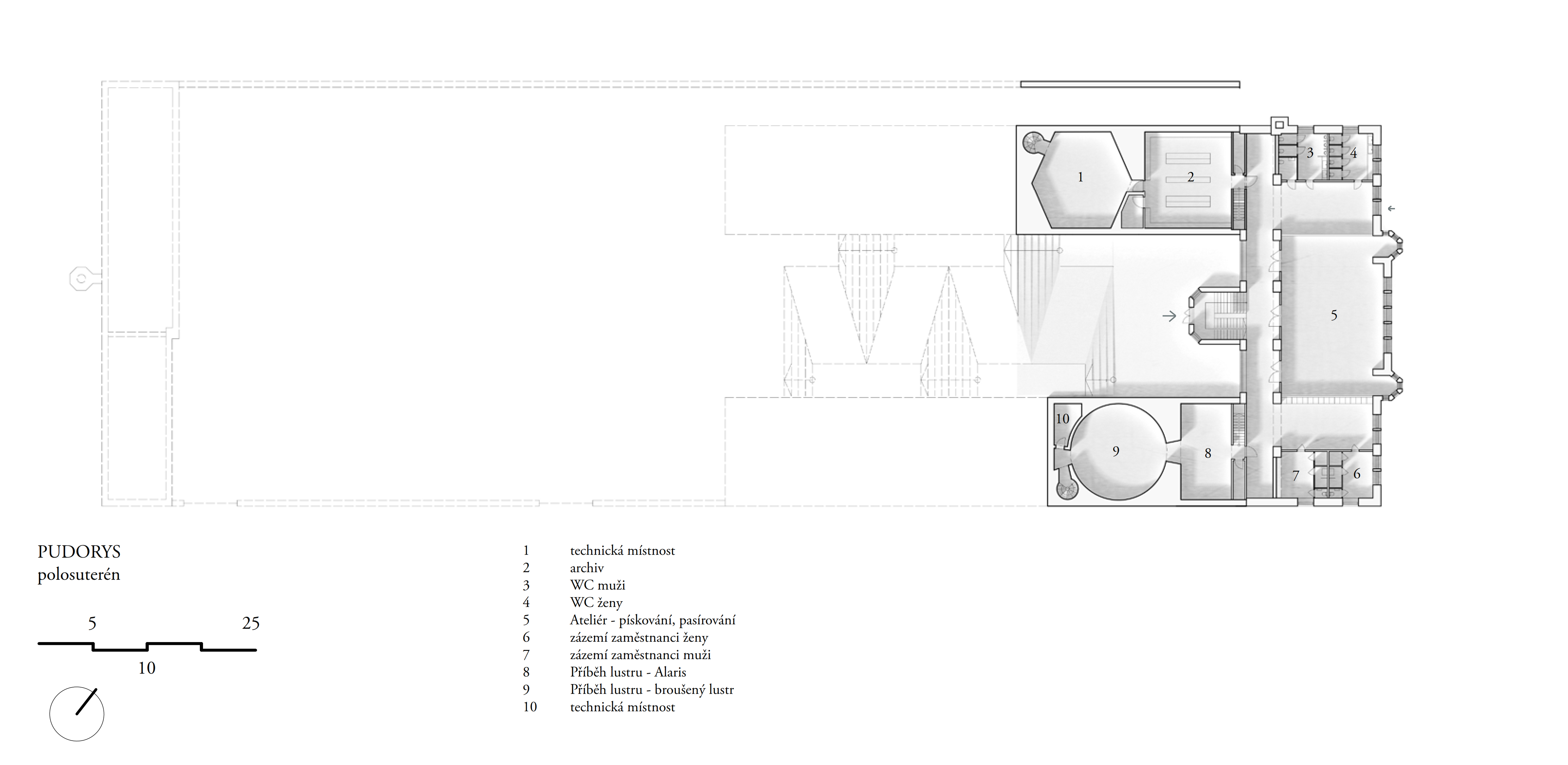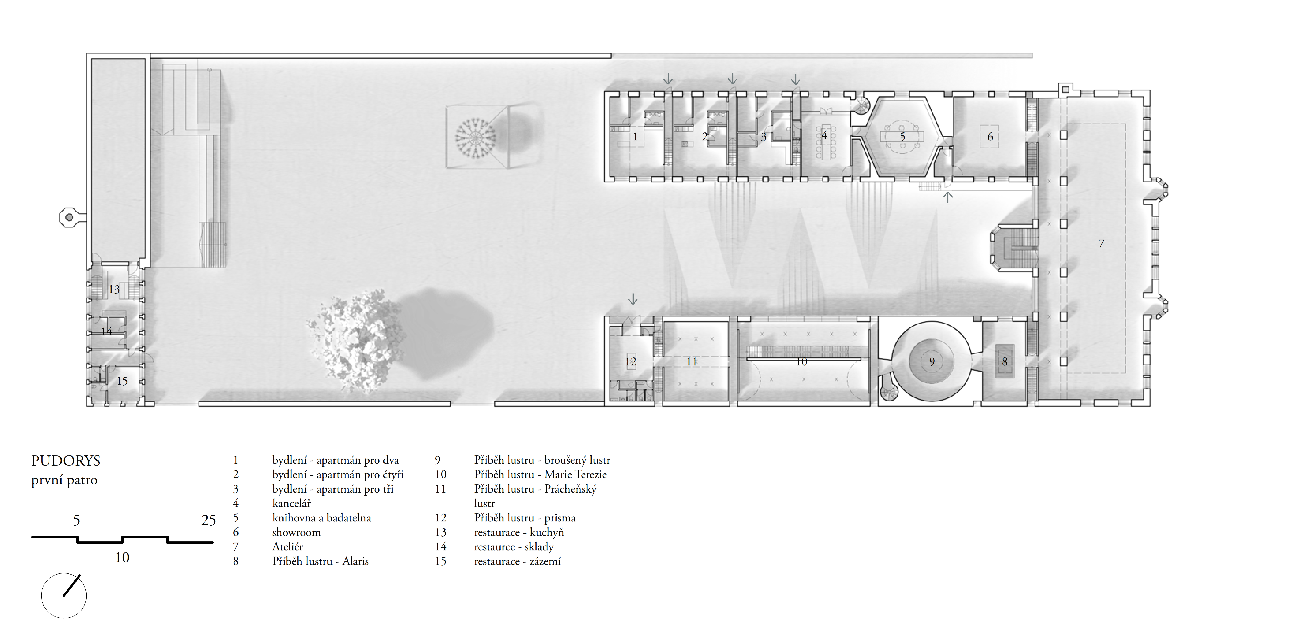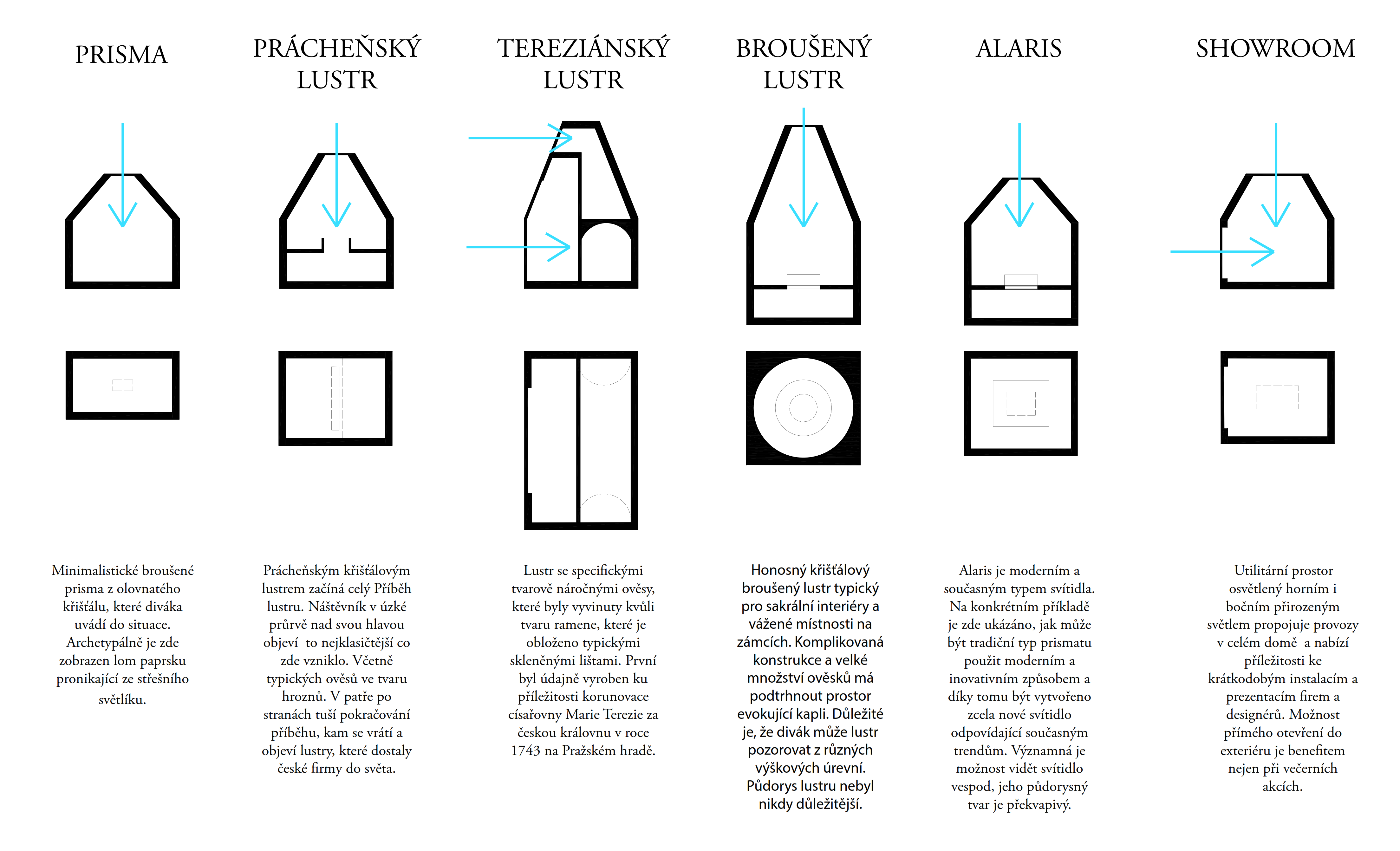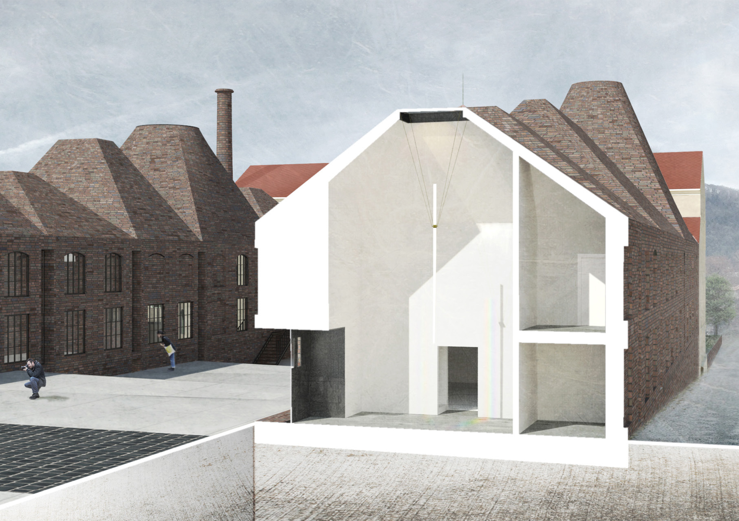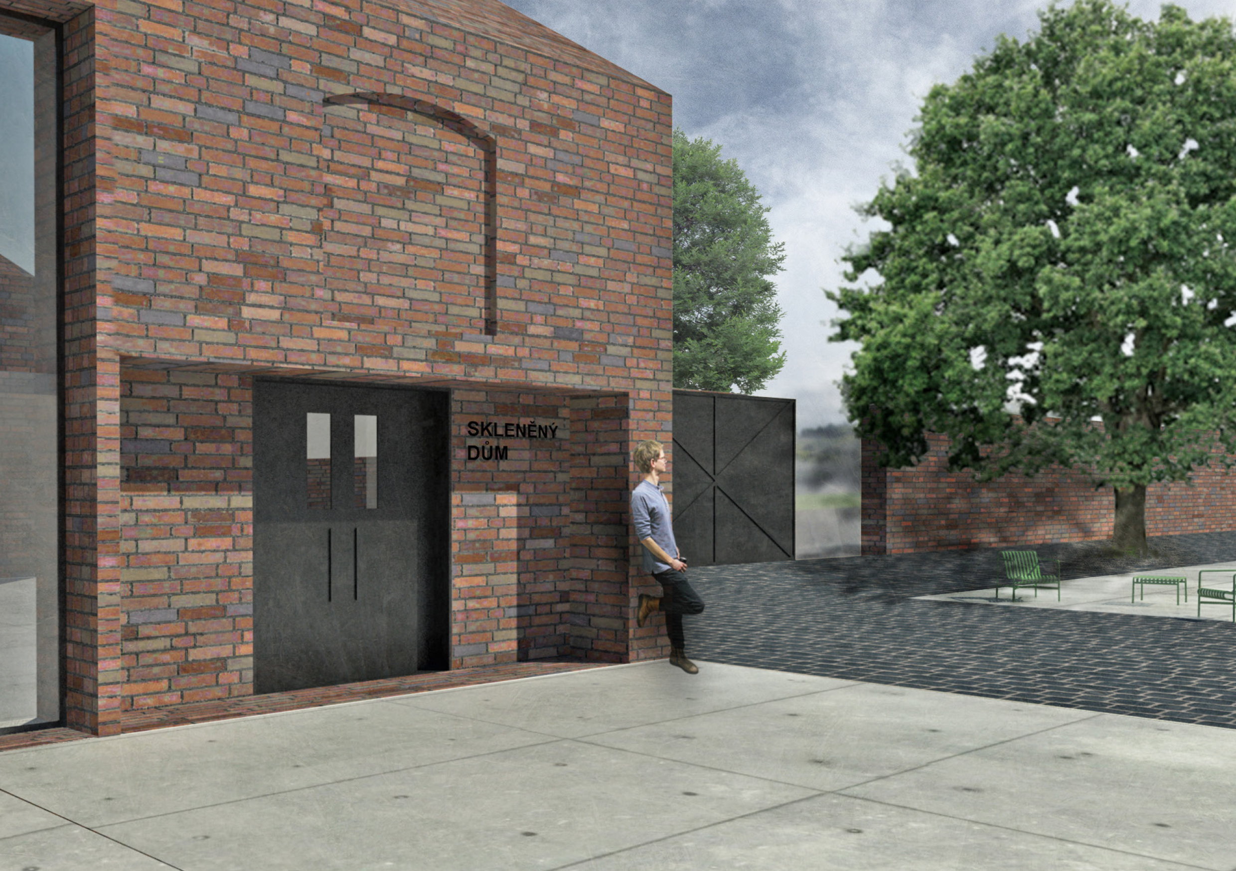Areál je vymezený zdí, za níž se nacházejí za sebou jdoucí hmoty vycházející z tvarosloví původních sklářských hutních pecí. Vnitřní prostor je utvářen pod vlivem hlavní myšlenky – jediné, co lustr ke své existenci potřebuje, jsou zdi vymezující jeho prostor. Zdi jsou pak jediným svědkem Příběhu lustru a všechen ostatní život se odehrává v nich.