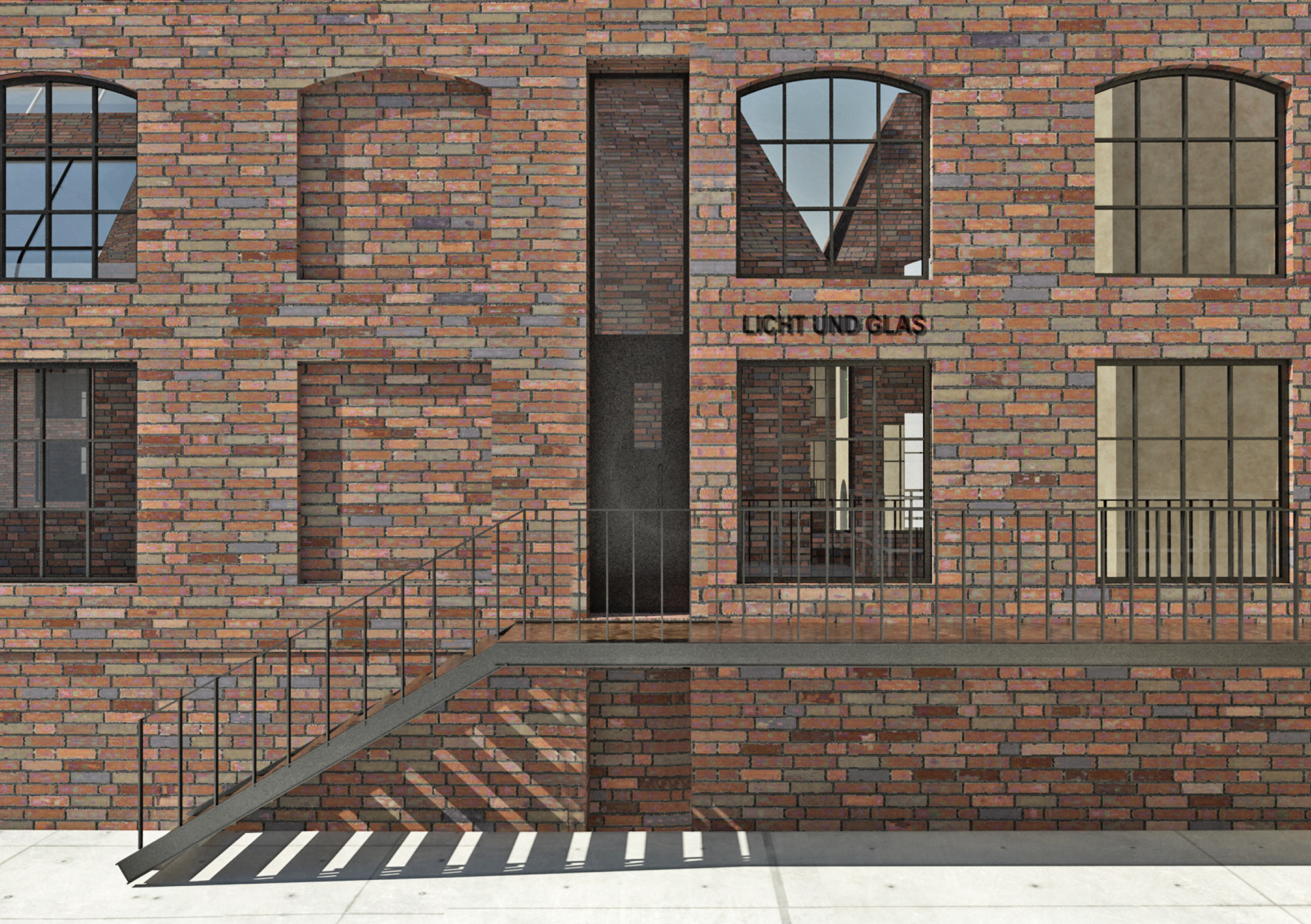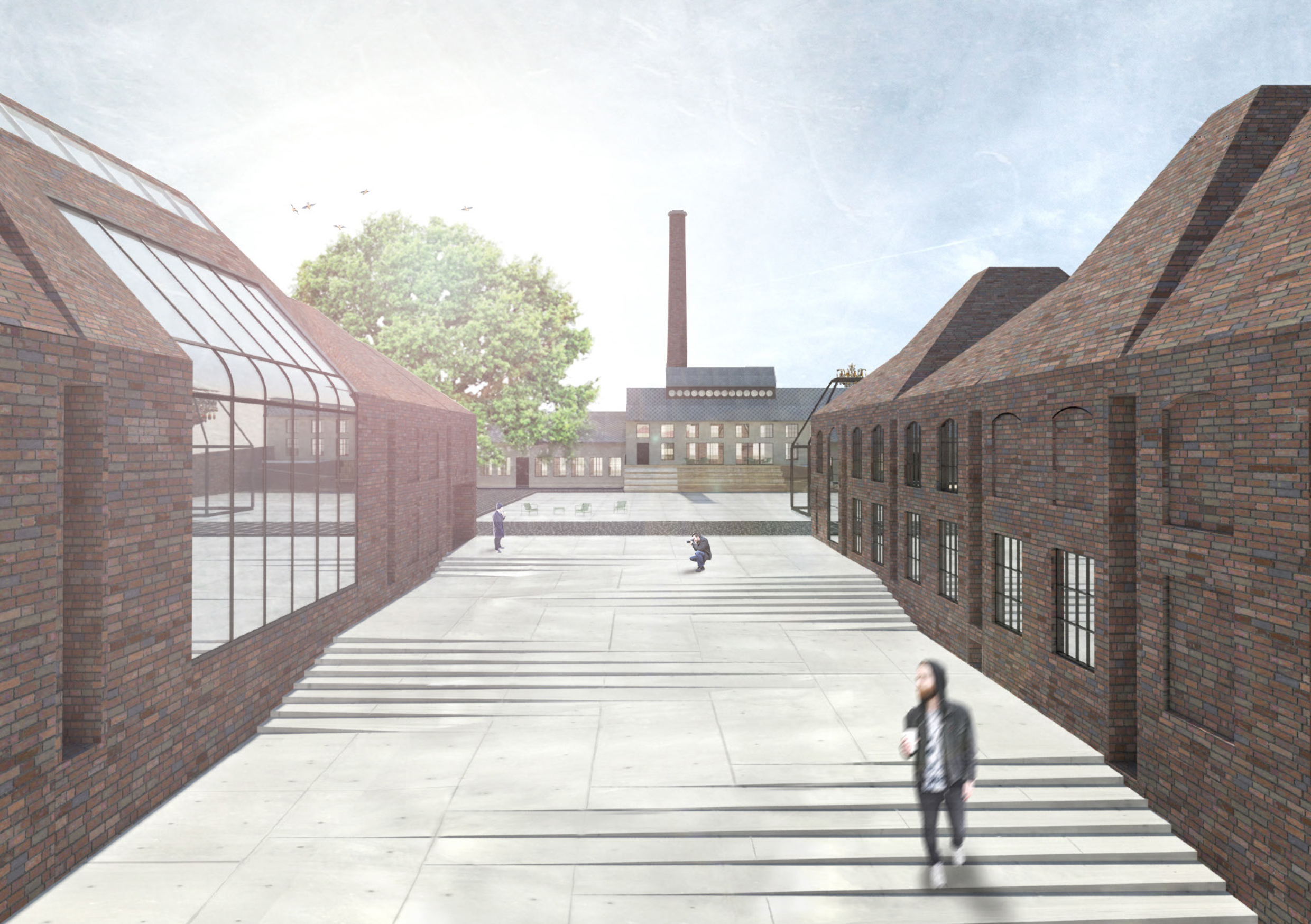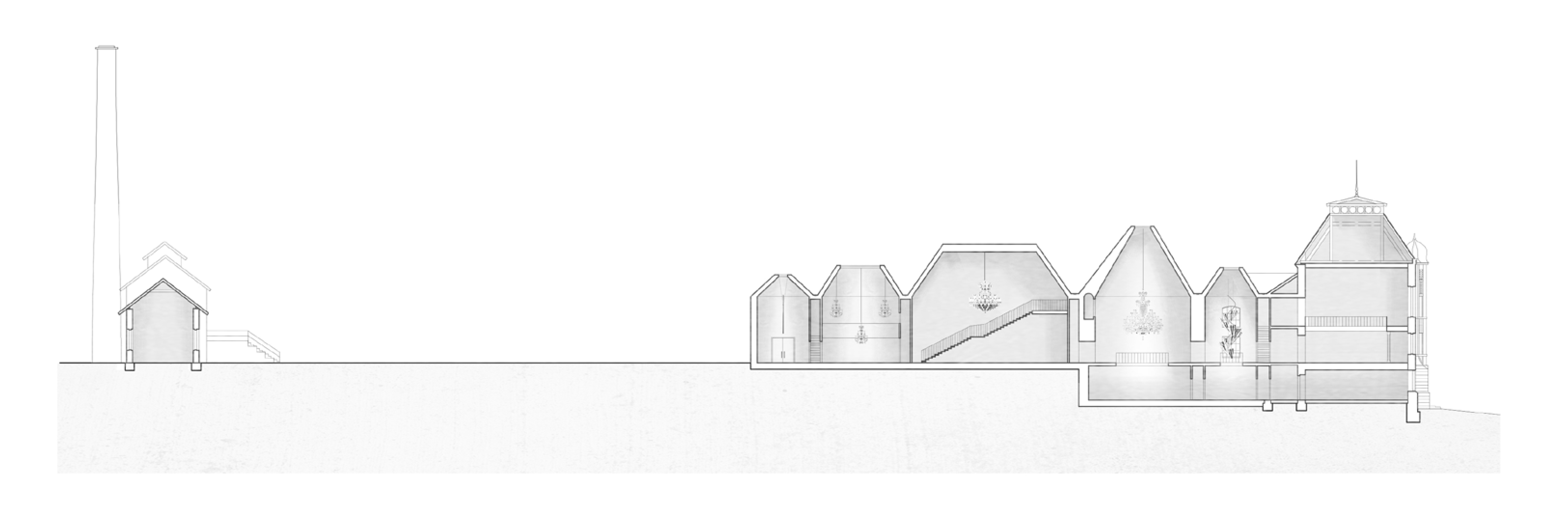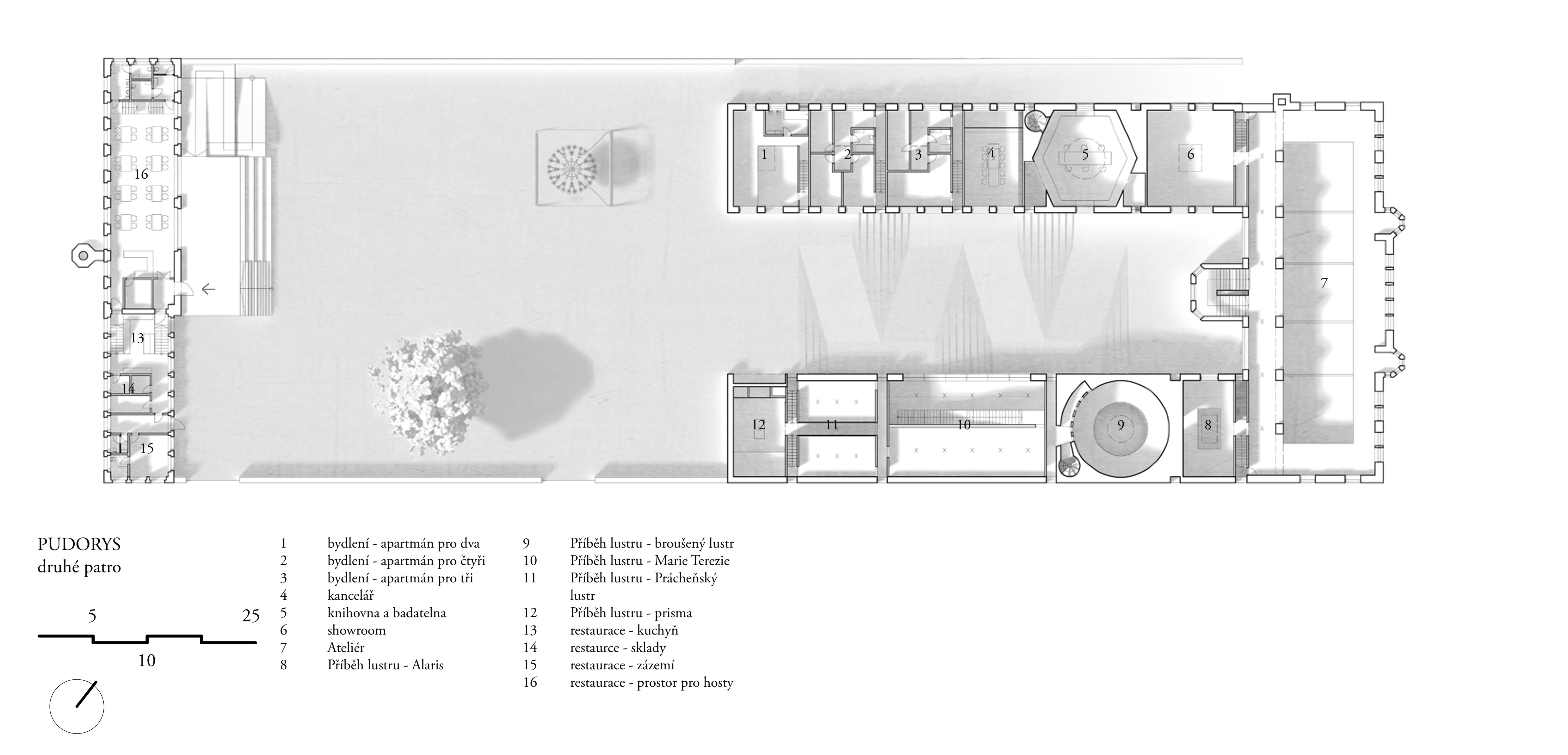 Areál je vymezený zdí, za níž se nacházejí za sebou jdoucí hmoty vycházející z tvarosloví původních sklářských hutních pecí. Vnitřní prostor je utvářen pod vlivem hlavní myšlenky – jediné, co lustr ke své existenci potřebuje, jsou zdi vymezující jeho prostor. Zdi jsou pak jediným svědkem Příběhu lustru a všechen ostatní život se odehrává v nich.