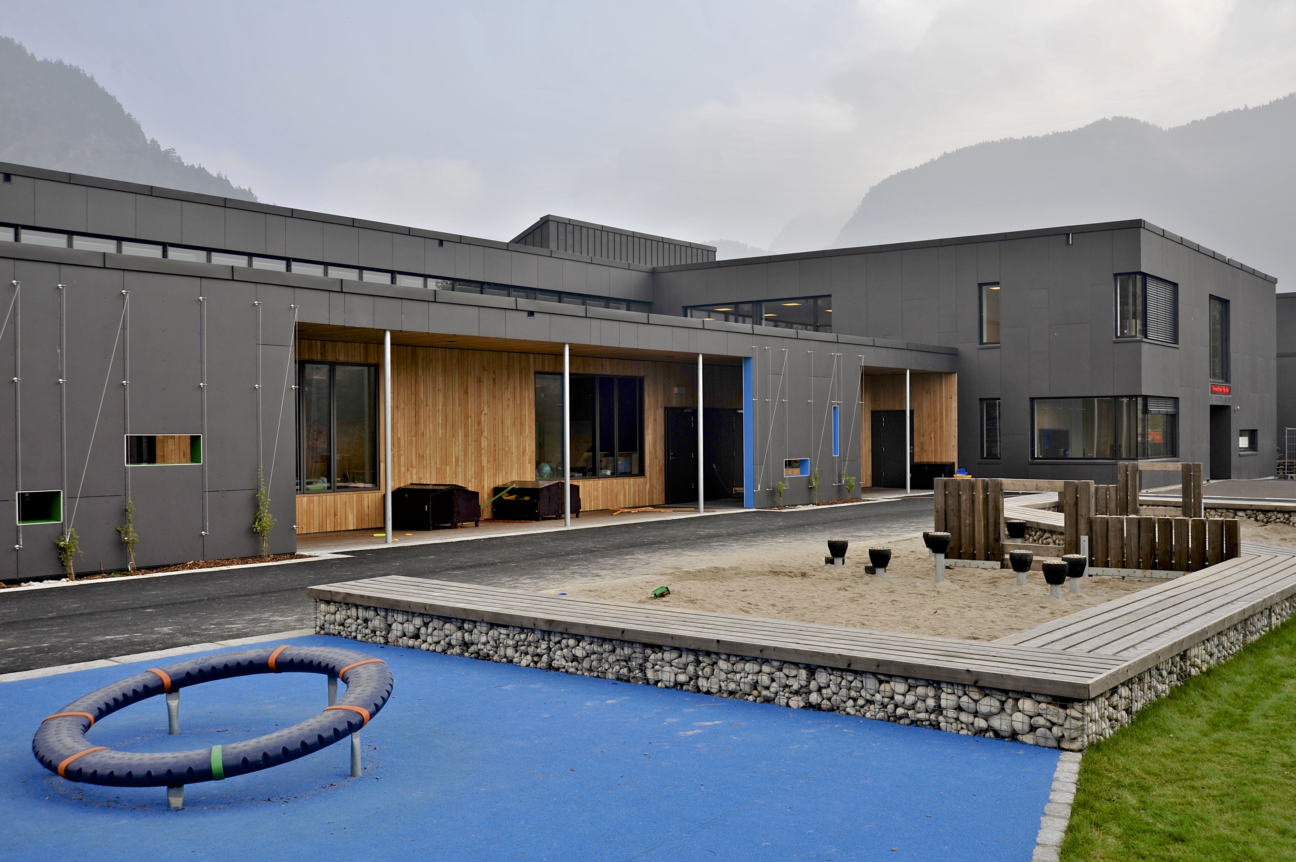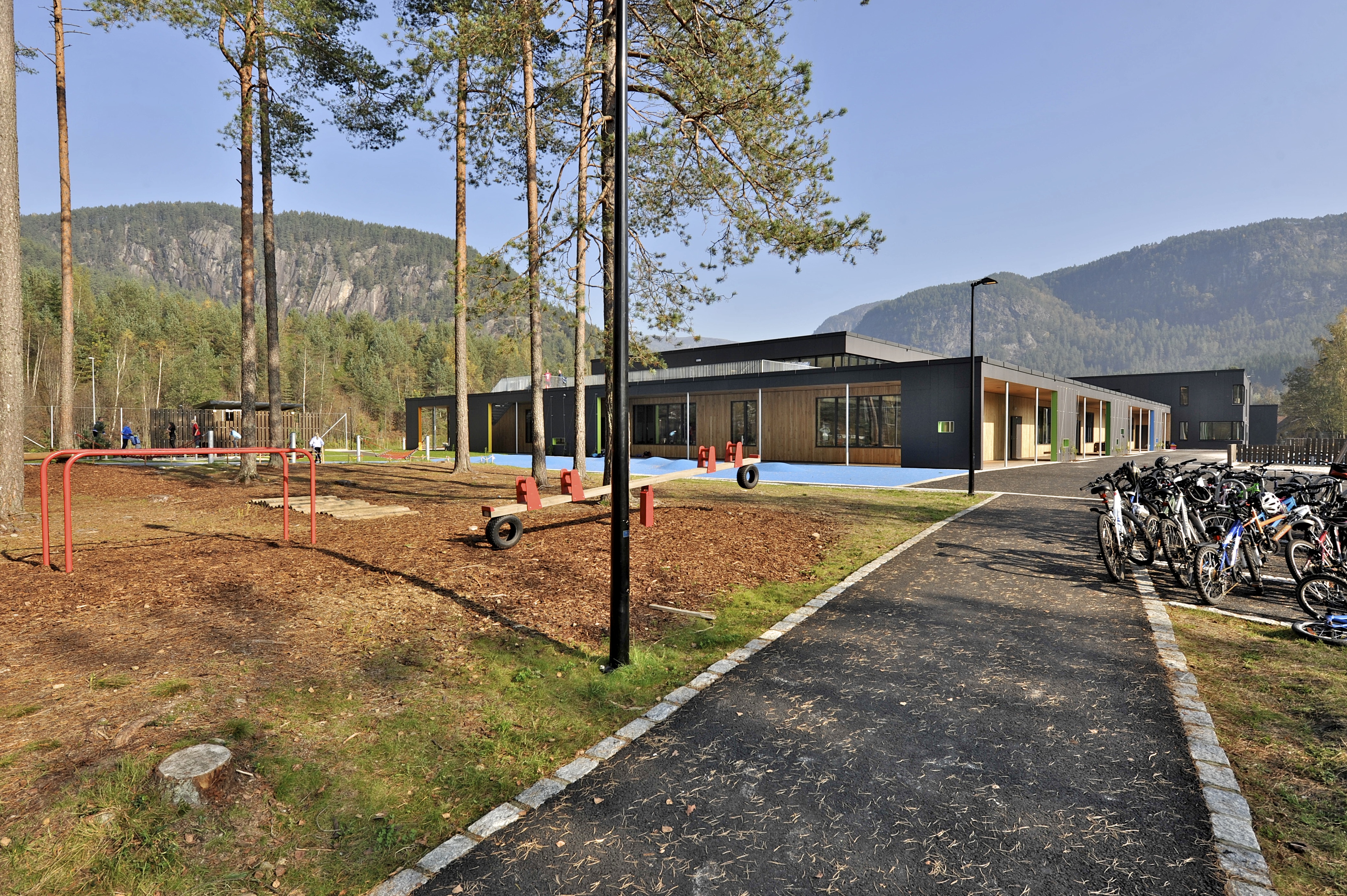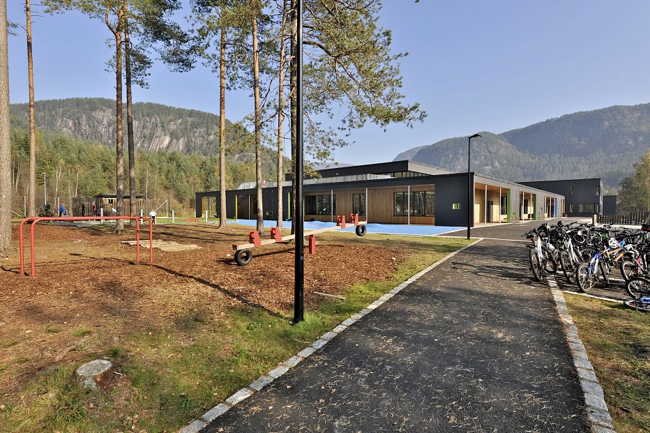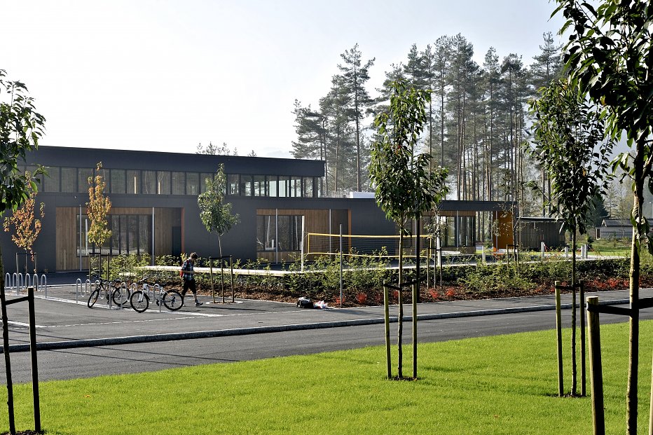 Farebne stroho poňatú fasádu oživuje drevený (dubový) obklad a lokálne akcenty z farebných panelov. Architekti tiež citlivo pracovali s veľkoplošnými oknami a pravidelnými rastrami menších okien. Tmavý plášť objektu vytvára prvý plán vnímania objektu. Javí sa ako prirodzená súčasť drsného severského lesa v pozadí. V druhom pláne sivú hmotu odľahčujú zasunuté závetria ako vstupy do jednotlivých tried so svetlým dreveným obkladom a subtílnymi stĺpmi. Týmto zasunutím vznikla okolo budovy chránená ochodza. Celkový dojem z exteriéru rozveseľujú modré a zelené pásy na okenných osteniach.