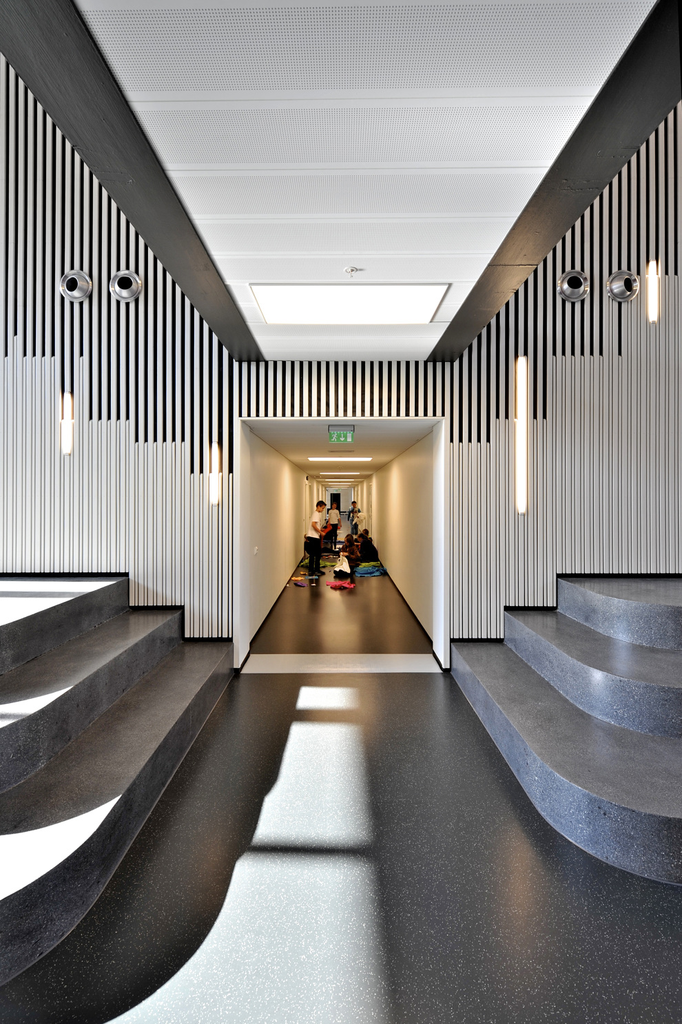 Západné a východné krídlo sa spájajú v rozľahlom školskom vestibule. Vzdušný svetlý interiér zaplavuje denné svetlo z okien umiestnených doslova pod krídlami strechy. Nadčasovú kombináciu sivej liatej podlahy, čierneho kovového zábradlia a bielej farby na stenách pretepľuje drevený funkčný mobiliár a drevený obklad stien z brezovej preglejky natretej nabielo.