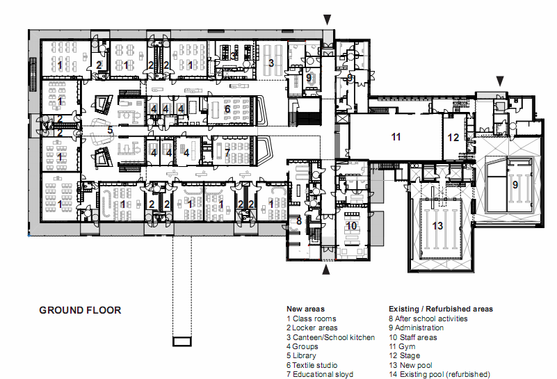Žiaci prichádzajú do tried samostatnými vchodmi. Tie sú rozmiestnené po obvode budovy, takže majú dostatok denného svetla. Pred vstupom do každej triedy majú deti šatne a vlastné WC. Triedy majú vždy dvoje dvere, okrem tých zo šatne vedú ďalšie do spoločnej chodby. V strede školskej budovy sú umiestnené rôzne obslužné priestory, laboratóriá a schodiská. Denné svetlo sem dopadá z pásových okien bazilikálneho typu alebo sklenenými stenami otočnými do vestibulu.
