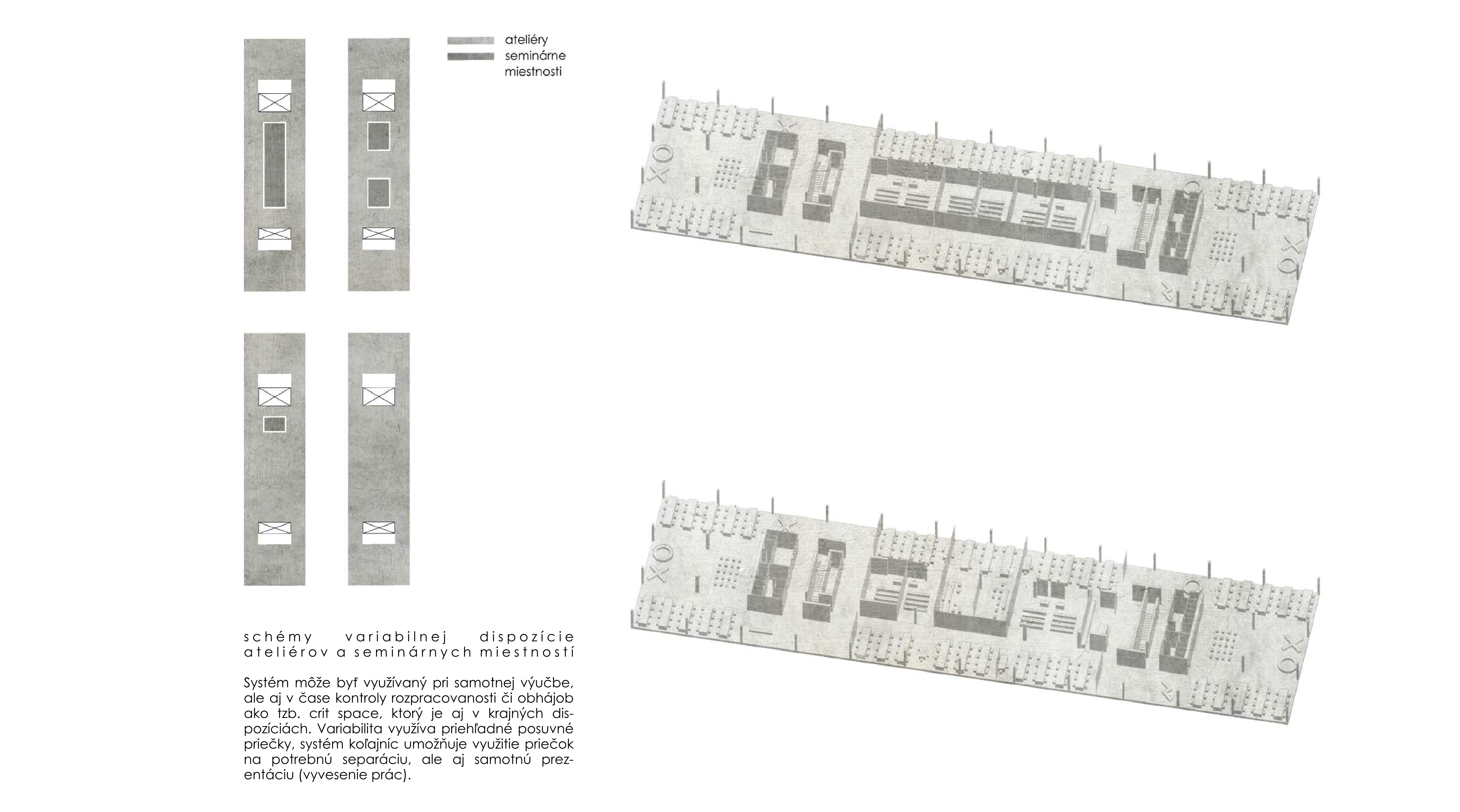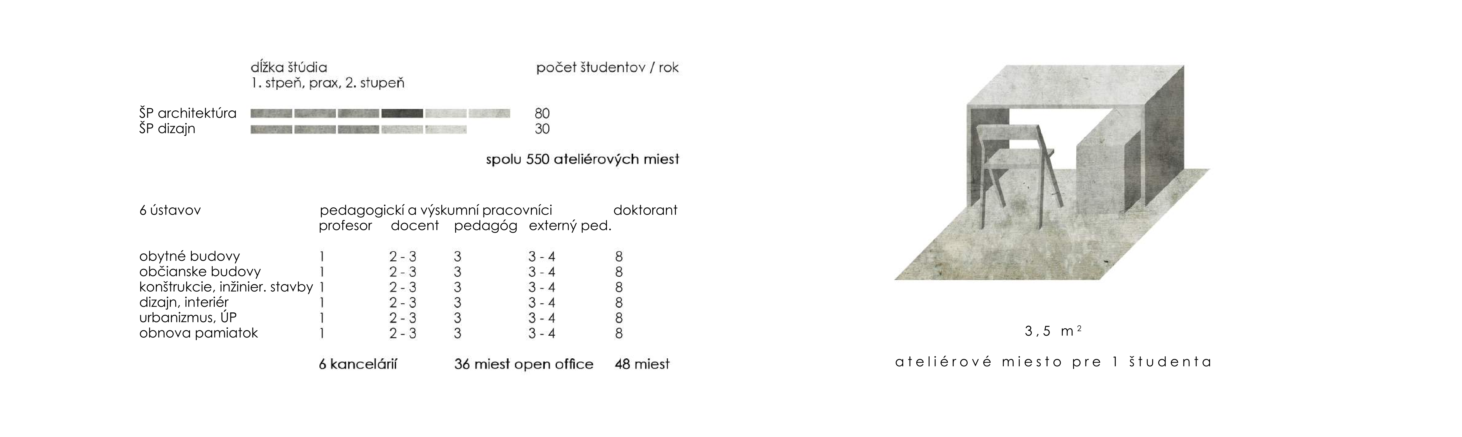 Na základe rozboru súčasnej výučby na Fakulte architektúry, porovnaním a inšpiráciou fungujúcimi zahraničnými školami (viď seminár) som navrhla nový spôsob výuky na škole architektúry. Či už ide o demografiu alebo presýtenosť trhu architektmi, škola architektúry je pod tlakom zmenšovania sa. Podľa štatistiky a prognóz počet uchádzačov o štúdium na Fakulte architektúry klesá. Cielené zabránenie zníženia kvality absloventov školy vedie ku zníženiu stavu študentov. Na škole architektúry naďalej navrhujem výučbu 2 štúdijných programov – architektúry a dizajnu. Podľa môjho názoru však v procese výučby je veľmi dôležité obdobie praxe. Spolupráca s reálnymi ateliérmi a zahraničím. Získanie praktických poznatkov z organizácie, vykonávania prípravných a projekčných prác nie je možné zabezpečiť v časovom horizonte 4 týždne / rok. Volím model inšpirovaný zahraničnými školami - štúdium 1. a 2. stupňa strieda rok praktickej výučby. Nosným predmetom vzdelávania architekta a dizajnéra je ateliér. Ateliér predstavuje priestor spolupráce, diskusie. Študenti tu navzájom spolupracujú, vymieňajú si skúsenosti a názory, zároveň je miestom konzultácií s profesistami. Semináre ateliér dopĺňajú.