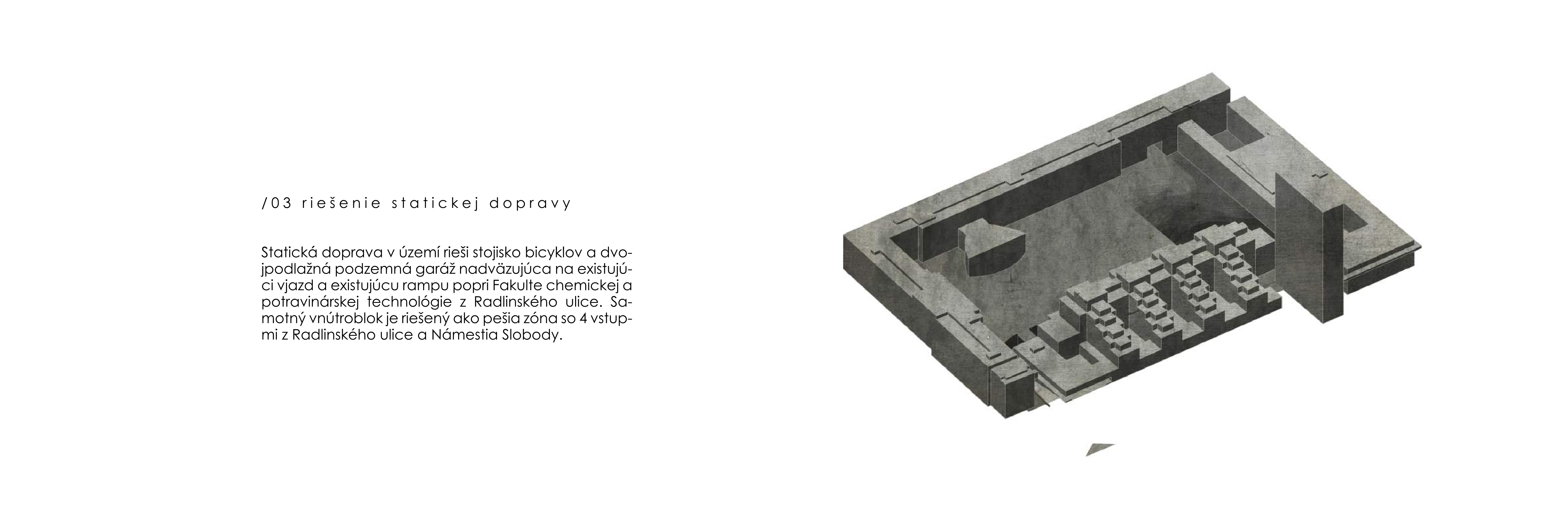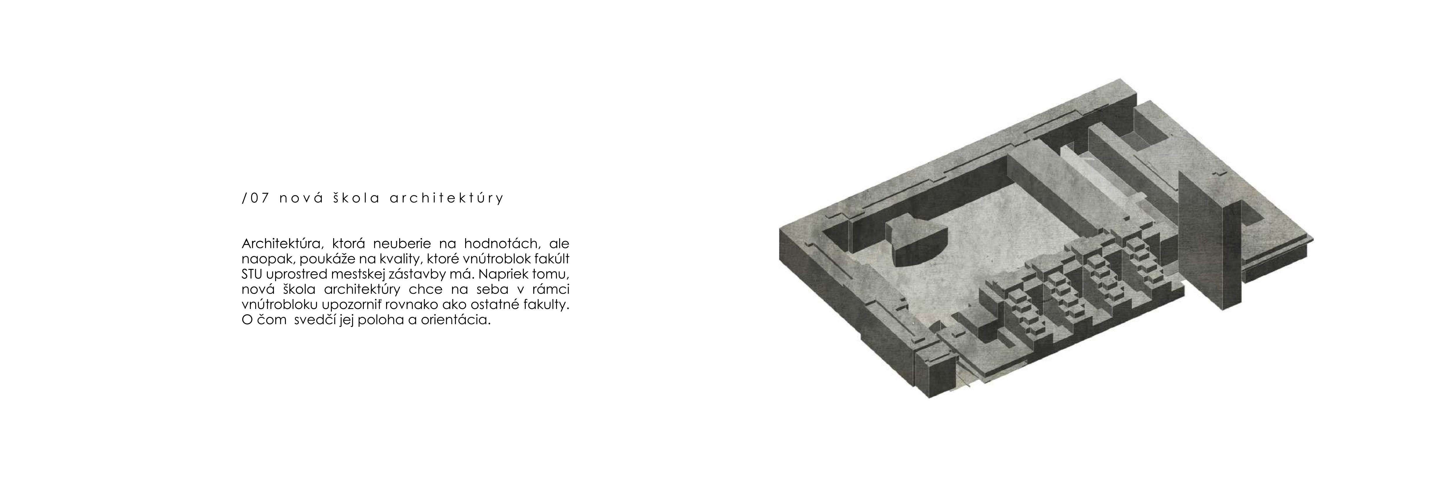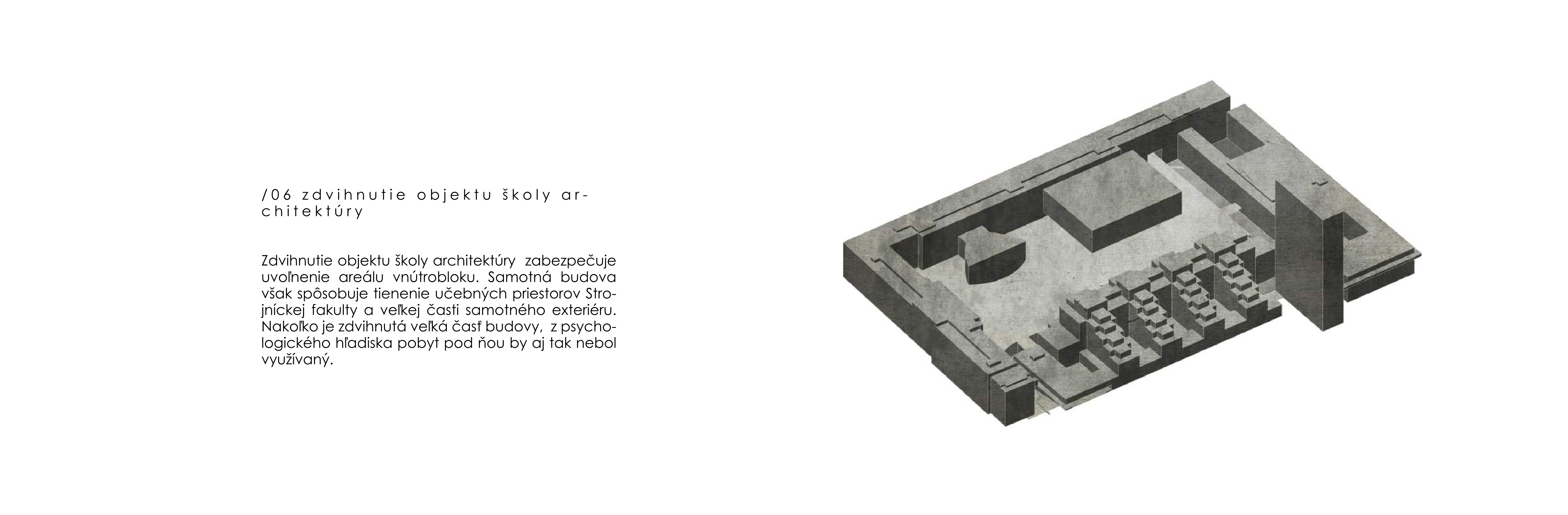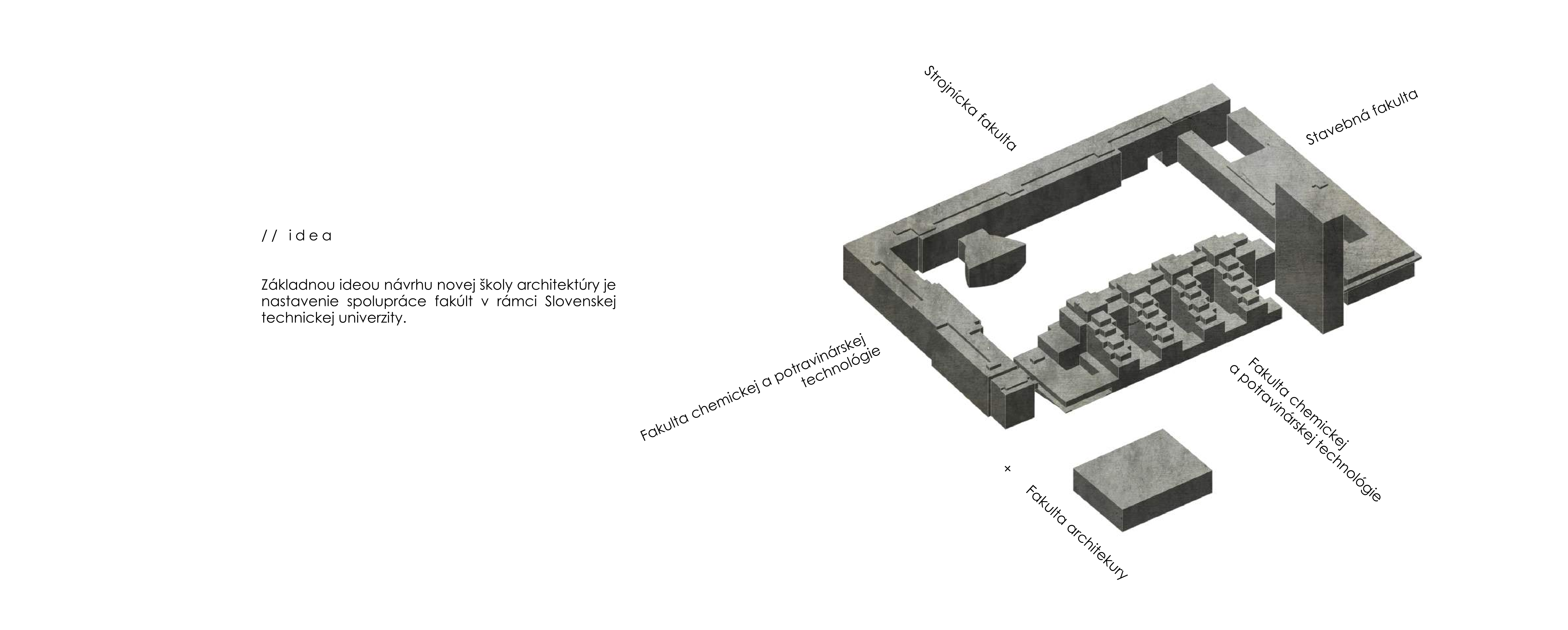 Základ návrhu predstavuje otvorený multifunkčný priestor využívaný všetkými fakultami v danom území na výučbu, regeneráciu, ale hlavne priestor náhodných stretnutí a výmeny vedomostí medzi študentmi rozličných fakúlt jednej univerzity. Chcela som tak podčiarknúť dôležitosť spolupráce fakúlt univerzity a vytvorenie podmienok a dôvodov stretávať sa a navzájom spoznávať ostatné špecializácie. Na tento potenciál nadväzuje aj návrh školy architektúry. Architektúra, ktorá neuberie na hodnotách, ale naopak, poukáže na kvality, ktoré vnútroblok fakúlt STU uprostred mestskej zástavby má. Napriek tomu, nová škola architektúry chce na seba v rámci vnútrobloku upozorniť rovnako ako ostatné fakulty. O čom svedčí jej poloha a orientácia a dopravné riešenie. V súčasnosti vo vnútrobloku a okolí Fakulty architektúry, Stavebnej fakulty, Strojníckej fakulty a Fakulty chemickej a potravinárskej technológie parkuje cca 360 osobných automobilov a 30 bicyklov. Návrh rieši statickú dopravu pre všetky 4 fakulty. Zabezpečuje ju stojisko bicyklov a dvojpodlažná podzemná garáž nadväzujúca na existujúci vjazd a existujúcu rampu popri Fakulte chemickej a potravinárskej technológie z Radlinského ulice. Podzemná garáž poskytuje parking s kapacitou 436 parkovacích miest. Samotný vnútroblok je riešený ako pešia zóna so 4 vstupmi z Radlinského ulice a Námestia Slobody. Vjazd áut je možný len v obslužnom alebo nevyhnutnom - havárijnom prípade.