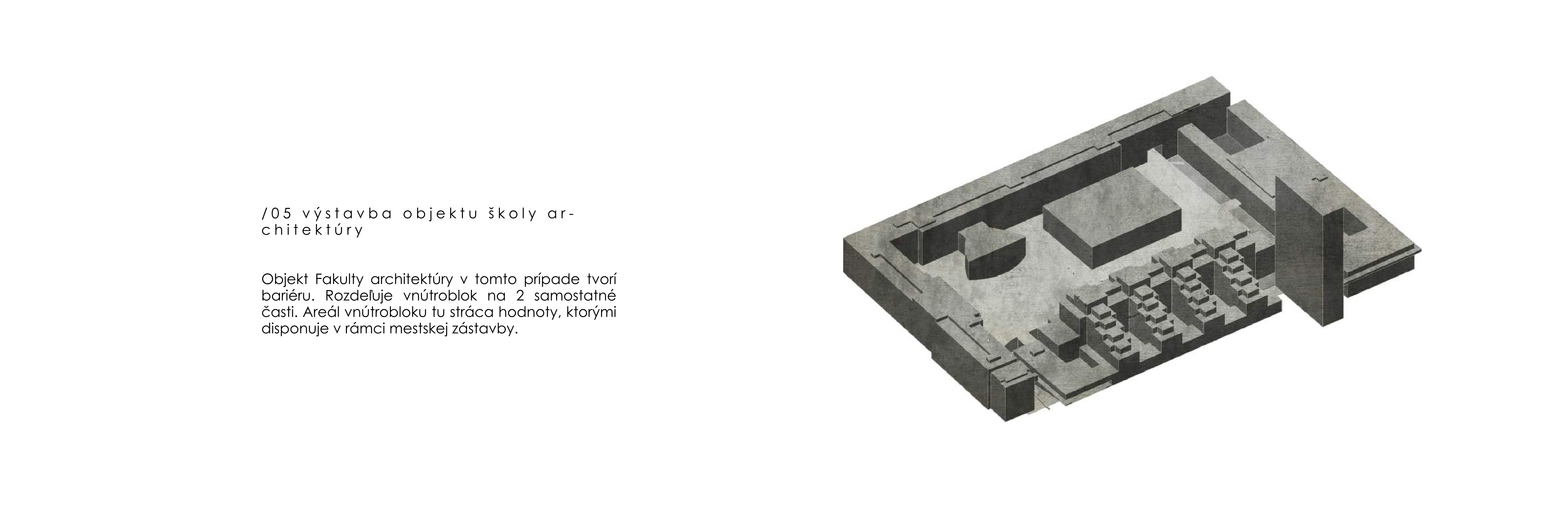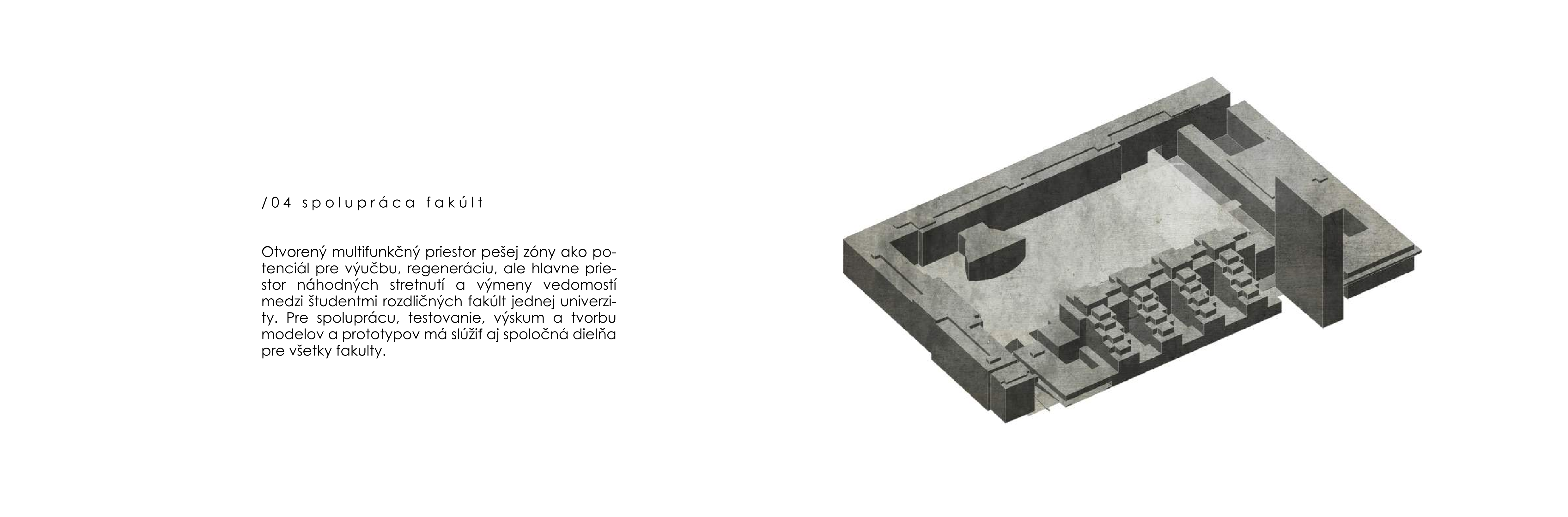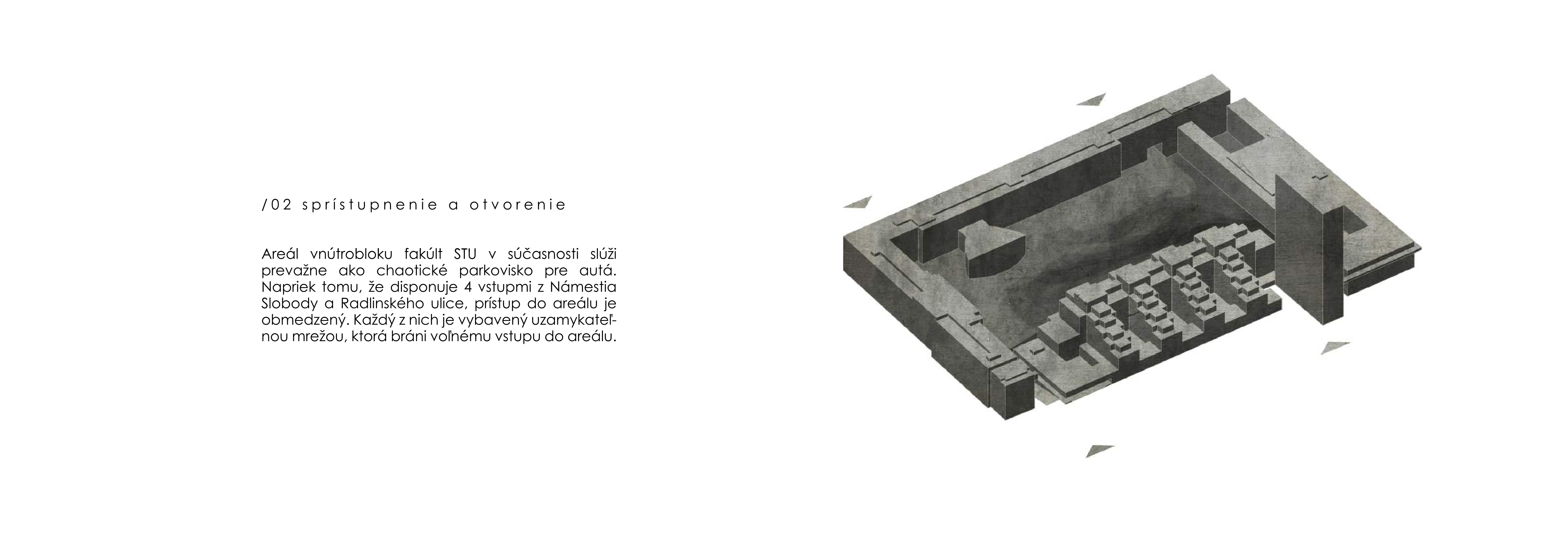 Základ návrhu predstavuje otvorený multifunkčný priestor využívaný všetkými fakultami v danom území na výučbu, regeneráciu, ale hlavne priestor náhodných stretnutí a výmeny vedomostí medzi študentmi rozličných fakúlt jednej univerzity. Chcela som tak podčiarknúť dôležitosť spolupráce fakúlt univerzity a vytvorenie podmienok a dôvodov stretávať sa a navzájom spoznávať ostatné špecializácie. Na tento potenciál nadväzuje aj návrh školy architektúry. Architektúra, ktorá neuberie na hodnotách, ale naopak, poukáže na kvality, ktoré vnútroblok fakúlt STU uprostred mestskej zástavby má. Napriek tomu, nová škola architektúry chce na seba v rámci vnútrobloku upozorniť rovnako ako ostatné fakulty. O čom svedčí jej poloha a orientácia a dopravné riešenie. V súčasnosti vo vnútrobloku a okolí Fakulty architektúry, Stavebnej fakulty, Strojníckej fakulty a Fakulty chemickej a potravinárskej technológie parkuje cca 360 osobných automobilov a 30 bicyklov. Návrh rieši statickú dopravu pre všetky 4 fakulty. Zabezpečuje ju stojisko bicyklov a dvojpodlažná podzemná garáž nadväzujúca na existujúci vjazd a existujúcu rampu popri Fakulte chemickej a potravinárskej technológie z Radlinského ulice. Podzemná garáž poskytuje parking s kapacitou 436 parkovacích miest. Samotný vnútroblok je riešený ako pešia zóna so 4 vstupmi z Radlinského ulice a Námestia Slobody. Vjazd áut je možný len v obslužnom alebo nevyhnutnom - havárijnom prípade.