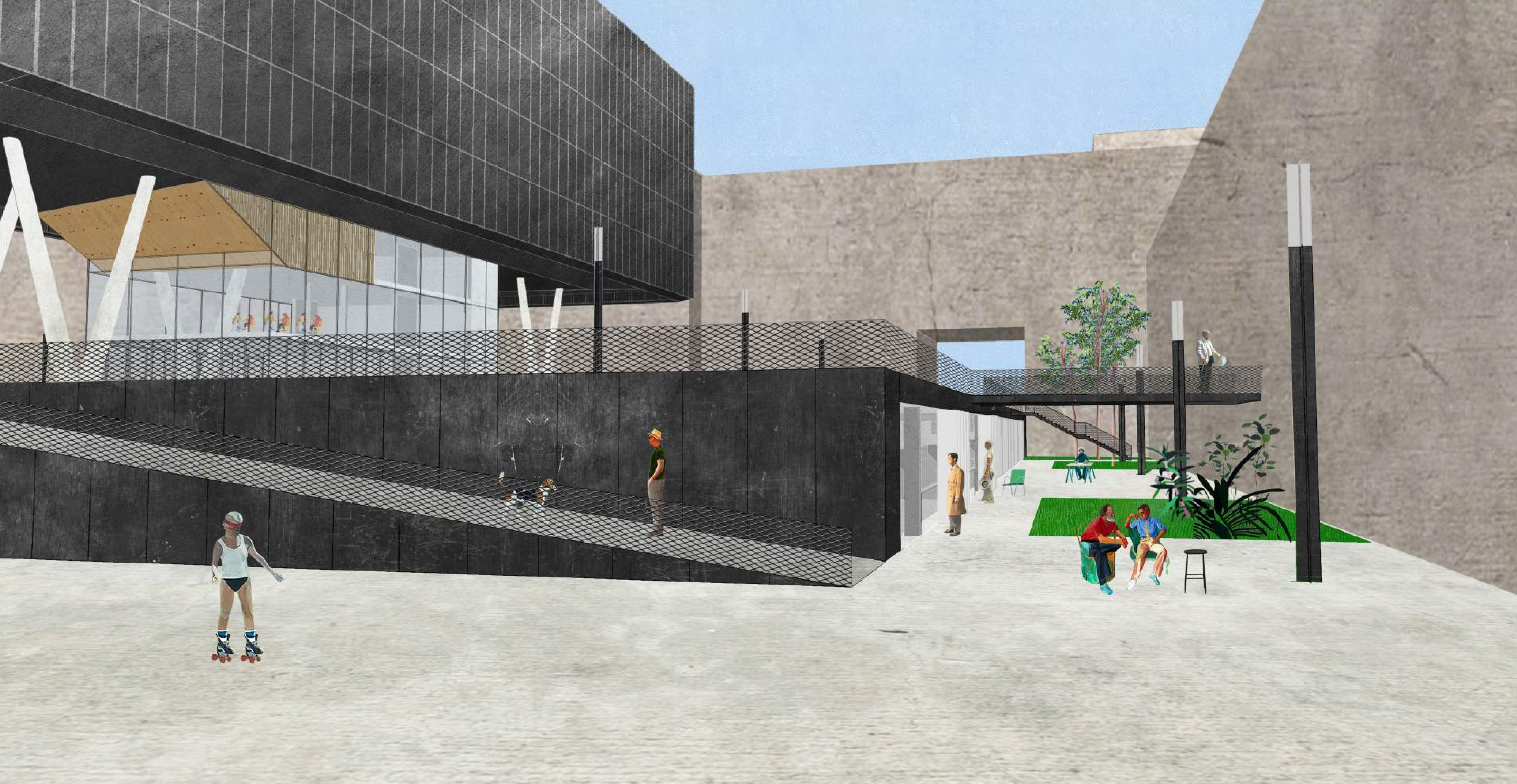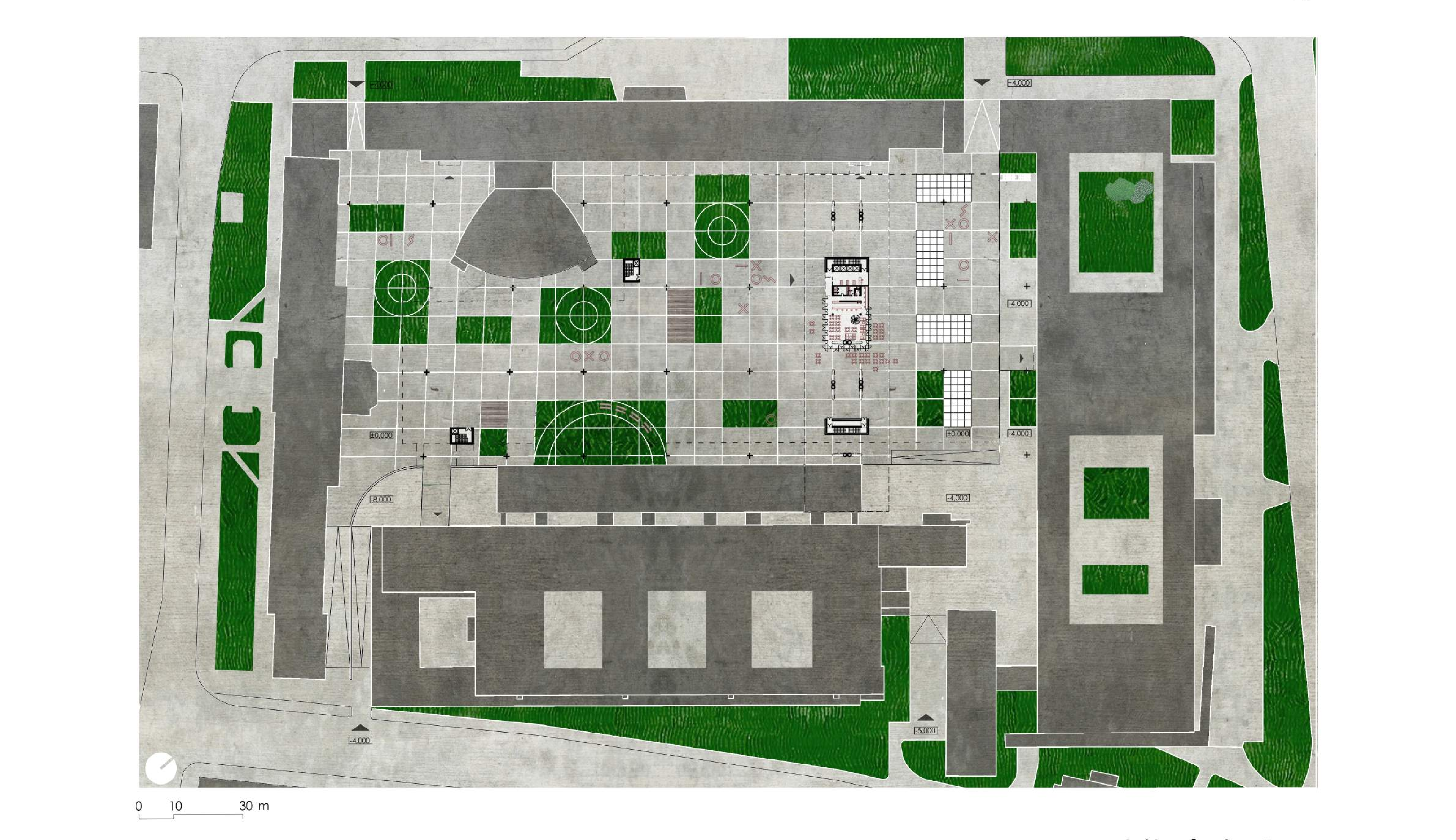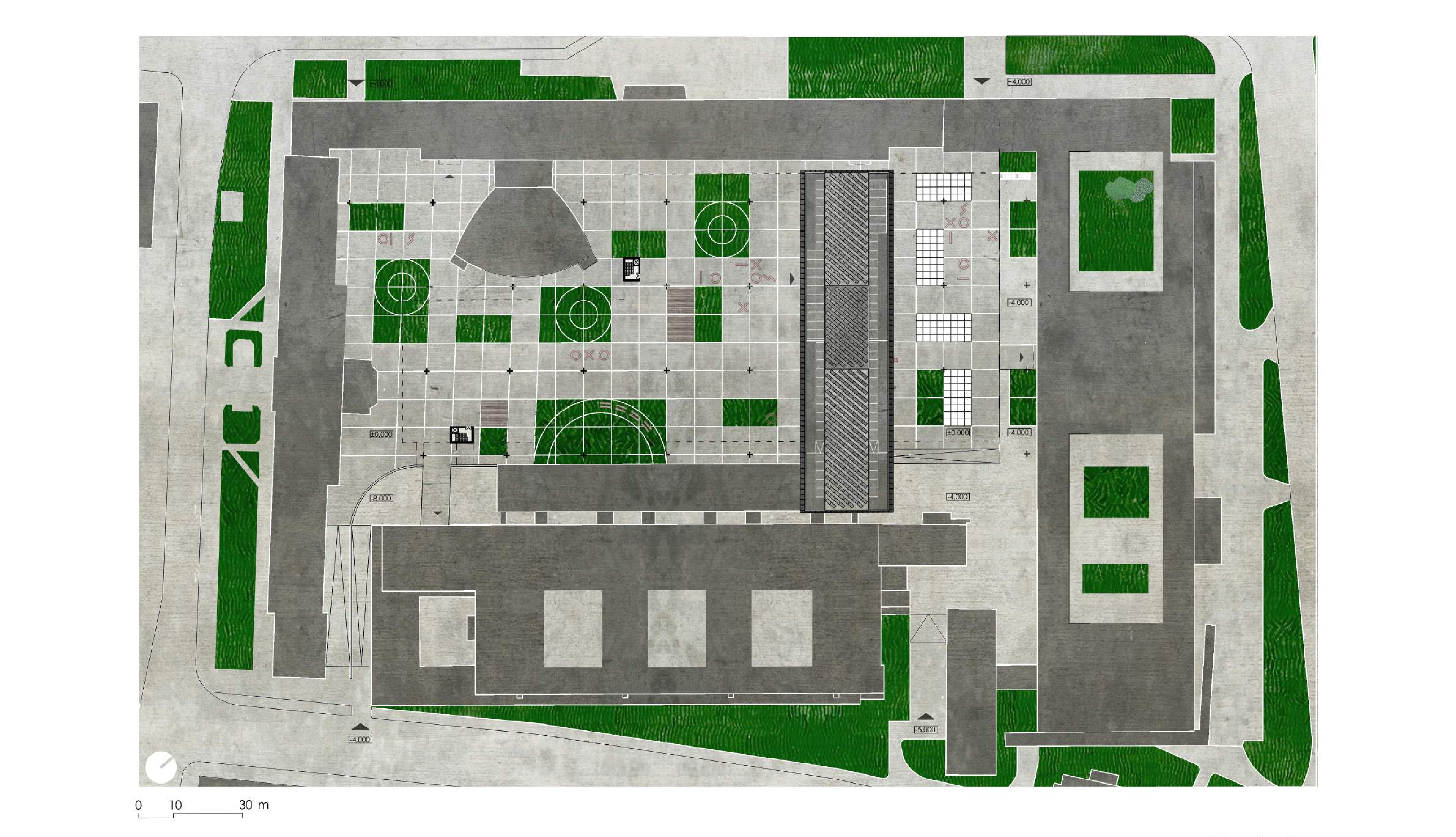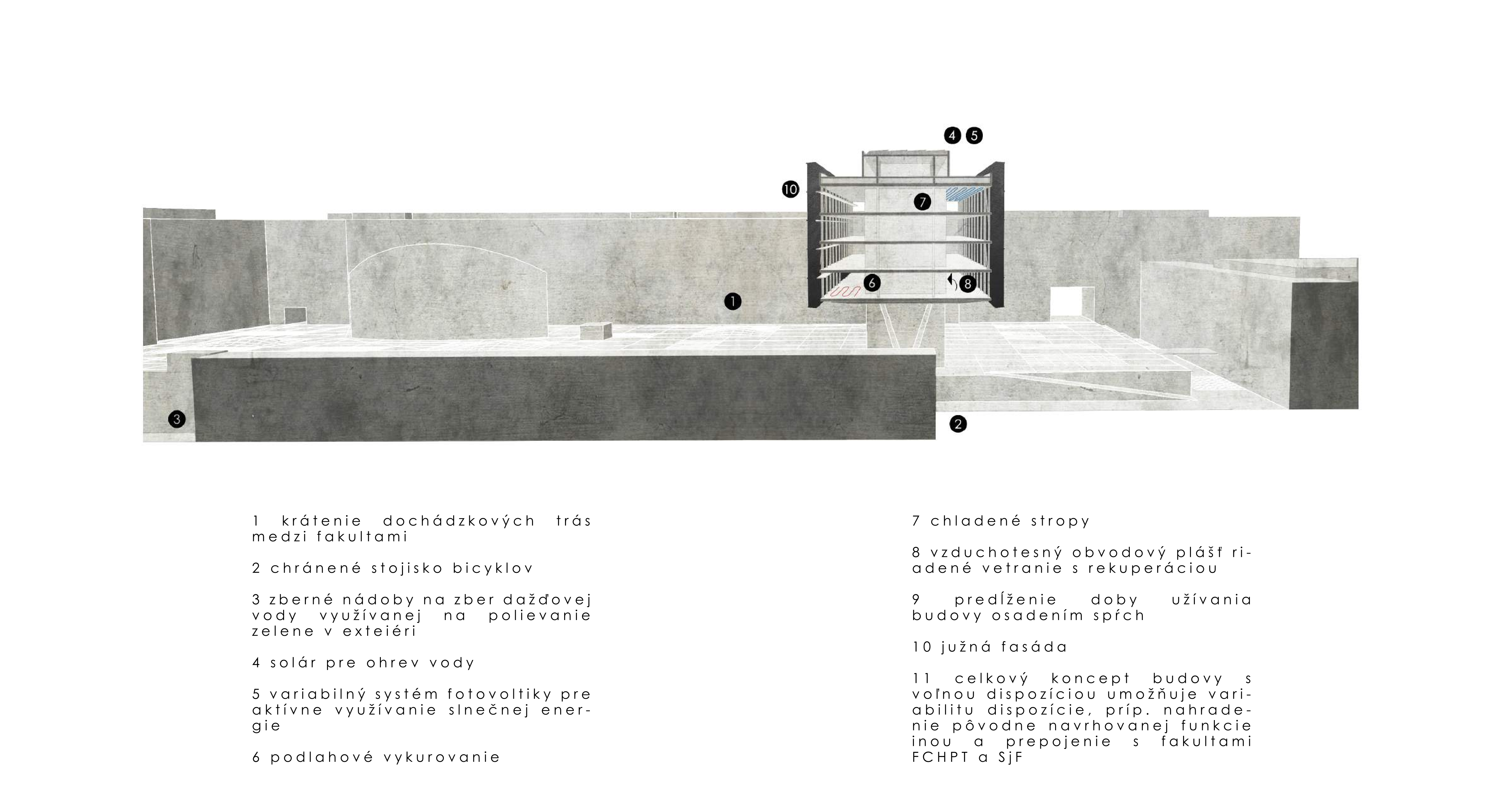 Základ návrhu predstavuje otvorený multifunkčný priestor využívaný všetkými fakultami v danom území na výučbu, regeneráciu, ale hlavne priestor náhodných stretnutí a výmeny vedomostí medzi študentmi rozličných fakúlt jednej univerzity. Chcela som tak podčiarknúť dôležitosť spolupráce fakúlt univerzity a vytvorenie podmienok a dôvodov stretávať sa a navzájom spoznávať ostatné špecializácie. Na tento potenciál nadväzuje aj návrh školy architektúry. Architektúra, ktorá neuberie na hodnotách, ale naopak, poukáže na kvality, ktoré vnútroblok fakúlt STU uprostred mestskej zástavby má. Napriek tomu, nová škola architektúry chce na seba v rámci vnútrobloku upozorniť rovnako ako ostatné fakulty. O čom svedčí jej poloha a orientácia a dopravné riešenie. V súčasnosti vo vnútrobloku a okolí Fakulty architektúry, Stavebnej fakulty, Strojníckej fakulty a Fakulty chemickej a potravinárskej technológie parkuje cca 360 osobných automobilov a 30 bicyklov. Návrh rieši statickú dopravu pre všetky 4 fakulty. Zabezpečuje ju stojisko bicyklov a dvojpodlažná podzemná garáž nadväzujúca na existujúci vjazd a existujúcu rampu popri Fakulte chemickej a potravinárskej technológie z Radlinského ulice. Podzemná garáž poskytuje parking s kapacitou 436 parkovacích miest. Samotný vnútroblok je riešený ako pešia zóna so 4 vstupmi z Radlinského ulice a Námestia Slobody. Vjazd áut je možný len v obslužnom alebo nevyhnutnom - havárijnom prípade.