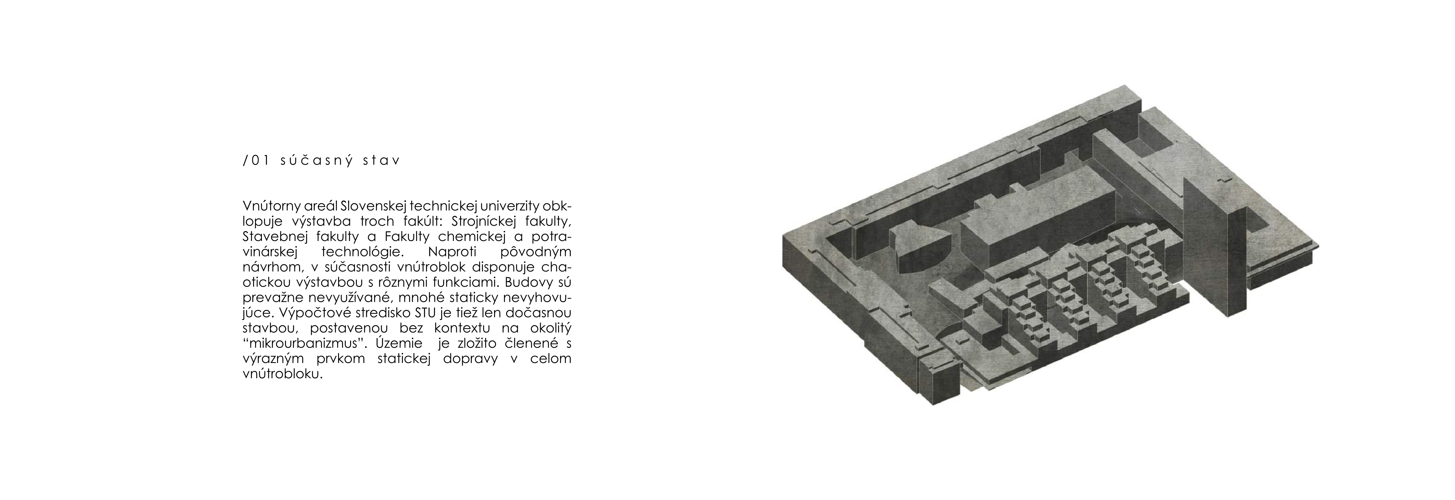 Vnútorný areál Slovenskej technickej univerzity obklopuje výstavba troch fakúlt: Strojníckej fakulty, Stavebnej fakulty a Fakulty chemickej a potravinárskej technológie. Naproti pôvodným návrhom, v súčasnosti vnútroblok disponuje chaotickou výstavbou s rôznymi funkciami. Budovy sú prevažne nevyužívané, mnohé staticky nevyhovujúce. Výpočtové stredisko STU je tiež len dočasnou stavbou, postavenou bez kontextu na okolitý “mikrourbanizmus”. Územie je zložito členené s výrazným prvkom statickej dopravy v celom vnútrobloku. Problémy územia s rozlohou takmer 2 hektáre tak ponúkajú veľký potenciál pre vytvorenie študentského života formou fungujúceho “Campusu” a doplnenie o novú, vhodnú výstavbu.