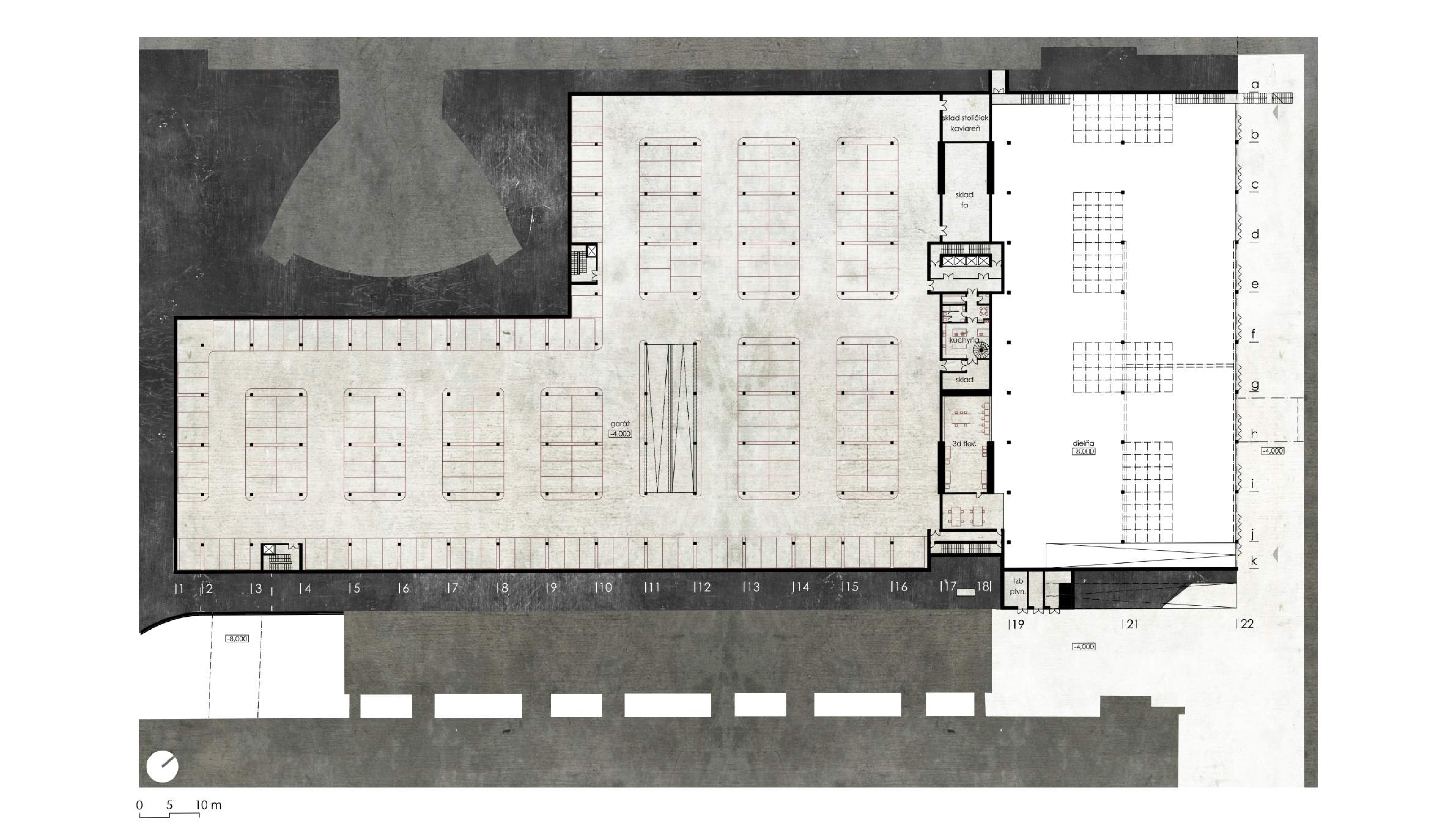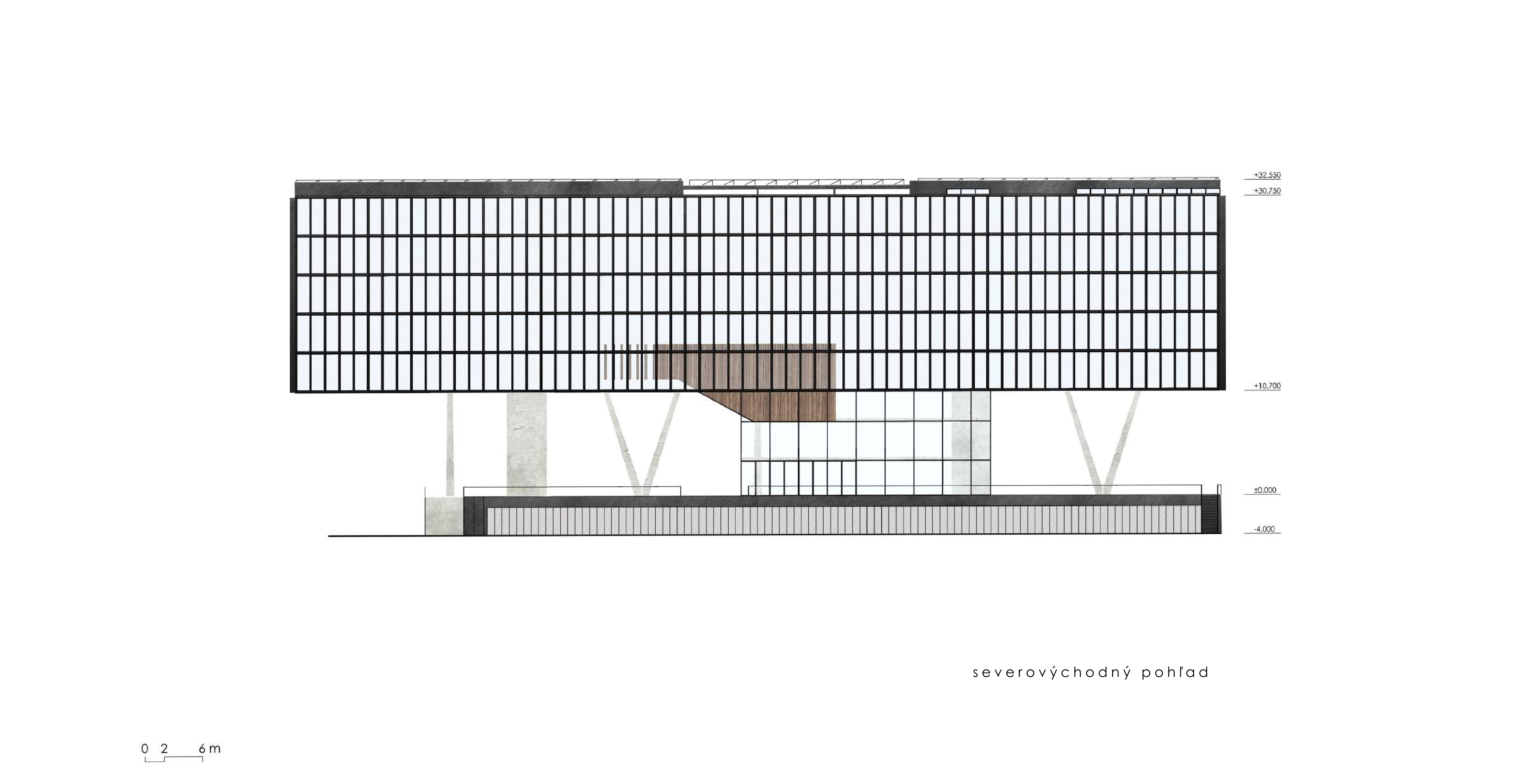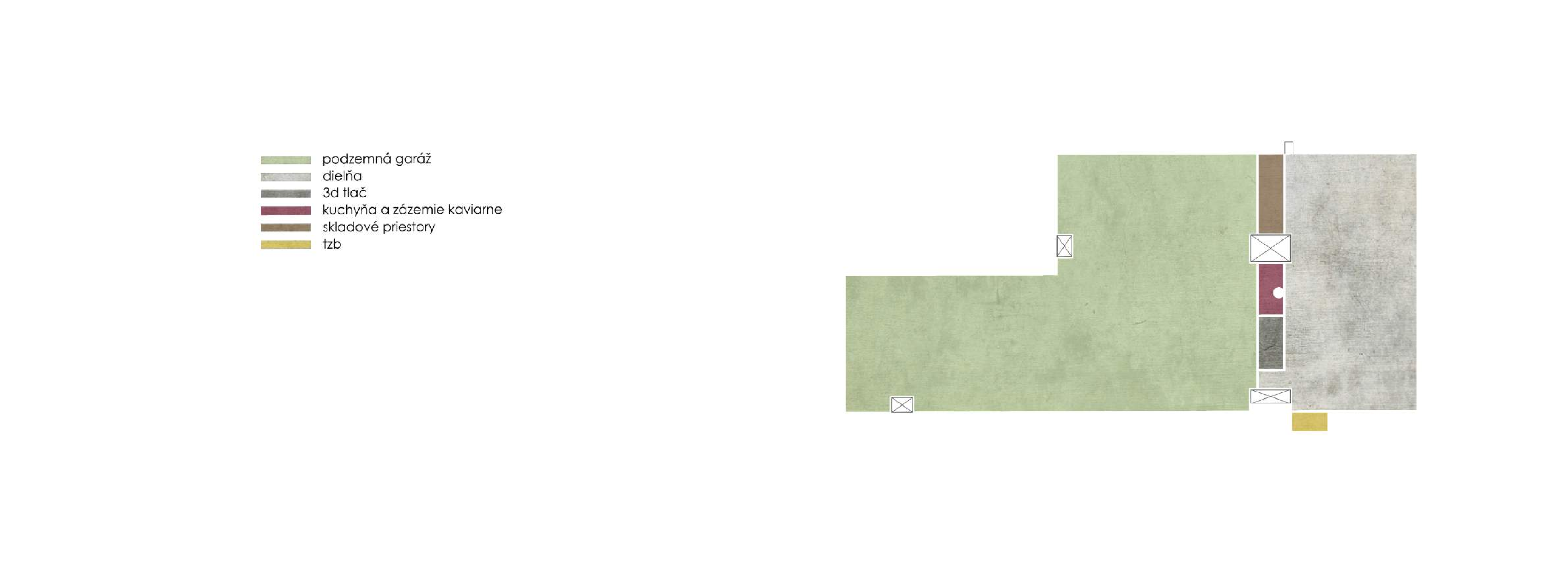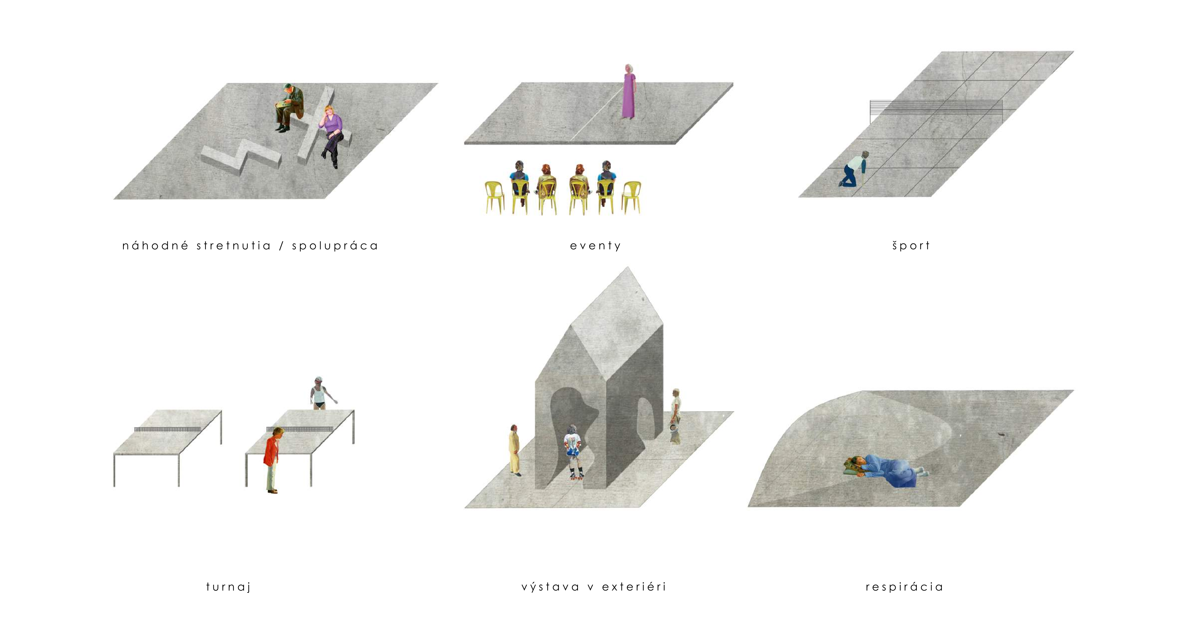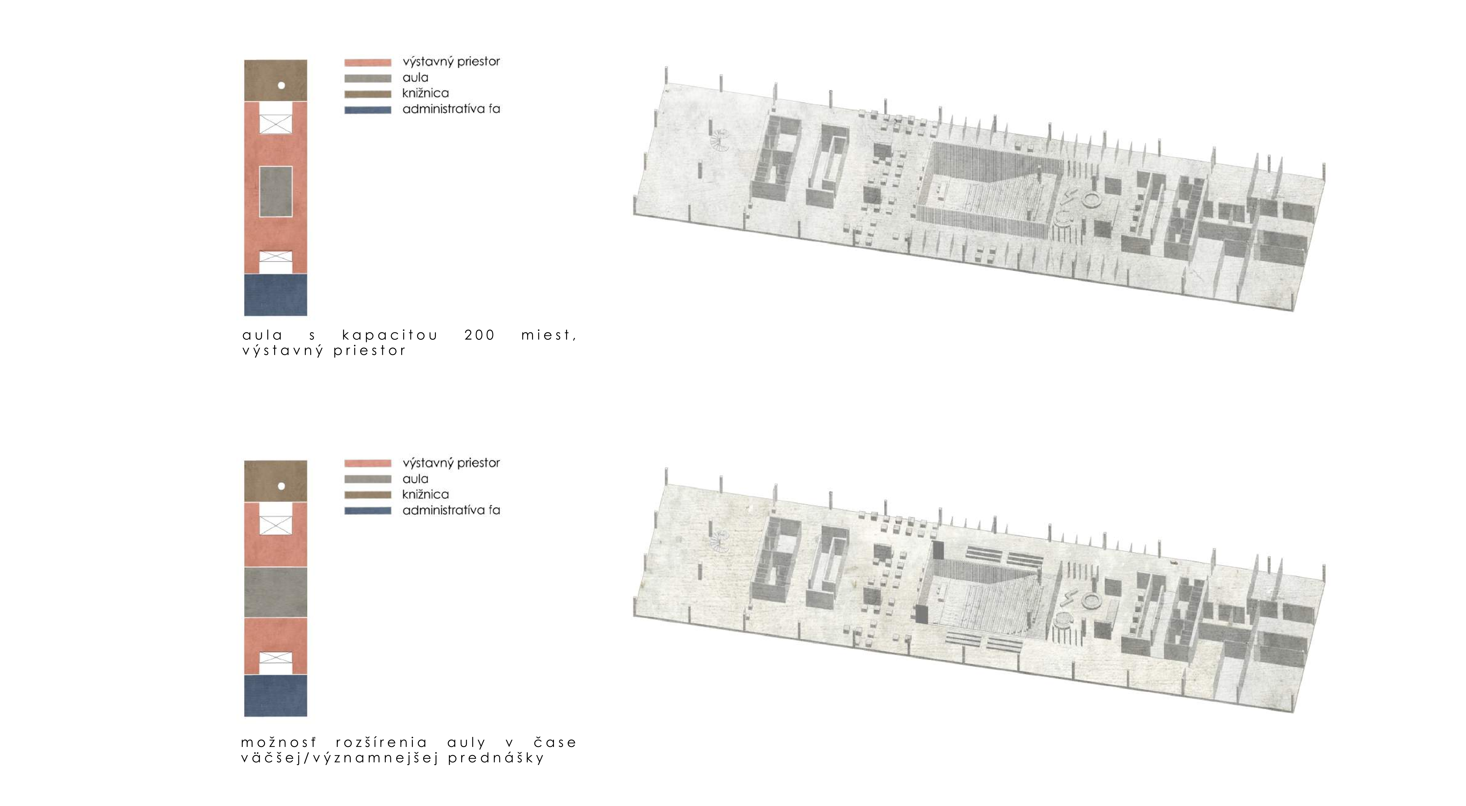 Prevádzkové riešenie je reakciou na okolité vzťahy a zvolený lokalitný program školy. Pri návrhu dbám na flexibilitu využitia školy. Na 1.NP je situovaný hlavný vstup do objektu. Vedľa vstupu je situovaná prevádzka kaviarne so zázemím v 1.PP. Prevádzka kaviarne na 2.NP prechádza do prevádzky kníhkupectva a fakulty. Vstup do fakulty je doplnený o informátora, okrem šatňového priestoru sa tu nachádza jadro vertikálnej komunikácie, ktorá vedie do samotného objektu školy architektúry. 4.NP predstavuje prevádzku pre verejnosť. Rozľahlému výstavnému priestoru dominuje centrálne umiestnená aula prechádzajúca do 2.NP. Ďalej sa tu nachádza správa a administratíva fakulty a knižnica prechádzajúca do 5.NP. 5.NP je už podlažím venovaným samotnej výučbe. S výtvarným ateliérom, ateliérovými stolmi po obvode a centrálne umiestnenými seminárnymi miestnosťami. Modul centrálne umiestnených ateliérových miestností a ateliérov po obvode podlažia prechádza aj do 6.NP. Na 7.NP sa nachádzajú ateliérové stoly posledného ročníka a počítačové miestnosti. Svoj “open space” tu majú aj doktoranti a vyučujúci školy, doplnený o sekretariát a kancelárie vedúcich učiteľov. 8.NP je ustupujúce podlažie s technickými miestnosťami a študentským klubom ako respiračným priestorom s vlastnou pochôdznou terasou na streche fakulty. V 2 podzemných podlažiach dopĺňa garážový priestor aj veľká spoločná dielňa všetkých fakúlt, určená pre spoluprácu, testovanie, výskum, tvorbu modelov a prototypov.