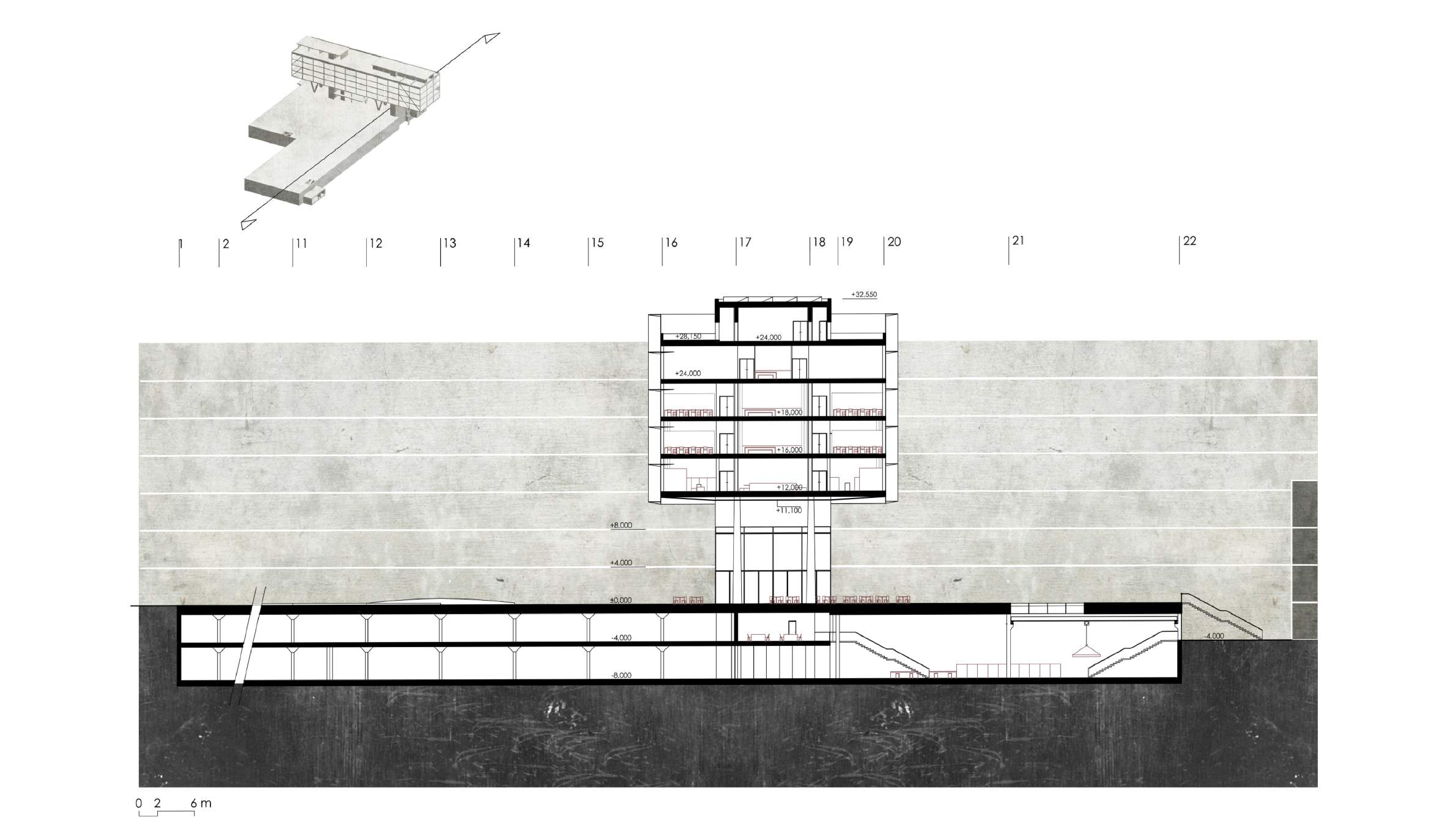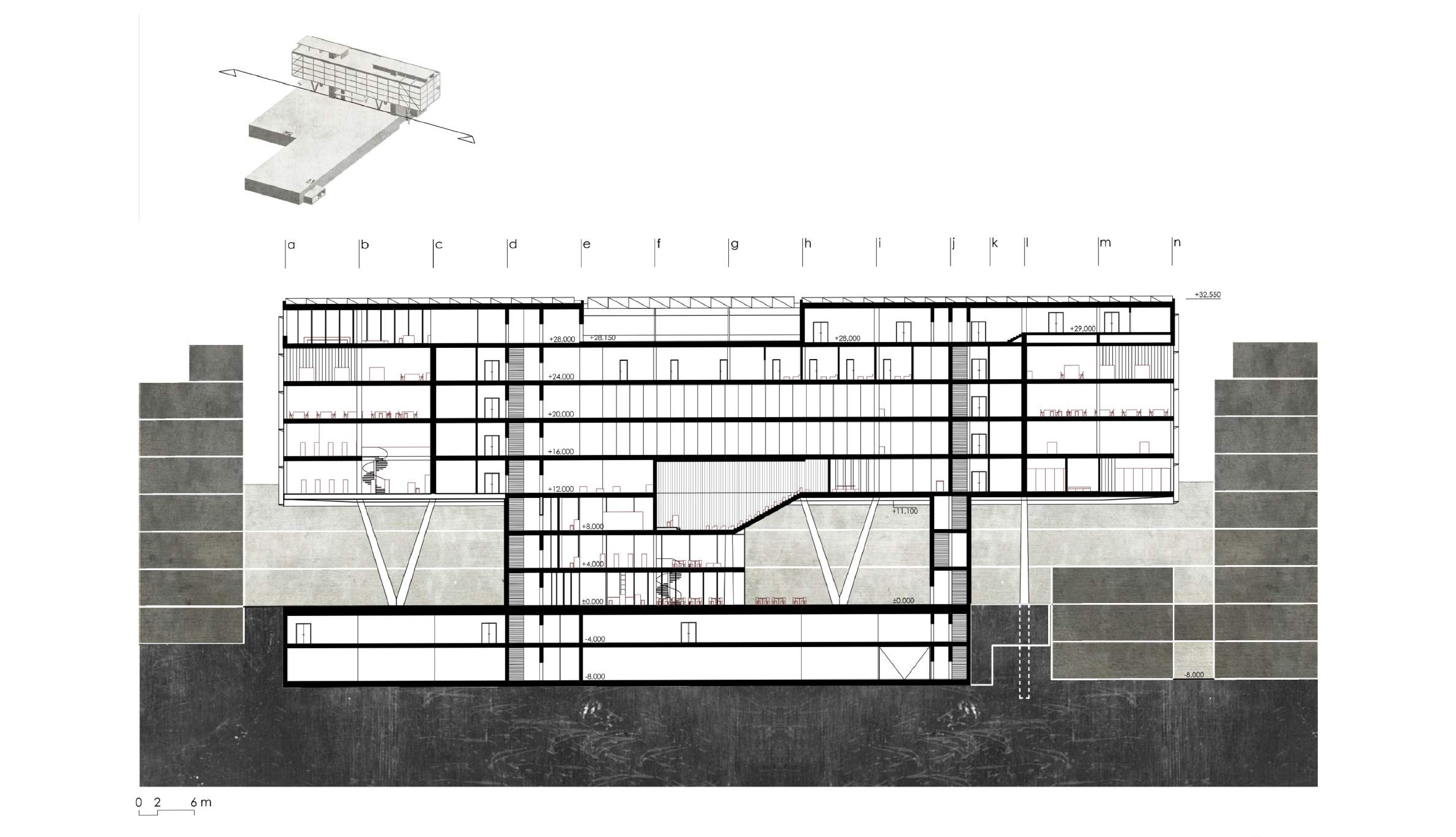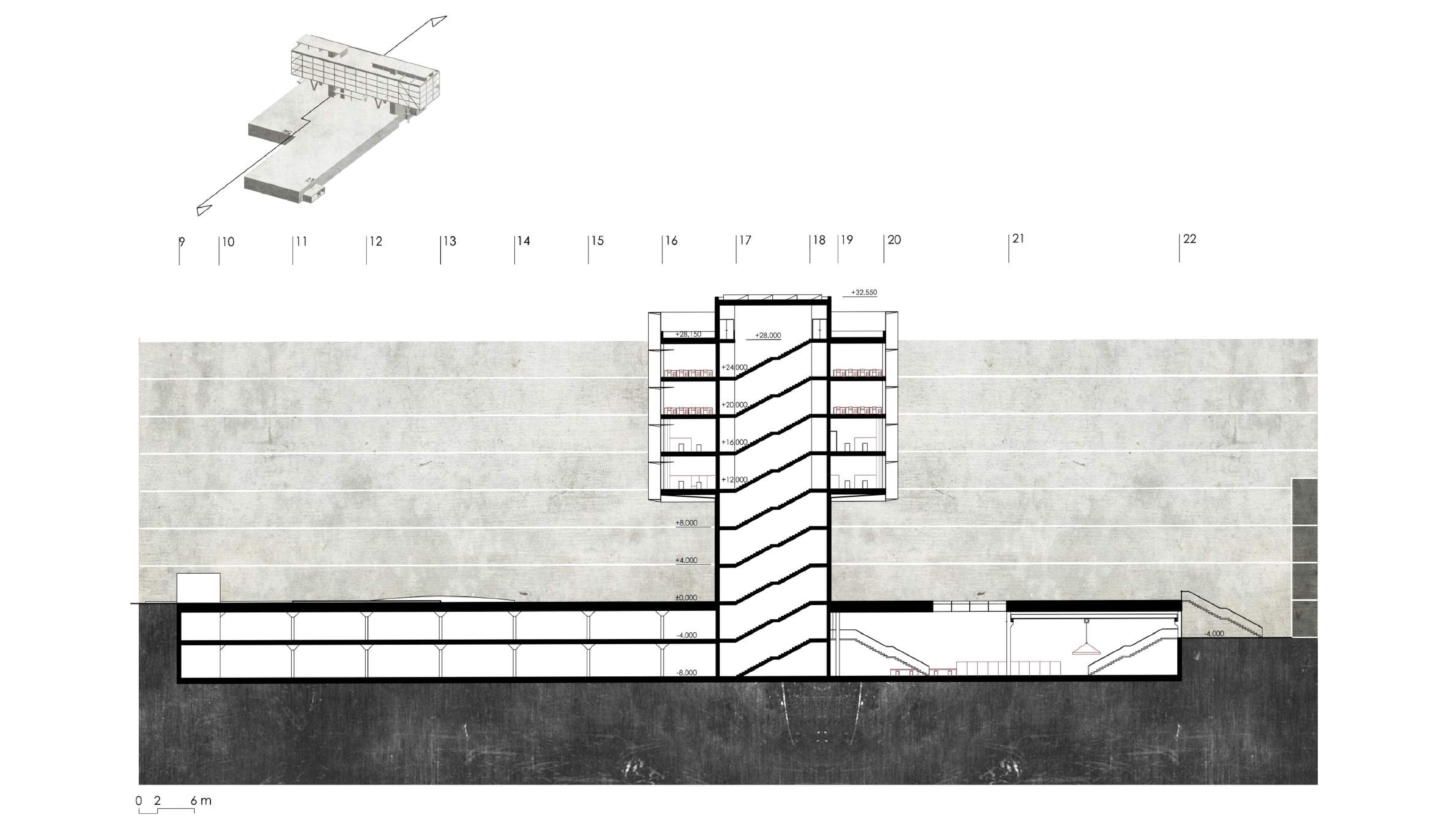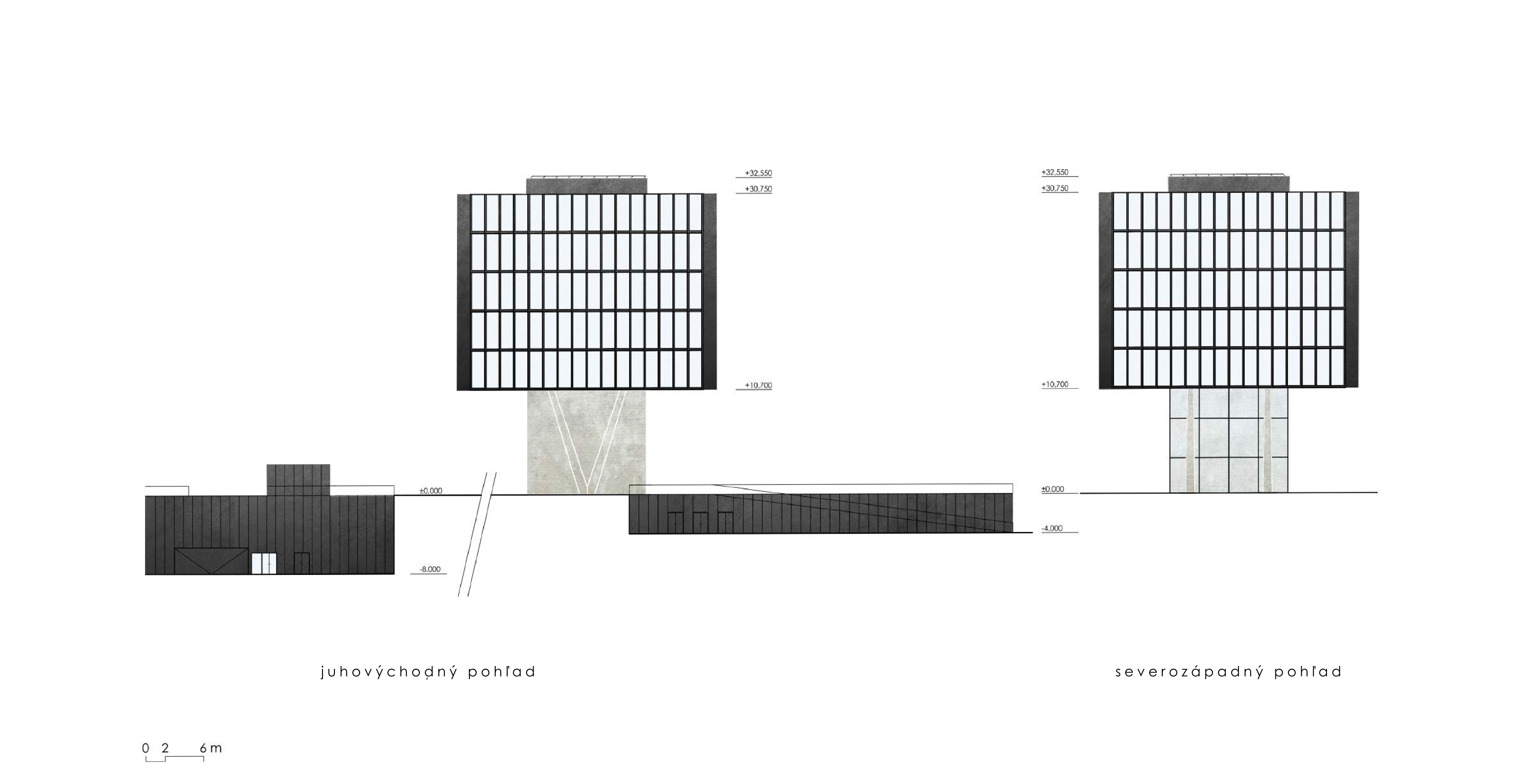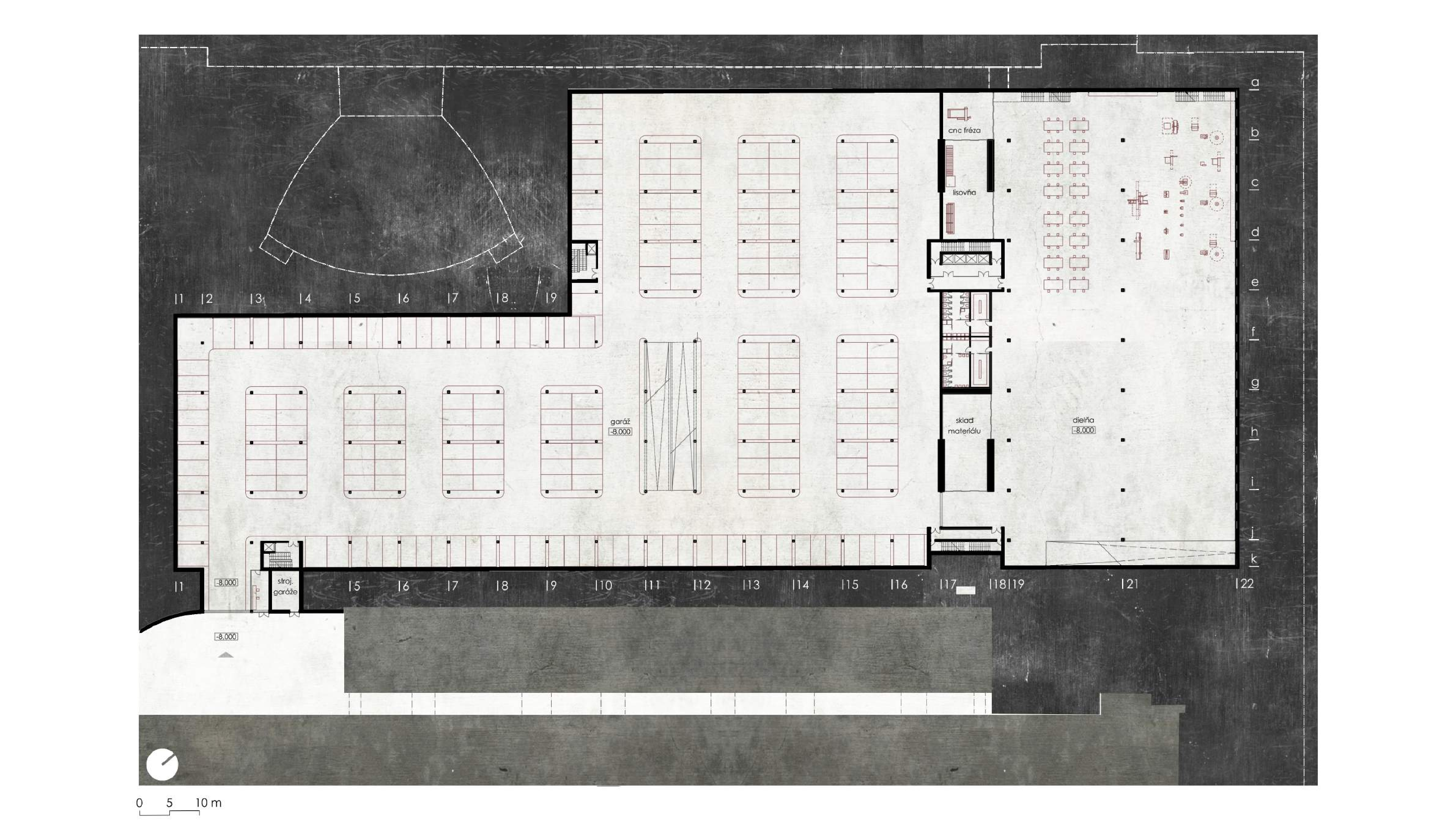 Prevádzkové riešenie je reakciou na okolité vzťahy a zvolený lokalitný program školy. Pri návrhu dbám na flexibilitu využitia školy. Na 1.NP je situovaný hlavný vstup do objektu. Vedľa vstupu je situovaná prevádzka kaviarne so zázemím v 1.PP. Prevádzka kaviarne na 2.NP prechádza do prevádzky kníhkupectva a fakulty. Vstup do fakulty je doplnený o informátora, okrem šatňového priestoru sa tu nachádza jadro vertikálnej komunikácie, ktorá vedie do samotného objektu školy architektúry. 4.NP predstavuje prevádzku pre verejnosť. Rozľahlému výstavnému priestoru dominuje centrálne umiestnená aula prechádzajúca do 2.NP. Ďalej sa tu nachádza správa a administratíva fakulty a knižnica prechádzajúca do 5.NP. 5.NP je už podlažím venovaným samotnej výučbe. S výtvarným ateliérom, ateliérovými stolmi po obvode a centrálne umiestnenými seminárnymi miestnosťami. Modul centrálne umiestnených ateliérových miestností a ateliérov po obvode podlažia prechádza aj do 6.NP. Na 7.NP sa nachádzajú ateliérové stoly posledného ročníka a počítačové miestnosti. Svoj “open space” tu majú aj doktoranti a vyučujúci školy, doplnený o sekretariát a kancelárie vedúcich učiteľov. 8.NP je ustupujúce podlažie s technickými miestnosťami a študentským klubom ako respiračným priestorom s vlastnou pochôdznou terasou na streche fakulty. V 2 podzemných podlažiach dopĺňa garážový priestor aj veľká spoločná dielňa všetkých fakúlt, určená pre spoluprácu, testovanie, výskum, tvorbu modelov a prototypov.
