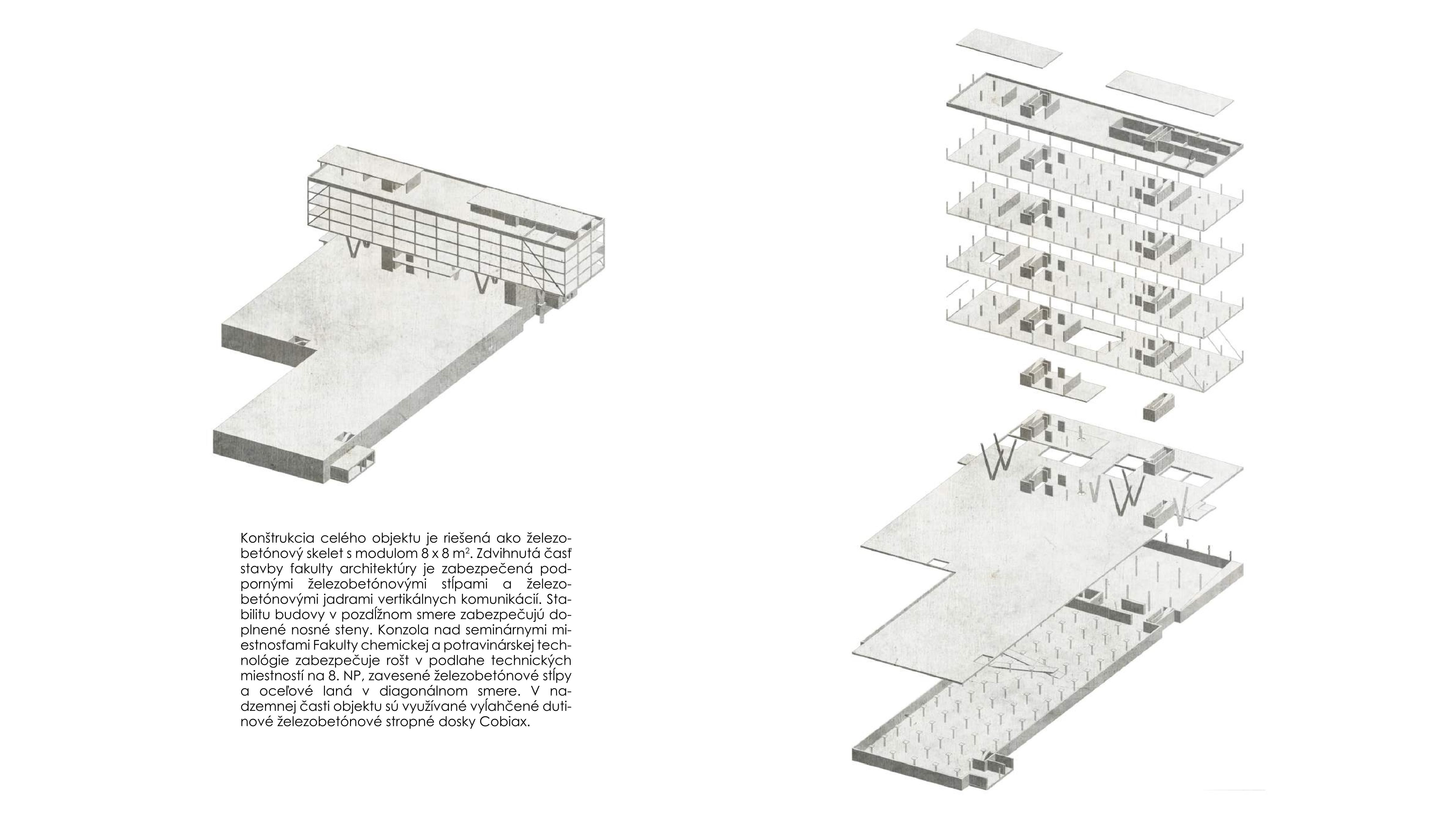 Konštrukcia celého objektu je riešená ako železobetónový skelet s modulom 8 x 8 m2. Zdvihnutá časť stavby fakulty architektúry je zabezpečená podpornými železobetónovými stĺpmi a železobetónovými jadrami vertikálnych komunikácií. Stabilitu budovy v pozdĺžnom smere zabezpečujú doplnené nosné steny. Konzola nad seminárnymi miestnosťami Fakulty chemickej a potravinárskej technológie zabezpečuje rošt v podlahe technických miestností na 8. NP, zavesené železobetónové stĺpy a oceľové laná v diagonálnom smere. V nadzemnej časti objektu sú využívané vyľahčené dutinové železobetónové stropné dosky Cobiax.