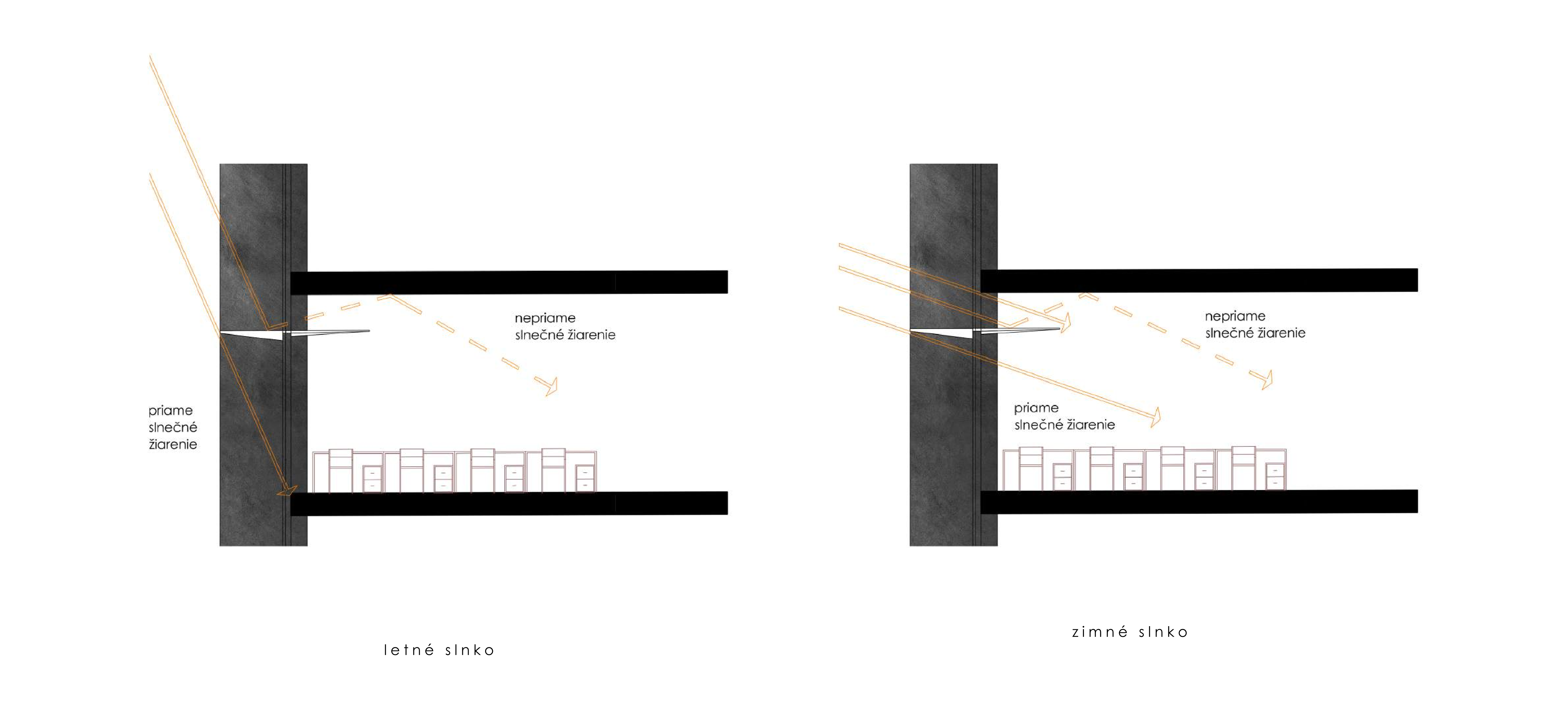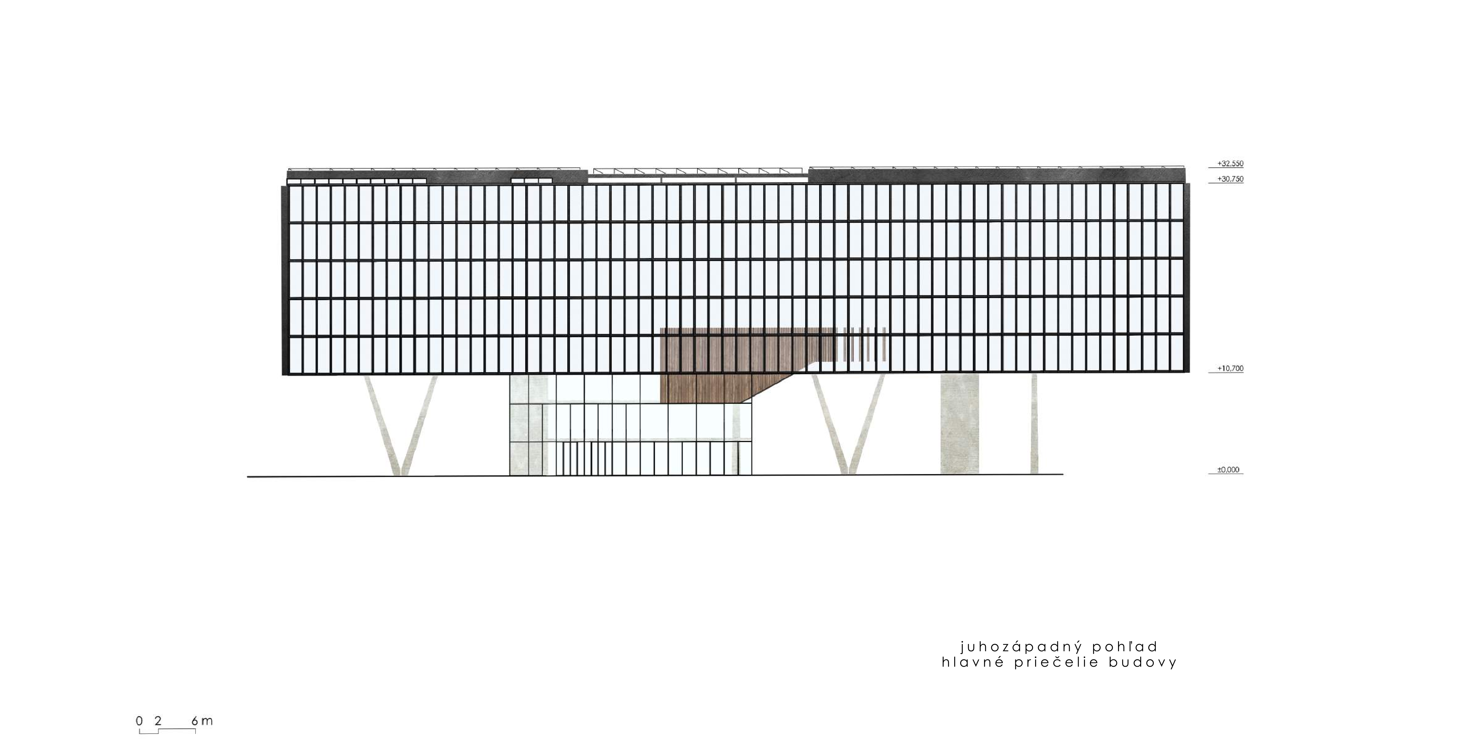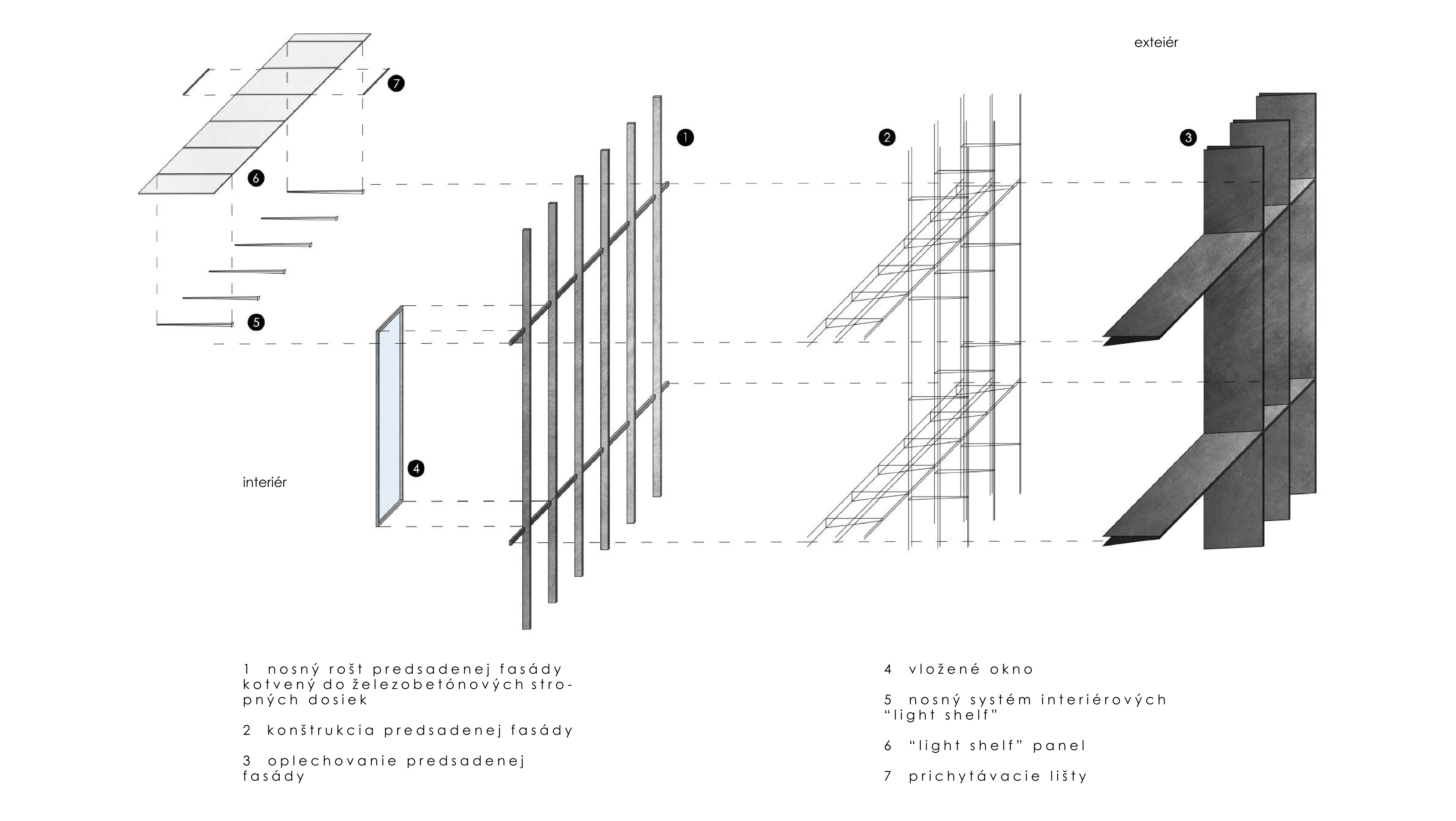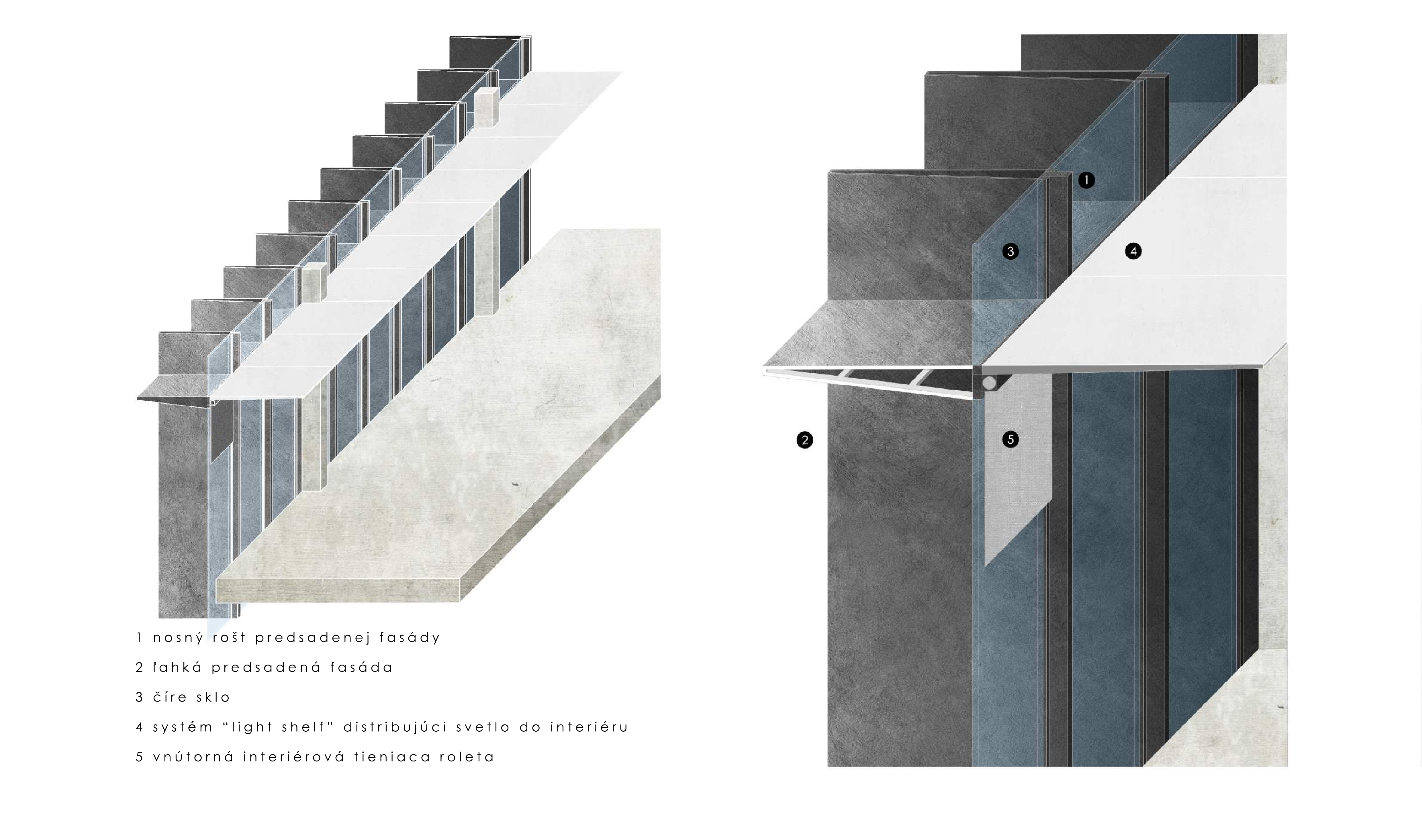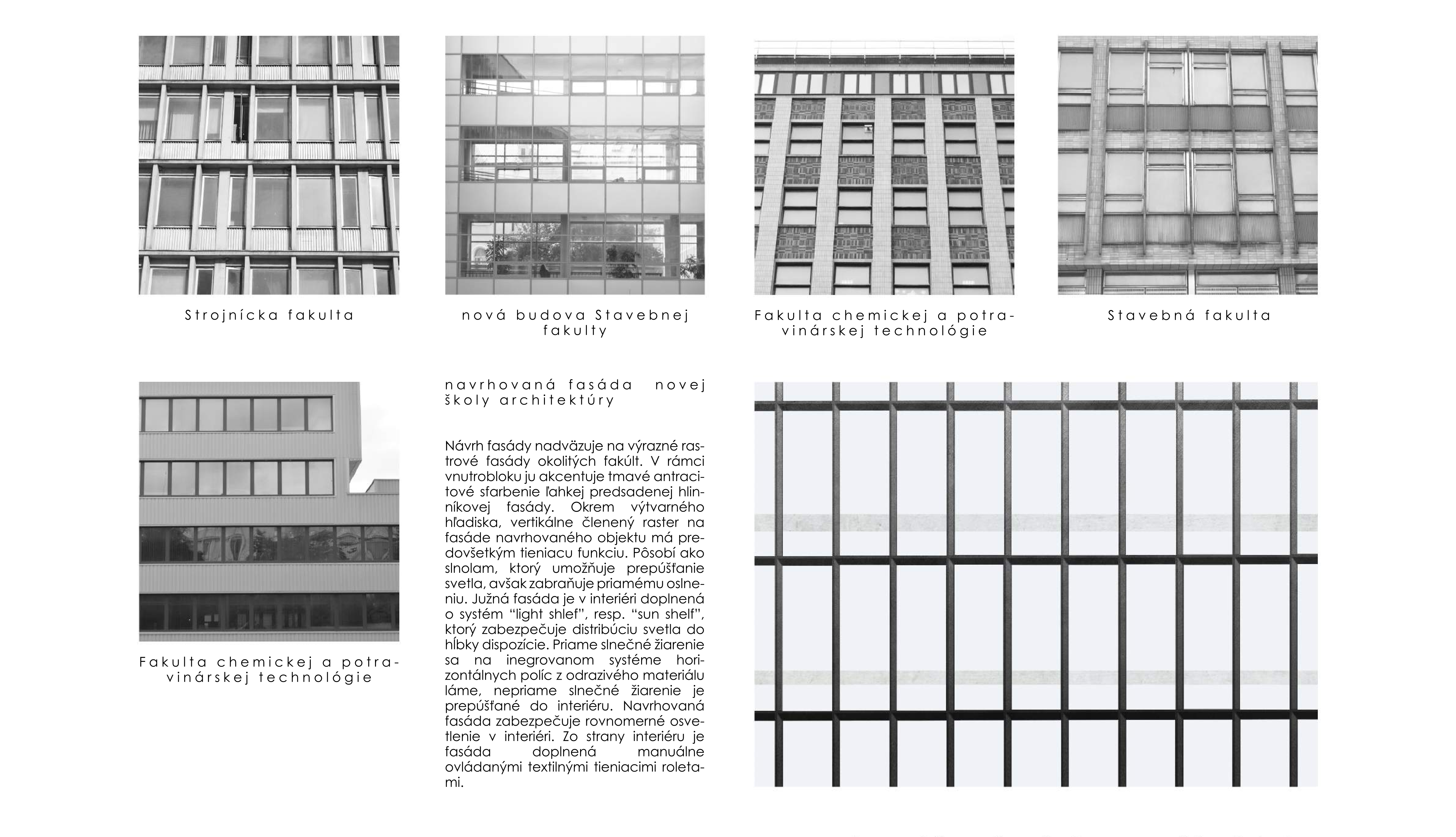 Návrh fasády nadväzuje na výrazné rastrové fasády okolitých fakúlt. V rámci vnútrobloku ju akcentuje tmavé antracitové sfarbenie ľahkej predsadenej hliníkovej fasády. Okrem výtvarného hľadiska, vertikálne členený raster na fasáde navrhovaného objektu má predovšetkým tieniacu funkciu. Pôsobí ako slnolam, ktorý umožňuje prepúšťanie svetla, avšak zabraňuje priamému oslneniu. Južná fasáda je v interiéri doplnená o systém “light shlef”, resp. “sun shelf”, ktorý zabezpečuje distribúciu svetla do hĺbky dispozície. Priame slnečné žiarenie sa na integrovanom systéme horizontálnych políc z odrazivého materiálu láme, nepriame slnečné žiarenie je prepúšťané do interiéru. Navrhovaná fasáda zabezpečuje rovnomerné osvetlenie v interiéri. Zo strany interiéru je fasáda doplnená manuálne ovládanými textilnými tieniacimi roletami.