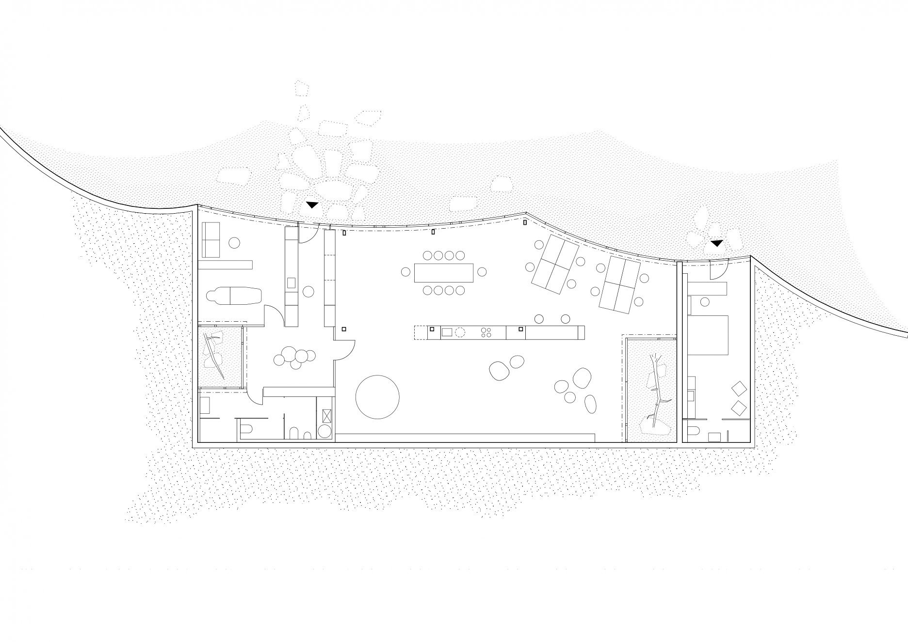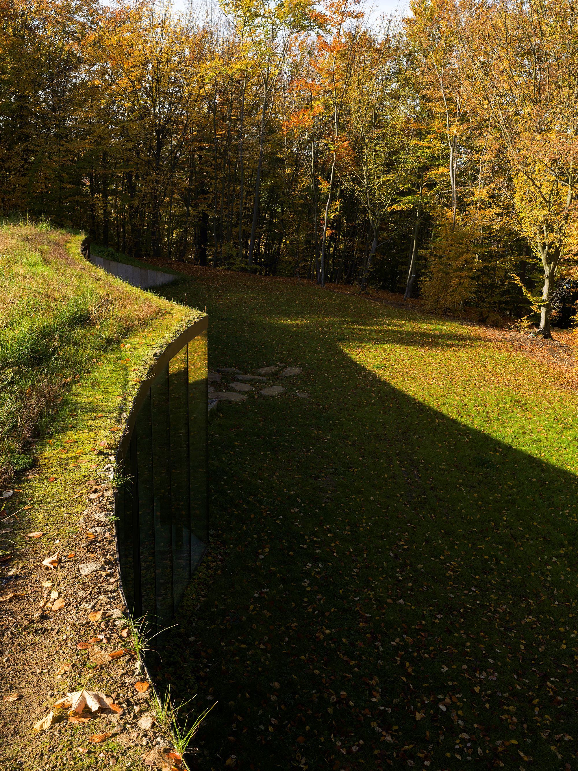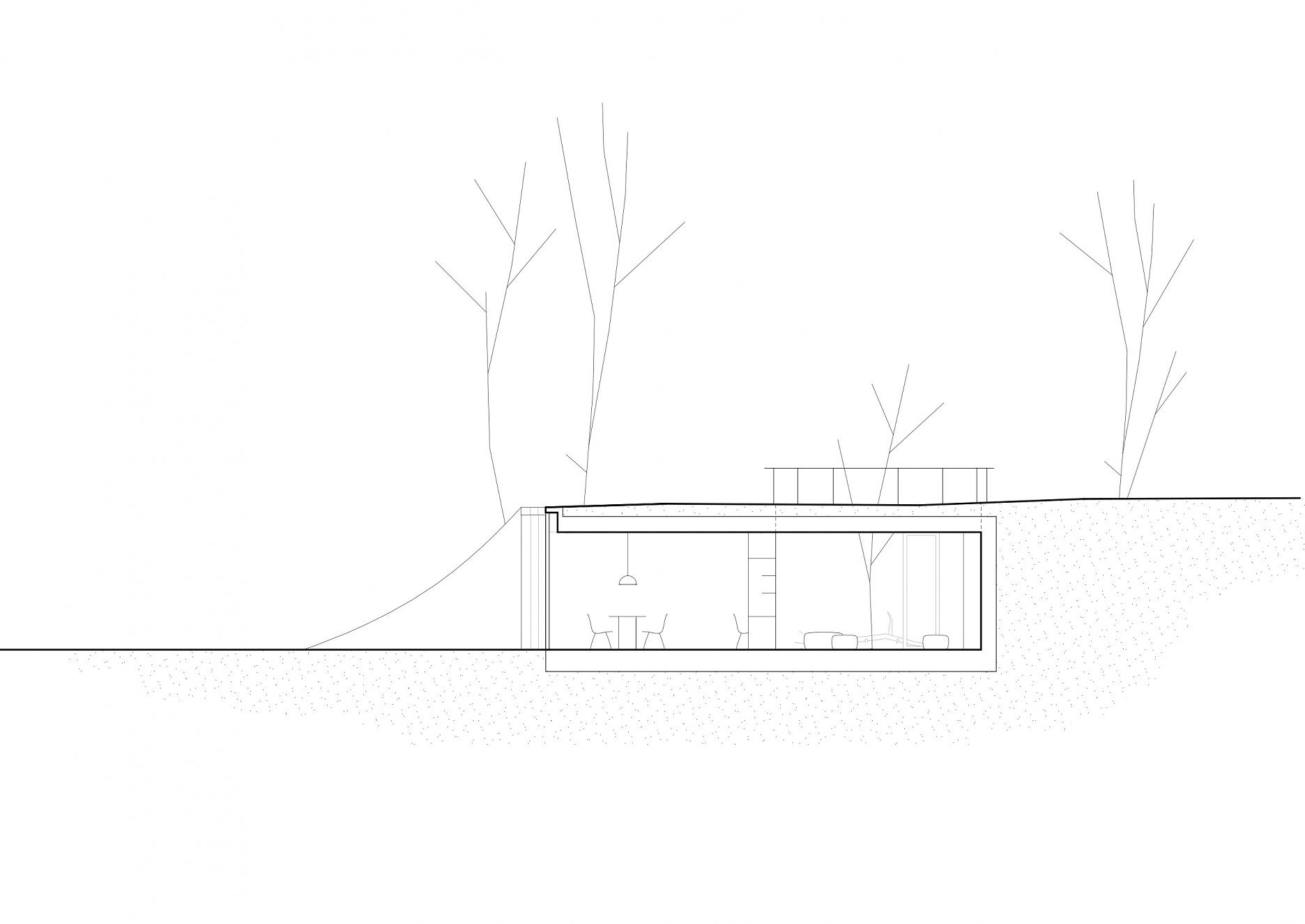 Hľadanie miesta, v ktorom by škola nerušila rodinný život a dostatočnú autonómiu, vyústilo do odhrnutia lomovej suti a osadenia objektu do vzniknutého terénneho zárezu. Integrácia objektu do terénu je zavŕšená "potiahnutím" zelenej lúky spred rodinného domu na strechu školy. Zo strany exteriéru prezrádza jej prítomnosť iba zvlnená presklená fasáda so subtílnym detailom, akcentujúcim terénny zlom.