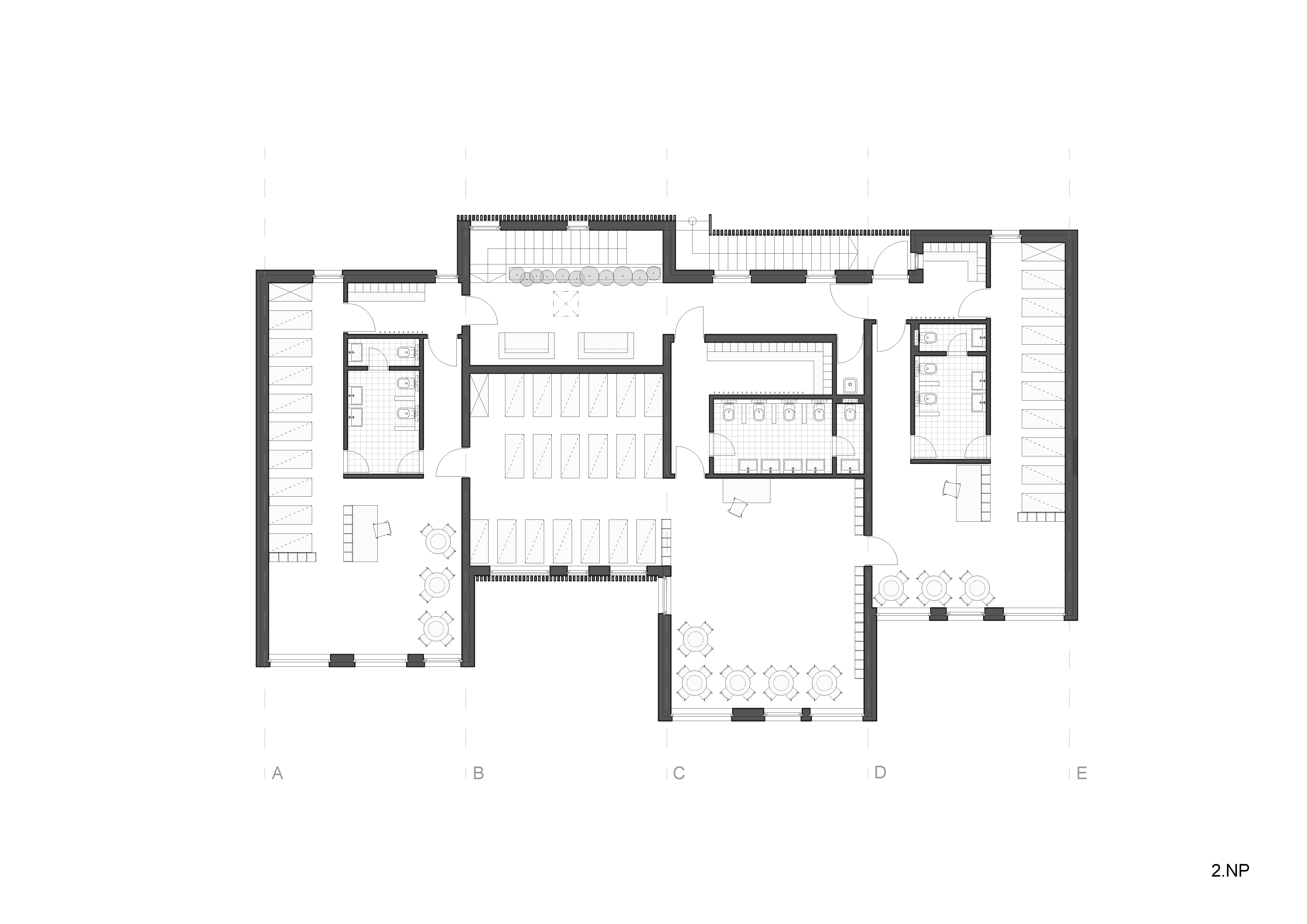 Spoločenská miestnosť slúži na stravovanie, stretávanie a vzajomnú interakciu detí, môžu sa tu konať aj besiedky alebo malé divadielka pre rodičov. Miestnosť je v priamom napojení na hlavný vstup, ako aj administratívu a kuchyňu. Menší sklad a toalety sú takisto hneď na dosah.