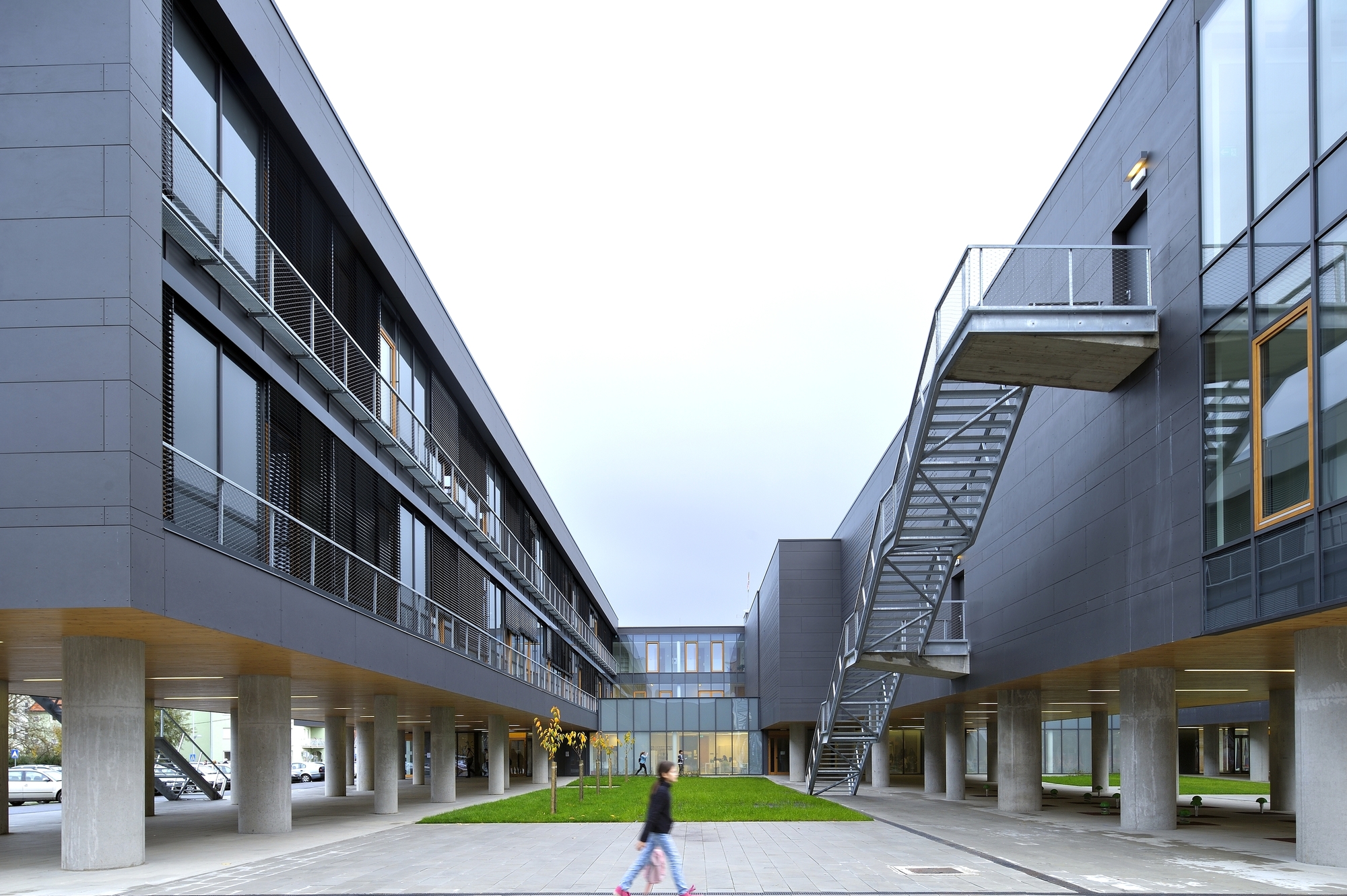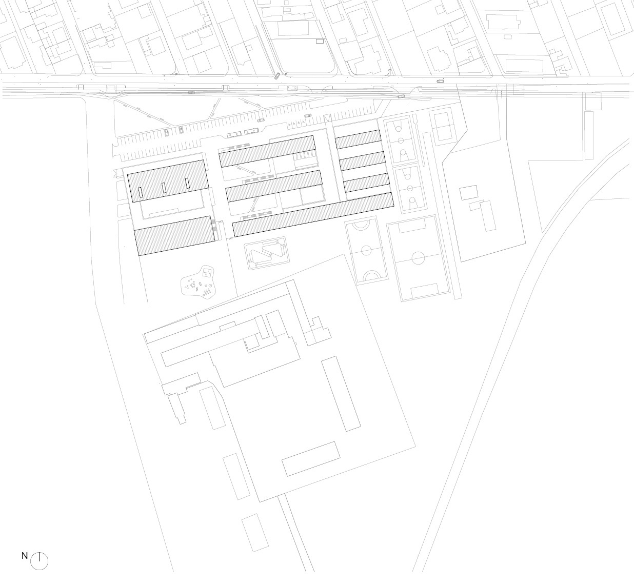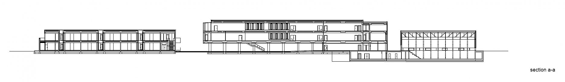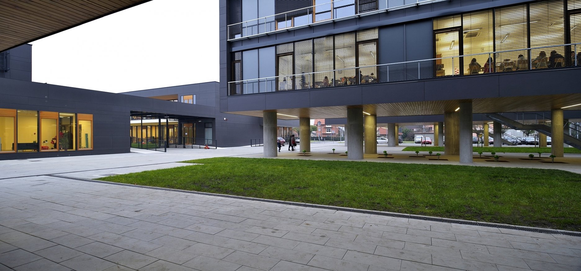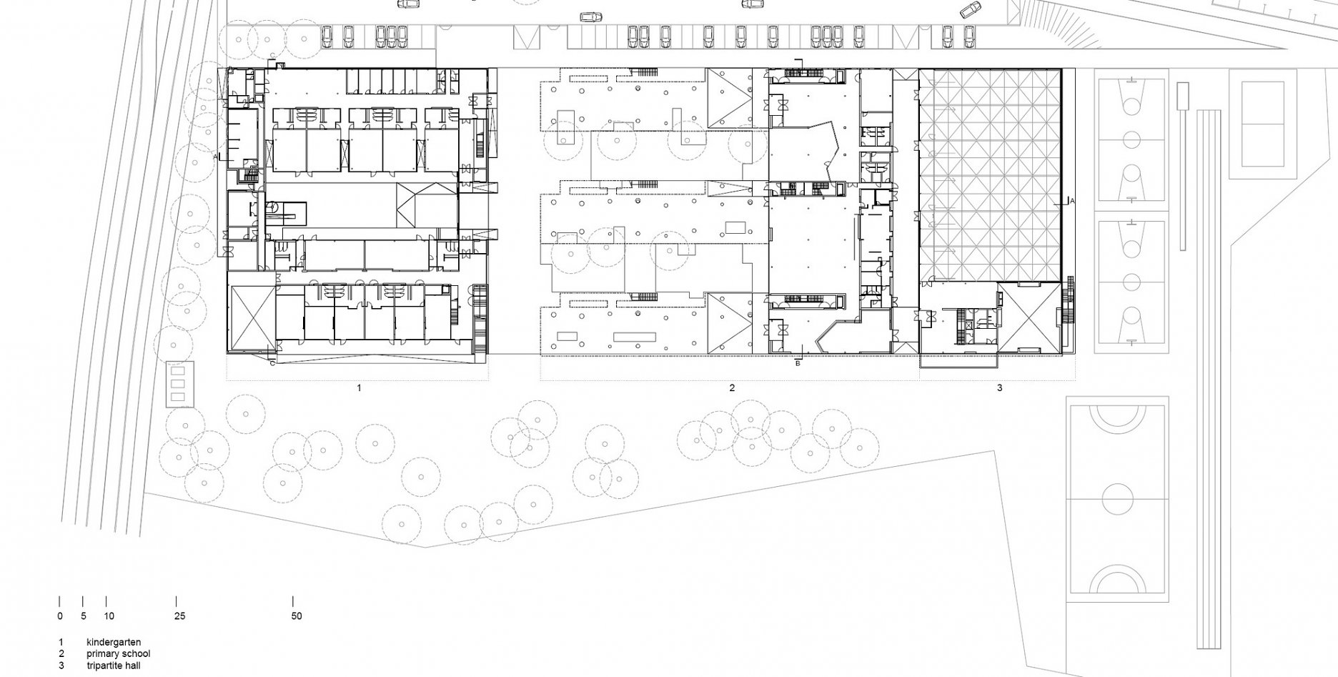 Kompaktné bloky učební uvoľňujú veľkú časť pozemku pre ihriská a v duchu posledných tendencií aj pre verejne prístupné športoviská a zelené plochy.
