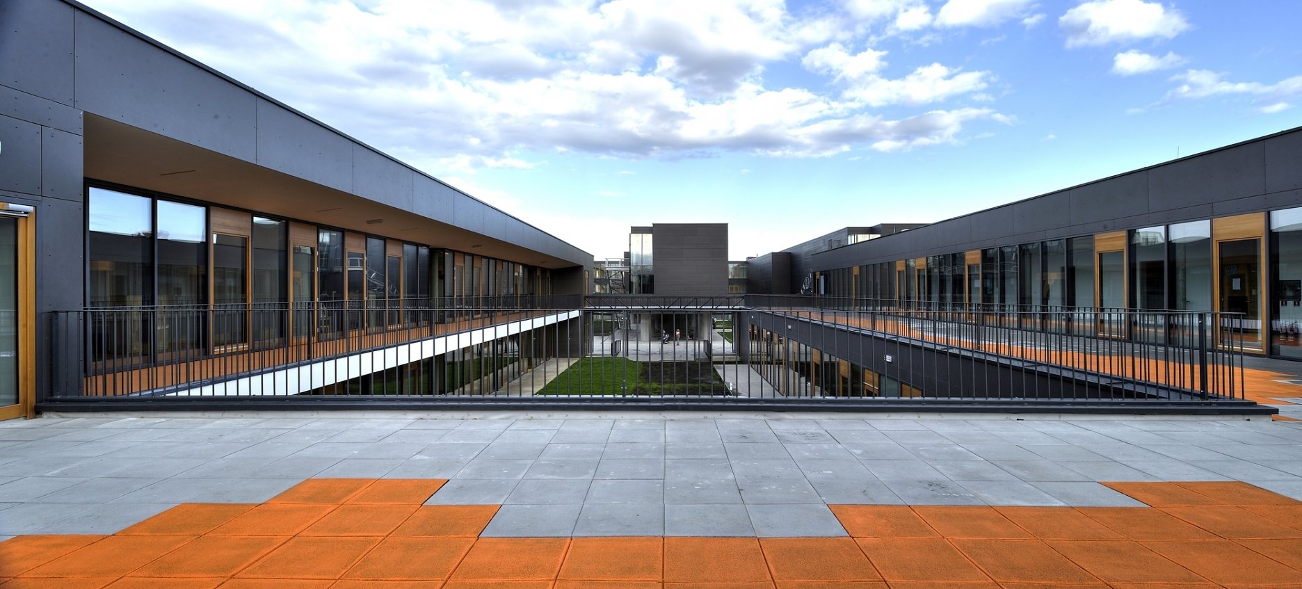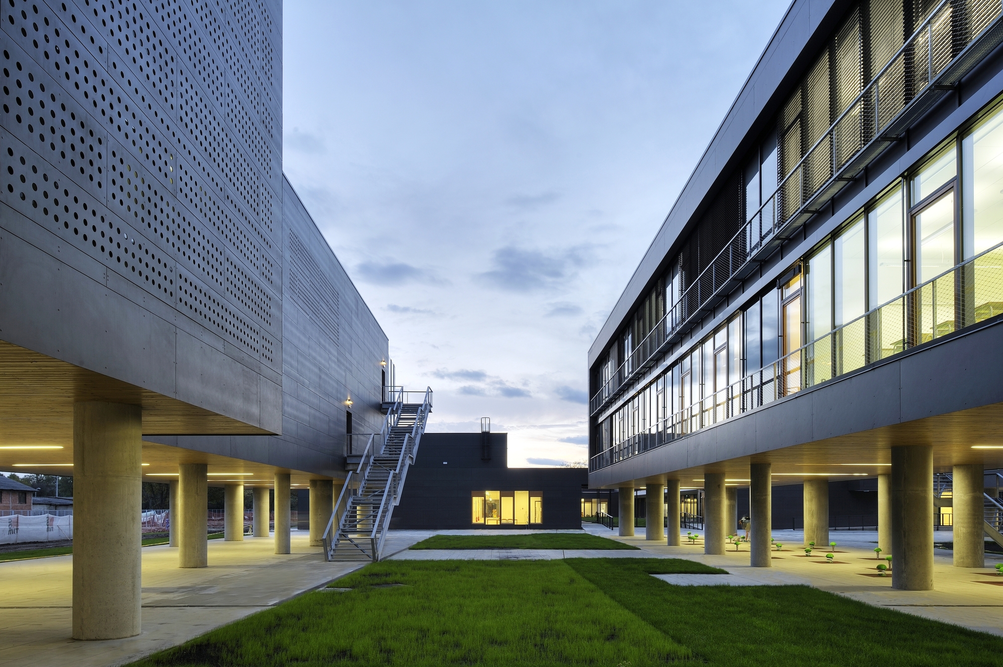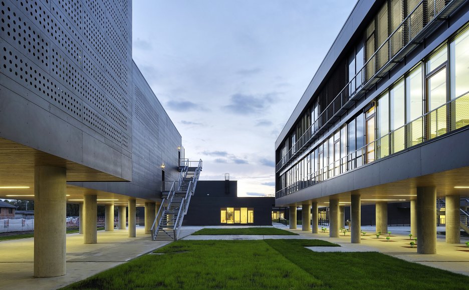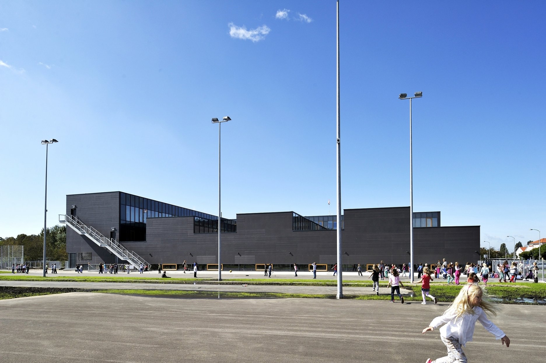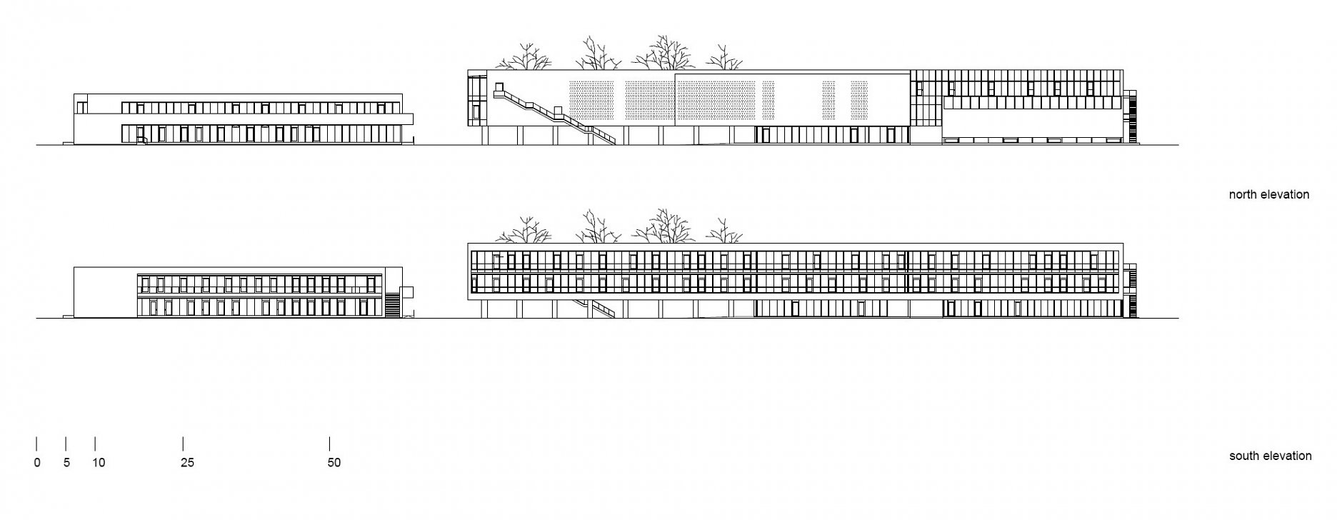 Kompaktné bloky učební uvoľňujú veľkú časť pozemku pre ihriská a v duchu posledných tendencií aj pre verejne prístupné športoviská a zelené plochy.