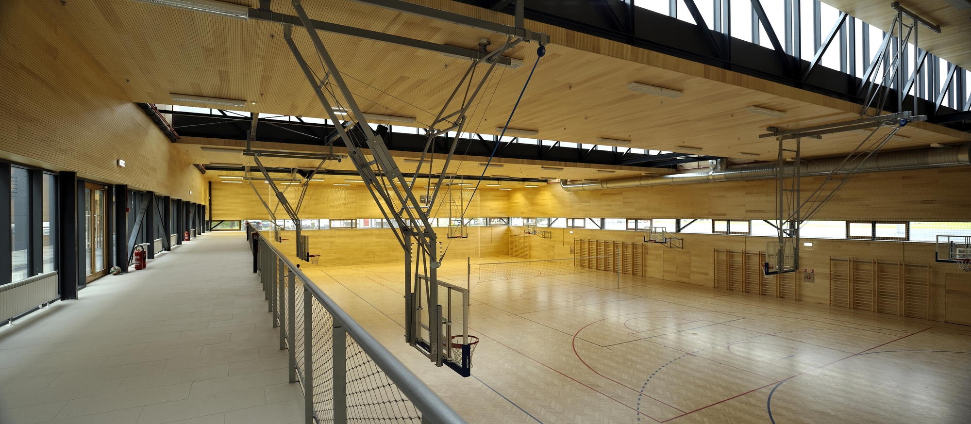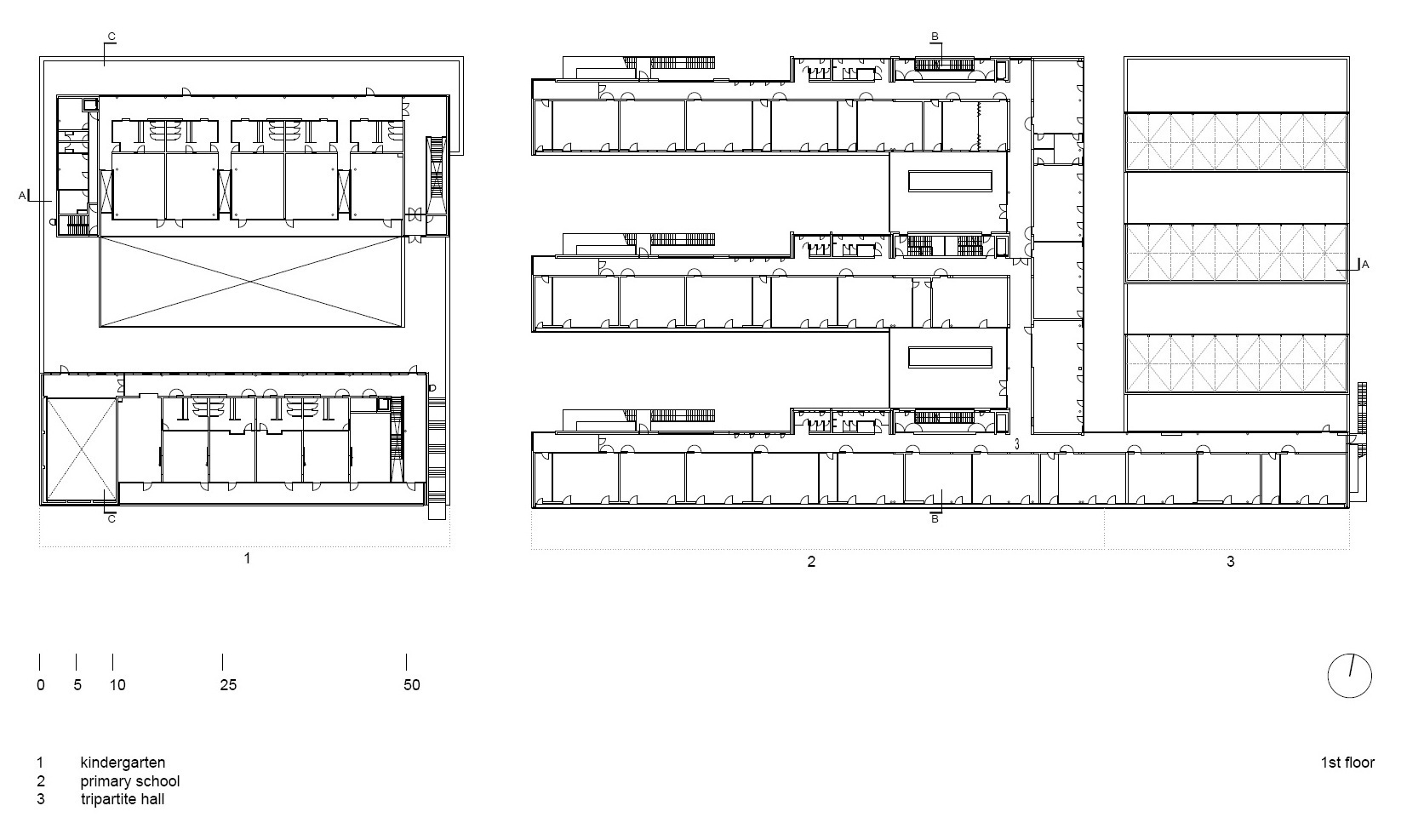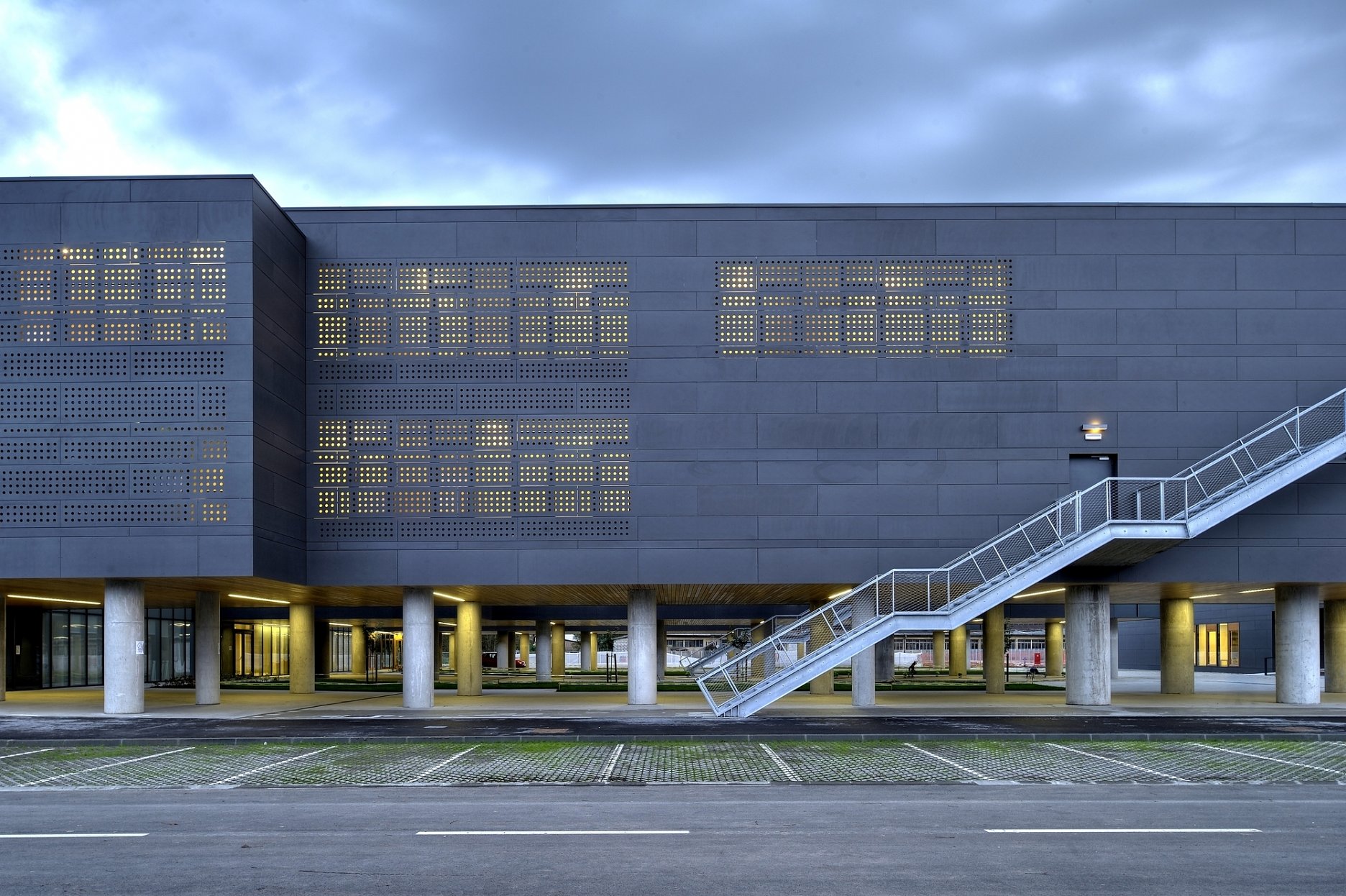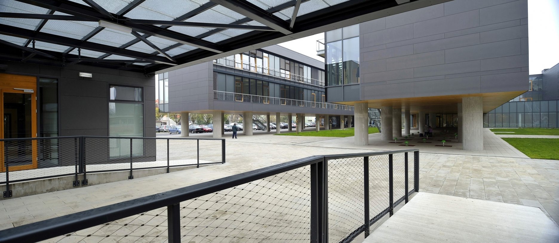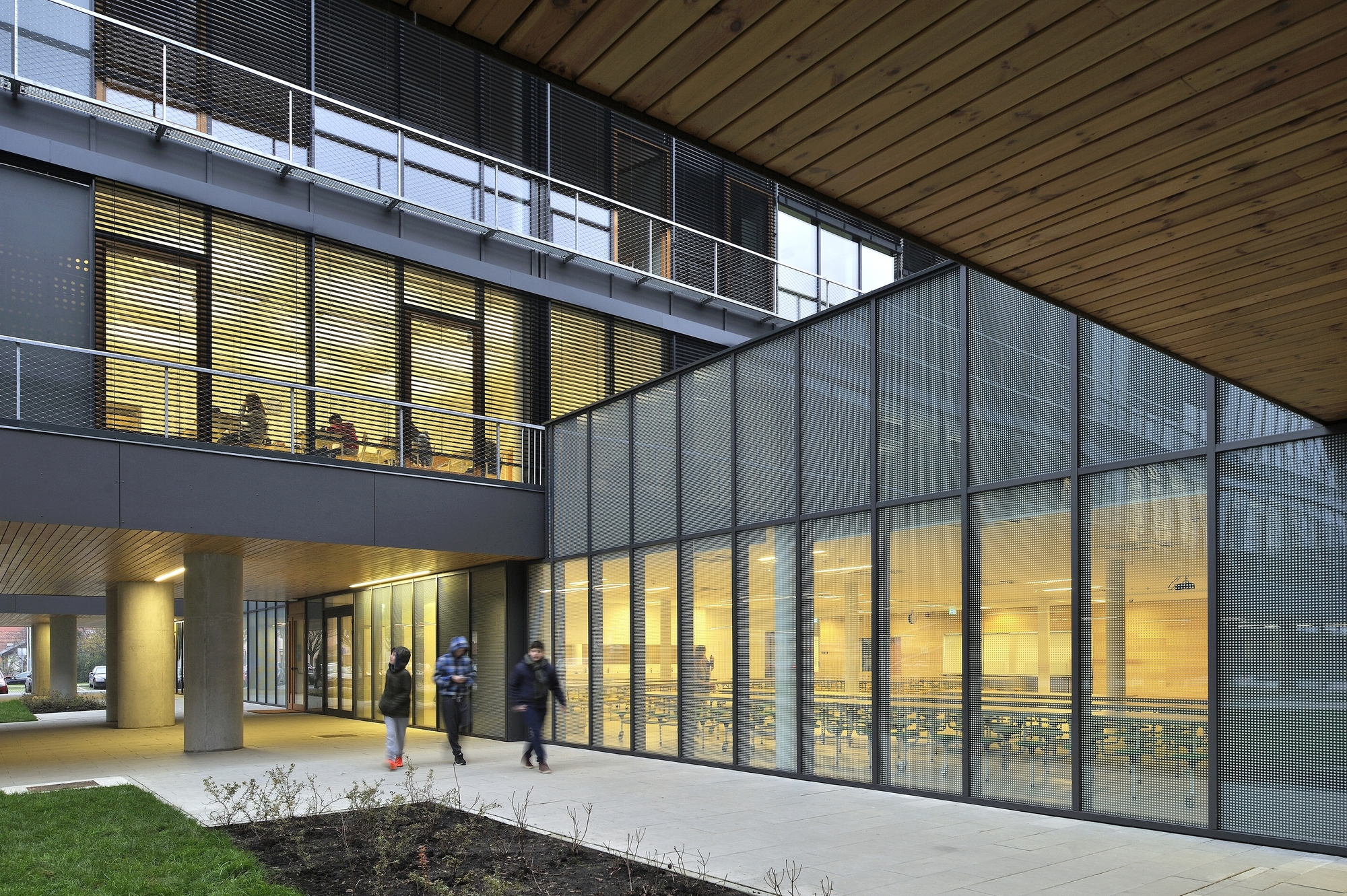 Kompaktné bloky učební uvoľňujú veľkú časť pozemku pre ihriská a v duchu posledných tendencií aj pre verejne prístupné športoviská a zelené plochy.
