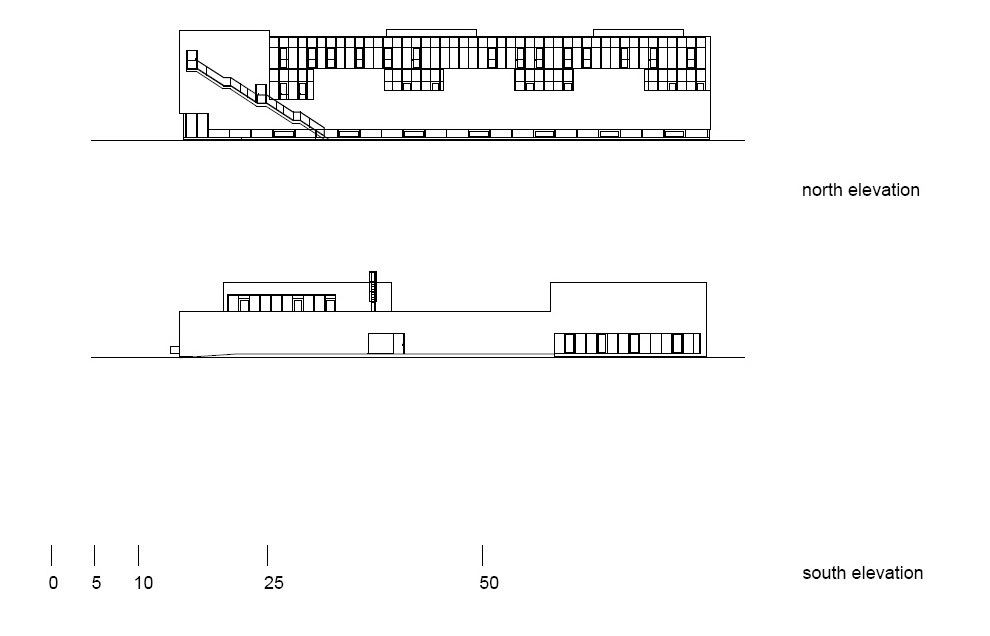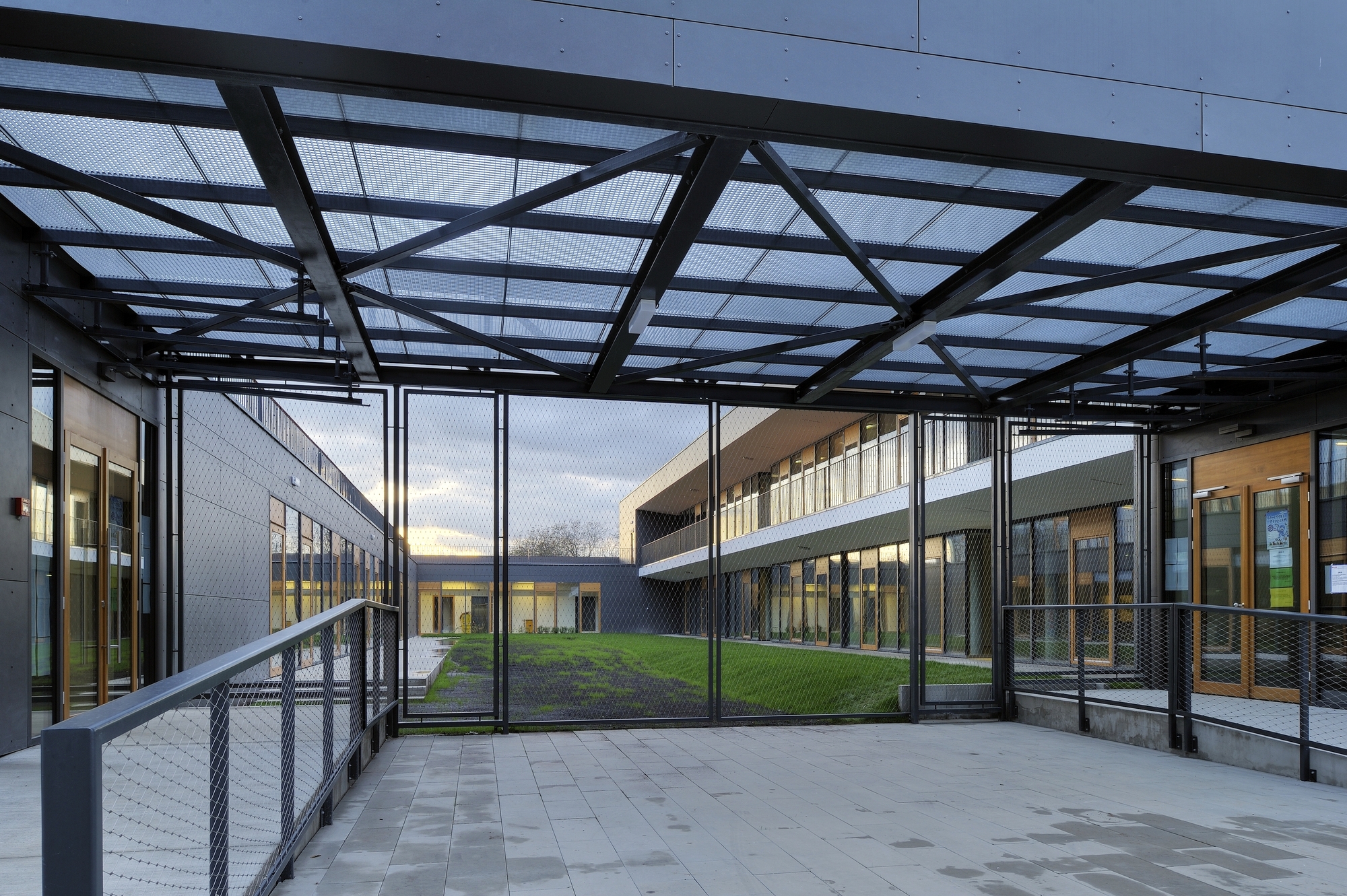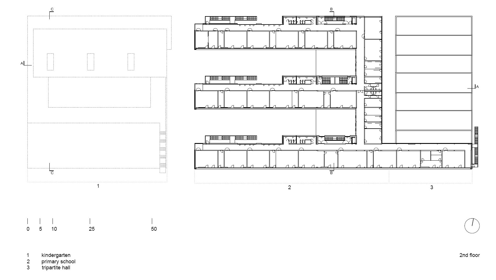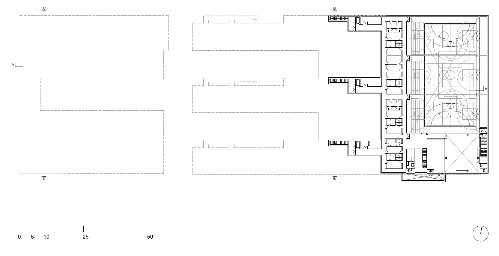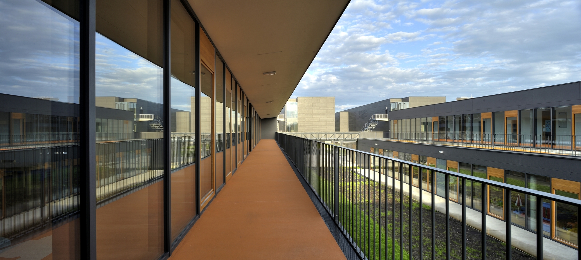 Kompaktné bloky učební uvoľňujú veľkú časť pozemku pre ihriská a v duchu posledných tendencií aj pre verejne prístupné športoviská a zelené plochy.