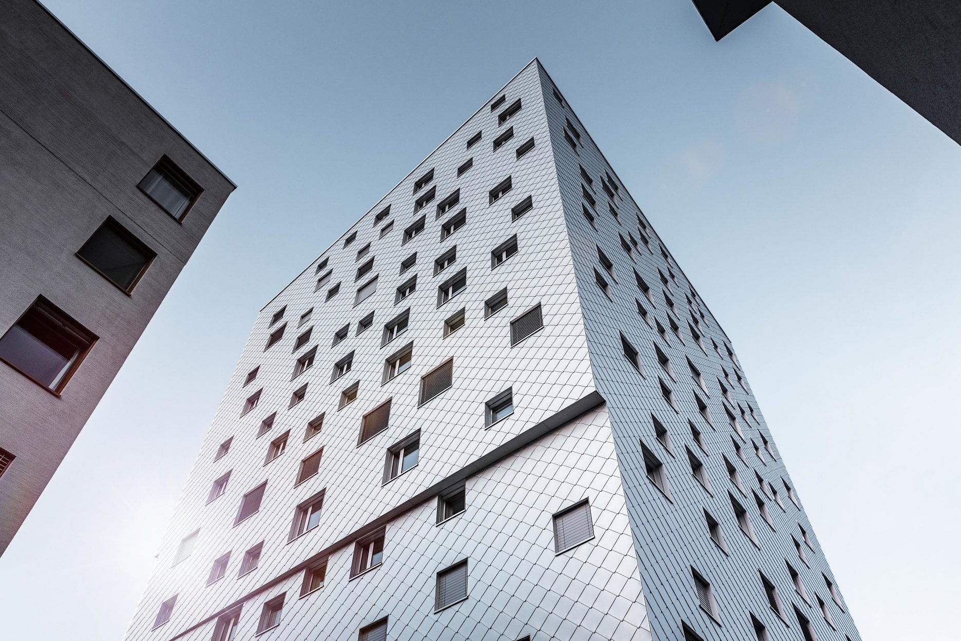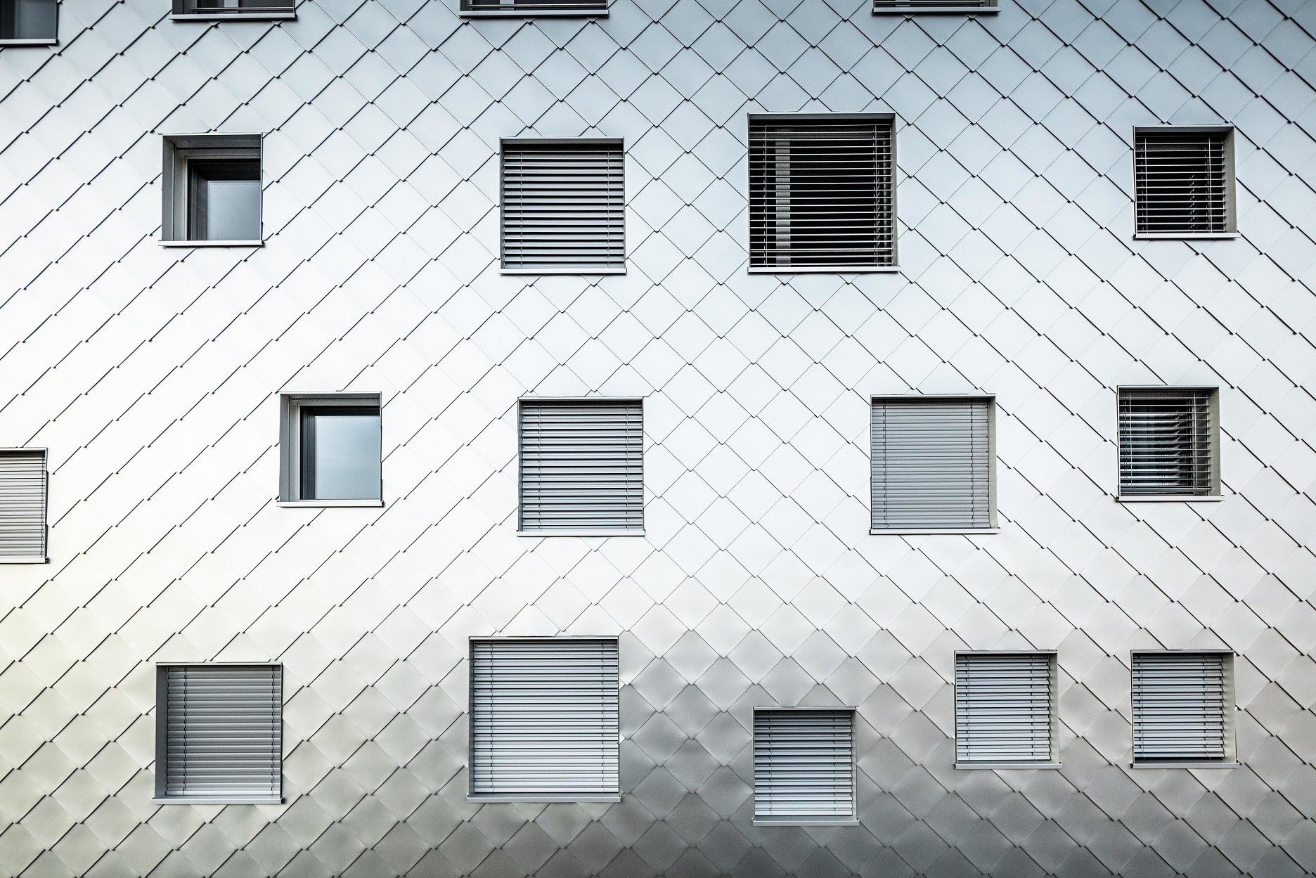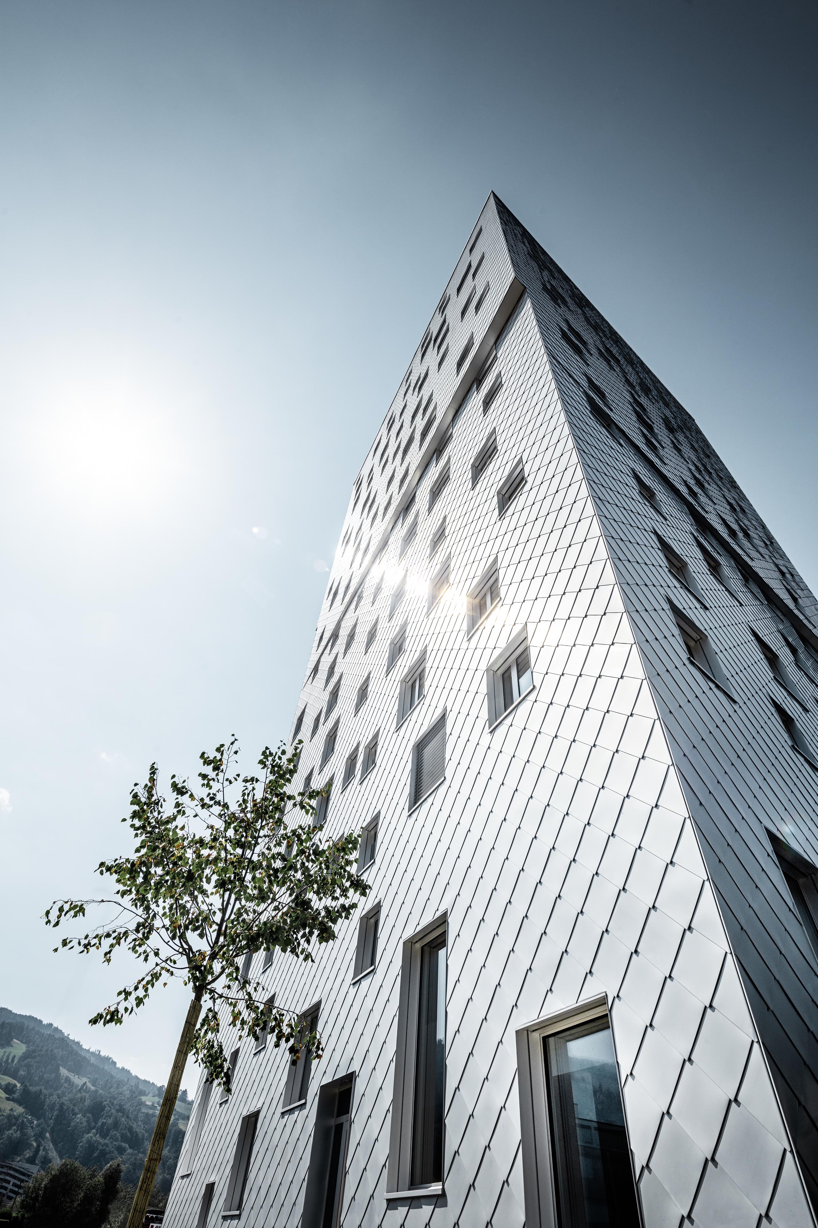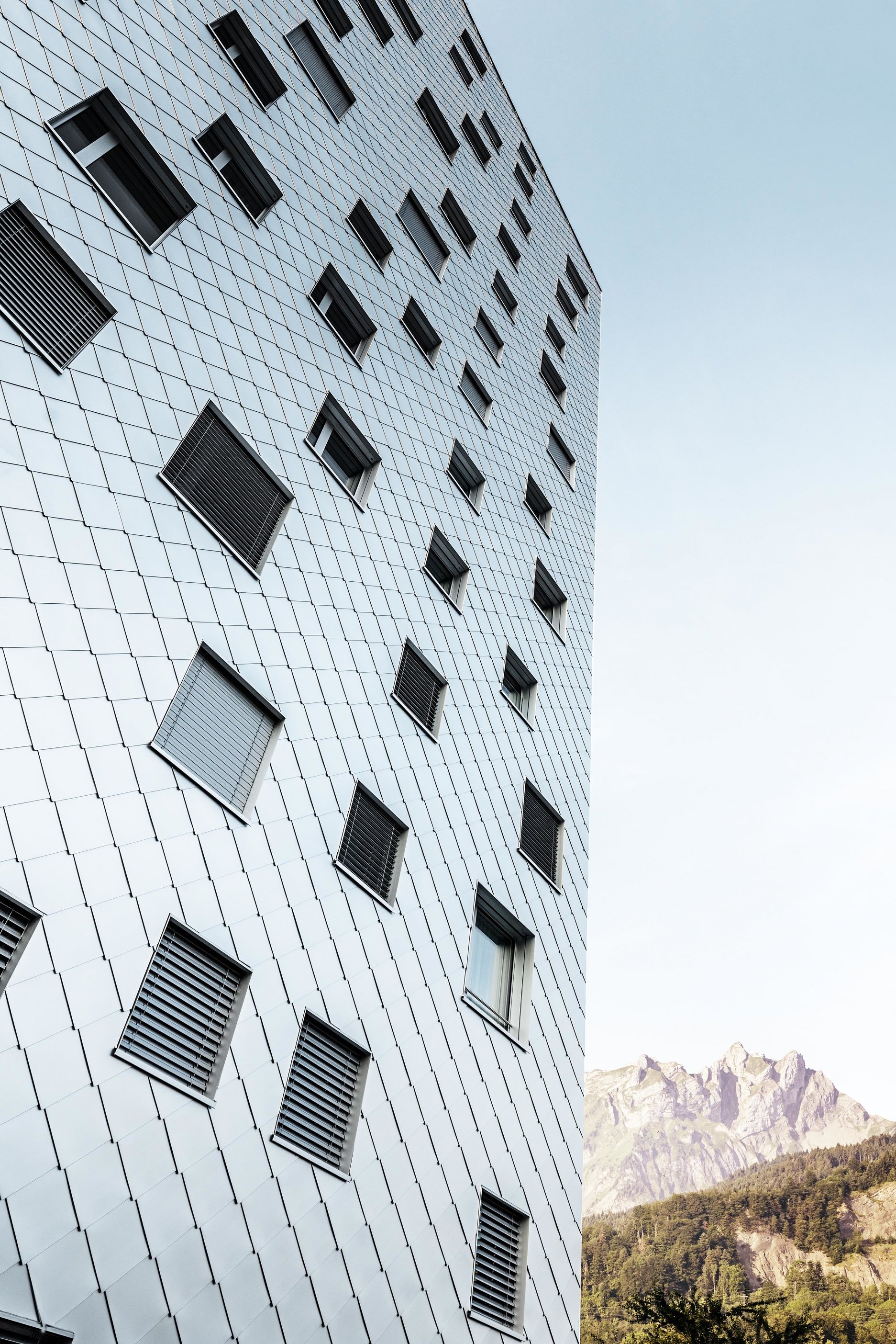 Dôležitou súčasťou konceptu je už spomínaný plášť z hliníkových šablón, ktorý vnáša do kompozície dynamický prvok. Lesklý povrch s prírodným eloxom, zrkadlí okolité prostredie a svetelné podmienky. Pravidelný raster kosoštvorcových šablón súčasne príjemne štruktúruje celok a necháva vyniknúť kompaktnú architektonickú formu.