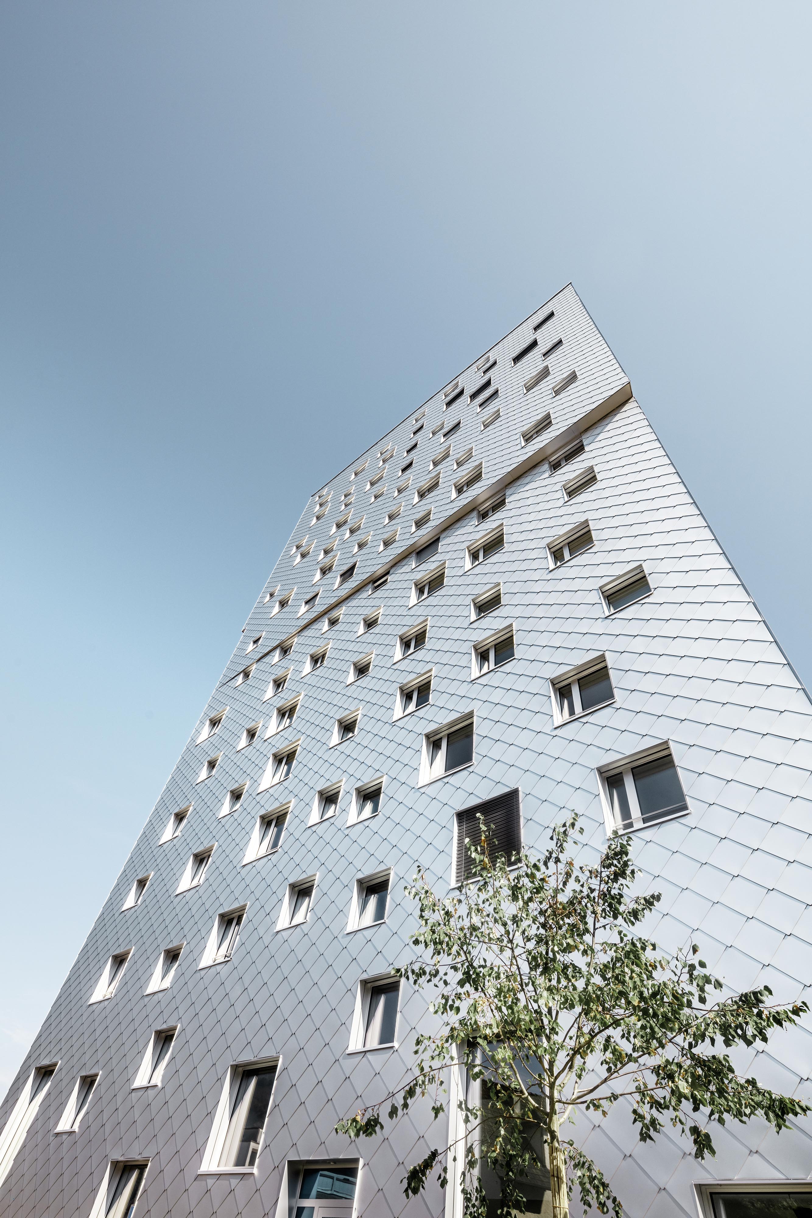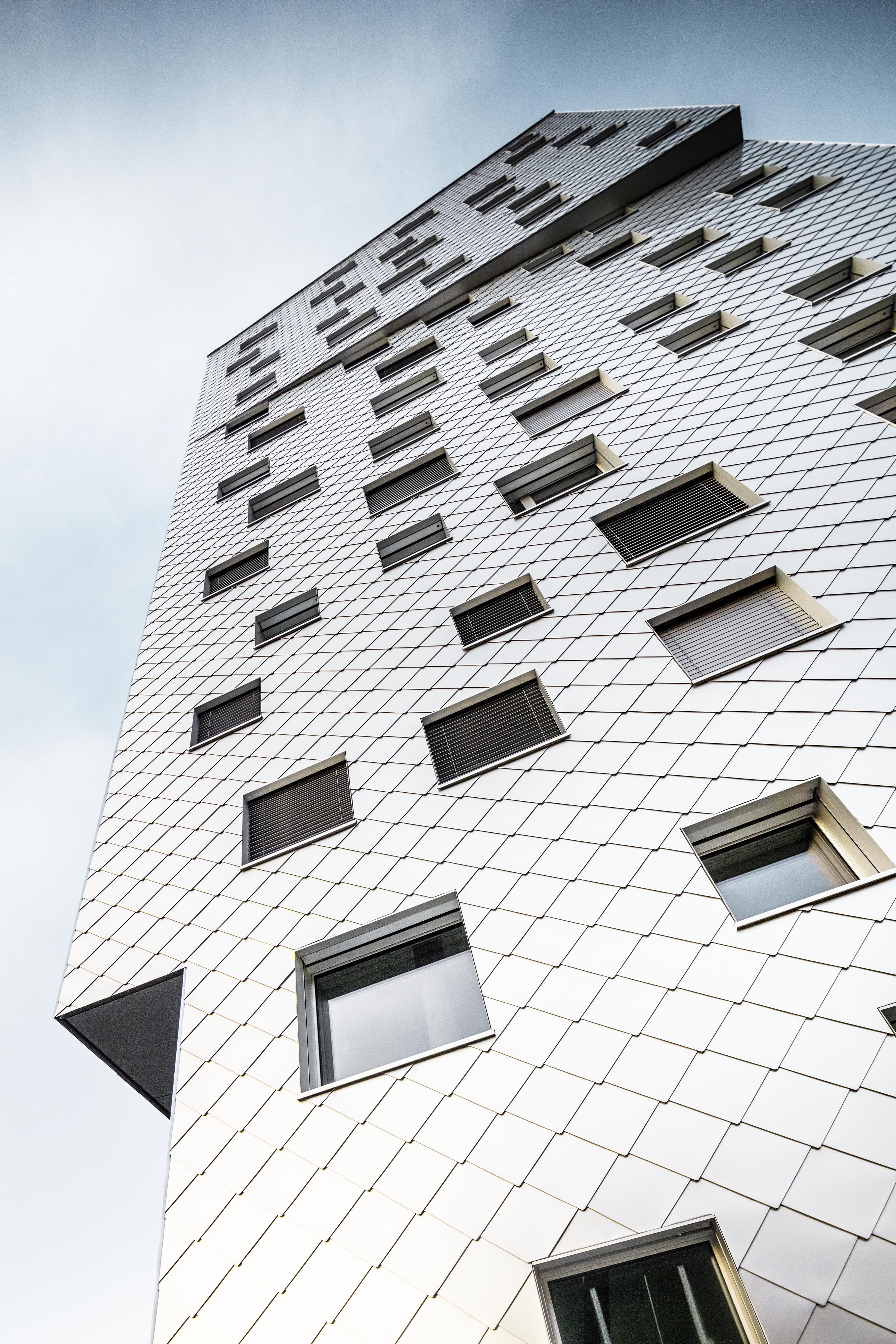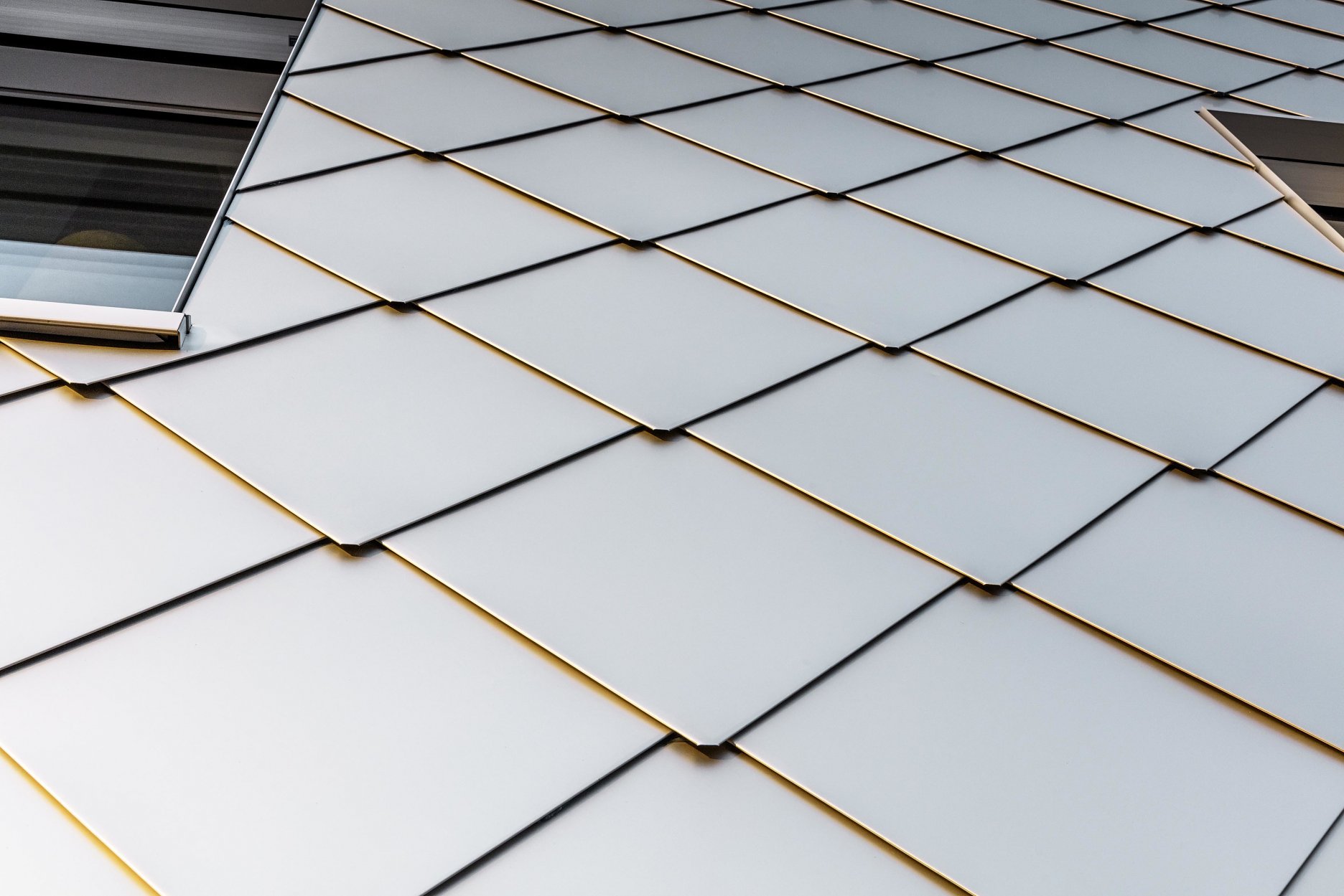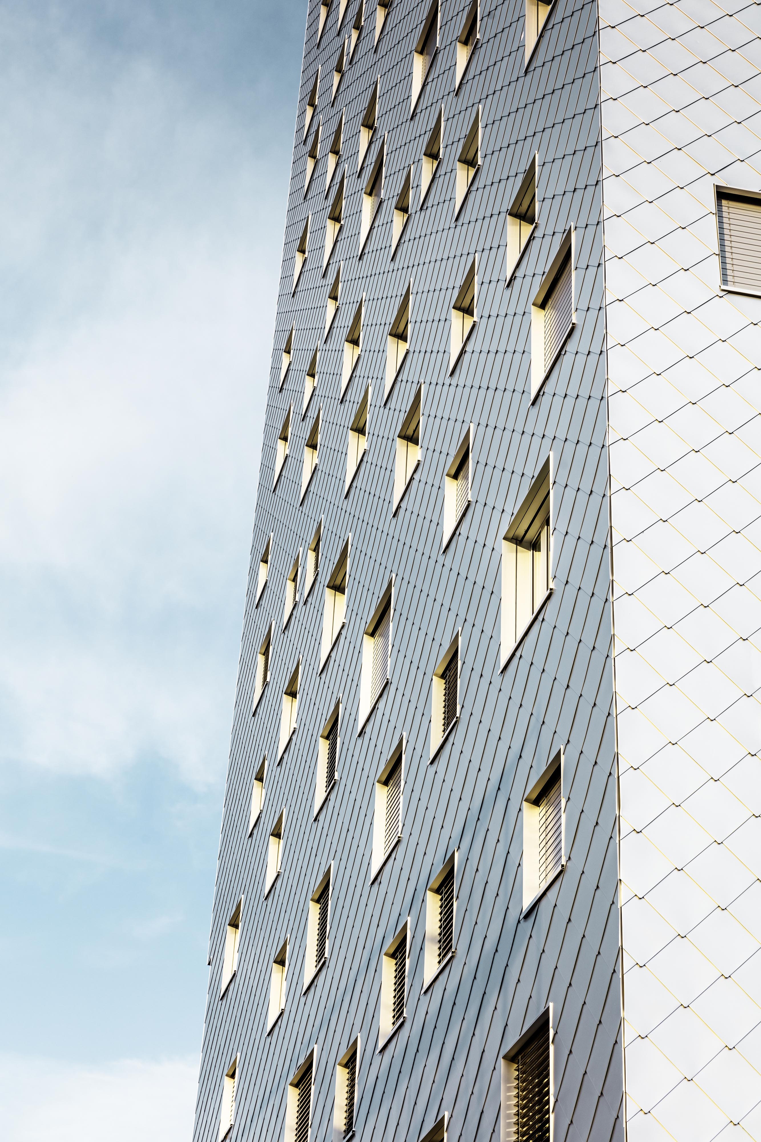 Prevetrávanú fasádu, s celkovou výmerou 3100 metrov štvorcových tvorí viac ako 17 000 kosoštvorcových šablón s rozmermi 440 x 440 mm, hrubých 0,7 mm. Odvetraná fasáda a strecha je systémovým riešením spoločnosti PREFA ALUMINIUMPRODUKTE, ktoré dopĺňajú atypické detaily prispôsobené na mieru projektu. Výsledná realizácia je zaujímavým príkladom riešenia komplexných detailov, ktoré sú kľúčové pre celkové vyznenie architektonického konceptu.