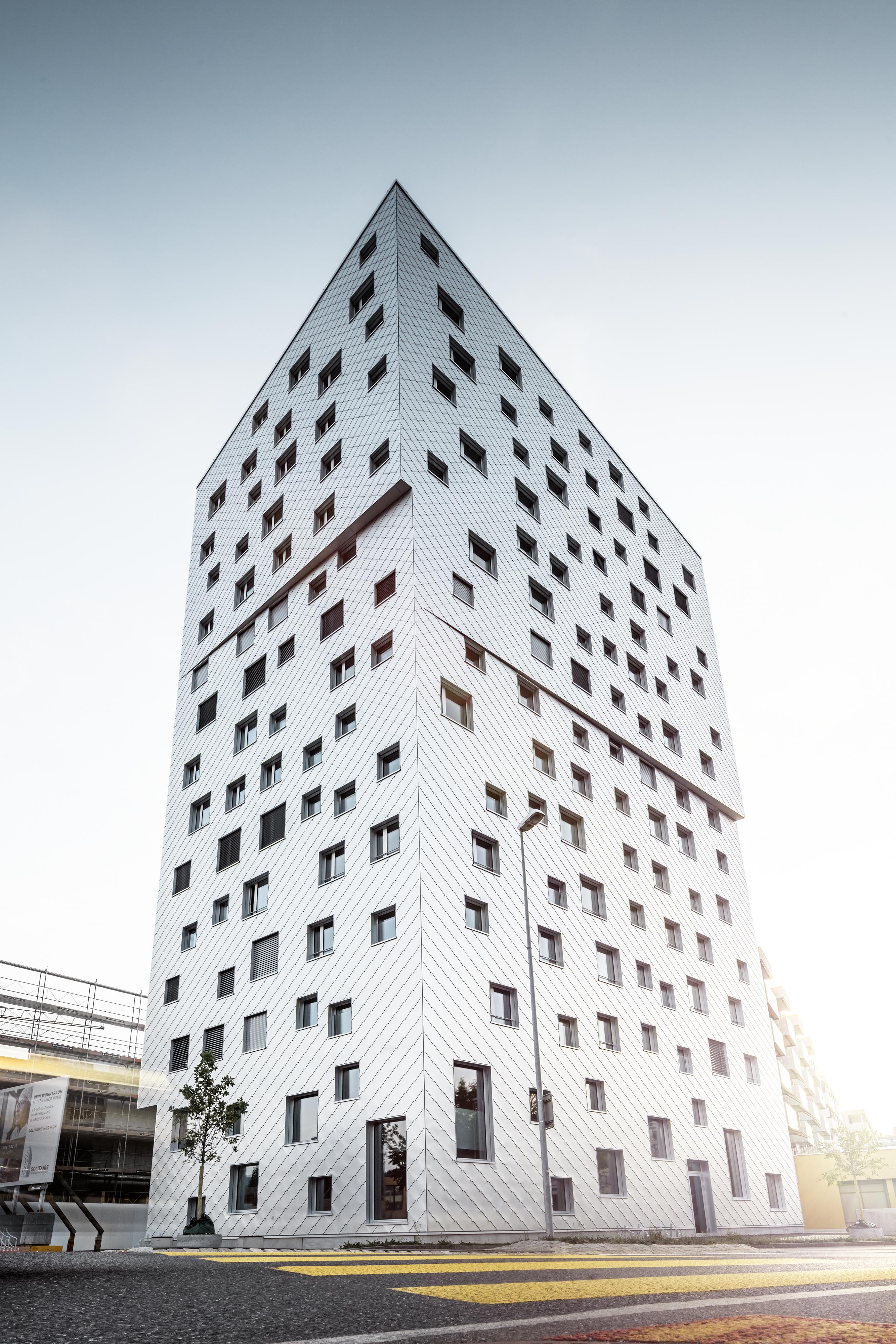 Návrh novej výškovej dominanty s príznačným názvom Solitaire zveril investor zürišskému ateliéru Tilly Theus. Architektka sa počas svojej tvorivej kariéry, ktorá trvá už viac ako pol storočia, zaradila medzi najvýraznejšie švajčiarske profesionálky. Architektonický koncept, ktorý zohľadňuje lokalitu na rozhraní urbanizovaného prostredia a krajiny, sa zámerne odkláňa od matematického rastra fasád, typického pre výškové budovy. Základ aj v tomto prípade tvorí klasický monolitický skelet s bielou vaňou, založený na 95 pilótach s priemerom 500 až 1400 mm. Pre Solitaire je však typická kryštalická forma, zjednotená reflexným hliníkovým plášťom, ktorý takmer bez výrazného prerušenia “obaľuje” celú stavbu. Výrazná monolitická forma je perforovaná nepravidelným rastrom okien.