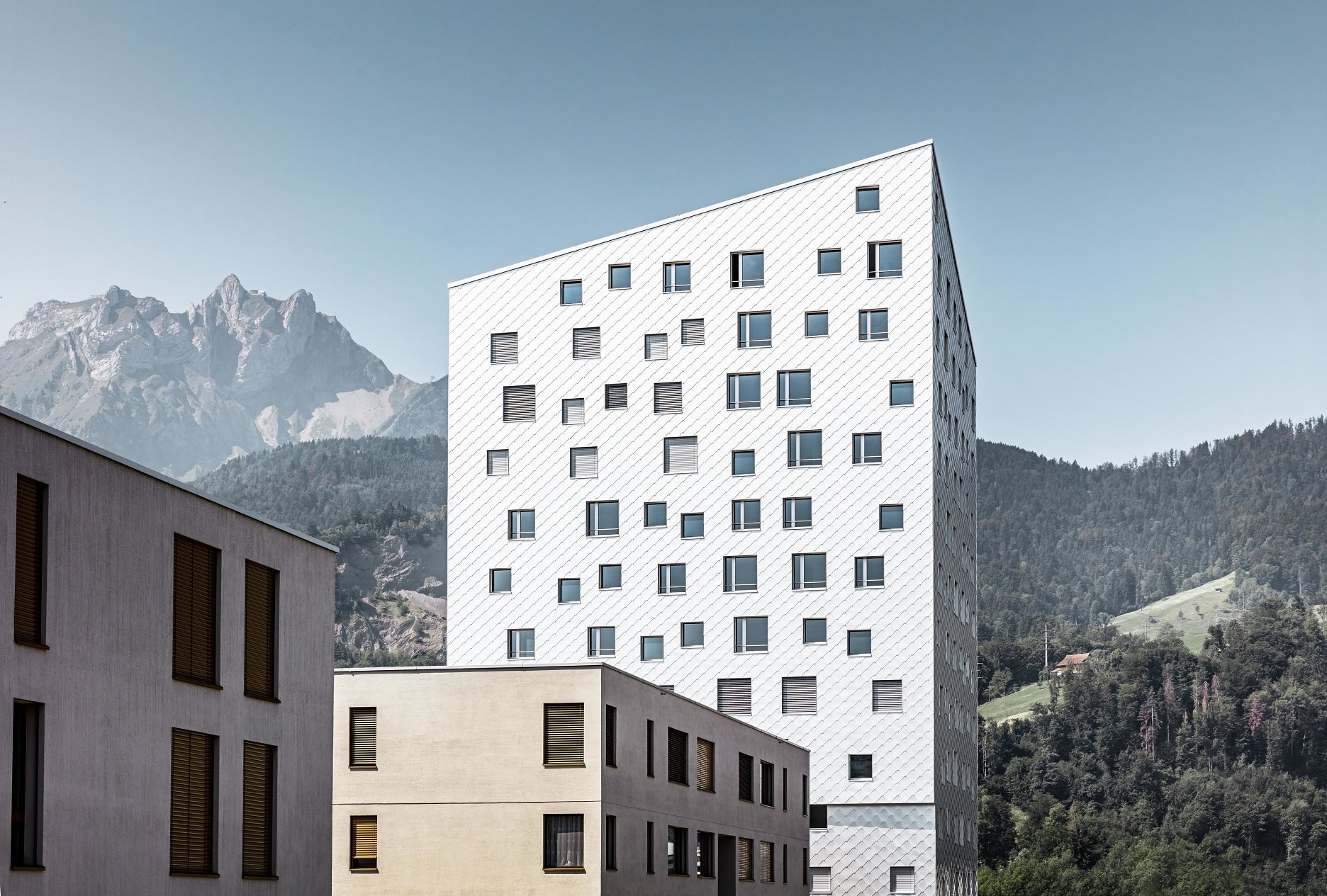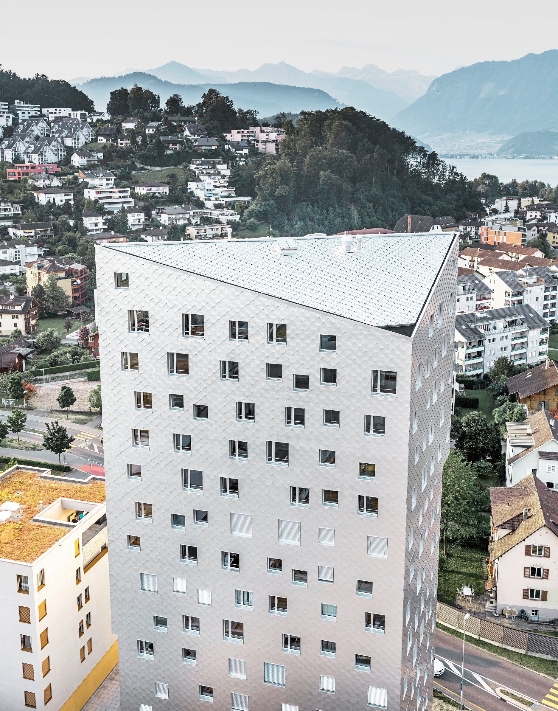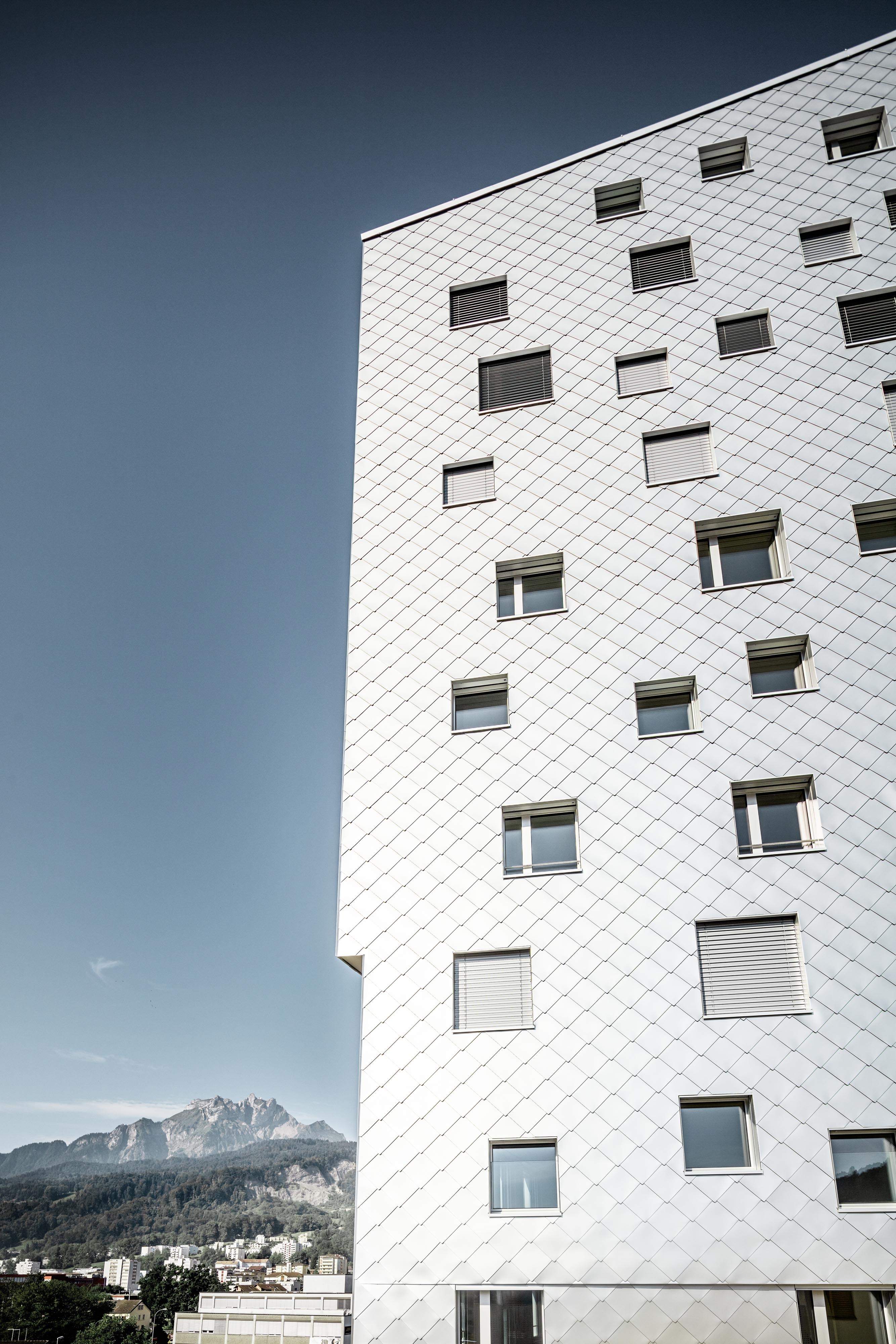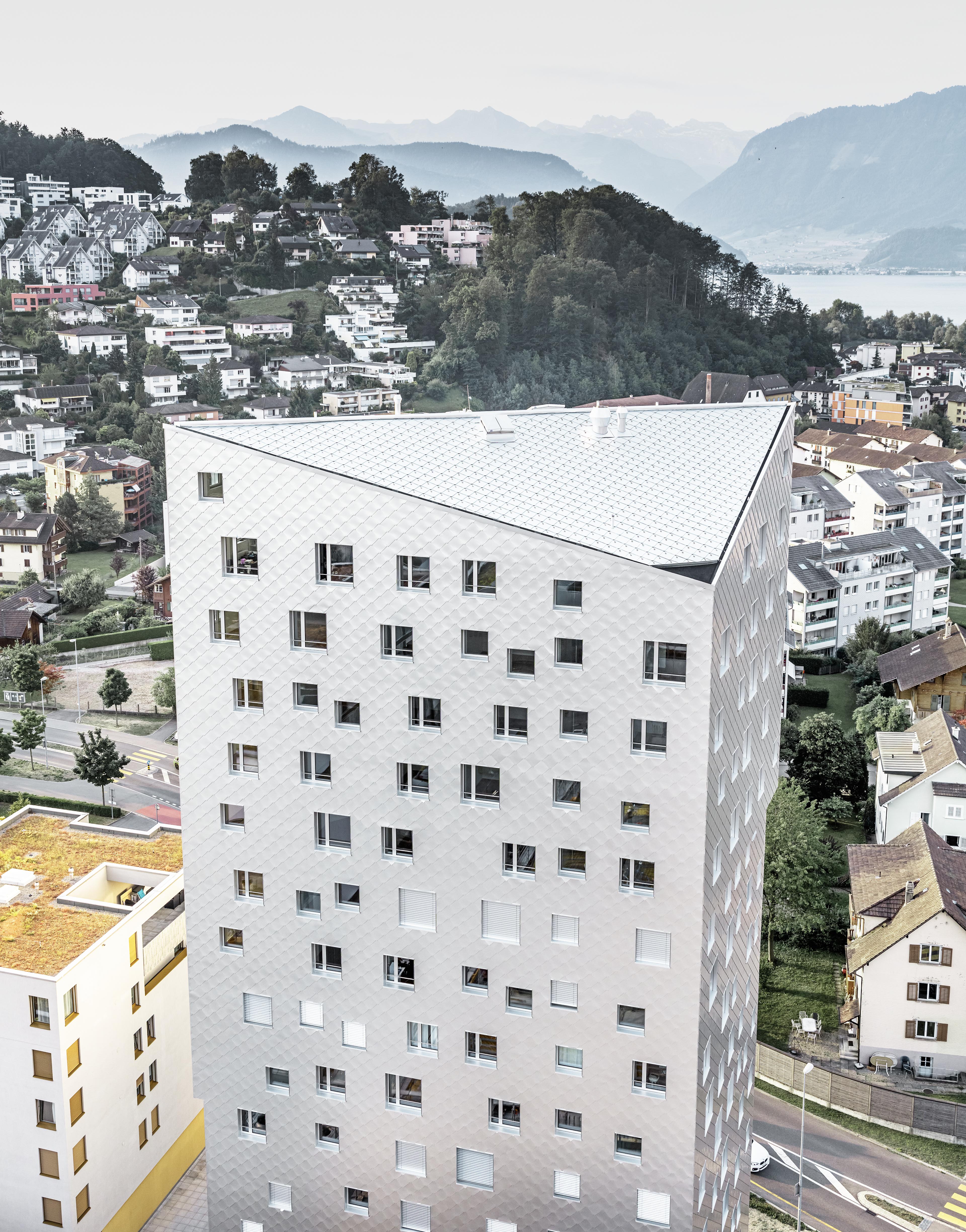 “Chôdza, sedenie pri jedálenskom stole, ležanie na gauči - okná v ideálnej výške otvárajú obytnú plochu k výhľadom,” vysvetľuje Tilla Theus svoj zámer, ktorý sa premietol do výtvarného riešenia fasády. Už byty na spodných podlažiach majú nerušený výhľad na blízke hory Pilatus a Rigi. Z ôsmeho poschodia sa otvára pohľad na hladinu Luzernského jazera.