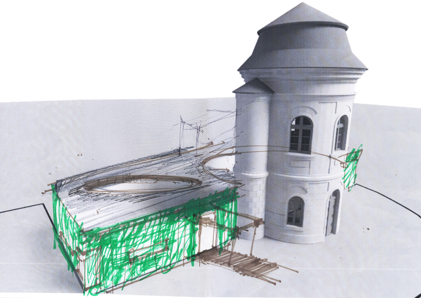 Koncept vychádza z dvoch motívov - fresky na prízemí pôvodnej Rotundy a elipsového okna na schodisku. Freska, na ktorej je motív kvetov na rastri, ovplyvnila fakt, že celá prístavba má časom zmiznúť pod zeleňou na novom rastri. Elipsové okno podnietilo vznik elipsového svetlíka, cez ktorý je vidieť z interiéru celú hmotu rotundy. Prístavba vypĺňa celý pôdorys pozemku, jej tvar kopíruje jeho kontúry a od rotundy je odsadená menším oblúkovým svetlíkom.