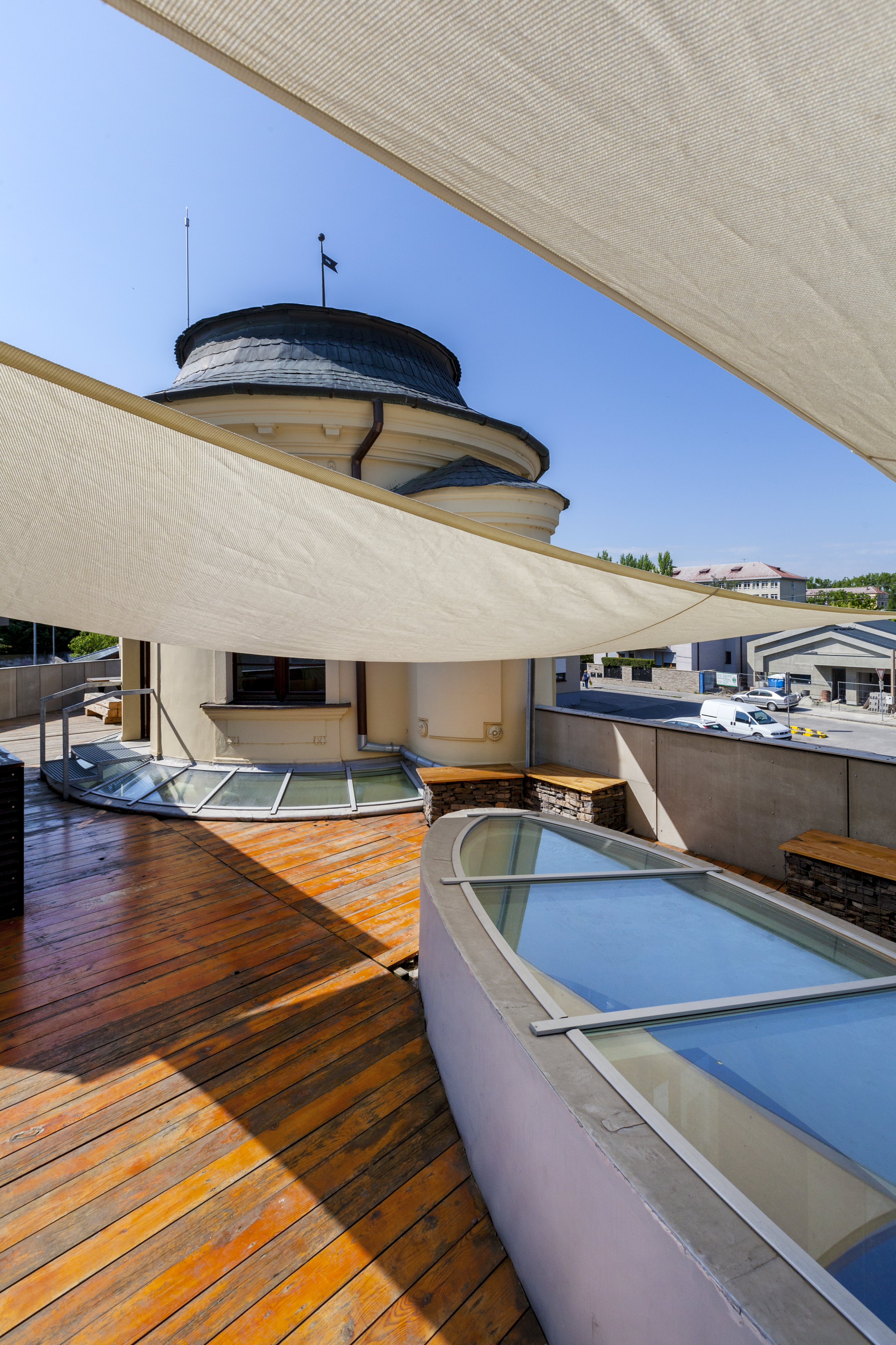 Strešná terasa, poskytujúca príjemné posedenie, výhľad na okolie a optický kontakt s interiérom cez veľký strešný svetlík, je prístupná cez druhé podlažie rotundy, po pôvodných vretenovitých schodiskách umiestnených vo valcových vežičkách.