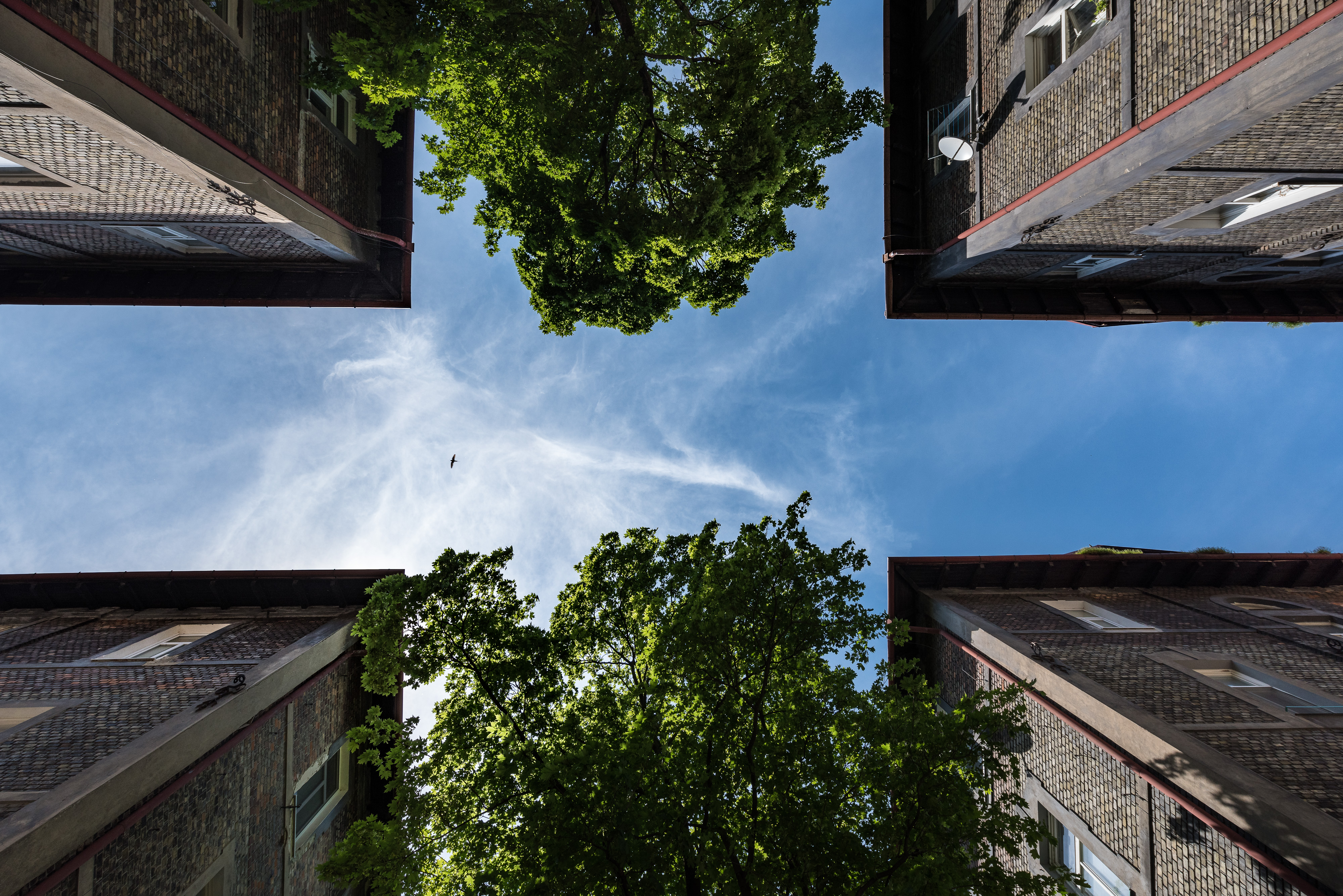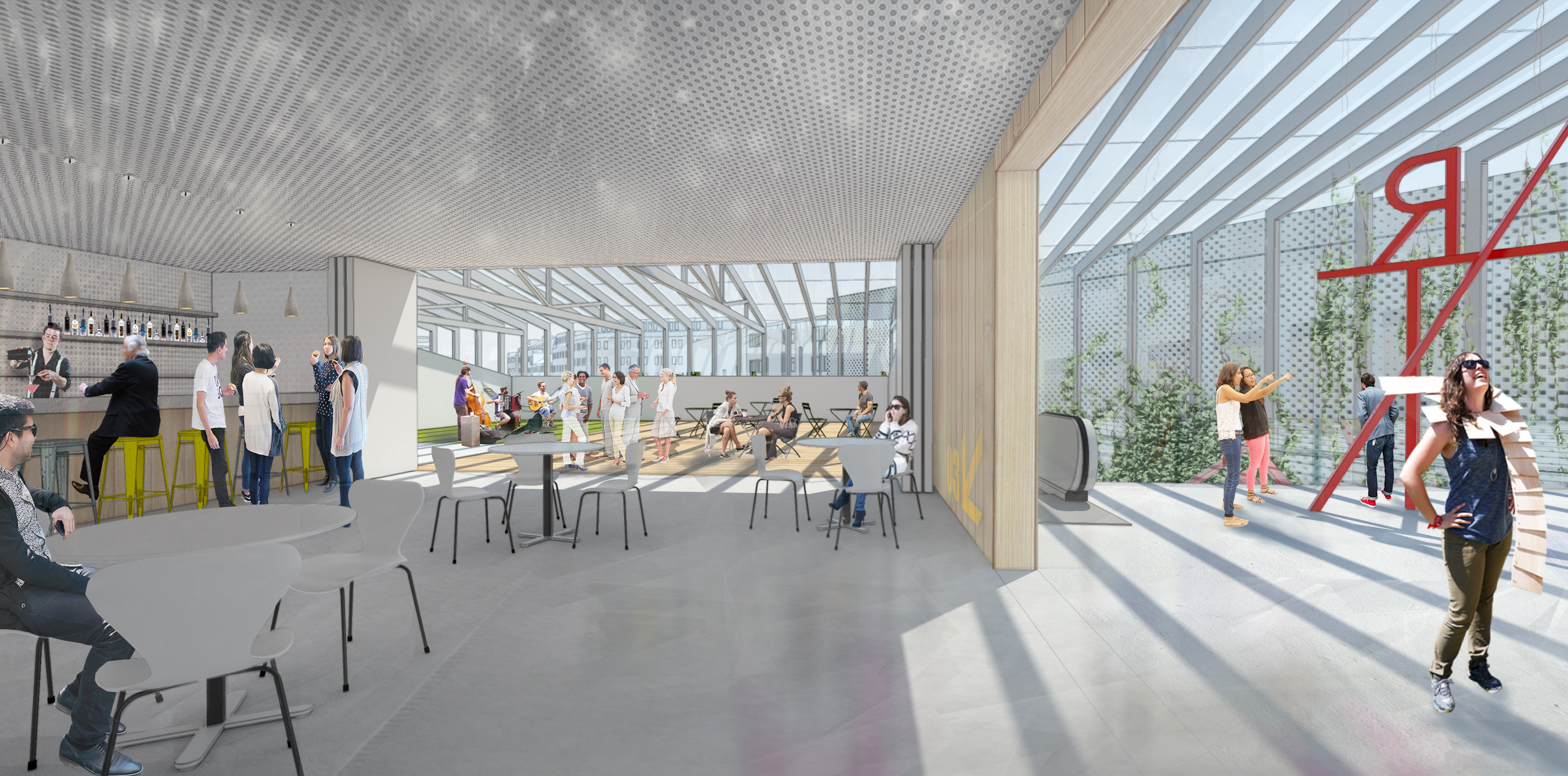 Na najvyššej úrovni vznikli veľké terasy pre návštevníkov centra. Môžu tu tráviť svoj voľný čas a oddychovať na slnku. V prvom boxe sa nachádza kaviareň, ktorá je napojená ako na terasy, tak aj na galériu. V ostatných boxoch sa nachádzajú klubové a stretávacie miestnosti pre komunity. Jednotlivé boxy sú prepojené pobytovými mostíkmi, z ktorých sa dá nastúpiť na výťah. Vertikálne jadrá a sociálne zariadenia sa nachádzajú v dvoch krajných boxoch na severnej strane. Po obvode budovy je pochôdzny mostík s kvetináčmi na pestovanie plodín a rastlín. Tieto vertikálne záhrady sú prístupné z jednotlivých boxov. Mostíky sú kotvené do boxov a stužujú sklenenú obalovú konštrukciu.
