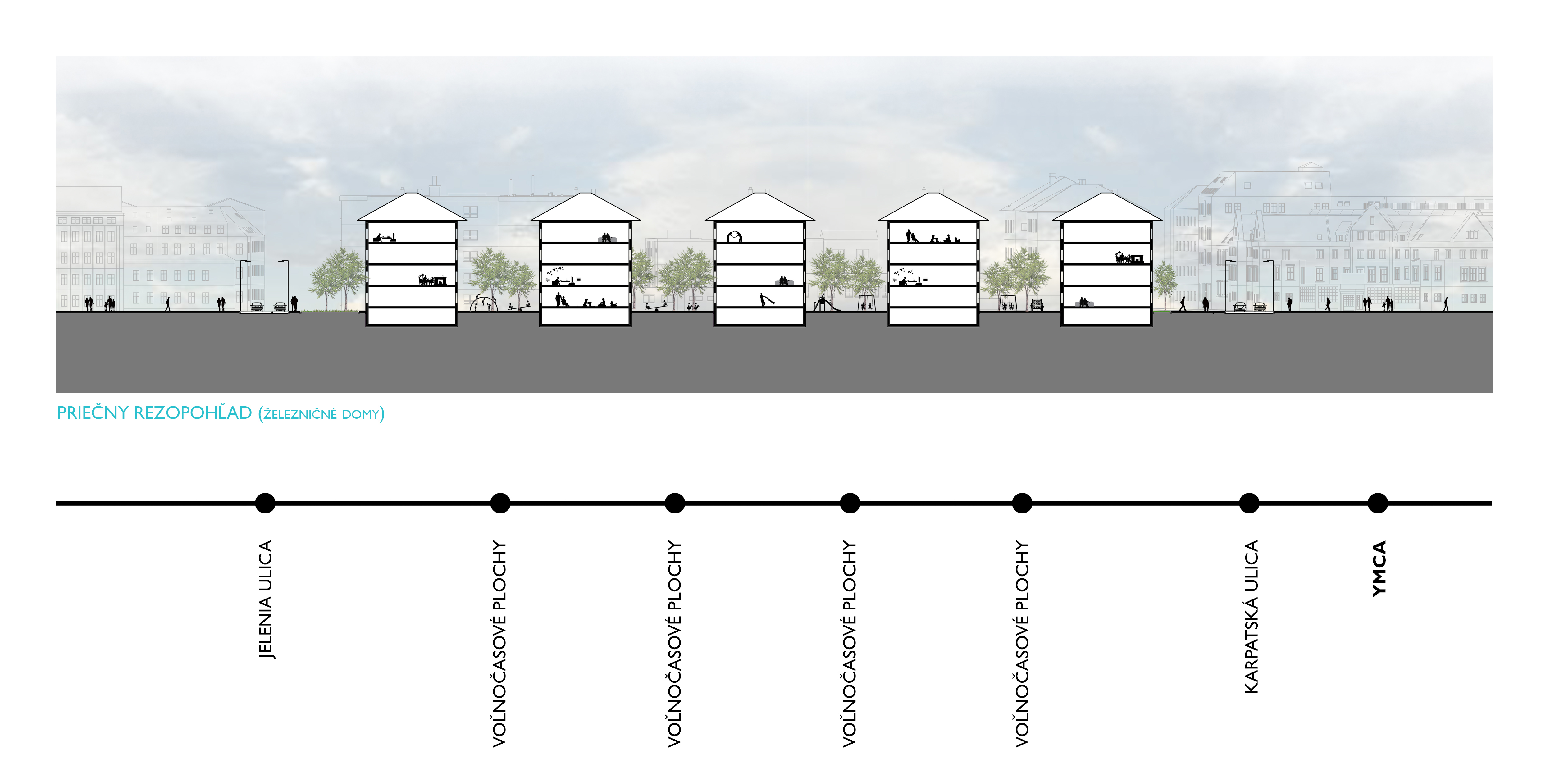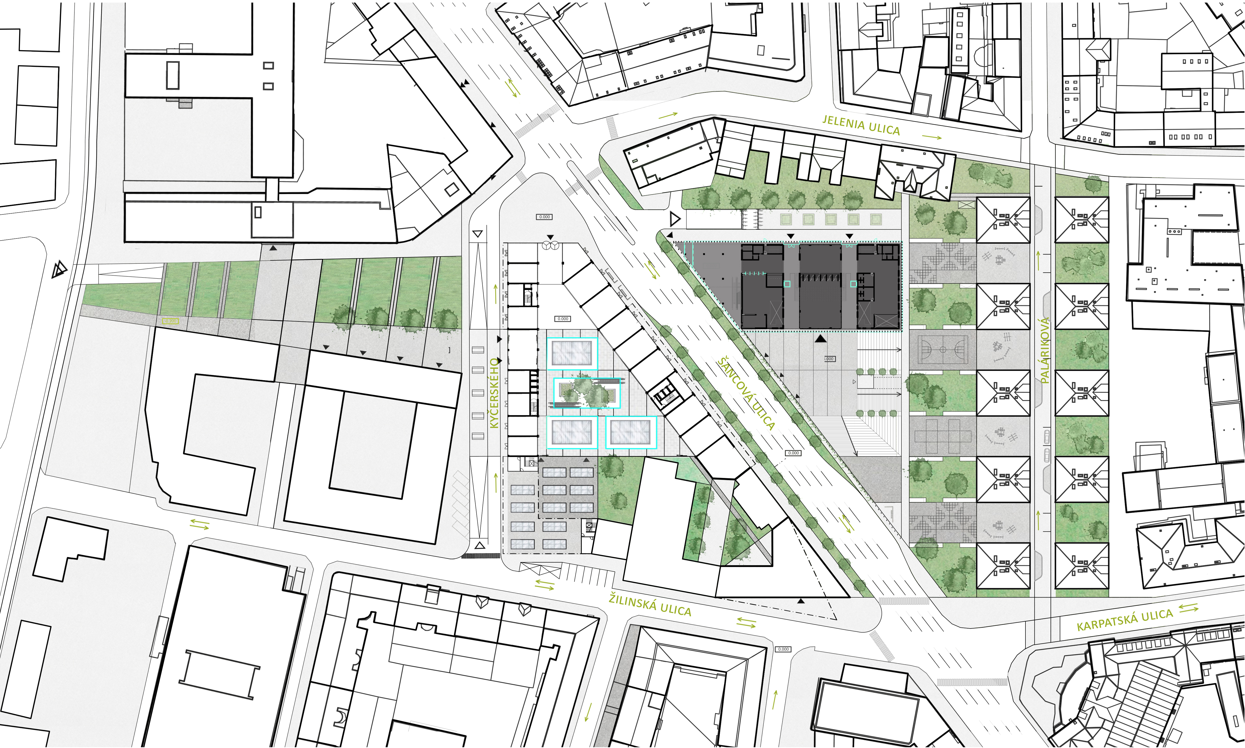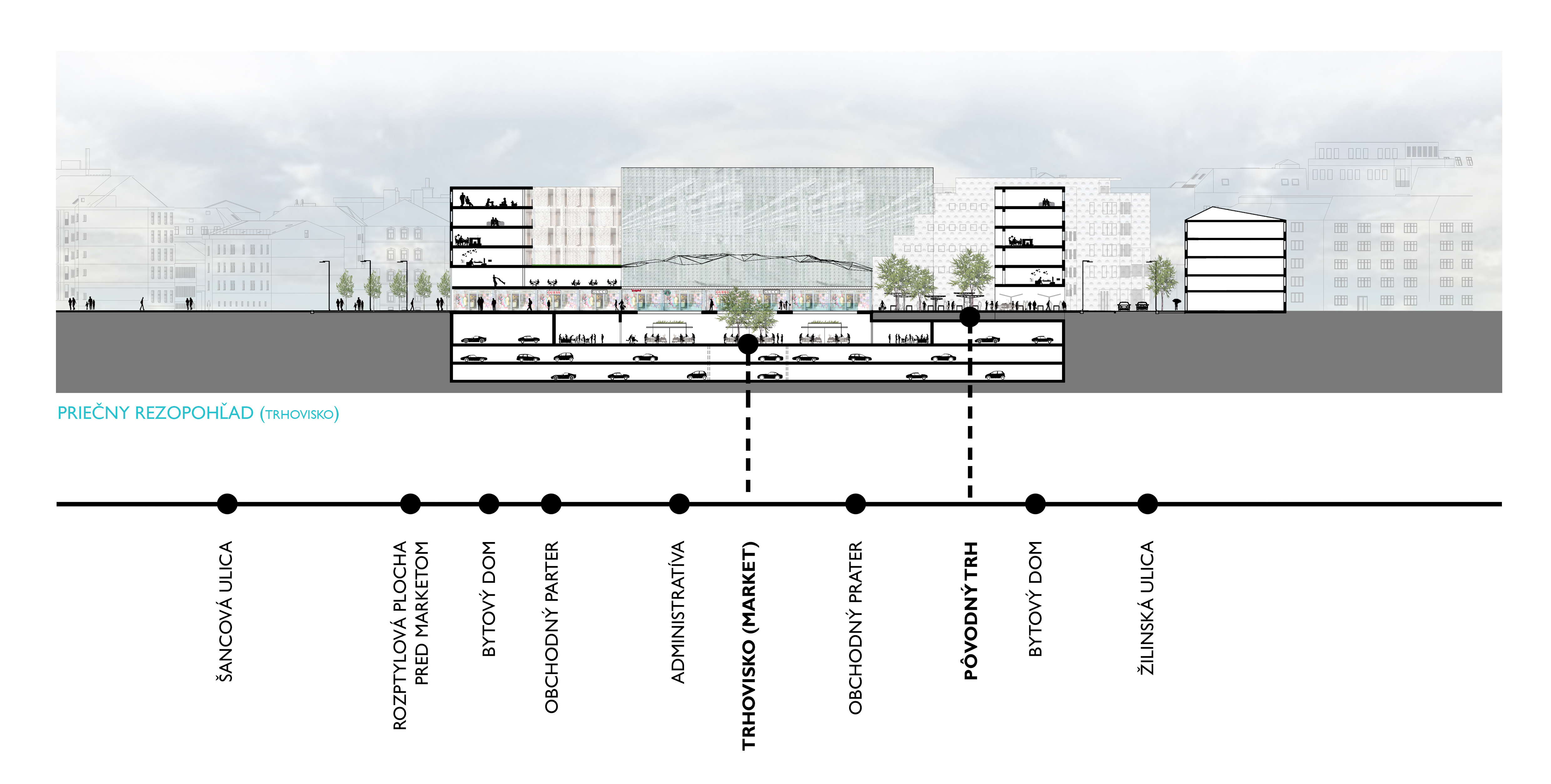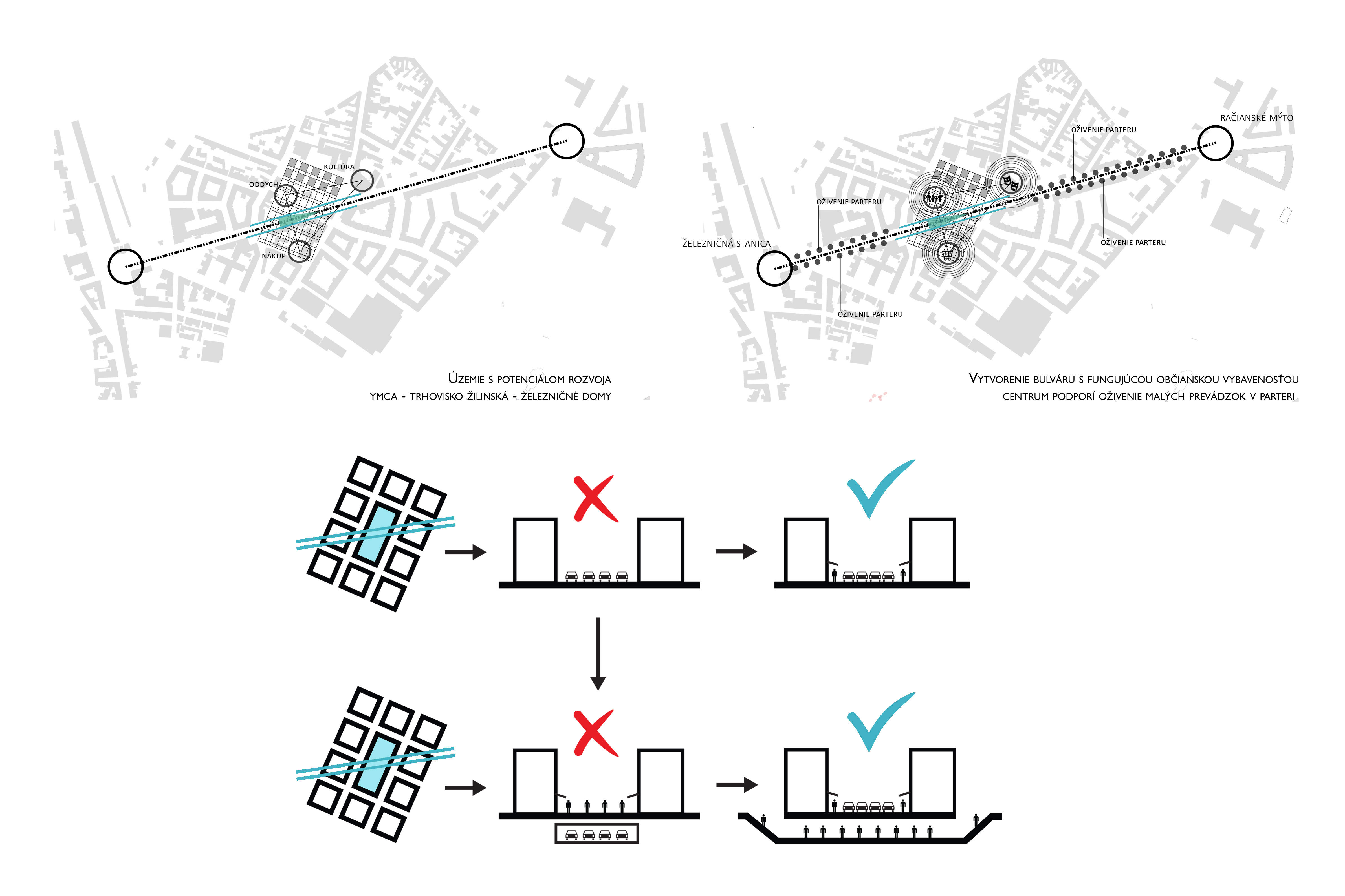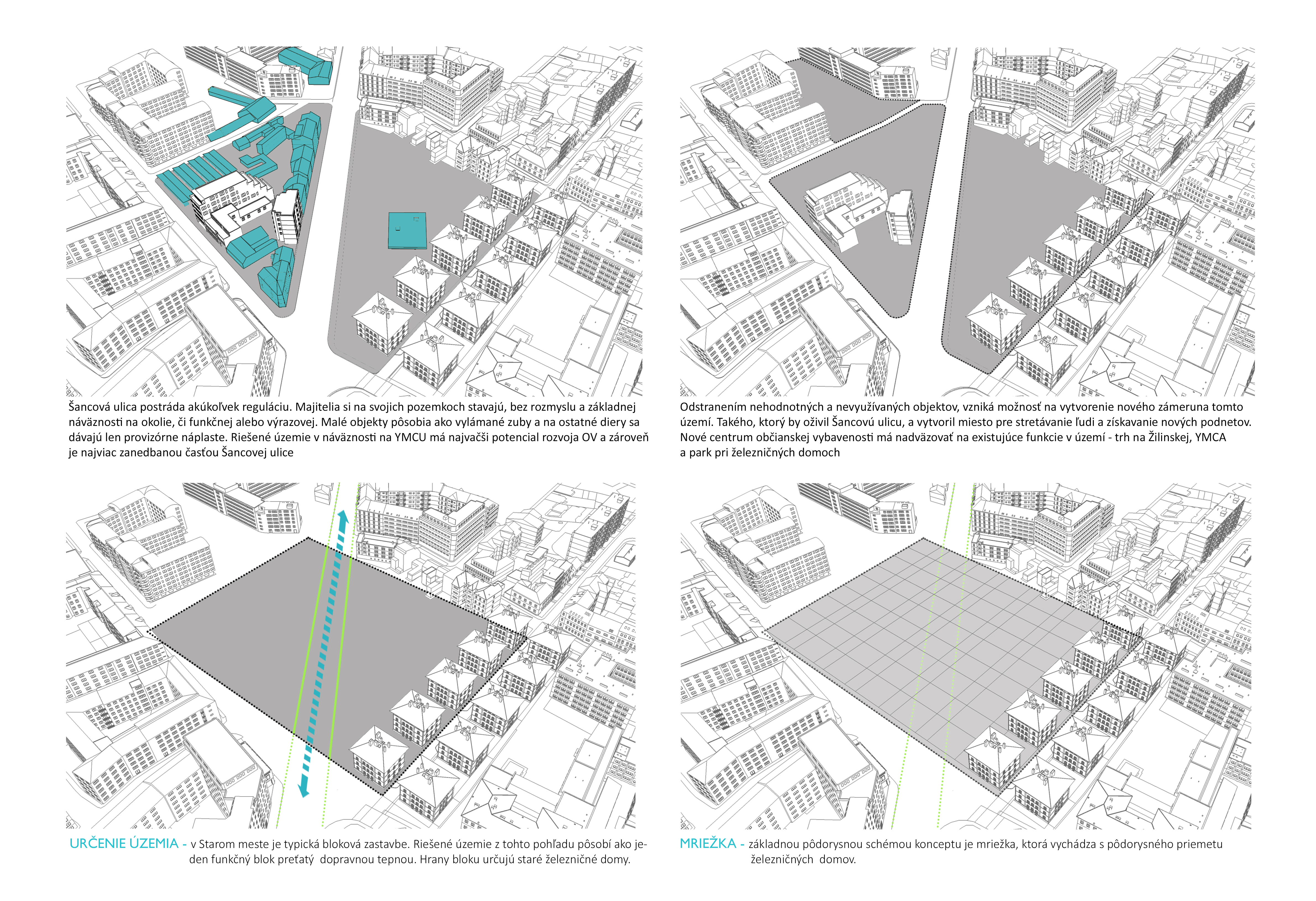Územie Starého mesta je špecifické svojou blokovou zástavbou, ktorá je určená rastrom ulíc. Pri riešení tohto územia som protiľahlé bloky Šancovej ulice vnímala ako jeden samostatný funkčný blok preťatý cestou. Túto bariéru som eliminovala vytvorením podchodu s funkciou trhoviska, ktorý plynule ústi do námestia – multifunkčnej plochy - pri železničných domoch. Na toto námestie pod úrovňou cestnej premávky je napojené nové spoločenské a komunitné centrum, ktoré je predmetom riešenia. Okolie centra a železničných domov je podľa rastra železničných domov, doplnené o plochy zelene, oddychové a športové plochy. Na protiľahlej strane je pôvodný trh doplnený o nákupnú pasáž a podporený trhoviskom v podchode. Pôvodná aj nová občianska vybavenosť v území má za úlohu prilákať ľudí z okolia a podporiť ich plynulú cirkuláciu medzi jednotlivými zónami. Vzniká tak prepojený systém občianskej vybavenosti.