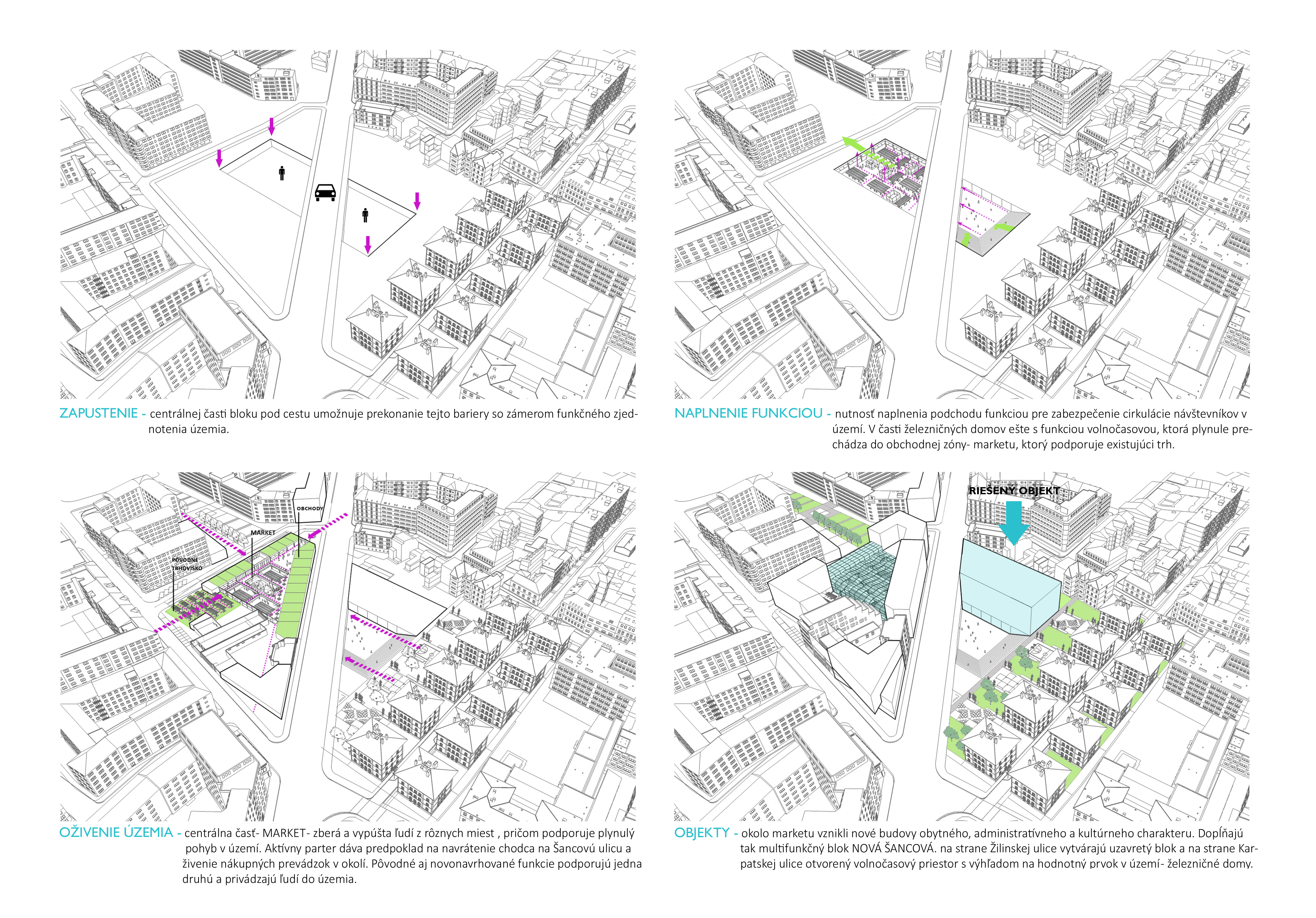Základnou myšlienkou bolo vytvoriť verejný priestor, kde by sa ľudia stretávali, trávili čas, nakupovali, spoznávali sa, spolupracovali, získavali podnety a tvorili. Nutná bola radikálna a komplexná premena územia, za účelom jeho skvalitnenie. Takéto riešenie by si vyžadovalo preriešenie majetkoprávnych vzťahov v území, ale v konečnom dôsledku by prispelo k skvalitneniu života ľudí. V okolí Šancovej ulice prevažuje funkcia bývania, ktorá má slabé občianske zázemie. Základom návrhu bolo podporiť a posilniť existujúcu občiansku vybavenosť a vytvoriť tak centrum kultúry, nákupu a oddychu. Trhovisko v podchode dopĺňa obľúbený trh na Žilinskej, ktorý ostáva v pôvodnej polohe. Nákupná pasáž má podporiť prúdenie ľudí po Šancovej ulici a oživiť parter. Spoločenské a komunitné centrum na protiľahlej strane, spolu s budovou YMCY, dotvára kultúrny a oddychový charakter územia.