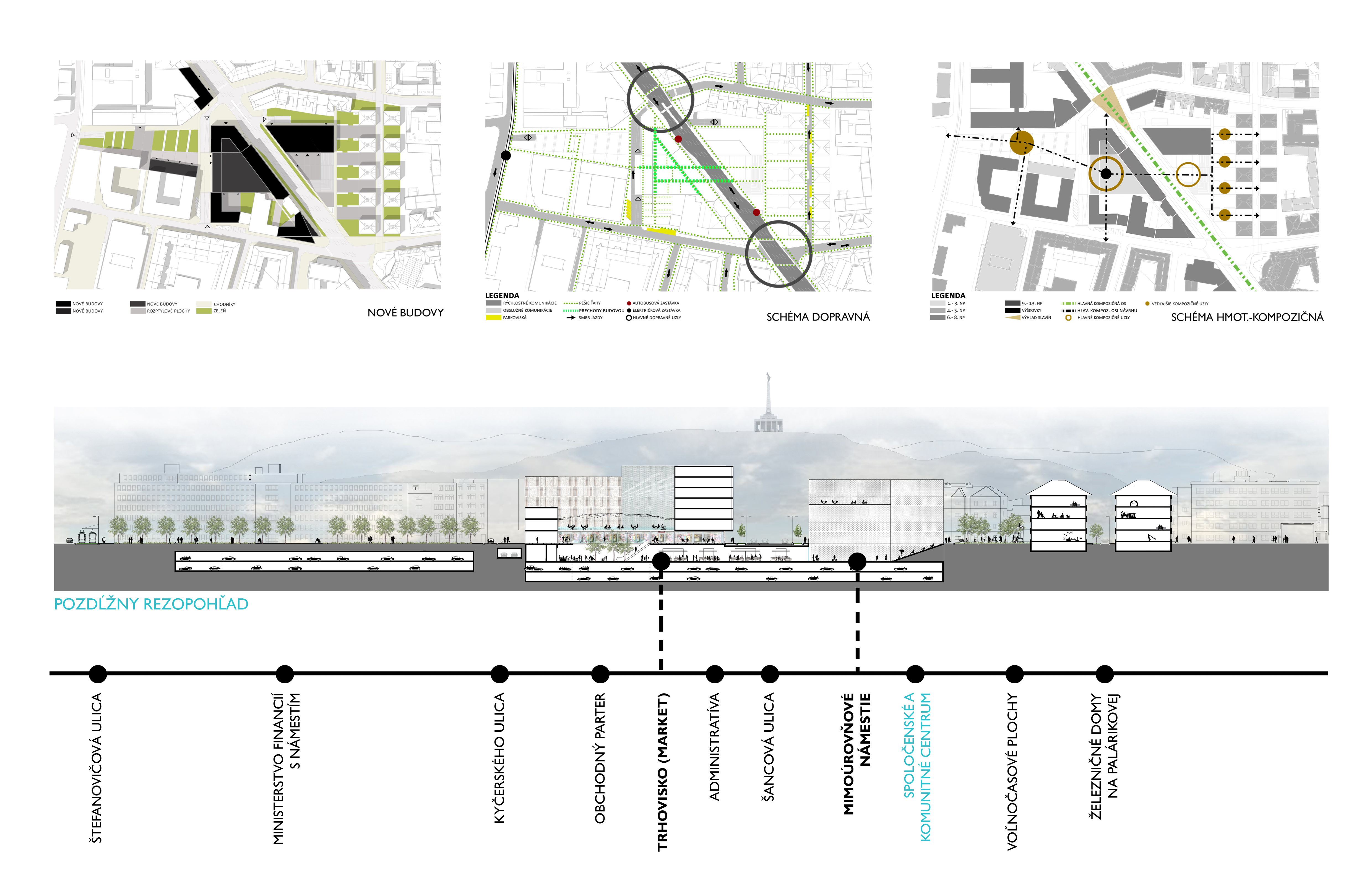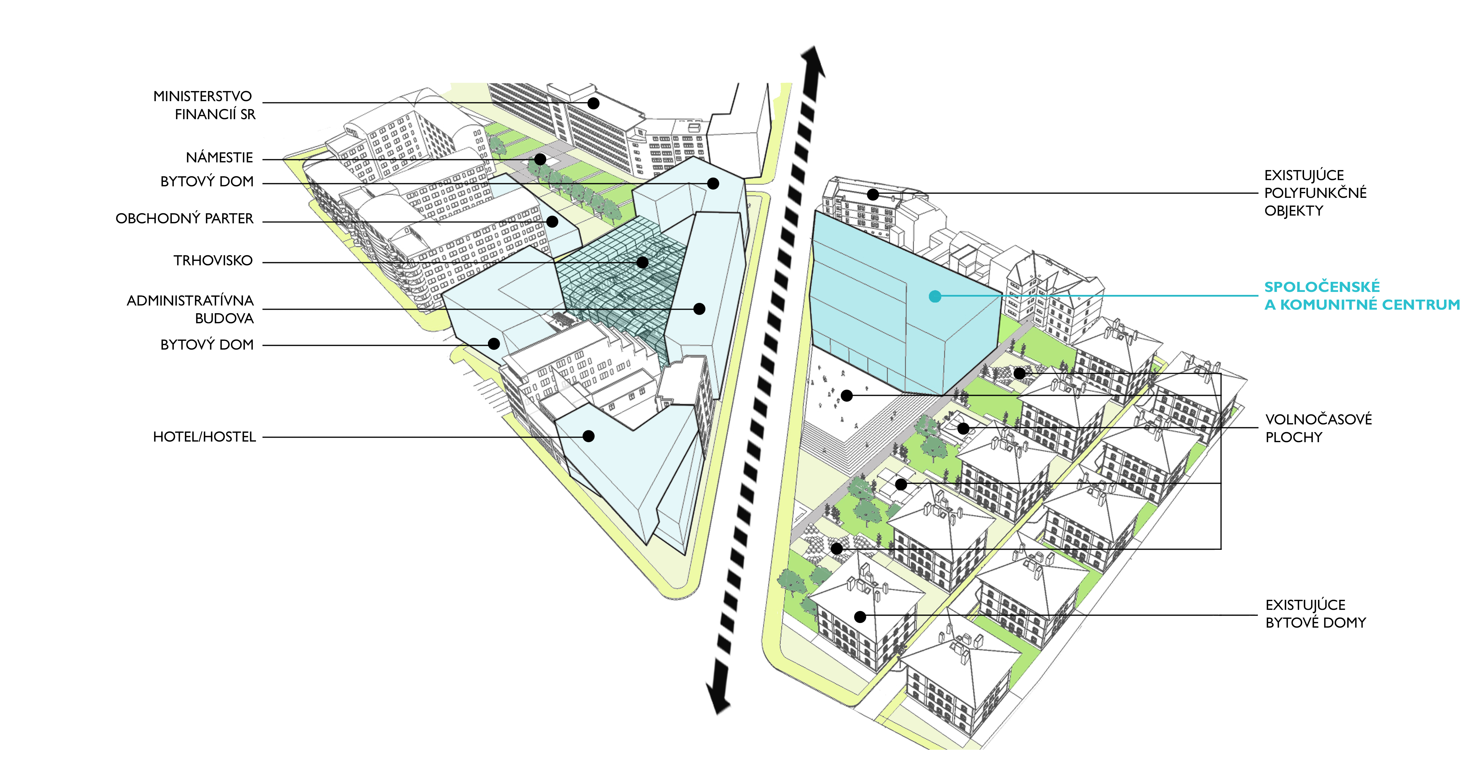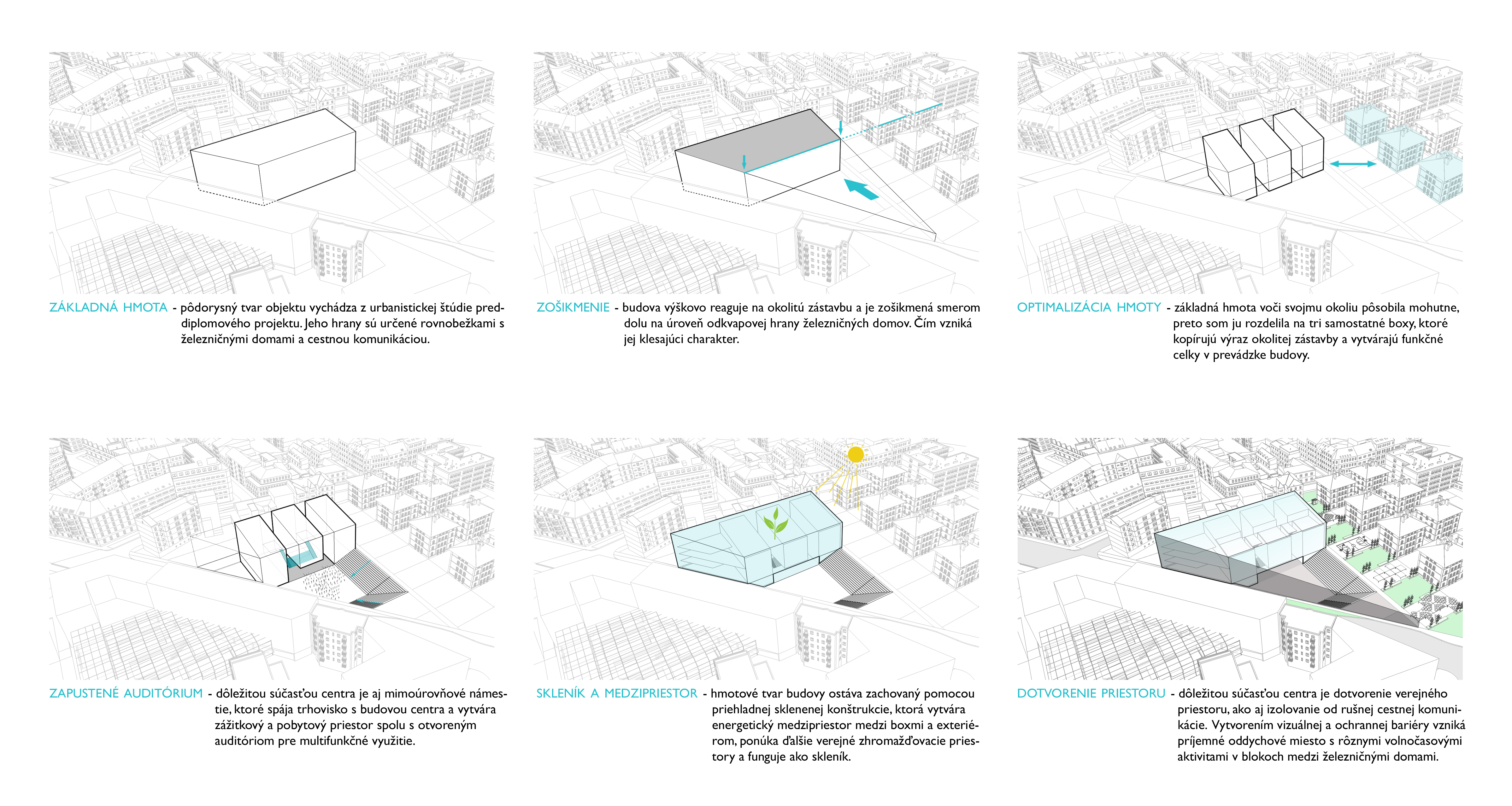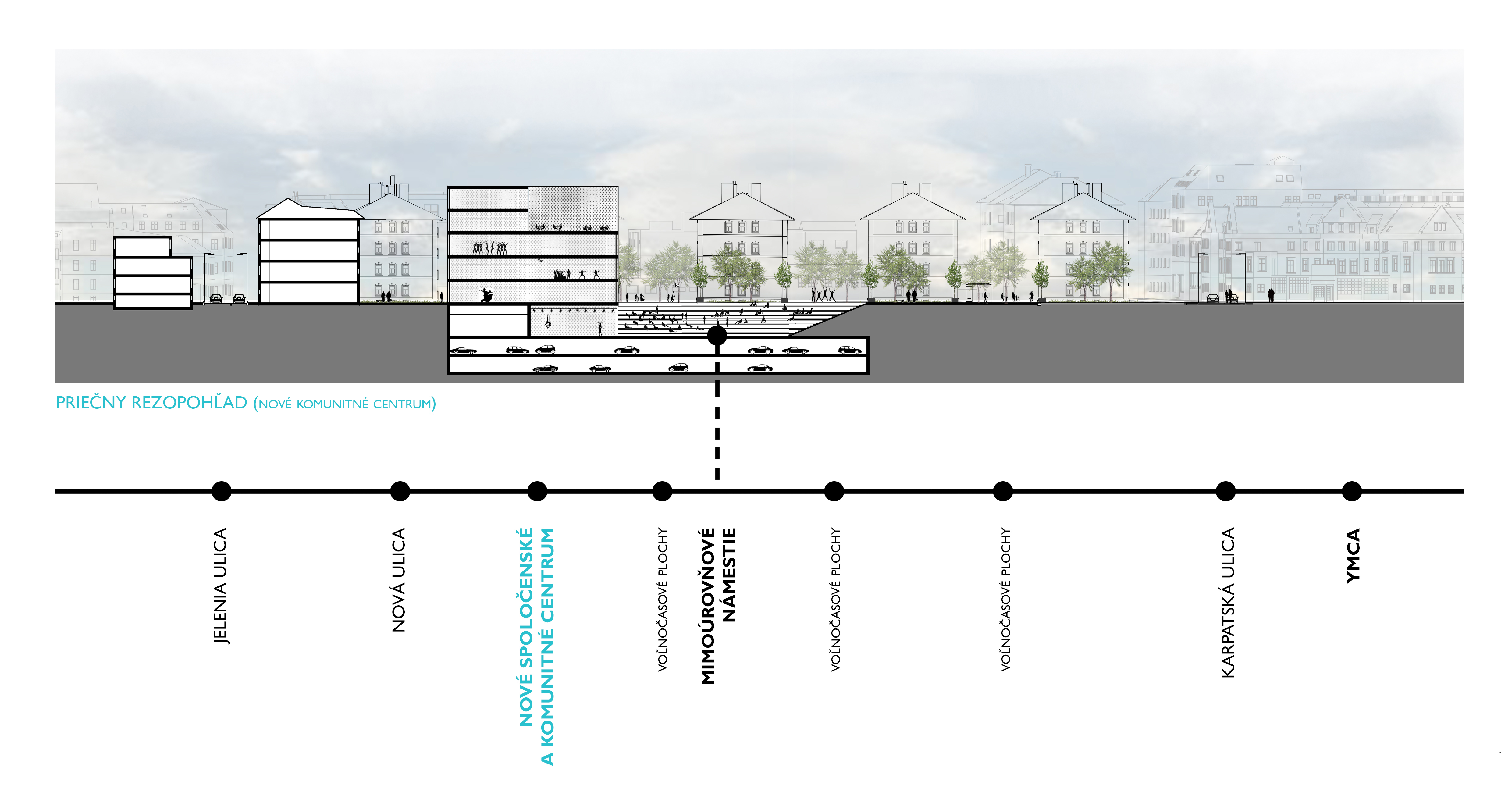 Zadaním diplomovej práce bolo práve preriešenie spoločenského a komunitného centra s jeho okolím a v nadväznosti na trhovisko v podchode. Základnou myšlienkou bolo vytvorenie takého miesta, ktoré by zaujalo ľudí svojou otvorenosťou. Pozývalo dovnútra, zároveň komunikovalo s exteriérom, a dokopy vytváralo akúsi veľkú pobytovú záhradu - park. Vznikla tak odľahčená skleníková budova v ktorej sa nachádzajú tri menšie objekty. Budova pôsobí vzdušne, a napriek svojmu veľkému objemu, nepôsobí ako bariéra v území. Tri menšie boxy vnútri skleníka proporciami reagujú na okolitú zástavbu a v budove vytvárajú isté funkčné členenie priestorov. Samotný skleník ma viac pozitívnych využití. Ako ďalší pobytový priestor, ako energetický medzipriestor, ale aj ako skleník, ktorý umožňuje vytvorenie komunitných záhrad po jej obvode a na terasách.