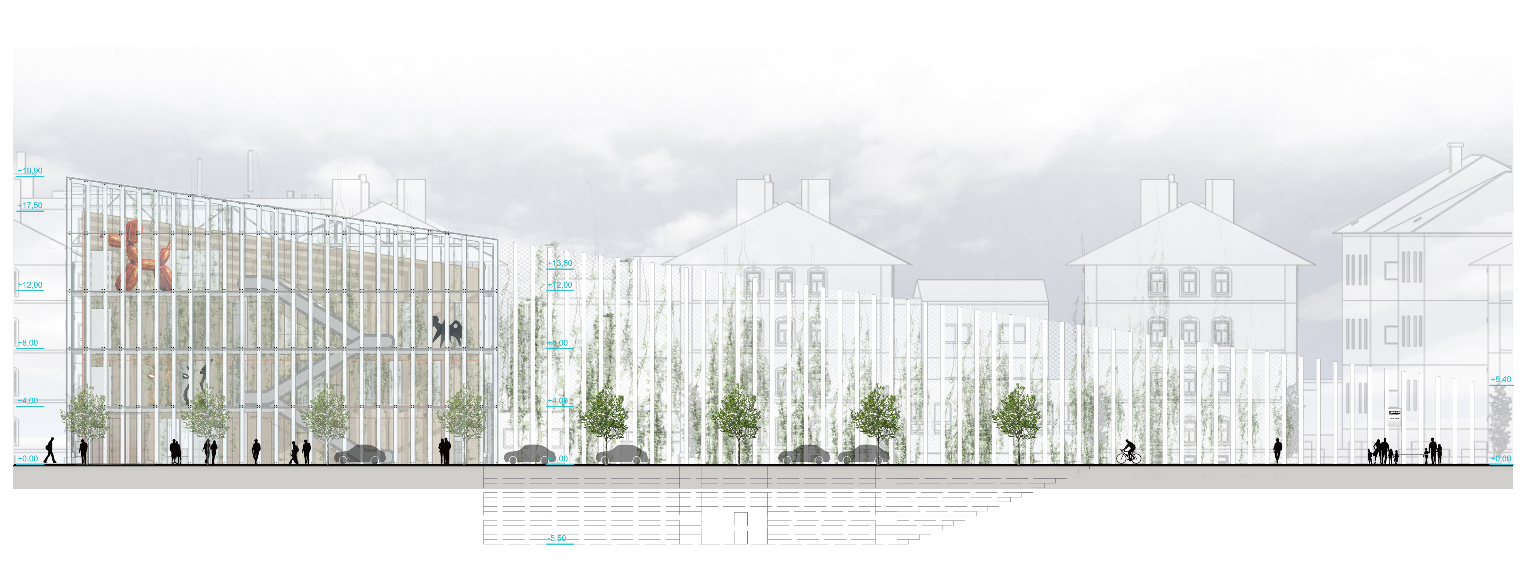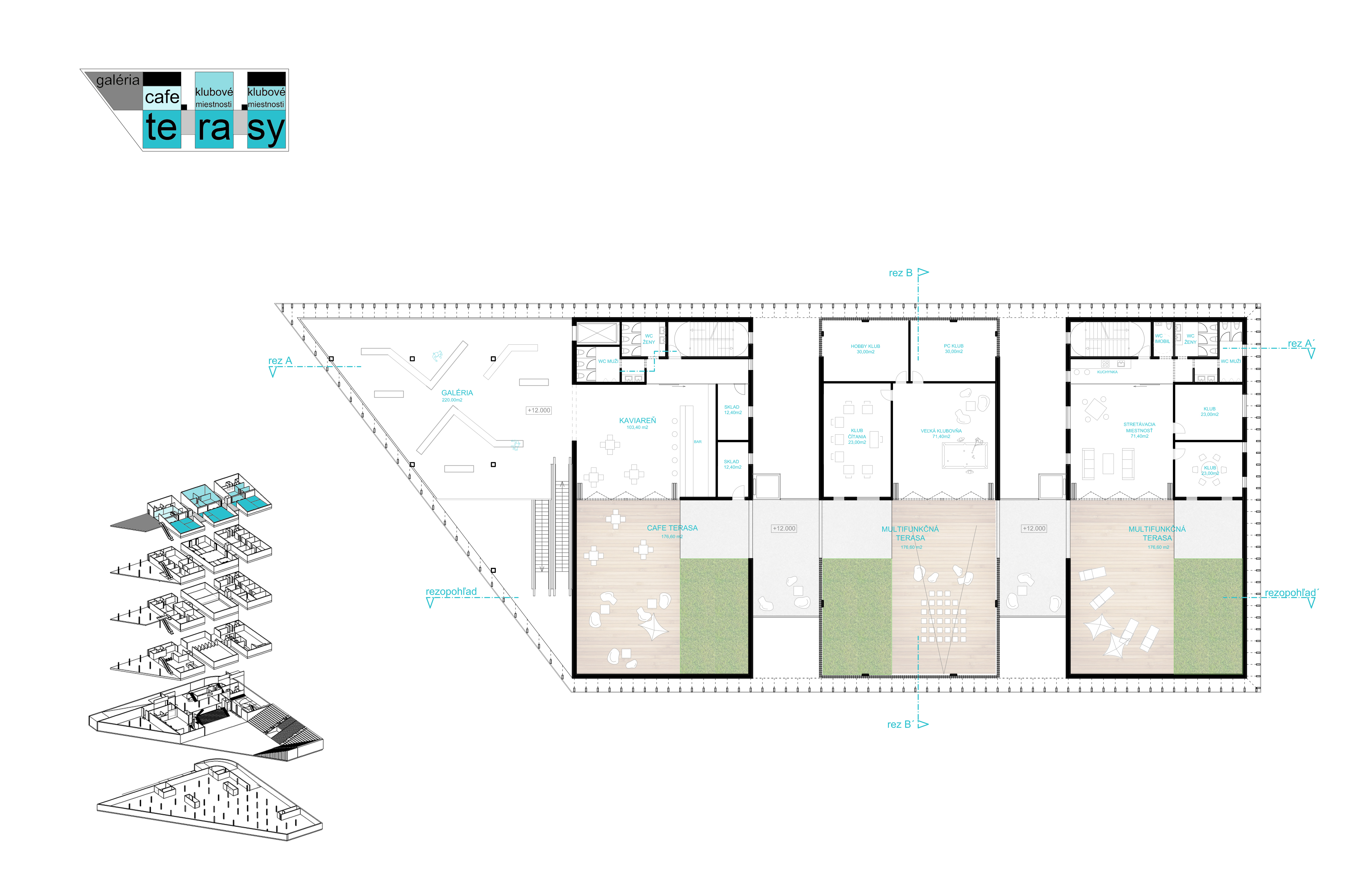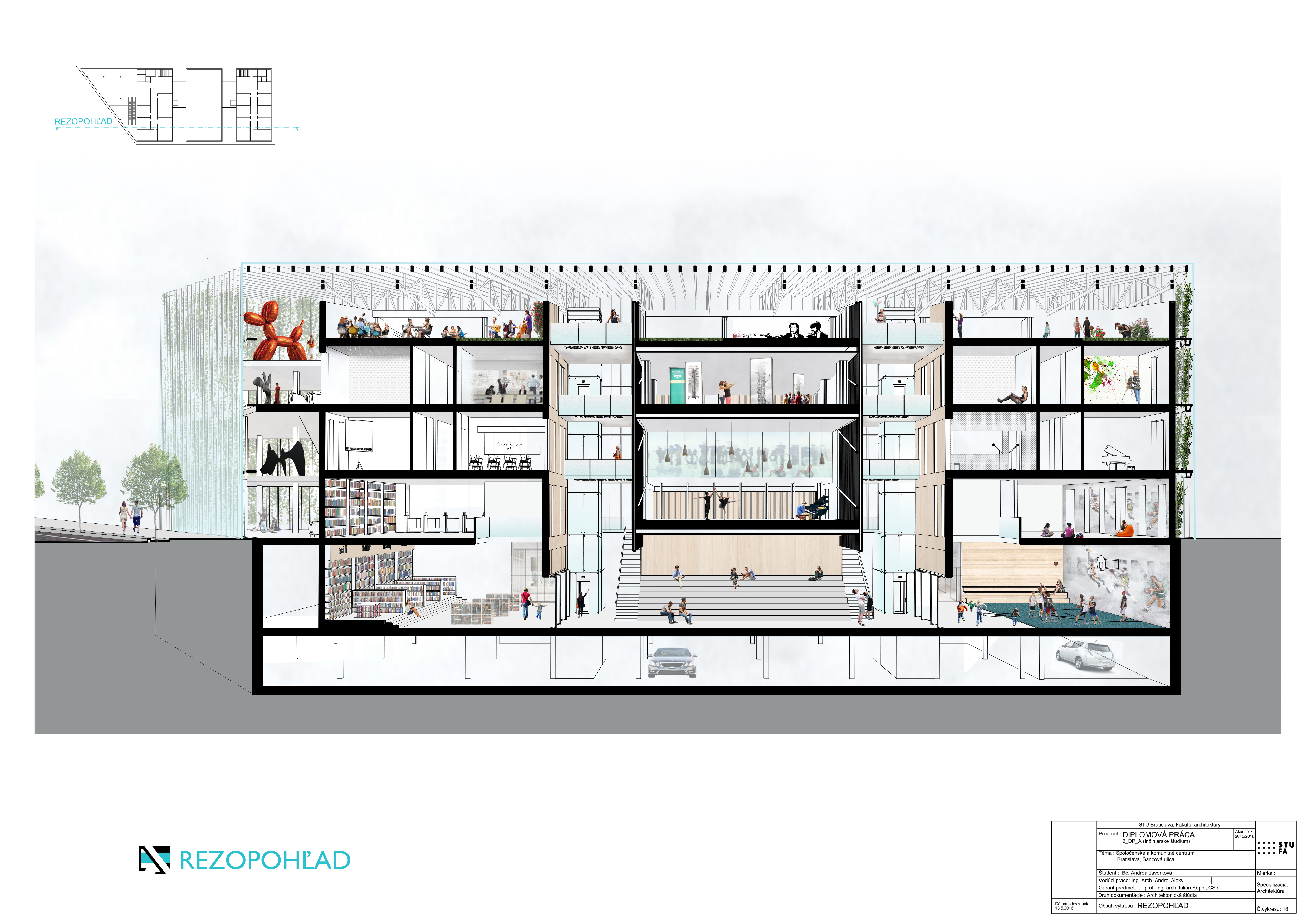 Zadaním diplomovej práce bolo práve preriešenie spoločenského a komunitného centra s jeho okolím a v nadväznosti na trhovisko v podchode. Základnou myšlienkou bolo vytvorenie takého miesta, ktoré by zaujalo ľudí svojou otvorenosťou. Pozývalo dovnútra, zároveň komunikovalo s exteriérom, a dokopy vytváralo akúsi veľkú pobytovú záhradu - park. Vznikla tak odľahčená skleníková budova v ktorej sa nachádzajú tri menšie objekty. Budova pôsobí vzdušne, a napriek svojmu veľkému objemu, nepôsobí ako bariéra v území. Tri menšie boxy vnútri skleníka proporciami reagujú na okolitú zástavbu a v budove vytvárajú isté funkčné členenie priestorov. Samotný skleník ma viac pozitívnych využití. Ako ďalší pobytový priestor, ako energetický medzipriestor, ale aj ako skleník, ktorý umožňuje vytvorenie komunitných záhrad po jej obvode a na terasách.