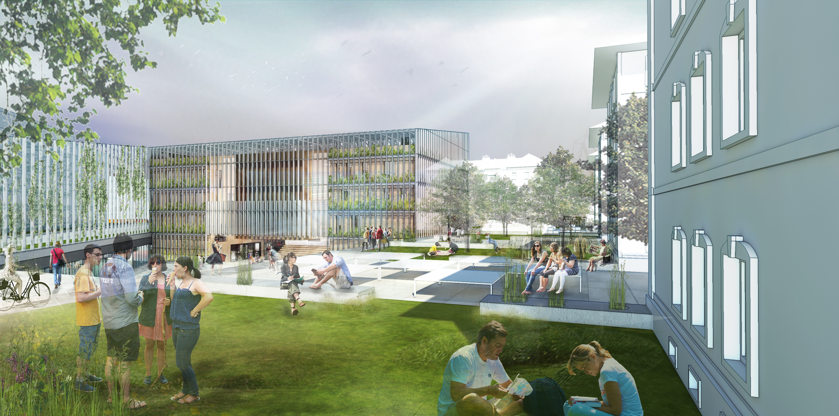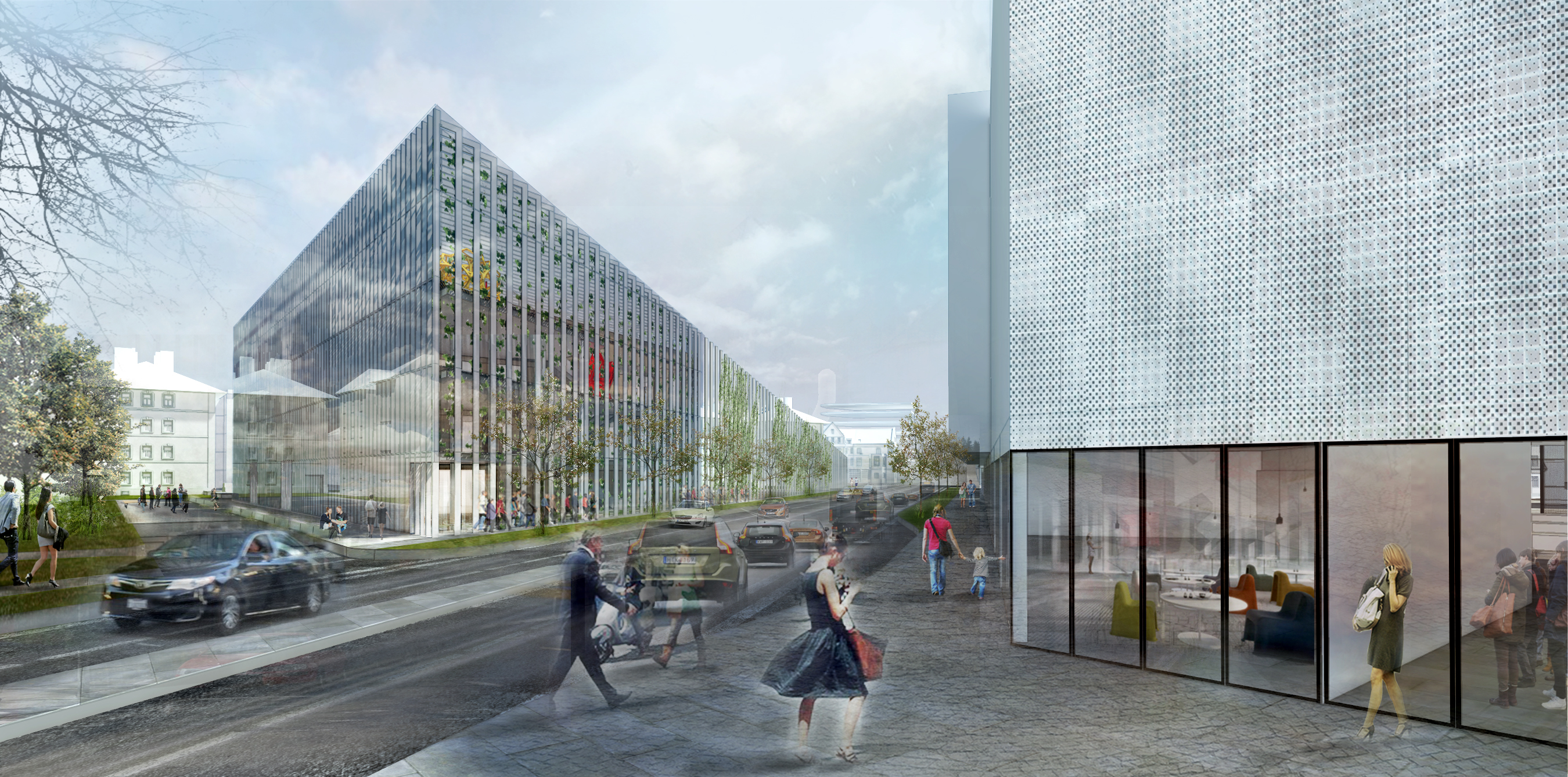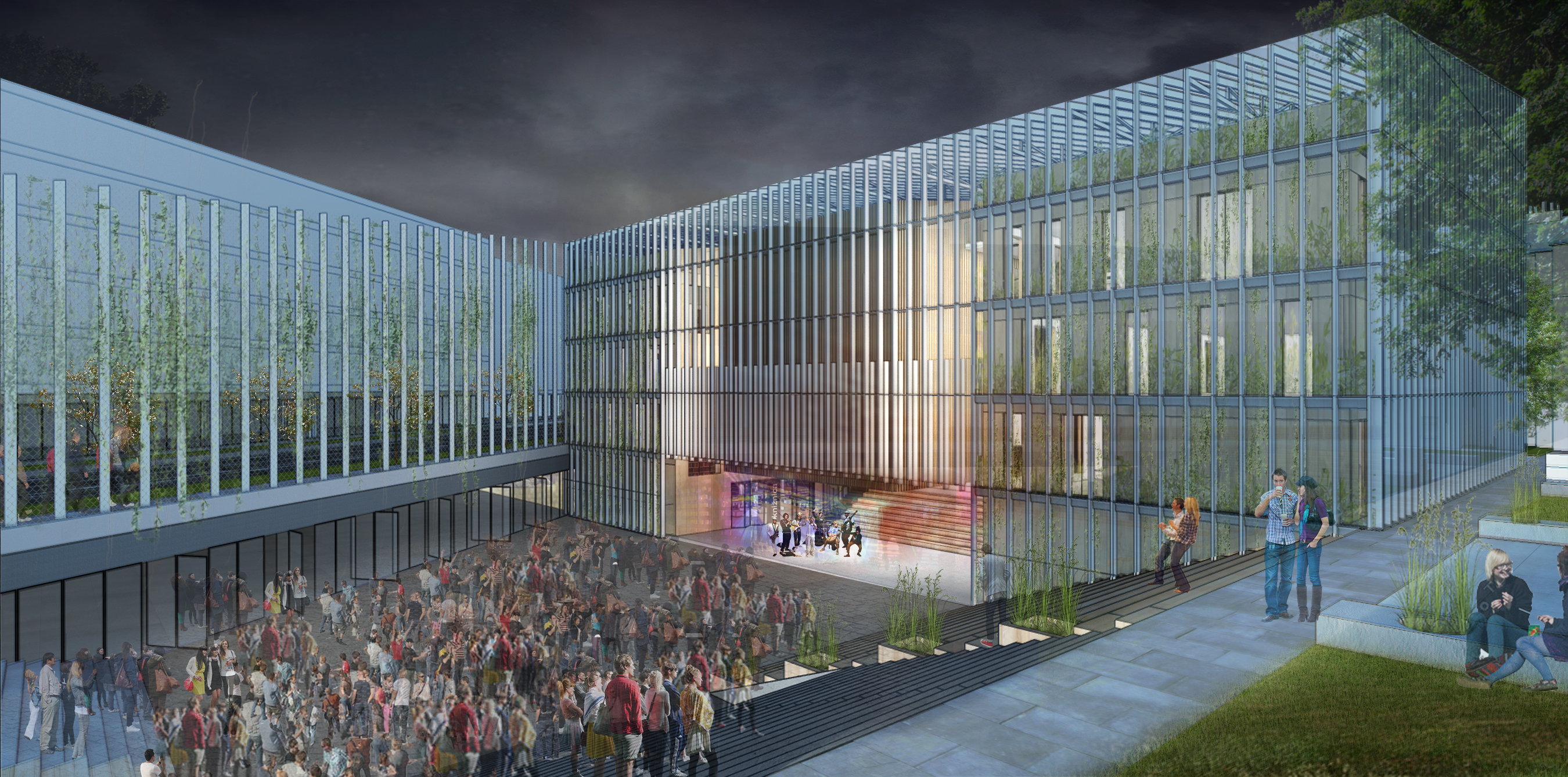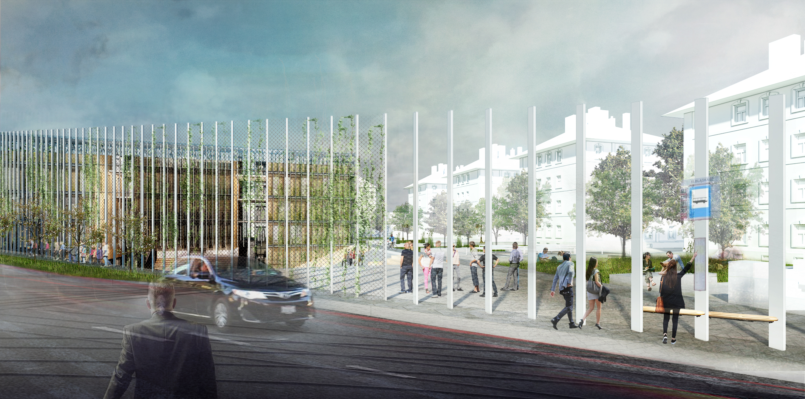 Zadaním diplomovej práce bolo práve preriešenie spoločenského a komunitného centra s jeho okolím a v nadväznosti na trhovisko v podchode. Základnou myšlienkou bolo vytvorenie takého miesta, ktoré by zaujalo ľudí svojou otvorenosťou. Pozývalo dovnútra, zároveň komunikovalo s exteriérom, a dokopy vytváralo akúsi veľkú pobytovú záhradu - park. Vznikla tak odľahčená skleníková budova v ktorej sa nachádzajú tri menšie objekty. Budova pôsobí vzdušne, a napriek svojmu veľkému objemu, nepôsobí ako bariéra v území. Tri menšie boxy vnútri skleníka proporciami reagujú na okolitú zástavbu a v budove vytvárajú isté funkčné členenie priestorov. Samotný skleník ma viac pozitívnych využití. Ako ďalší pobytový priestor, ako energetický medzipriestor, ale aj ako skleník, ktorý umožňuje vytvorenie komunitných záhrad po jej obvode a na terasách.