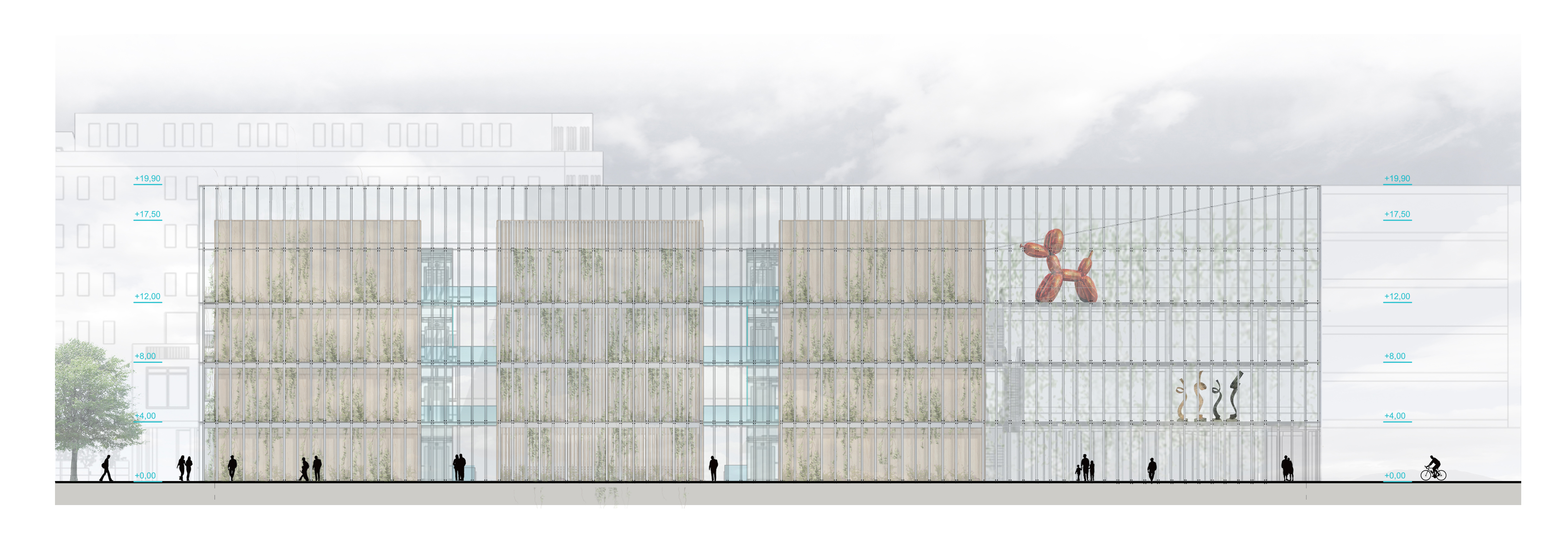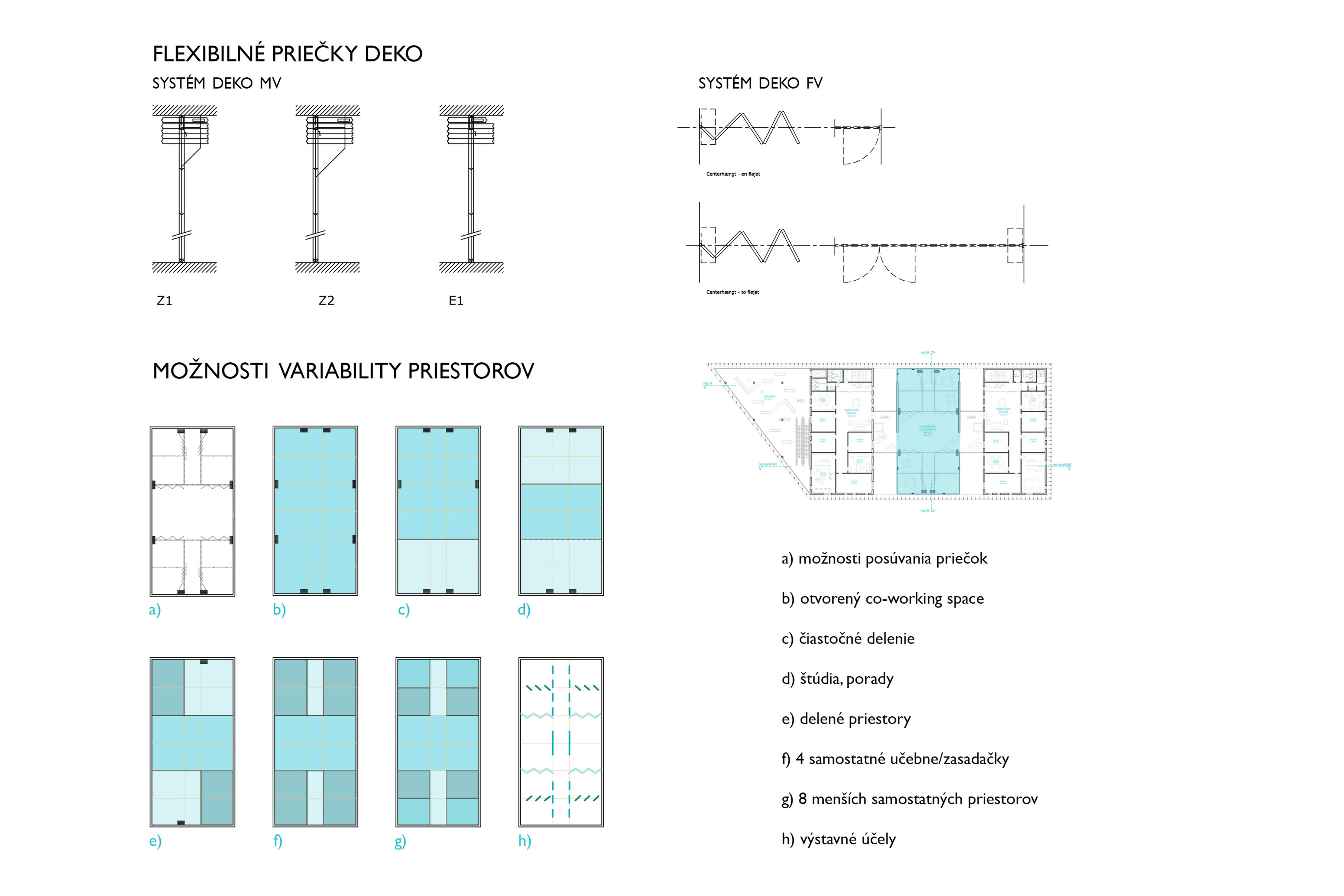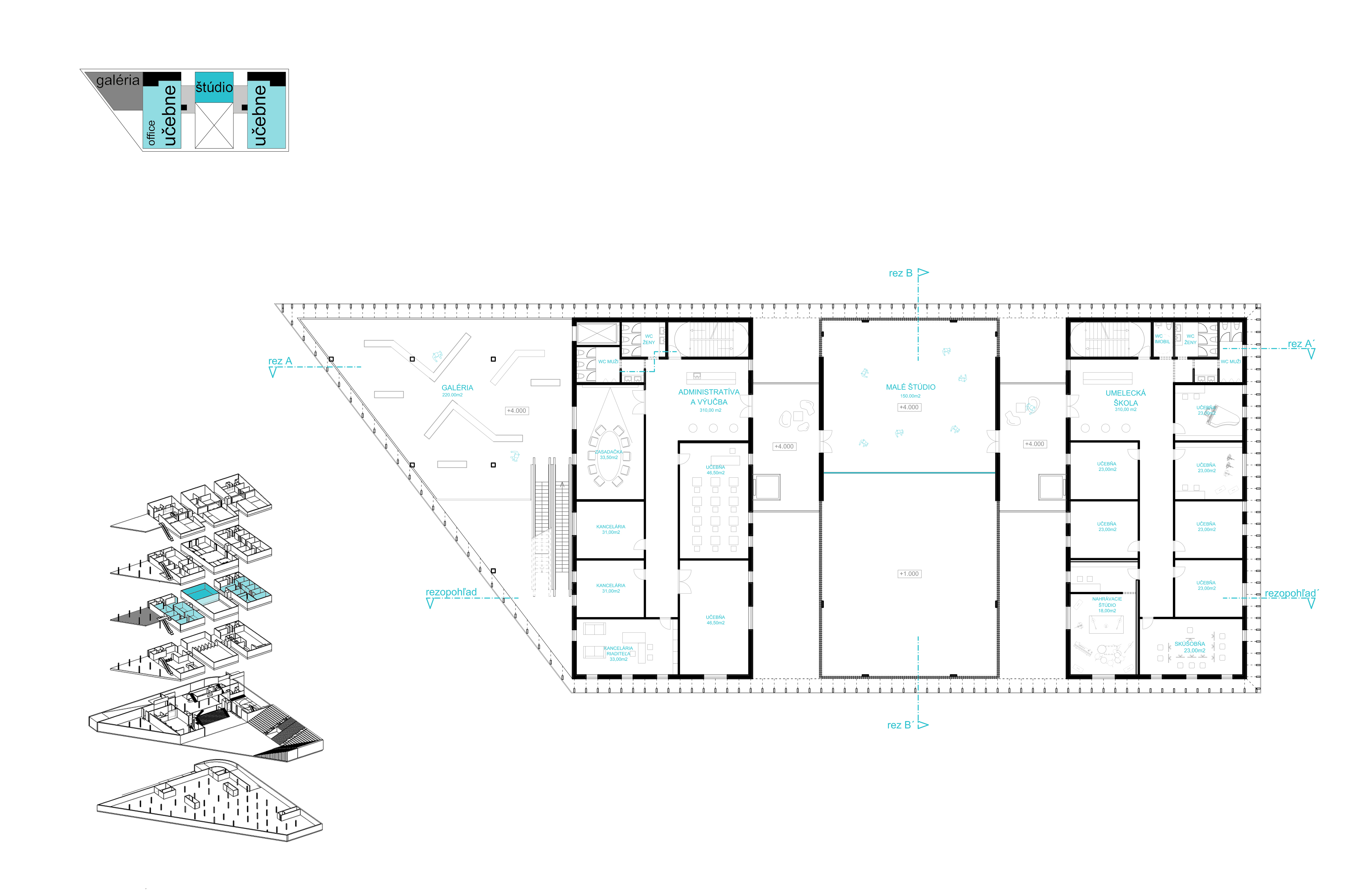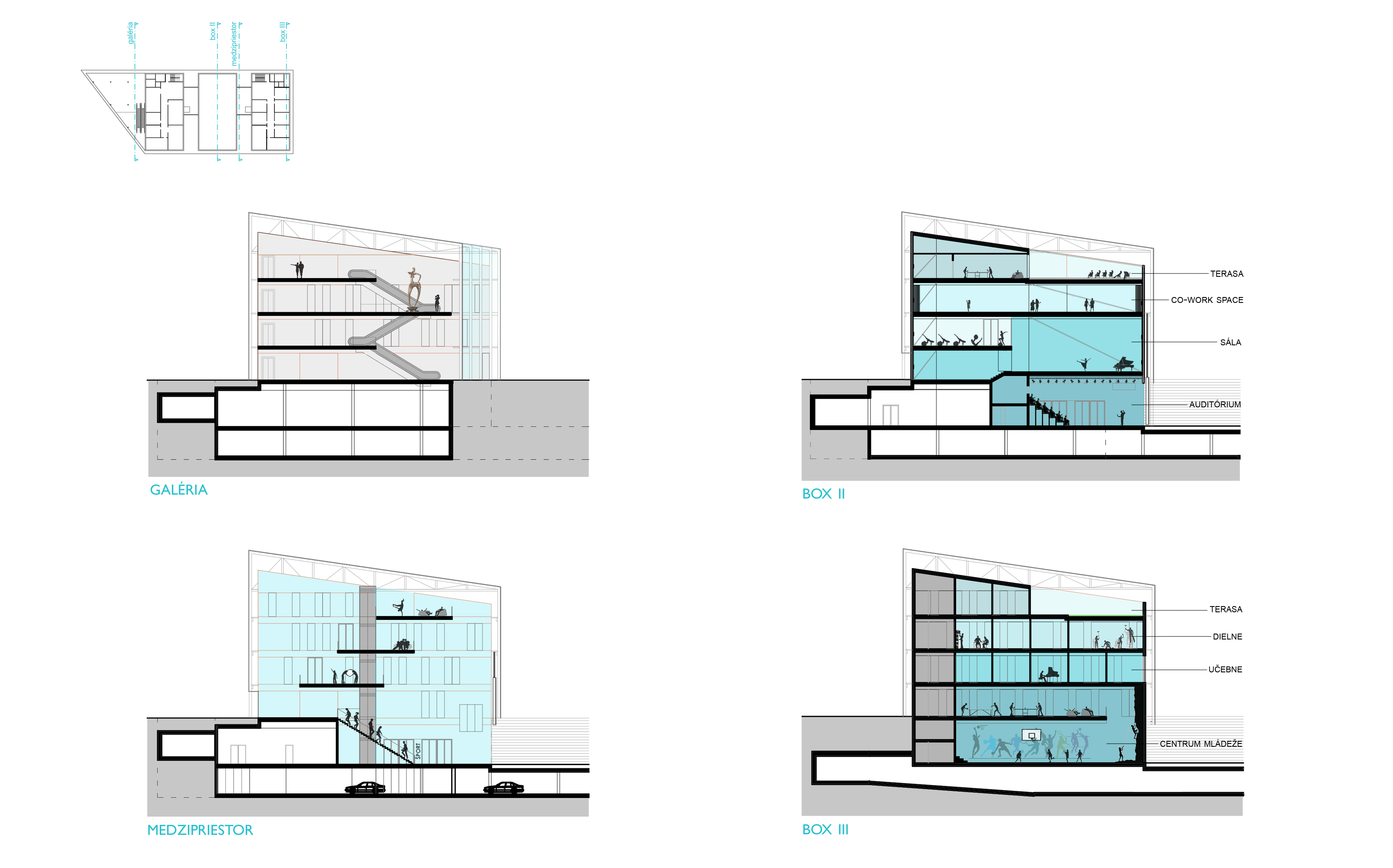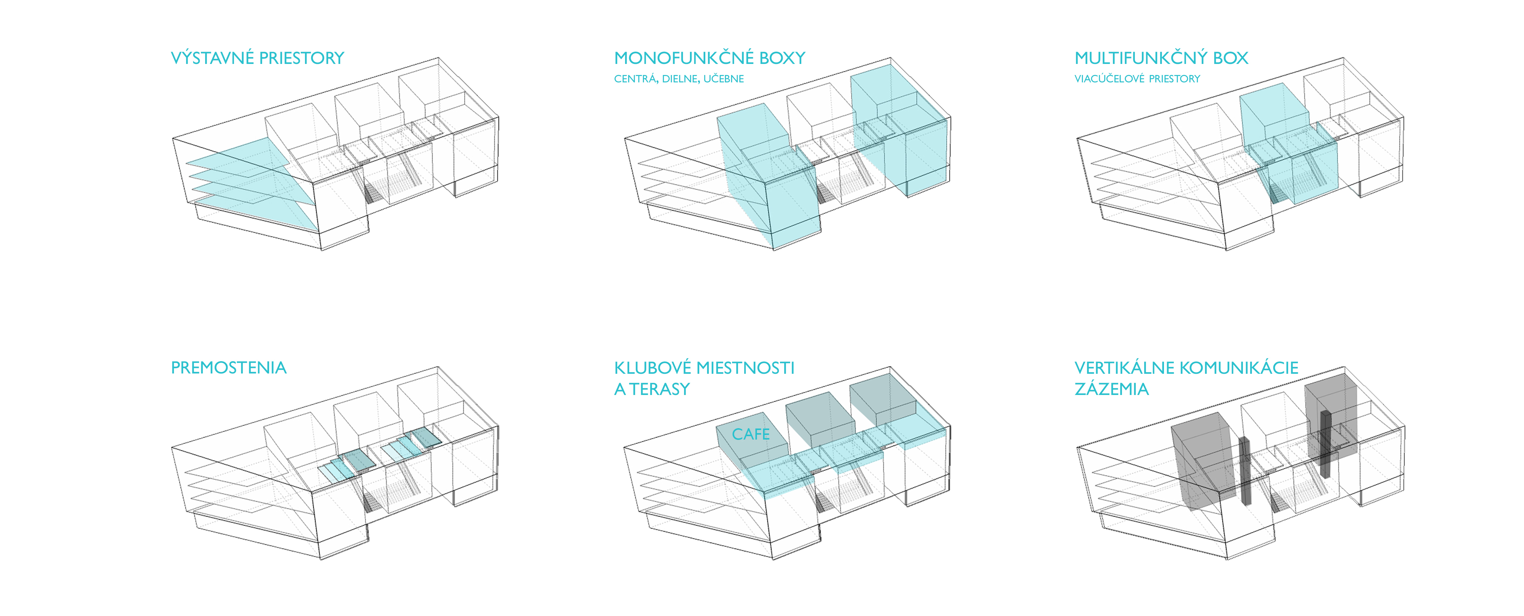 Môžeme povedať, že samotné dianie v budove sa člení na 4 zóny. Smerom od cesty sú to galerijne priestory a ďalšie funkcie sa odohrávajú v troch uzavretých boxoch. Krajné boxy majú na jednotlivých podlažiach monofunkčný charakter, a pobytovými mostíkmi sú prepojené s viacúčelovými a variabilnými priestormi stredového boxu.