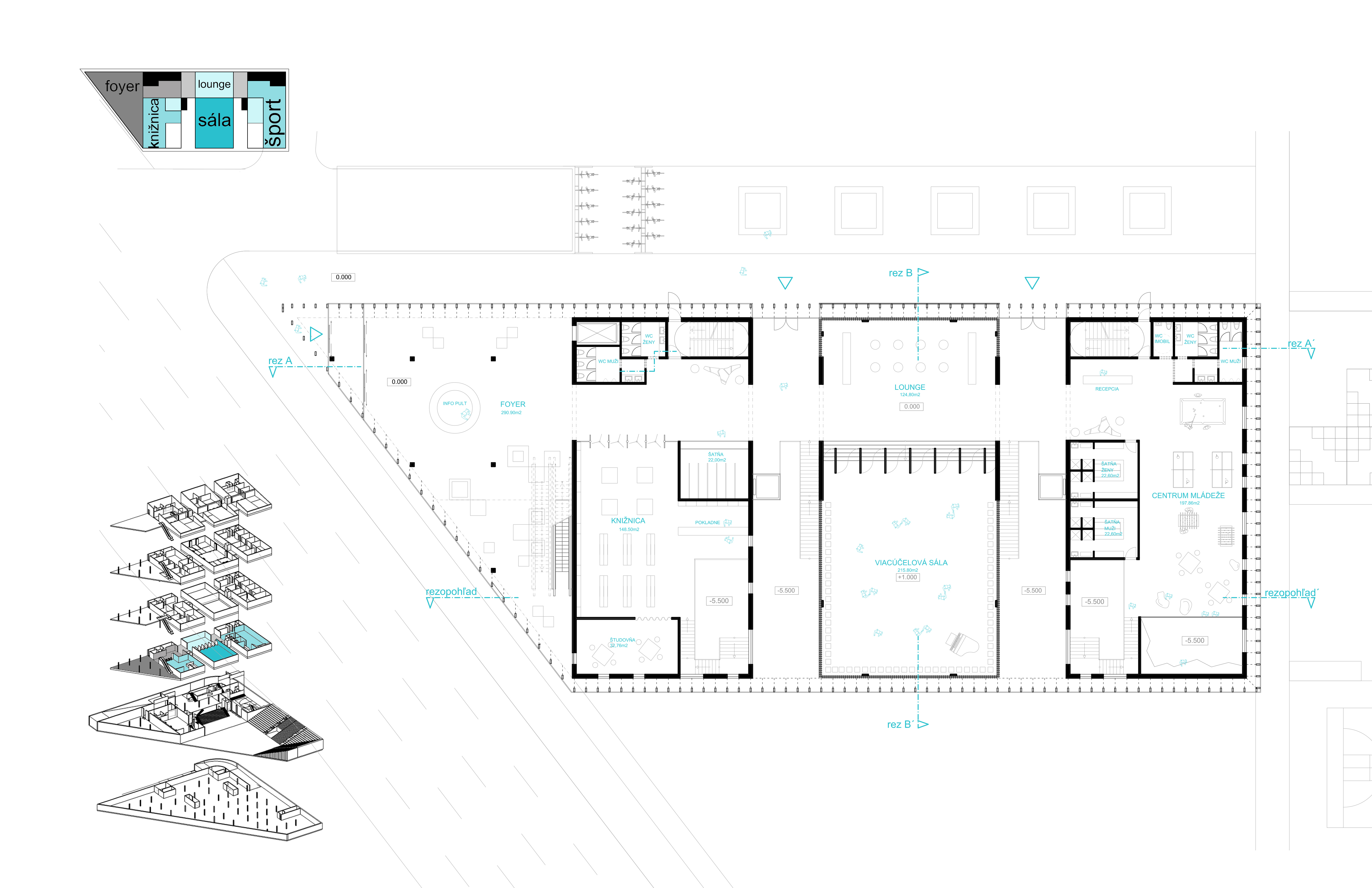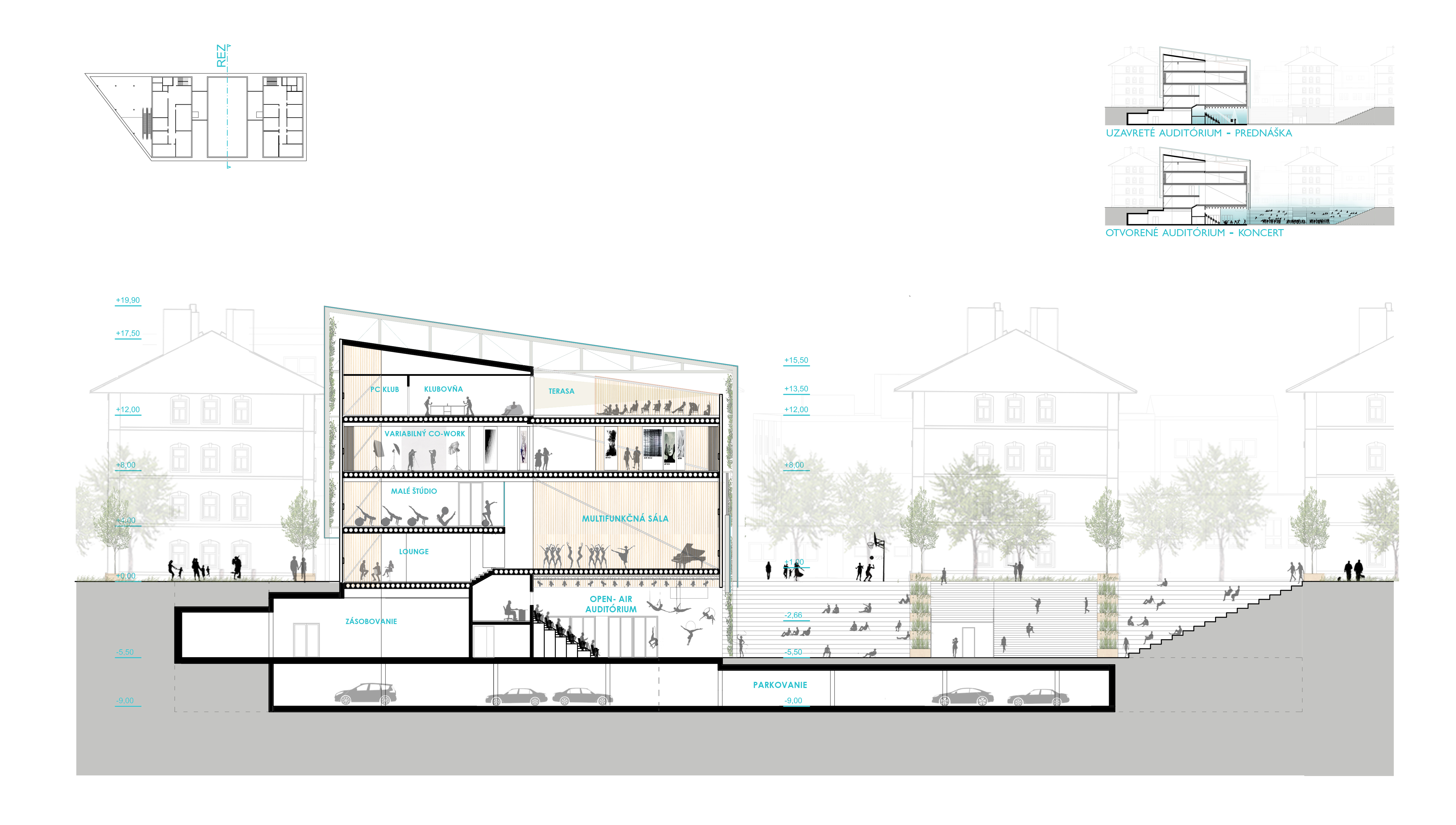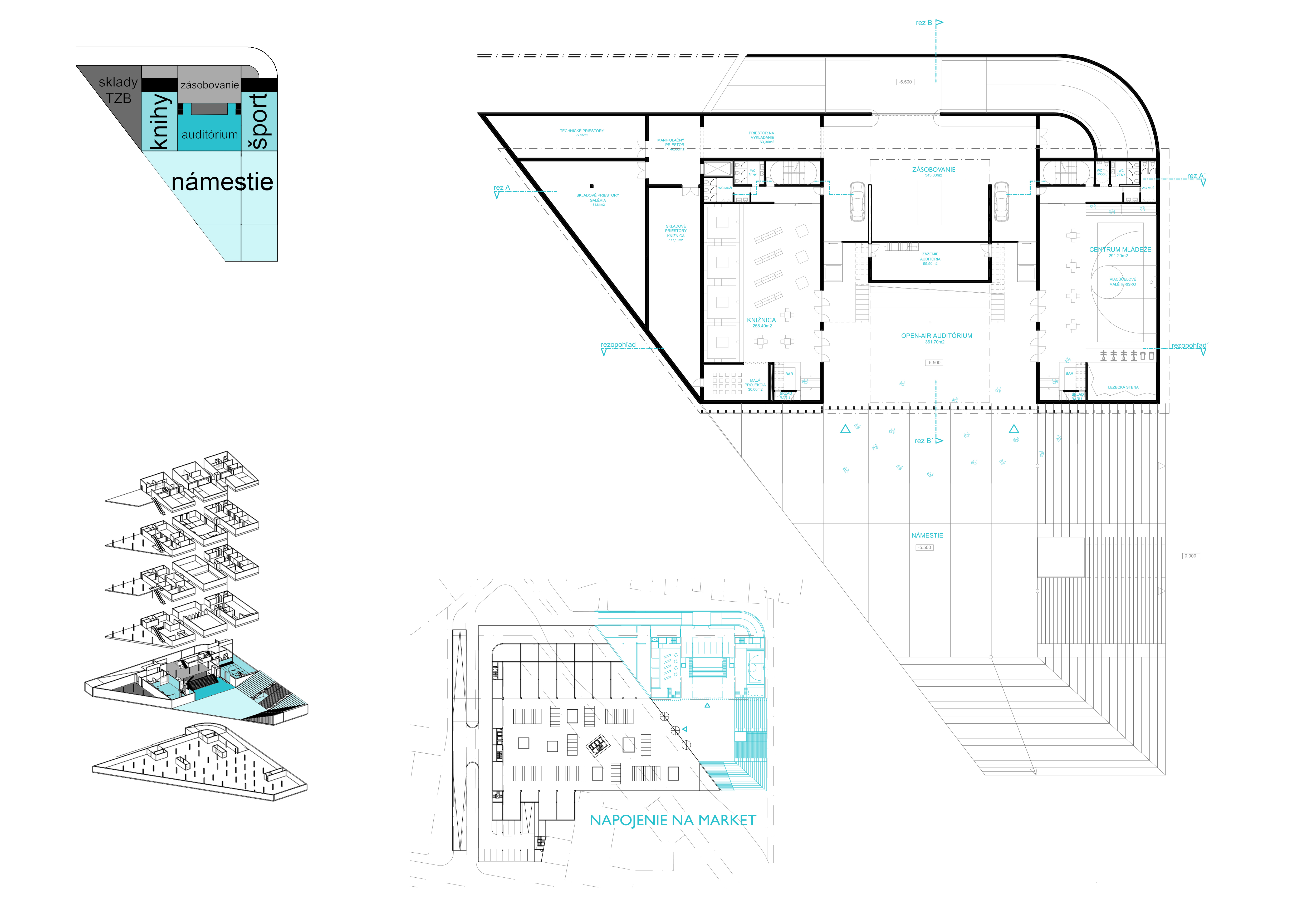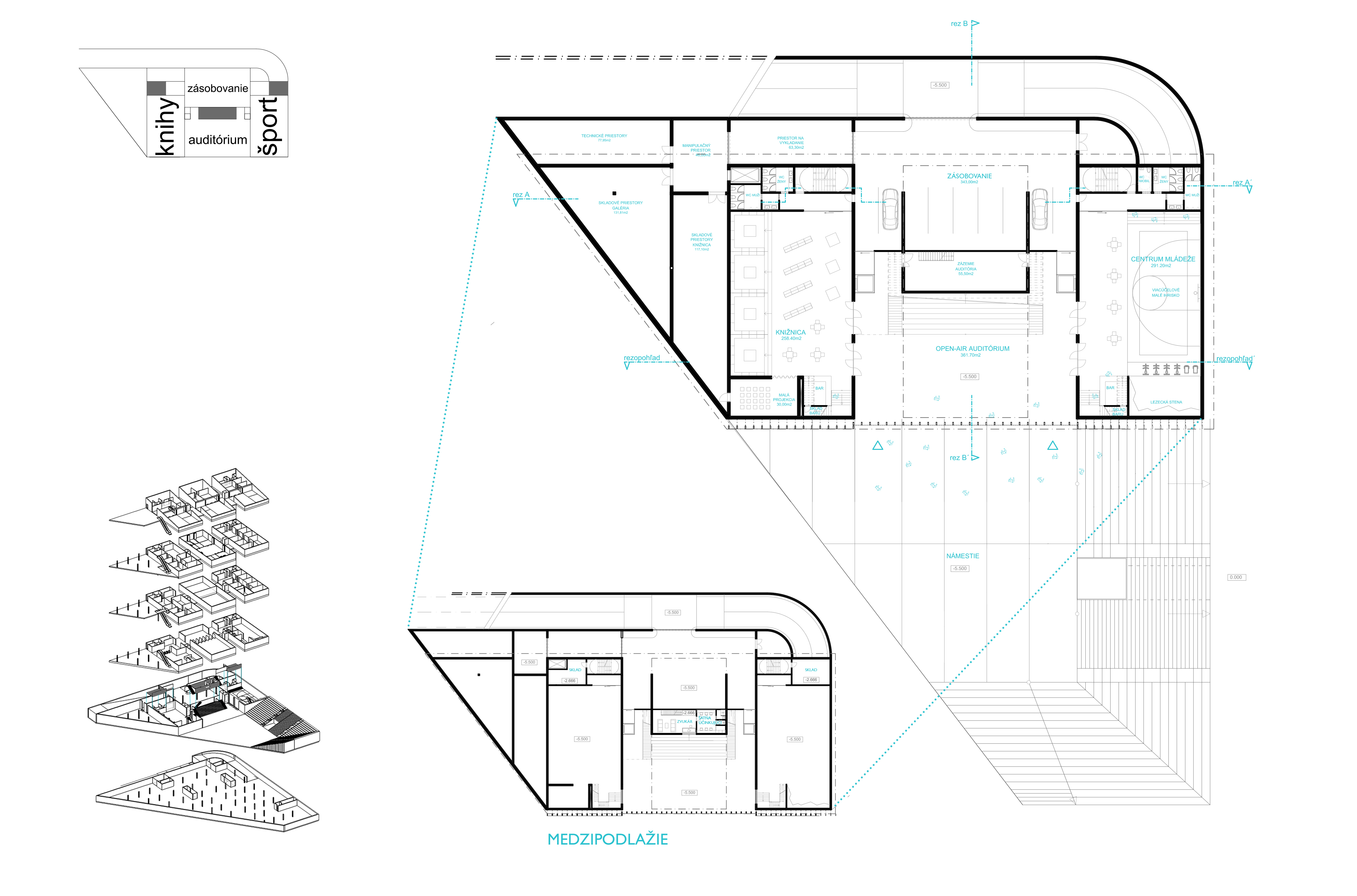 V úrovni 1.PP komunitné centrum komunikuje s námestim pomocou auditória, ktoré sa dá otvárať do exteriéru a je súčasťou stredového boxu. V krajných boxoch sa na jednej strane nachádza knižnica a na strane druhej centrum mládeže.