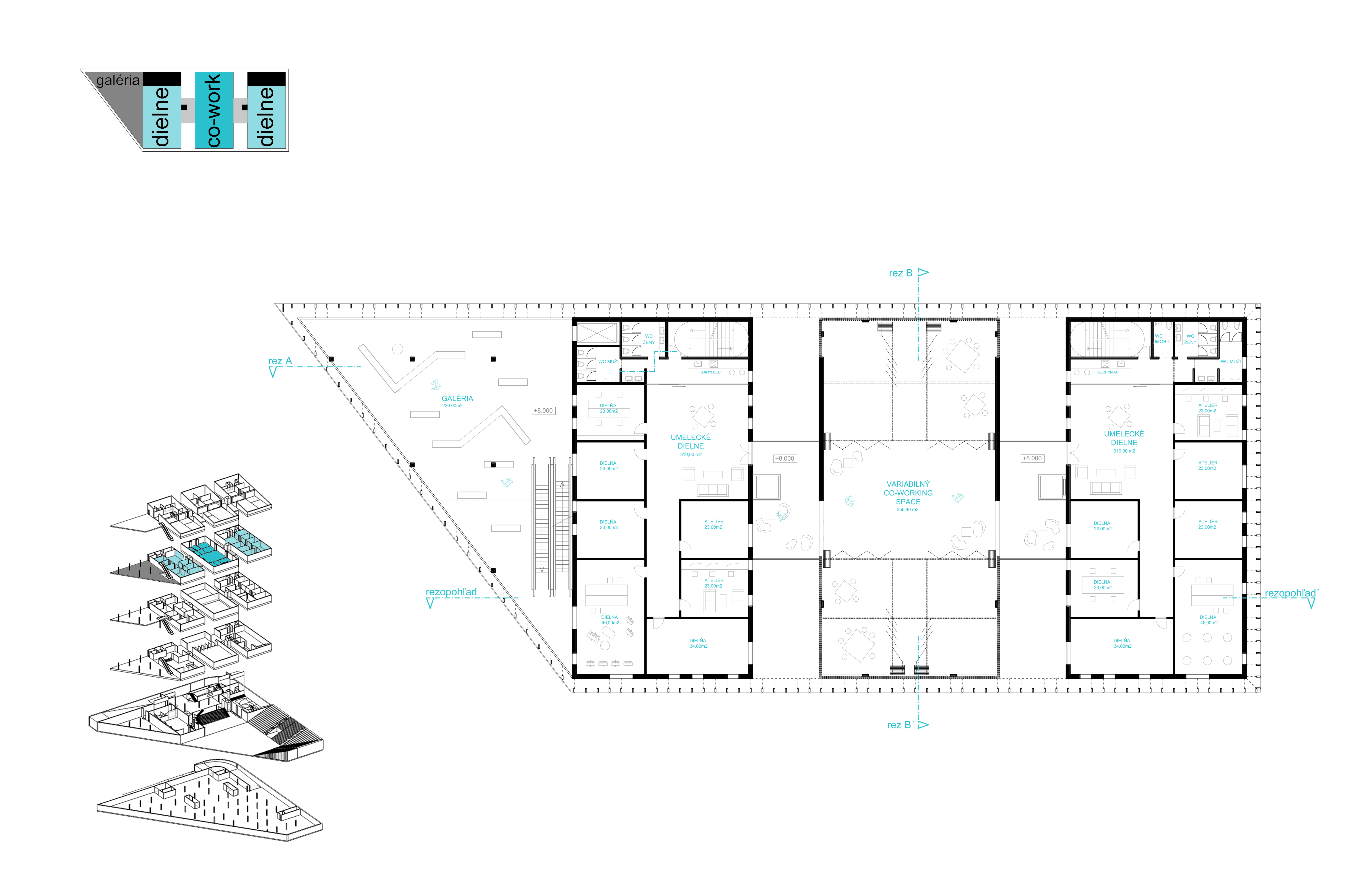 V úrovni 3.NP sa nachádzajú uzavreté umelecké dielne a ateliéry, ktoré sú podporené veľkým otvoreným co-working spaceom v stredovom boxe. Tento priestor je možné využívať variabilne. Pomocou posuvných priečok sa dá členiť na menšie priestory alebo využívať na výstavy a eventy organizované umeleckou komunitou, ktorá sa tu bude stretávať.