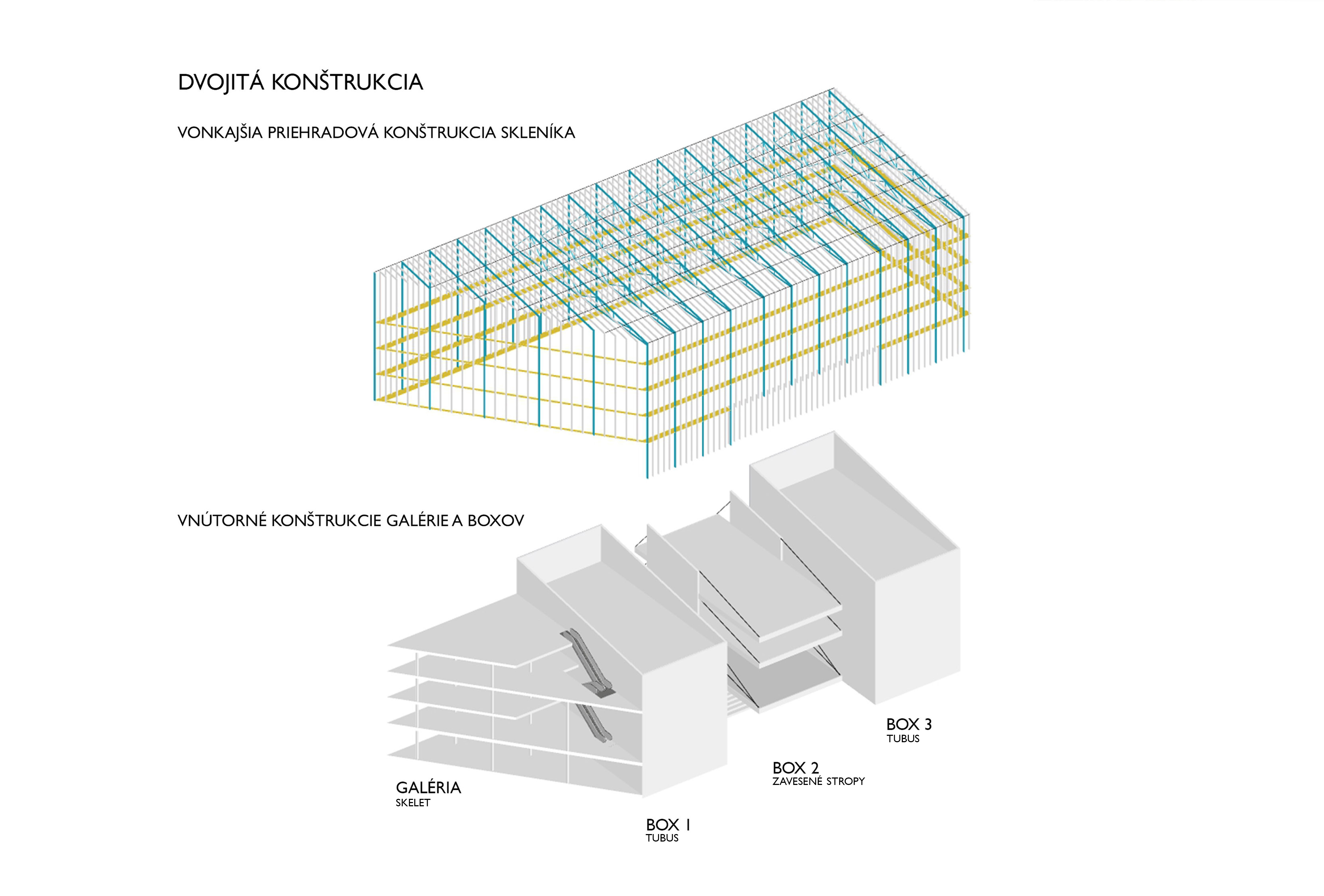 Objekt má niekoľko konštrukčných systémov, nakoľko pôsobí ako budovy v budove. V podzemných podlažiach, je skeletový systém, s modulom 8,1 x 8,1 alebo 8,1 x 5,4. Jednotlivé boxy fungujú ako tubusy s rozponom 13,5 m (8,1 + 5,4). Tento rozpon je prekonaný pomocou cobiaxových stropných dosiek. Stredový box má trochu zložitejšiu konštrukciu, kvôli vykrojenému auditóriu v úrovni 1.PP. Na pravej a ľavej strane sú stužujúce nosné steny, na ktoré sú zavesené vykonzolované stropné dosky. Samotná konštrukcia skleníka je tvorená oceľovou stĺpikovou a priehradovou konštrukciou. Na ňu sú pripevnené sklenené panely. So zvyškom budovy je stužená pomocou pochôdznych mostíkov po obvode. Vzdialenosť jednotlivých stĺpikov je 0,9 m. táto dĺžka sa stala aj základnou jednotkovou mierkou pri celom návrhu, jej násobkom vznikli proporcie jednotlivých miestnosti, veľkosti okenných otvorov, aj samotný konštrukčný systém.