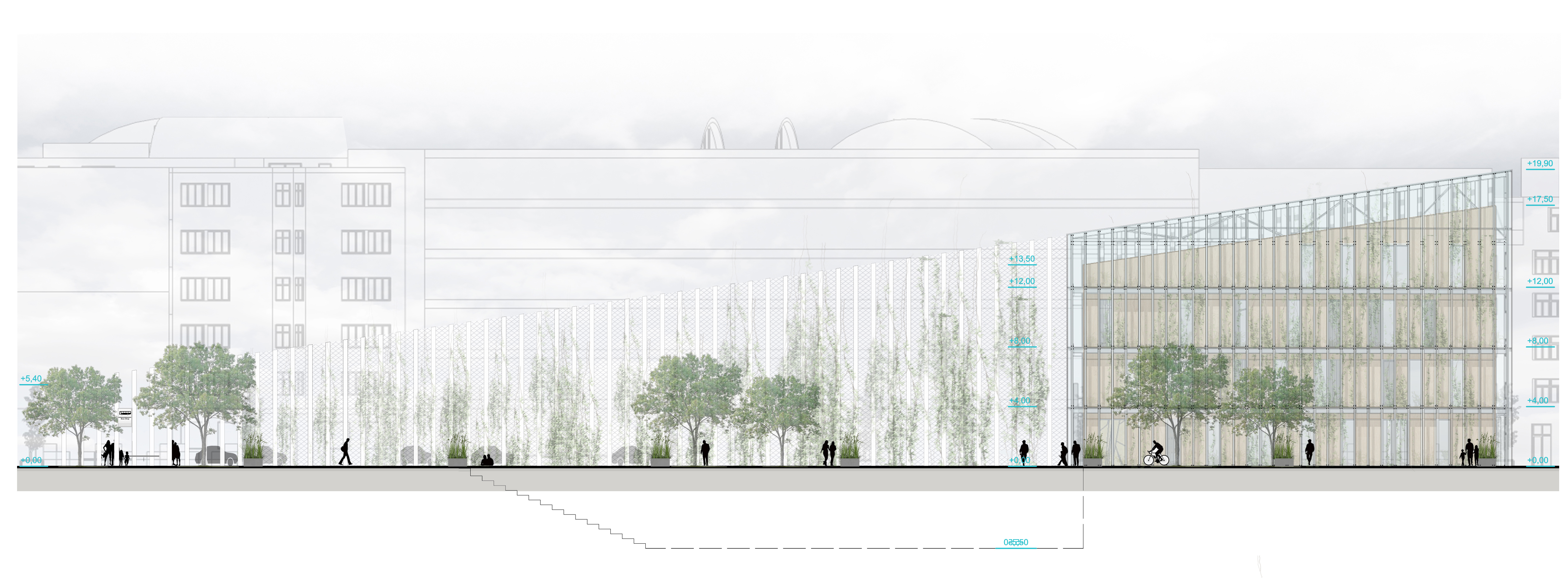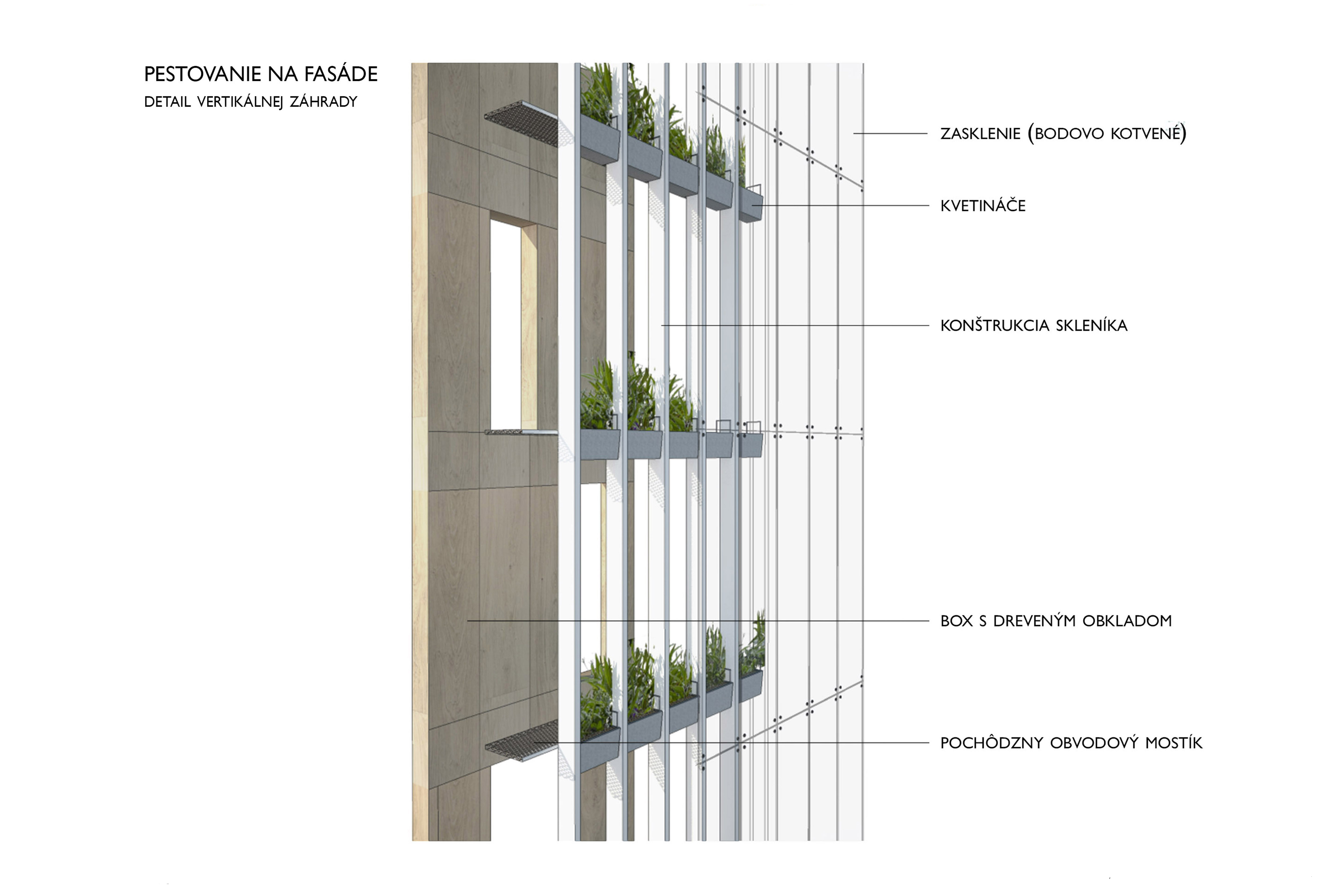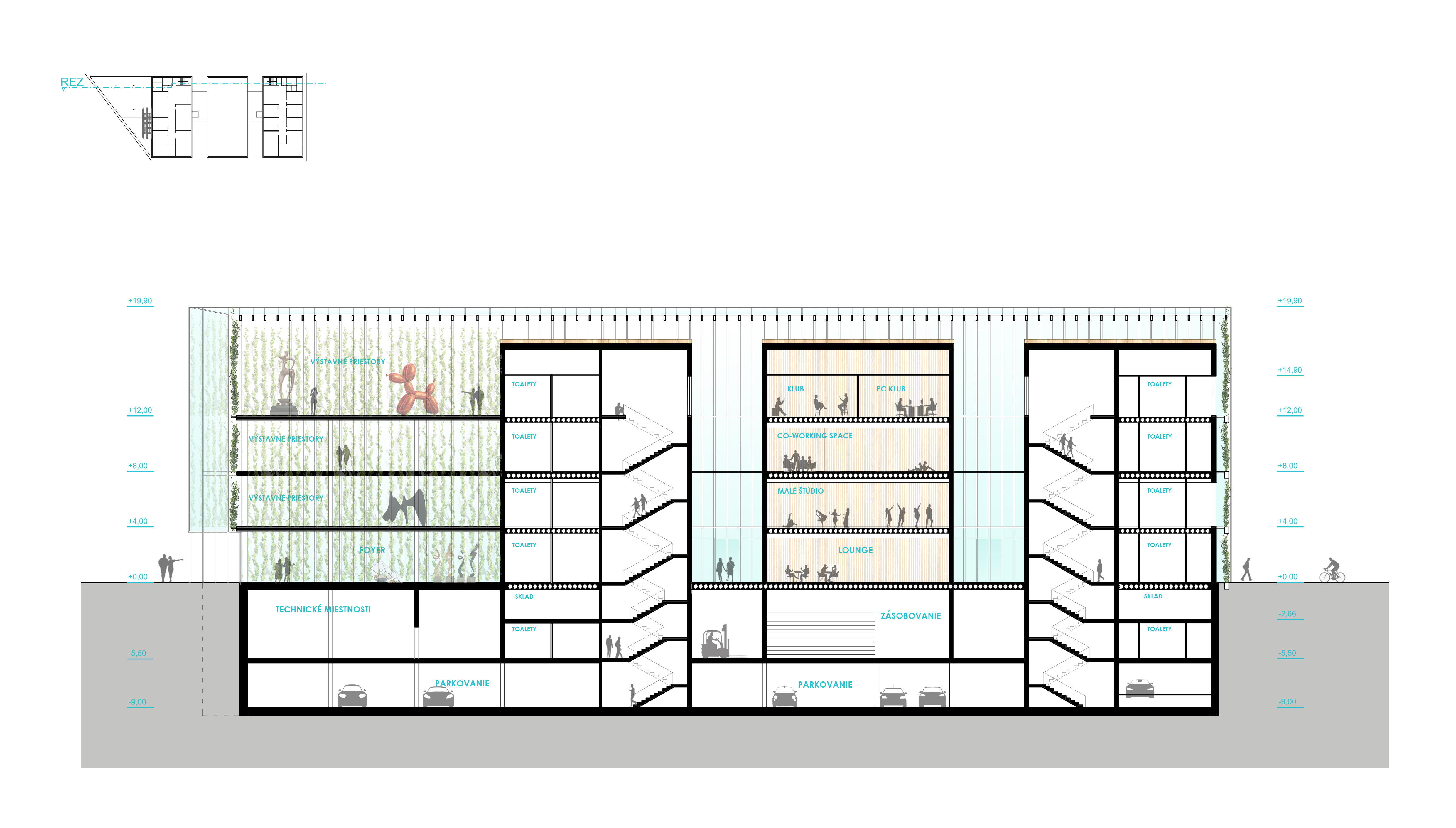 Pôdorysný tvar budovy aj priľahlého námestia vychádza z urbanistickej štúdie. Jeho hrany určuje cestná komunikácia a rovnobežky železničných domov. Základná hmota je vytiahnutá na úroveň hrebeňov okolitej zástavby a klesá smerom dolu do úrovne odkvapových rúr. Vďaka tomu pôsobí budova menej mohutne. Samotná hmota je rozdelené na tri obdĺžnikové boxy obalené skleníkovou konštrukciou, ktorá ponúka dodatočné pobytové a zhromažďovacie priestory, V úrovni 1.PP budova ústi do námestia, a vytvára tak príjemný verejný priestor na oddych a rôzne kultúrne akcie. Svojim stvárnením sa budova otvára okoliu a je možné sledovať život v nej. Samotné boxy potom zastrešujú funkcie, ktoré vyžadujú uzavretejšiu prevádzku. Samotný skleník funguje nielen ako ďalší pobytový priestor. Spolu s boxmi, vytvára dvojitú fasádu, vďaka čomu v lete jednotlivé boxy ochladzuje a v zime ich môže dokurovať z medzipriestoru. V neposlednom rade funguje aj ako skleník na pestovanie ovocia a zeleniny. Predlžuje pestovateľskú sezónu. Dopestovaná zelenina a ovocie môžu ďalej putovať na trhovisko v podchode. V okrajovej časti budovy, ktorá ma trojuholníkový tvar a je prekryté len sklenenou konštrukciou, vznikli galeríjne a eventové priestory. Tieto reprezentatívne priestory je možné vidieť od cesty a odkrývajú dianie v spoločenskom centre. Sklon strechy budovy dovolil vytvoriť tri veľké pobytové terasy, ktoré sa môžu využívať na rôzne účely.