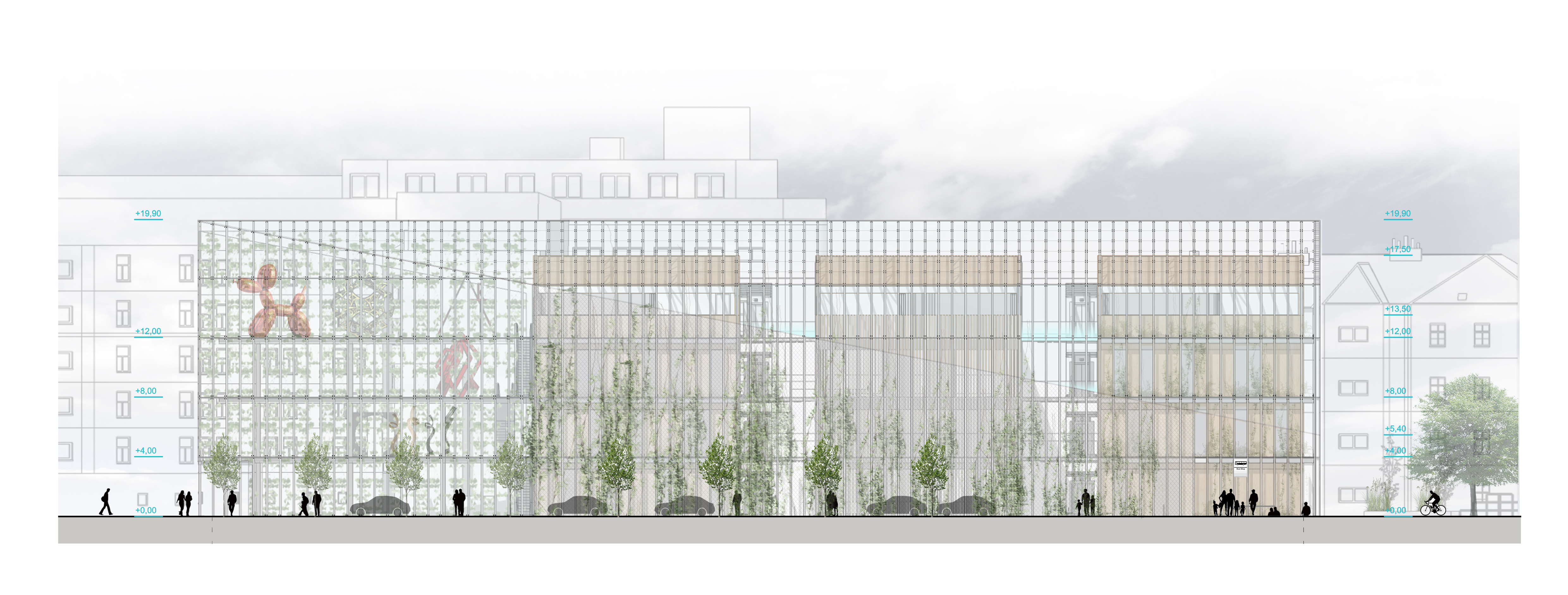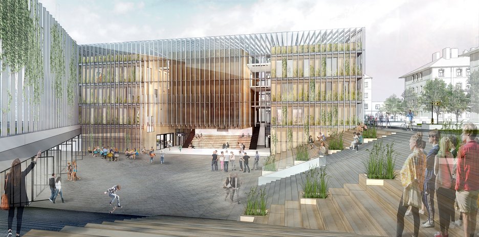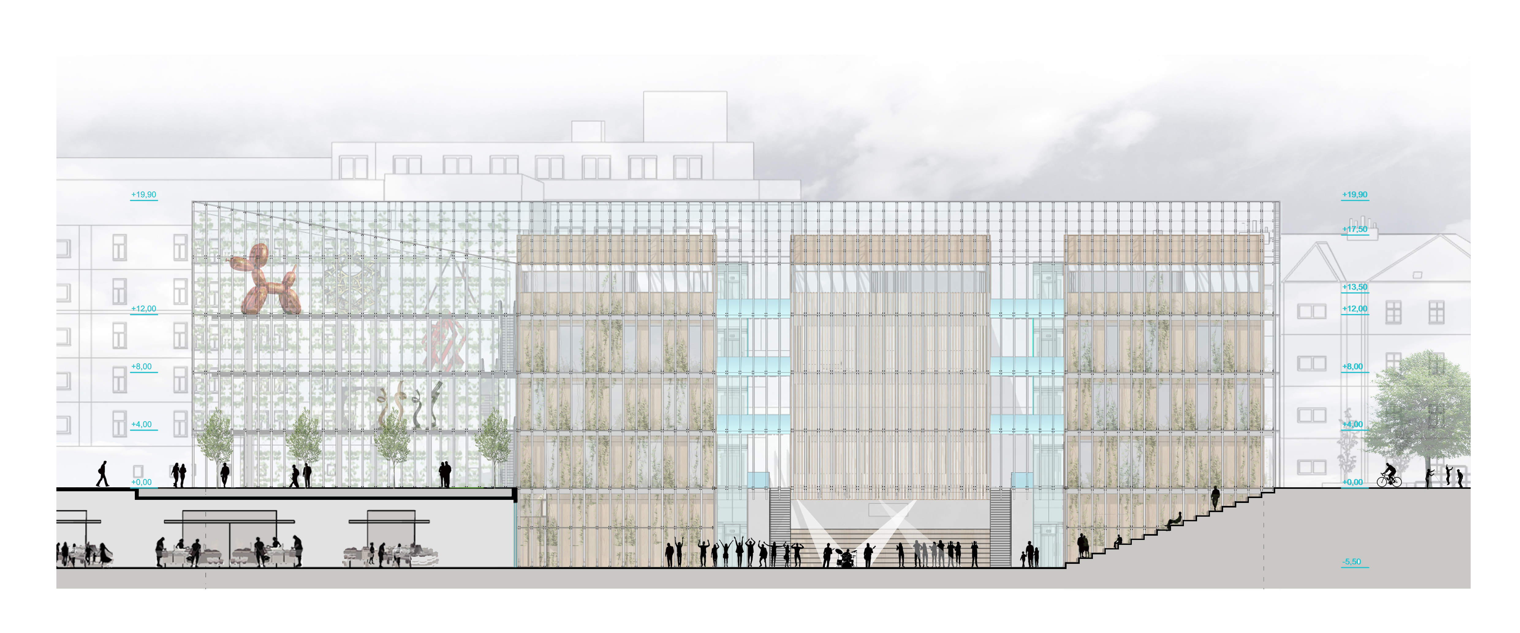 Pôdorysný tvar budovy aj priľahlého námestia vychádza z urbanistickej štúdie. Jeho hrany určuje cestná komunikácia a rovnobežky železničných domov. Základná hmota je vytiahnutá na úroveň hrebeňov okolitej zástavby a klesá smerom dolu do úrovne odkvapových rúr. Vďaka tomu pôsobí budova menej mohutne. Samotná hmota je rozdelené na tri obdĺžnikové boxy obalené skleníkovou konštrukciou, ktorá ponúka dodatočné pobytové a zhromažďovacie priestory, V úrovni 1.PP budova ústi do námestia, a vytvára tak príjemný verejný priestor na oddych a rôzne kultúrne akcie. Svojim stvárnením sa budova otvára okoliu a je možné sledovať život v nej. Samotné boxy potom zastrešujú funkcie, ktoré vyžadujú uzavretejšiu prevádzku. Samotný skleník funguje nielen ako ďalší pobytový priestor. Spolu s boxmi, vytvára dvojitú fasádu, vďaka čomu v lete jednotlivé boxy ochladzuje a v zime ich môže dokurovať z medzipriestoru. V neposlednom rade funguje aj ako skleník na pestovanie ovocia a zeleniny. Predlžuje pestovateľskú sezónu. Dopestovaná zelenina a ovocie môžu ďalej putovať na trhovisko v podchode. V okrajovej časti budovy, ktorá ma trojuholníkový tvar a je prekryté len sklenenou konštrukciou, vznikli galeríjne a eventové priestory. Tieto reprezentatívne priestory je možné vidieť od cesty a odkrývajú dianie v spoločenskom centre. Sklon strechy budovy dovolil vytvoriť tri veľké pobytové terasy, ktoré sa môžu využívať na rôzne účely.