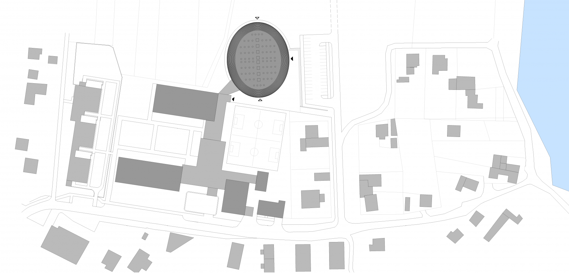 Budova stojí na hrane zastavaného územia, v ťažisku veľkej rozvojovej plochy. Atraktívny architektonický koncept - priestorový objekt v tvare rotačného elipsoidu - reaguje na súčasné požiadavky aj neznámu budúcnosť. Realizácia a prevádzka haly môžu byť impulzom a inšpiráciou pre ďalší rast obce, preto má väzba na okolie a verejný priestor rovnaký význam ako prirodzené napojenie na základnú školu.