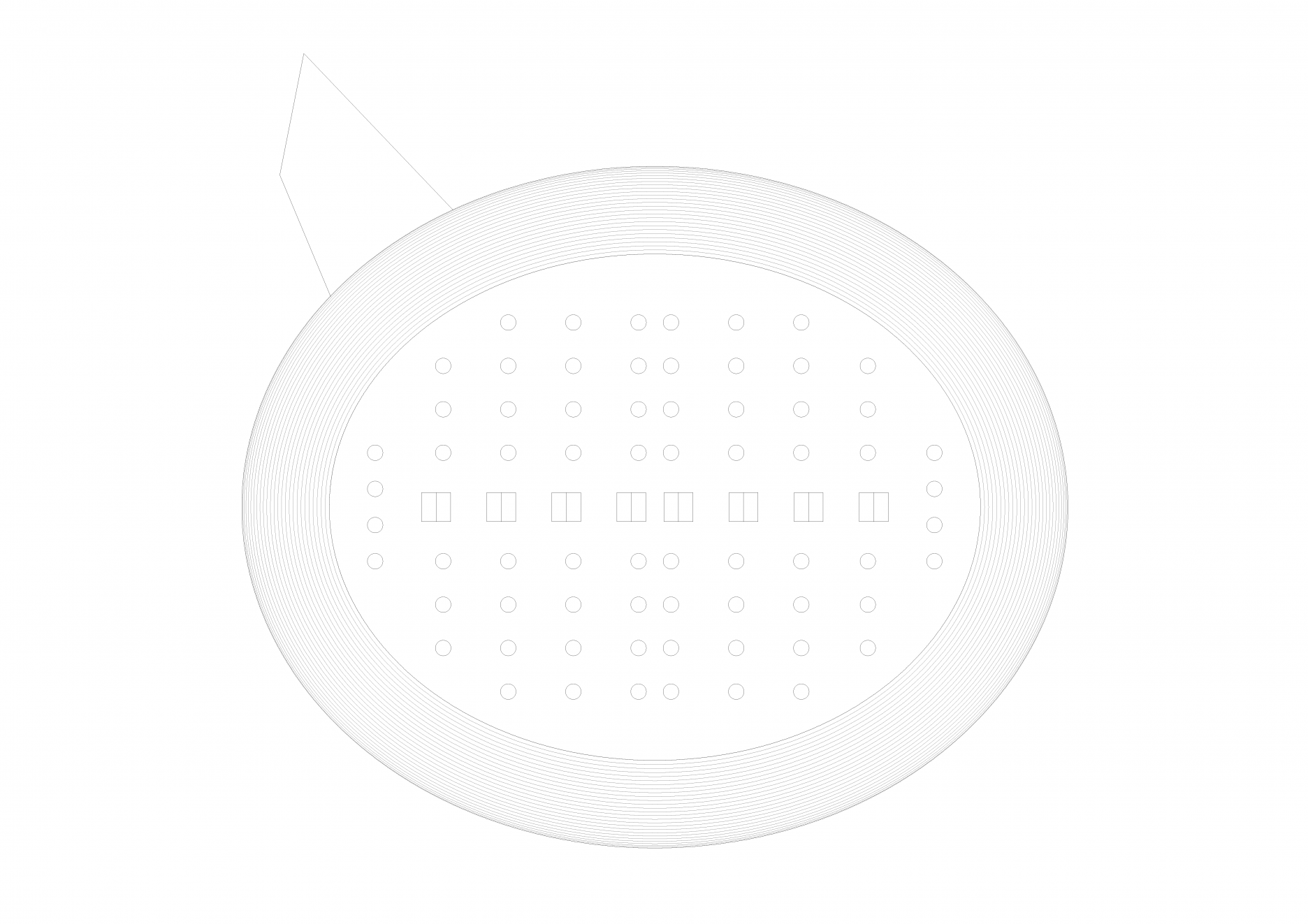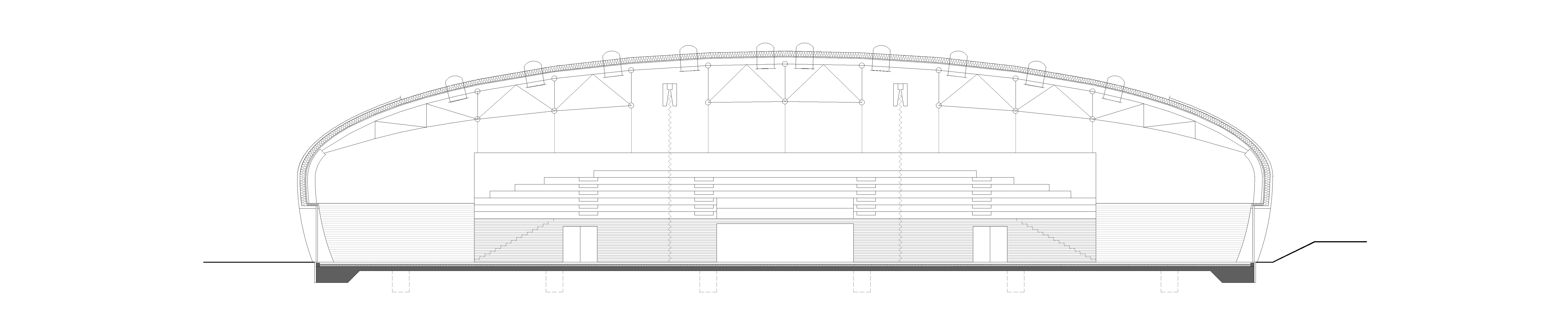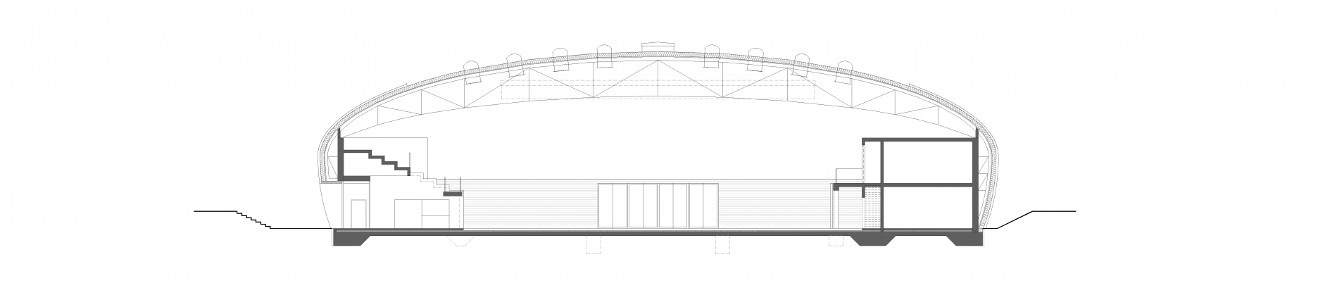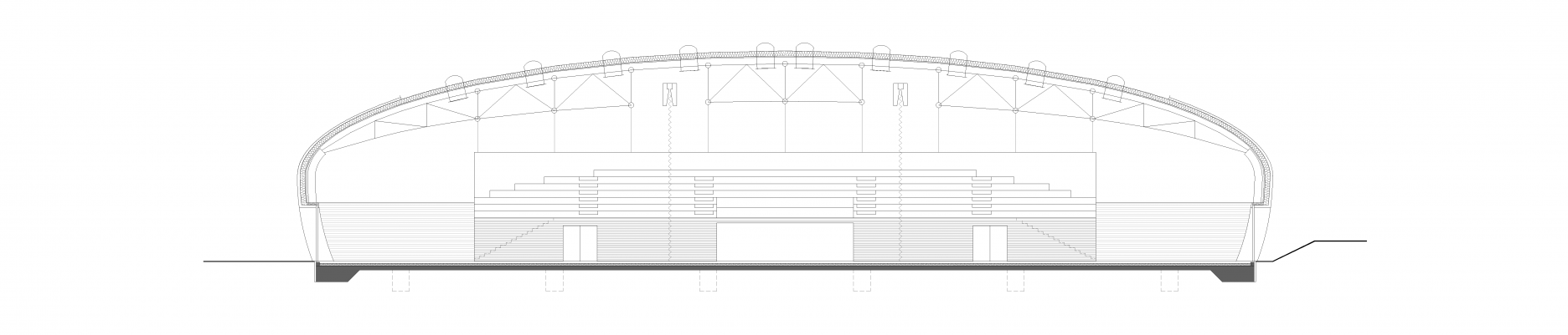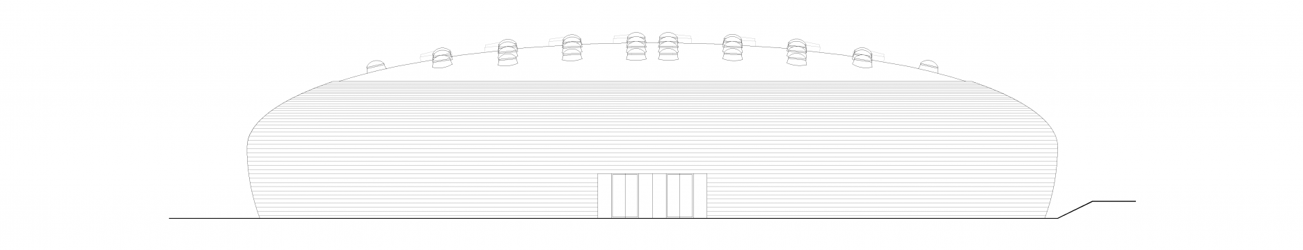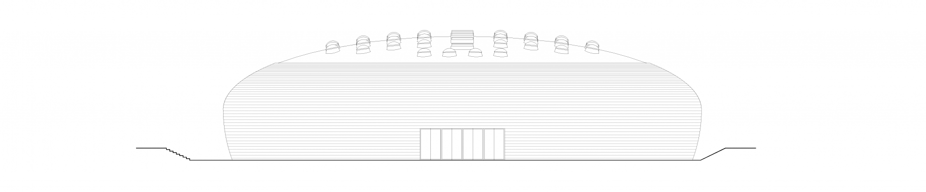 “Tvar haly je oblý, hladký a abstraktní. Kupole přibližuje měřítko člověku, kovový povrch zrcadlí okolí, hranice oblohy a střechy je nejasná,” priblžujú návrh autori. Stavba dobre maskuje svoje skutočné rozmery. Široké schodisko pred halou vzniklo vďaka zapusteniu stavby do terénu, vymedzuje hranicu verejného priestoru a tvorí prirodzený amfiteáter.