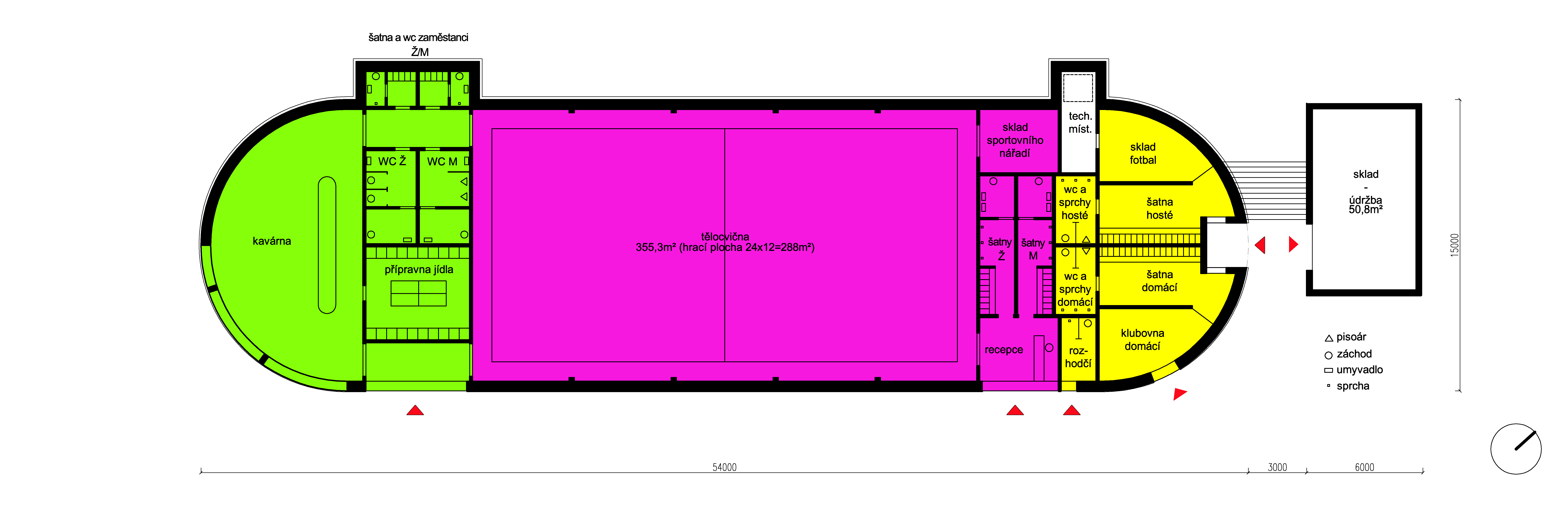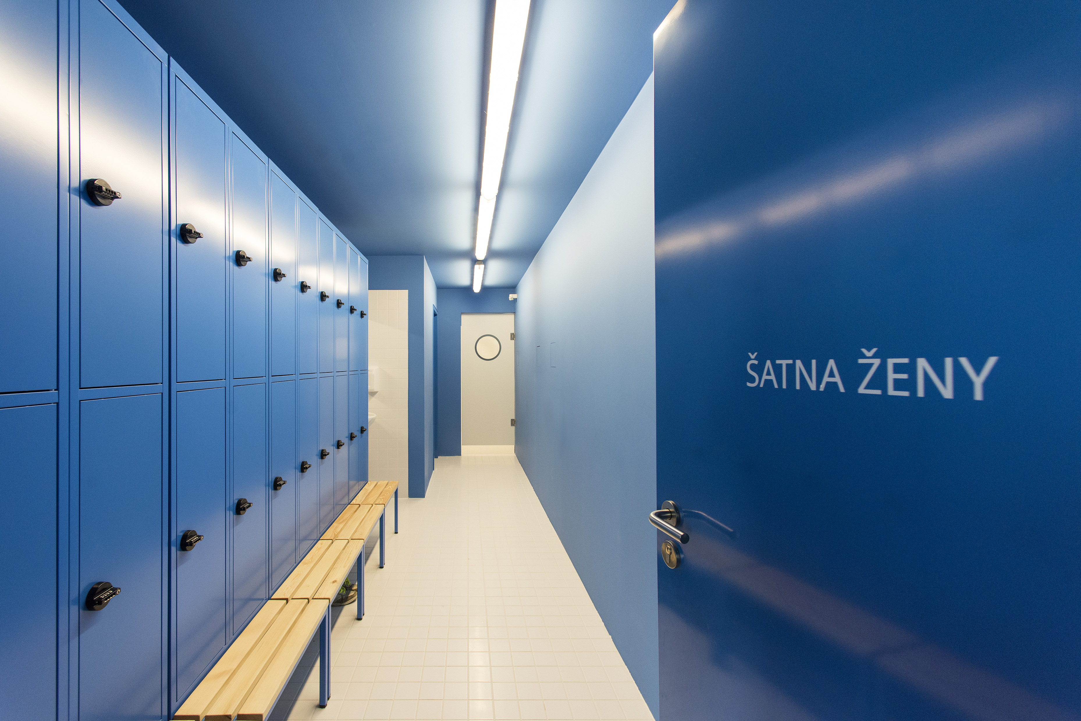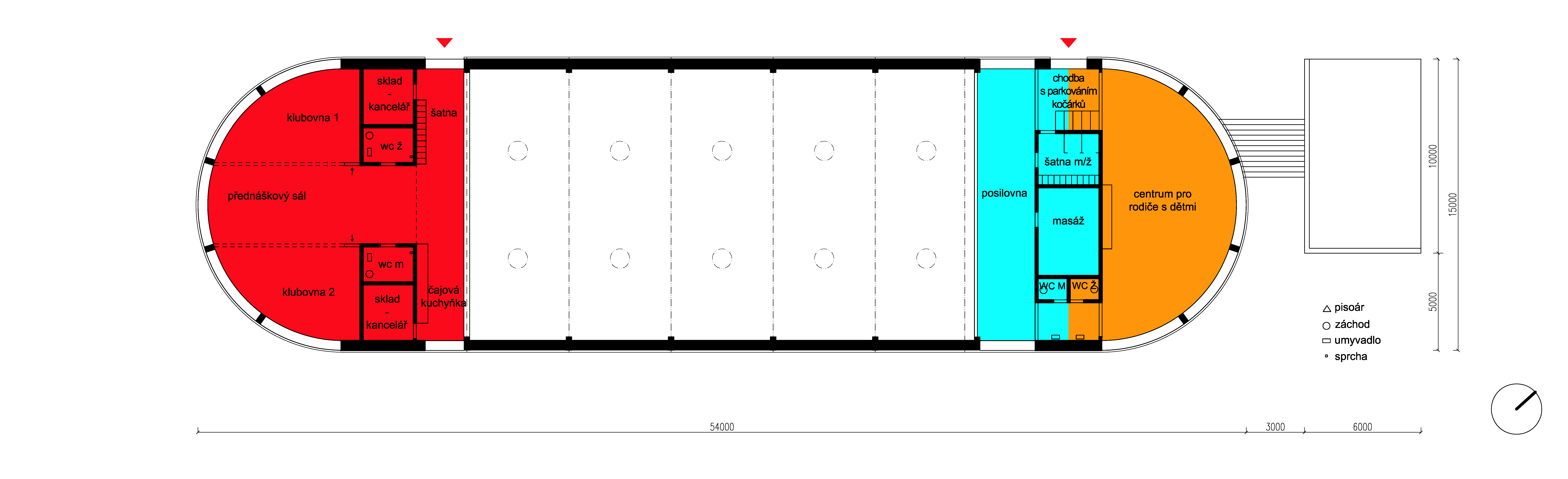 Snaha o čo najefektívnejšie využitie rozpočtu sa odrazila aj v dispozičnom riešení. Hoci ide o dvojpodlažnú stavbu, nenájdeme vnútri schodisko ani chodbu. Objekt je umiestnený vo svahu, na terénnom zlome. Do vrchného podlažia sa vstupuje z ulice, na prízemie od štadiónu. Jednotlivé úrovne nie sú vo vnútri prepojené. Dispozícia je vyriešená tak, že to vo vačšine prípadov neprekáža.
