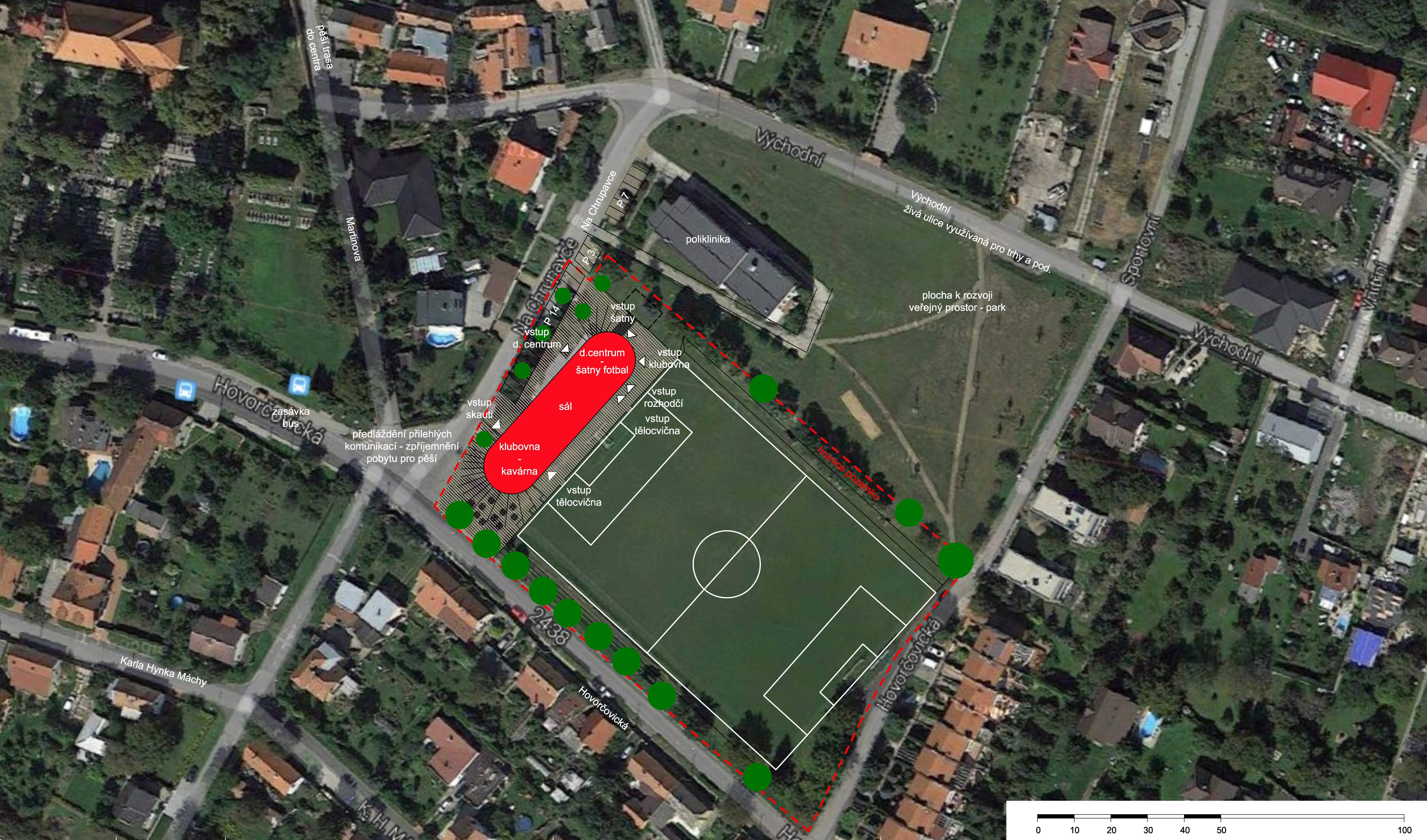 Multifunkčná hala s rozmermi 60 x 20 metrov je situovaná na kratšej strane futbalového ihriska. Funkčne využíva výškový rozdiel medzi ulicou a ihriskom, ktorý predstavuje výšku jedného podlažia. Prízemie je o poschodie nižšie než je úroveň ulice, budova tak neprevyšuje okolitú zástavbu rodinných domov. Jednoduchá geometrická forma haly je podčiarknutá lamelovou fasádou zo smrekovcového dreva.