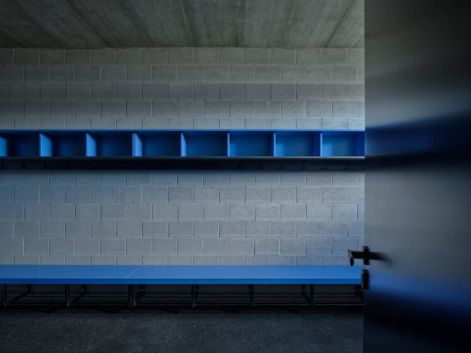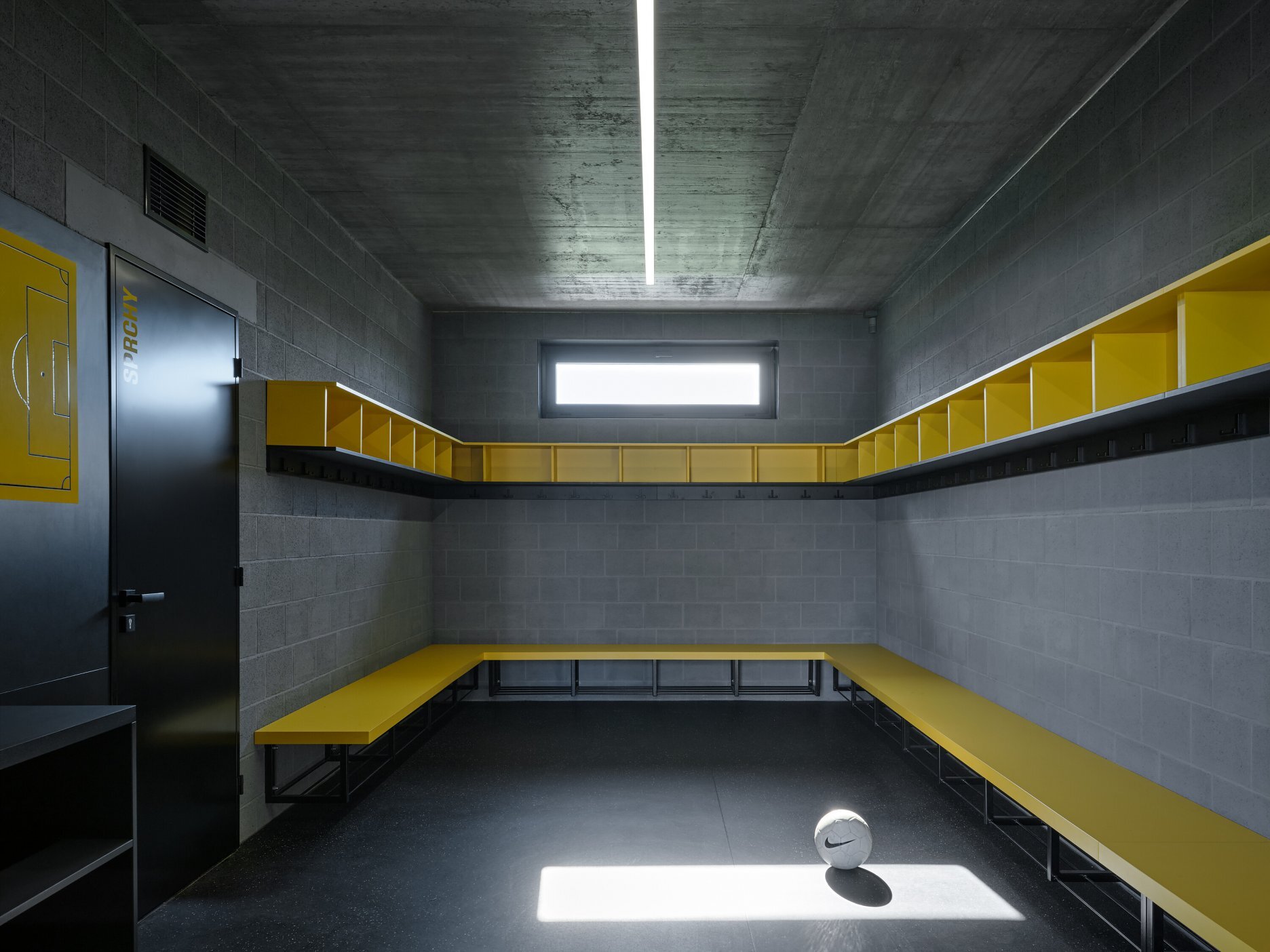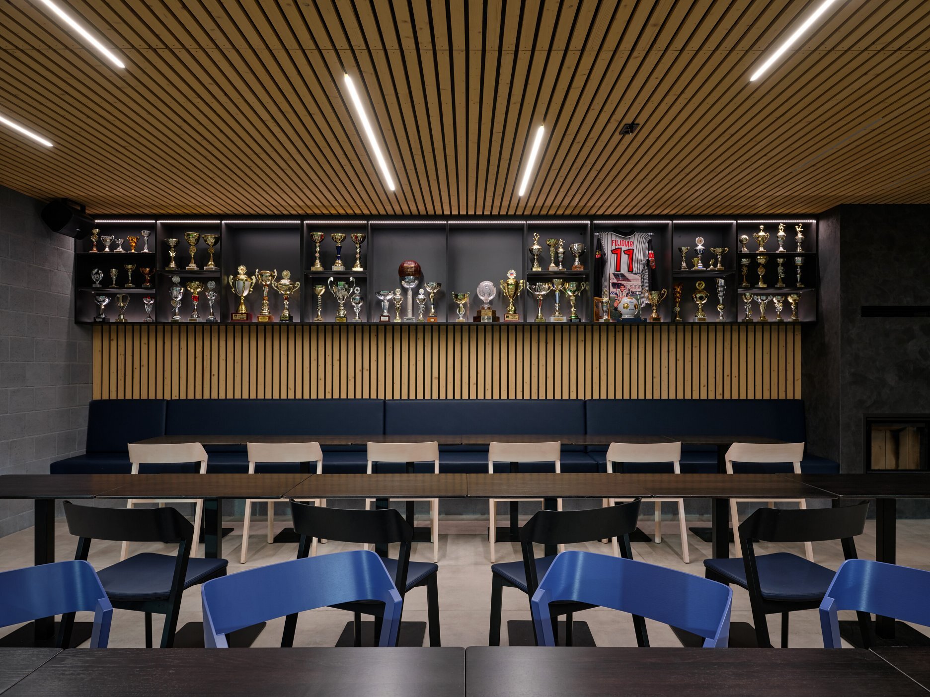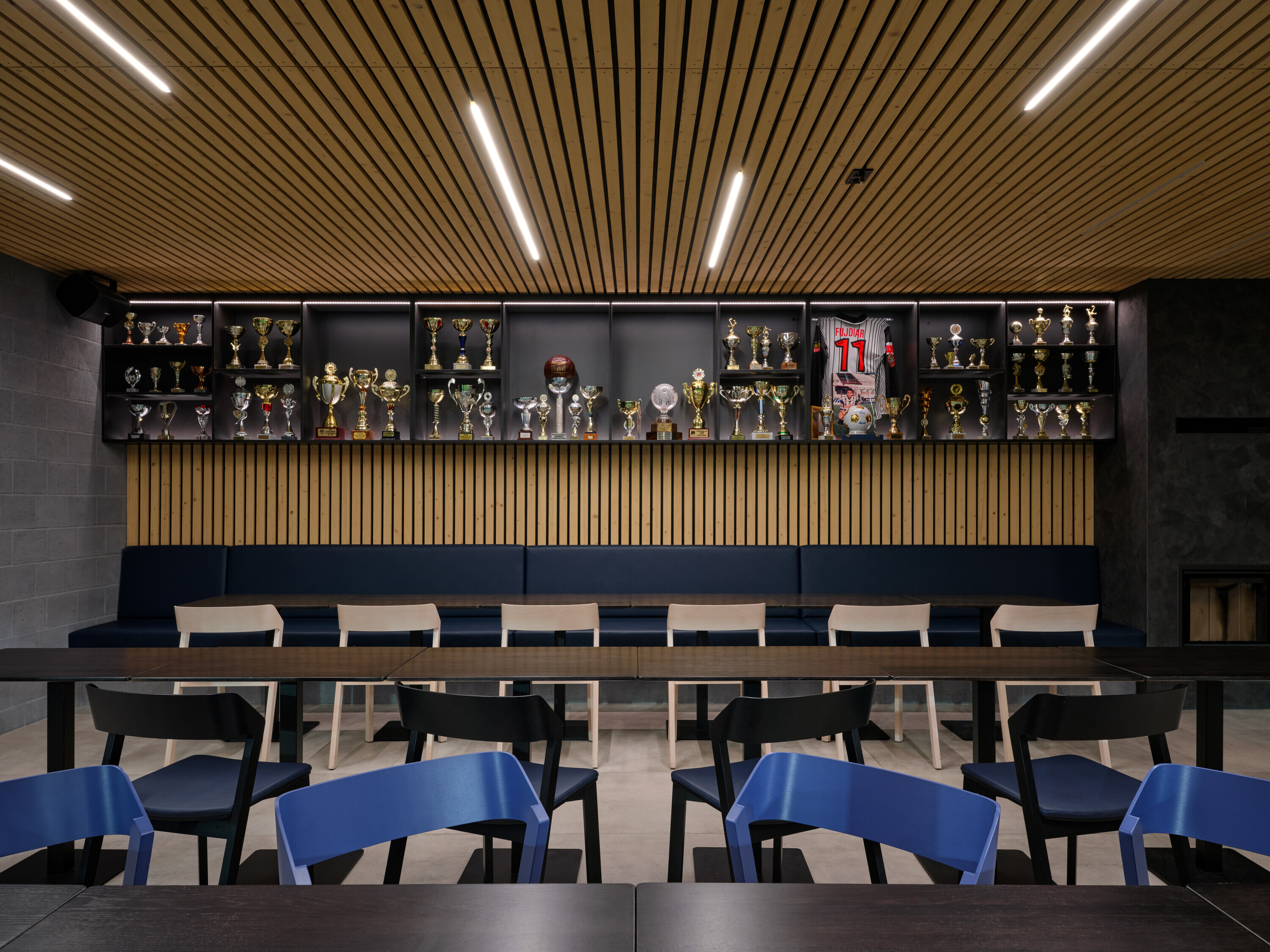 Obvodové steny tvorí pohľadový betón s vloženou tepelnou izoláciou. Betónová štruktúra a modulovosť tvárnic sú priznané v exteriéri aj interiéri, rovnako ako monolitické železobetónové stropy. Tie sú v klubovni doplnené o akustický drevený podhľad, ktorý plynule prechádza do exteriéru. Protikladom k sivému betónu sú výrazné klubové farby – leitmotívom celého projektu je modrá v niekoľkých odtieňoch, inšpirovaná vizuálnou identitou klubu.