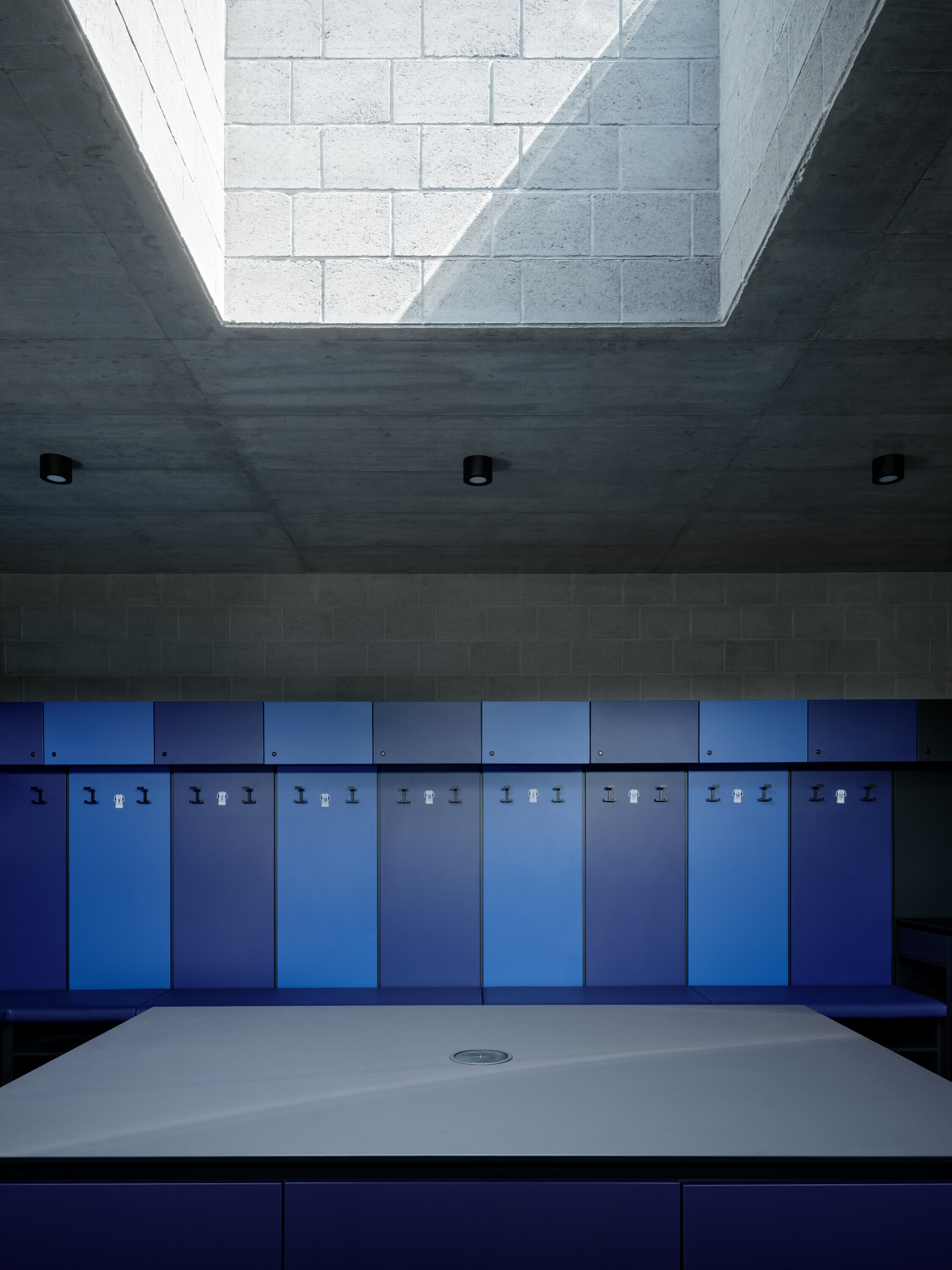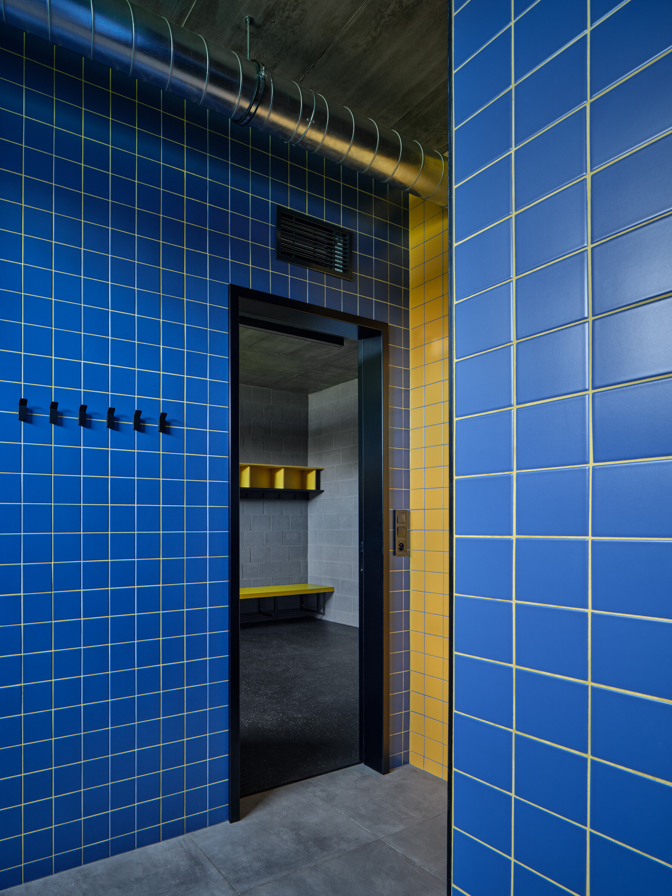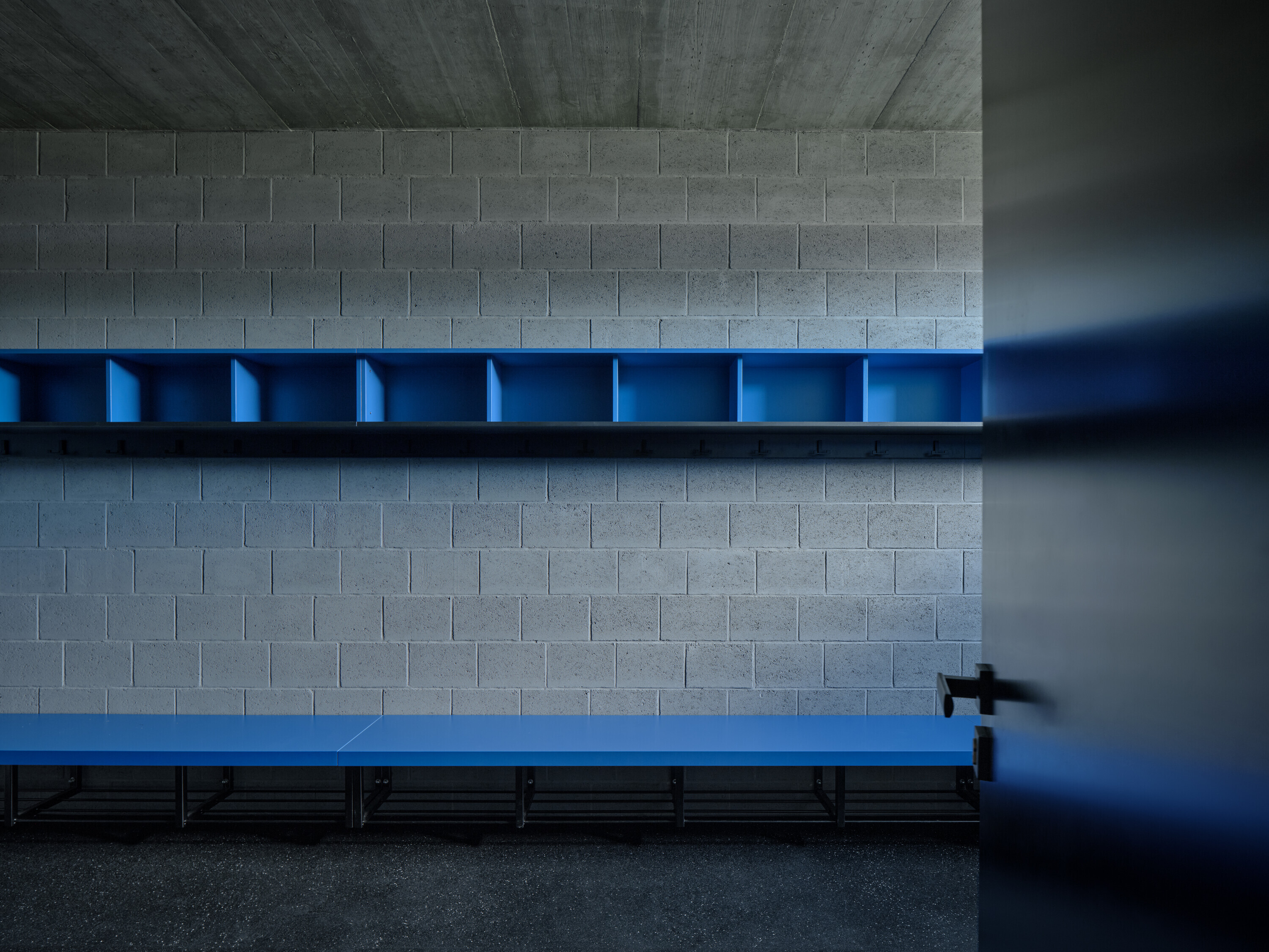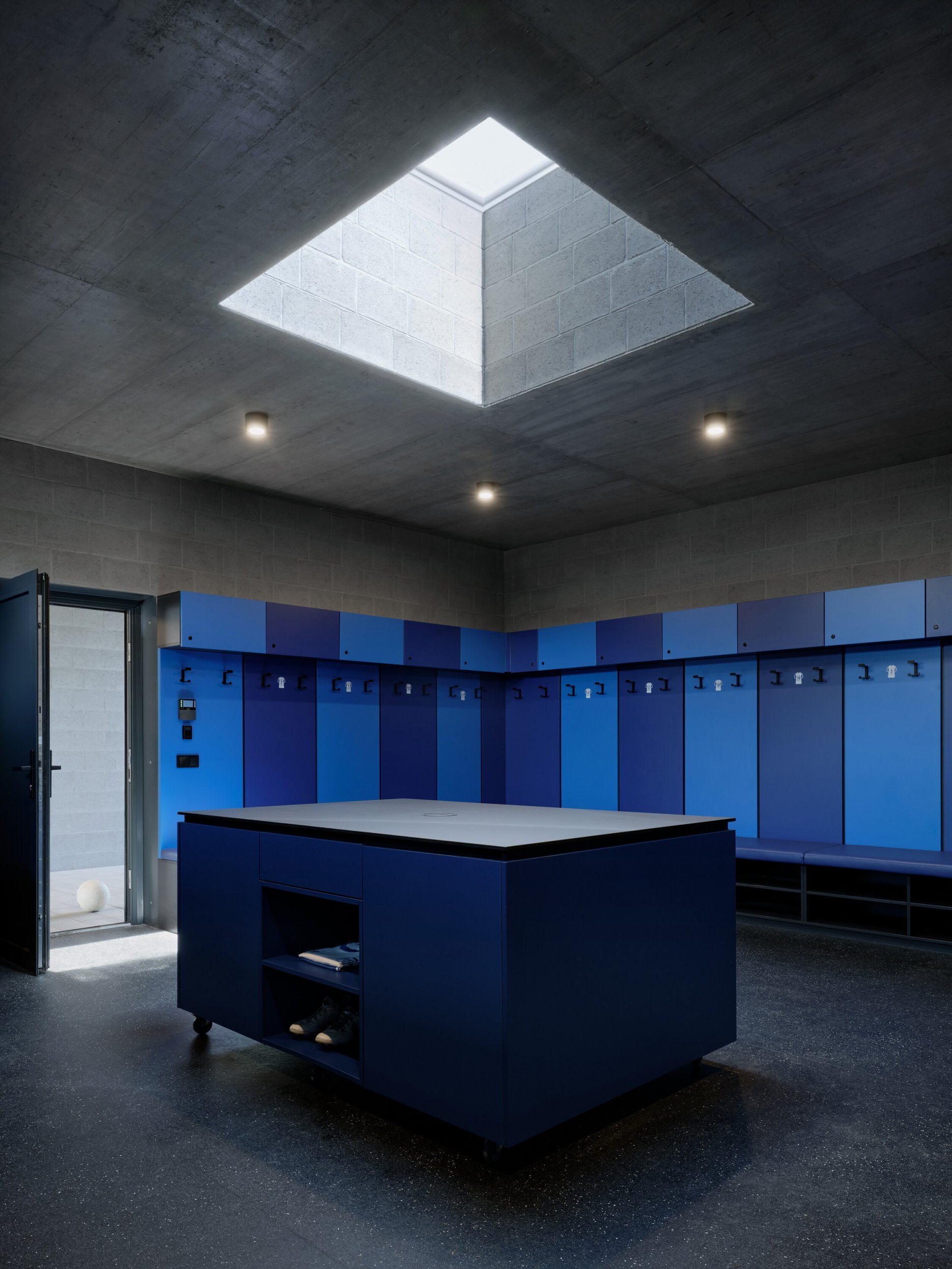 Obvodové steny tvorí pohľadový betón s vloženou tepelnou izoláciou. Betónová štruktúra a modulovosť tvárnic sú priznané v exteriéri aj interiéri, rovnako ako monolitické železobetónové stropy. Tie sú v klubovni doplnené o akustický drevený podhľad, ktorý plynule prechádza do exteriéru. Protikladom k sivému betónu sú výrazné klubové farby – leitmotívom celého projektu je modrá v niekoľkých odtieňoch, inšpirovaná vizuálnou identitou klubu.