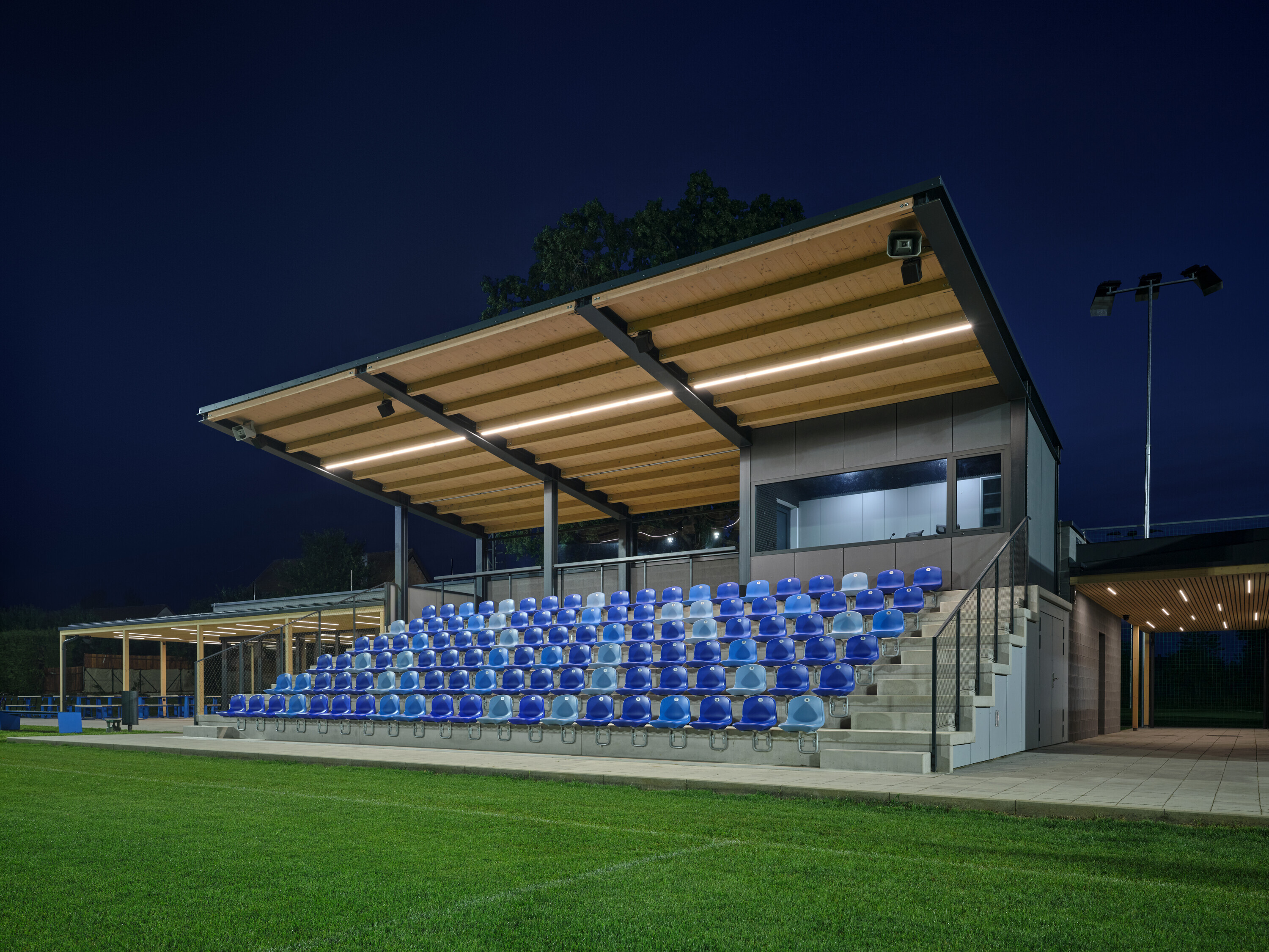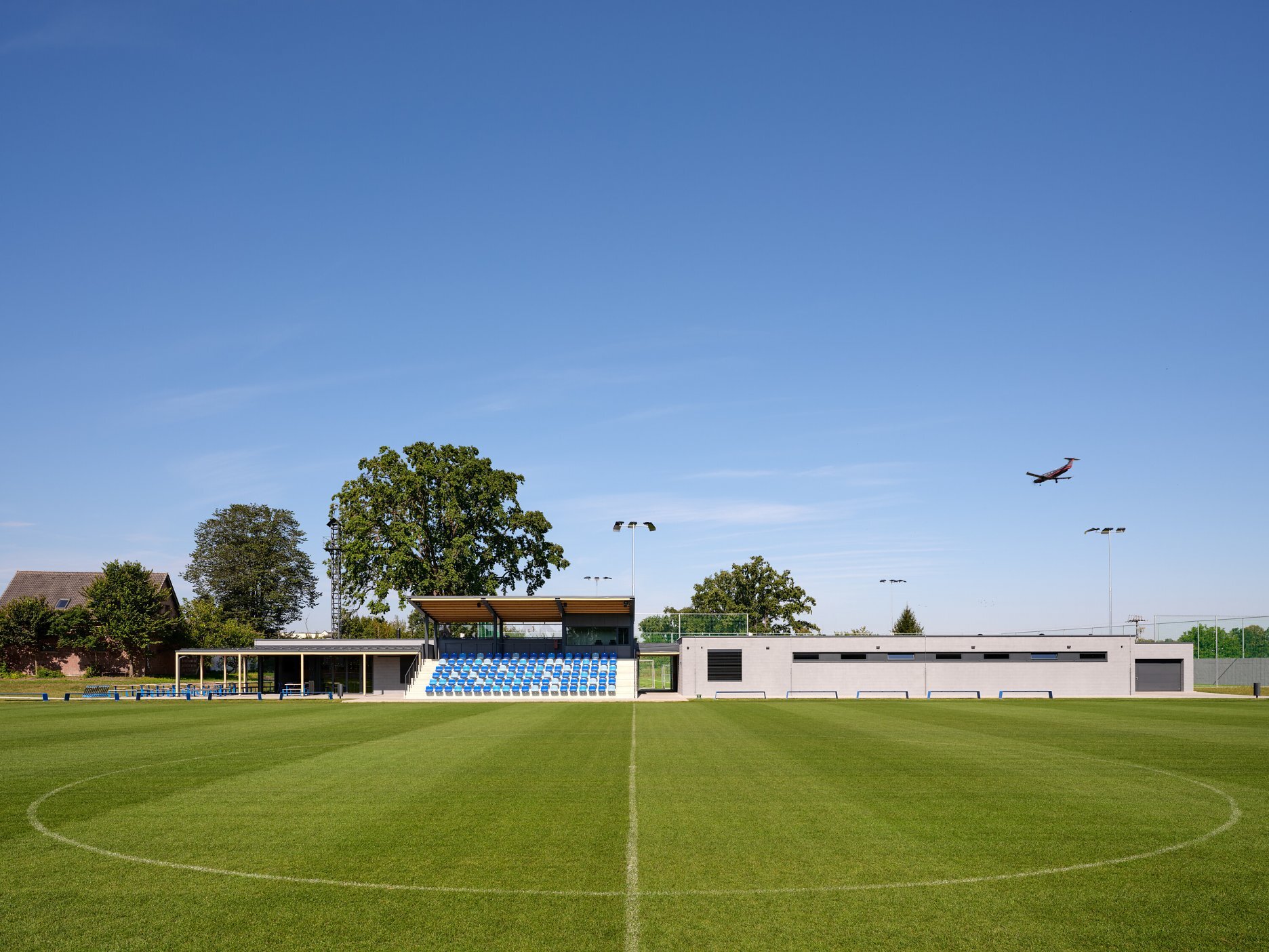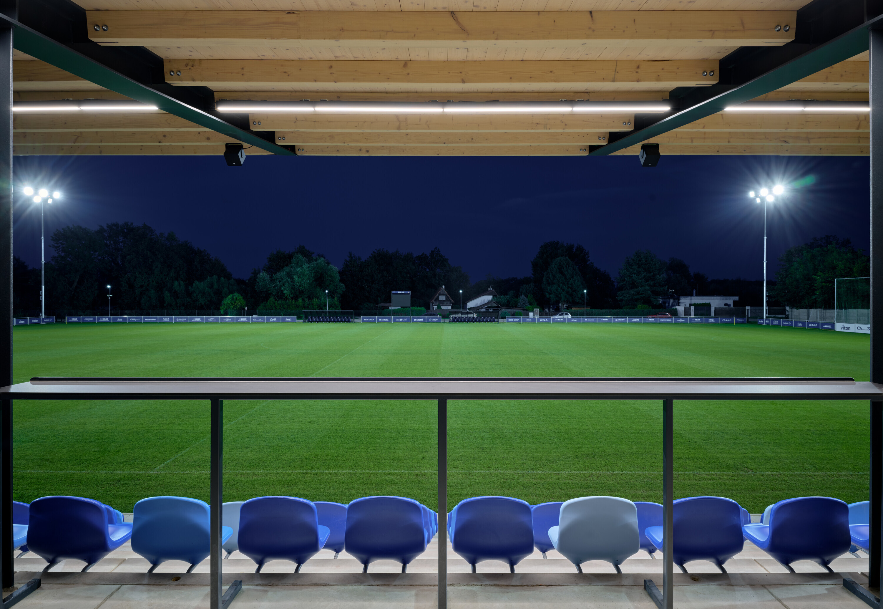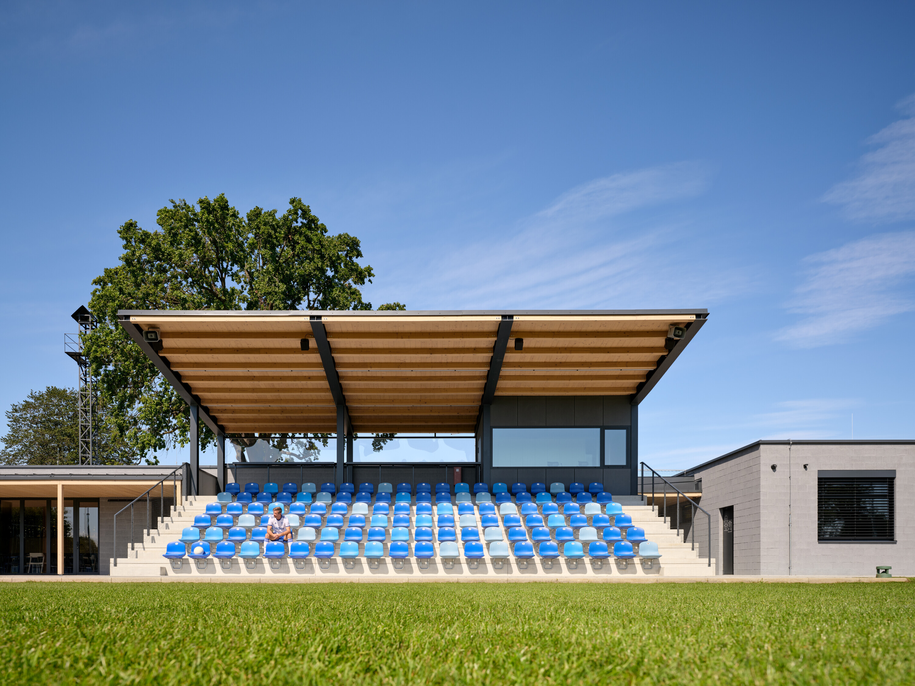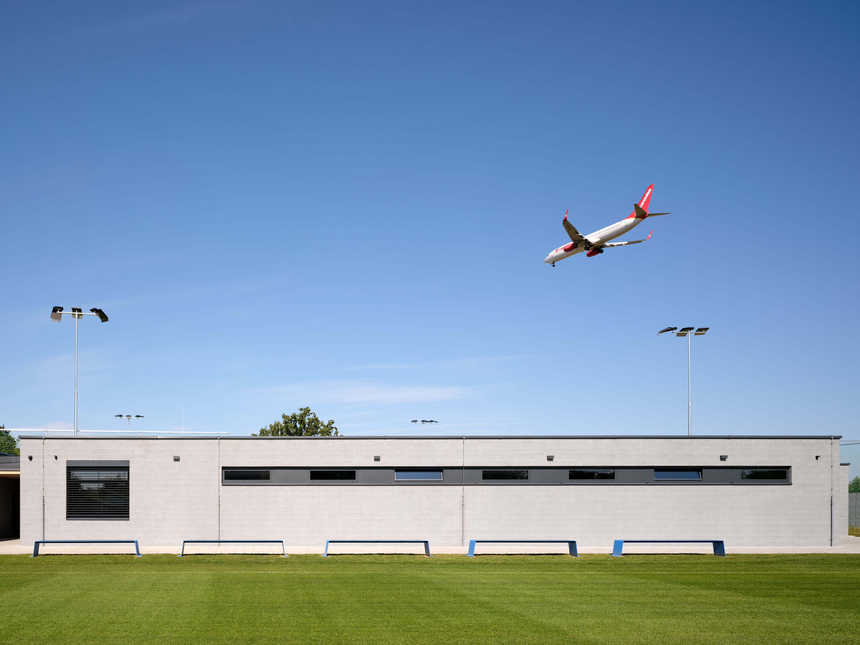Obvodové steny tvorí pohľadový betón s vloženou tepelnou izoláciou. Betónová štruktúra a modulovosť tvárnic sú priznané v exteriéri aj interiéri, rovnako ako monolitické železobetónové stropy. Tie sú v klubovni doplnené o akustický drevený podhľad, ktorý plynule prechádza do exteriéru. Protikladom k sivému betónu sú výrazné klubové farby – leitmotívom celého projektu je modrá v niekoľkých odtieňoch, inšpirovaná vizuálnou identitou klubu.