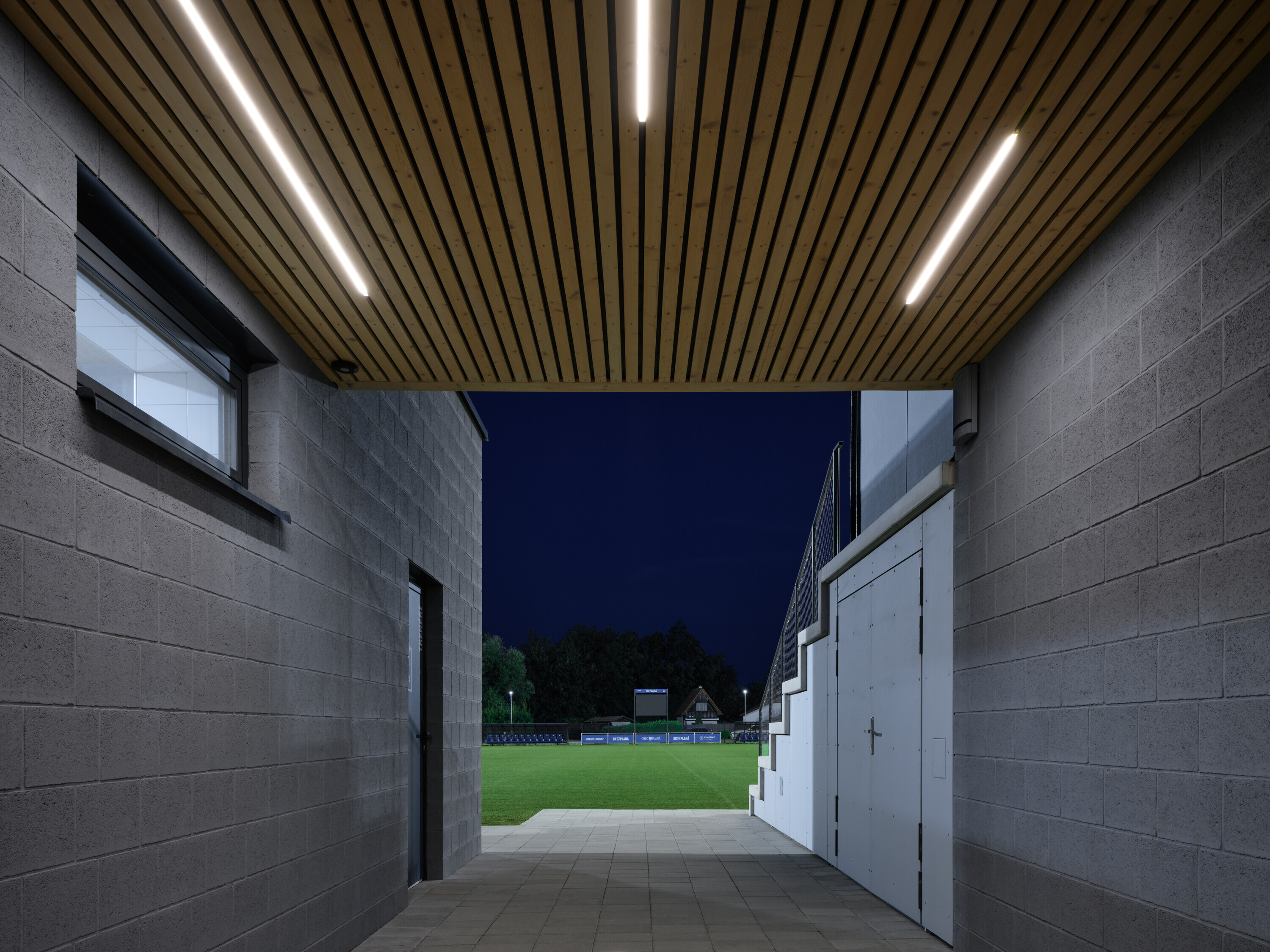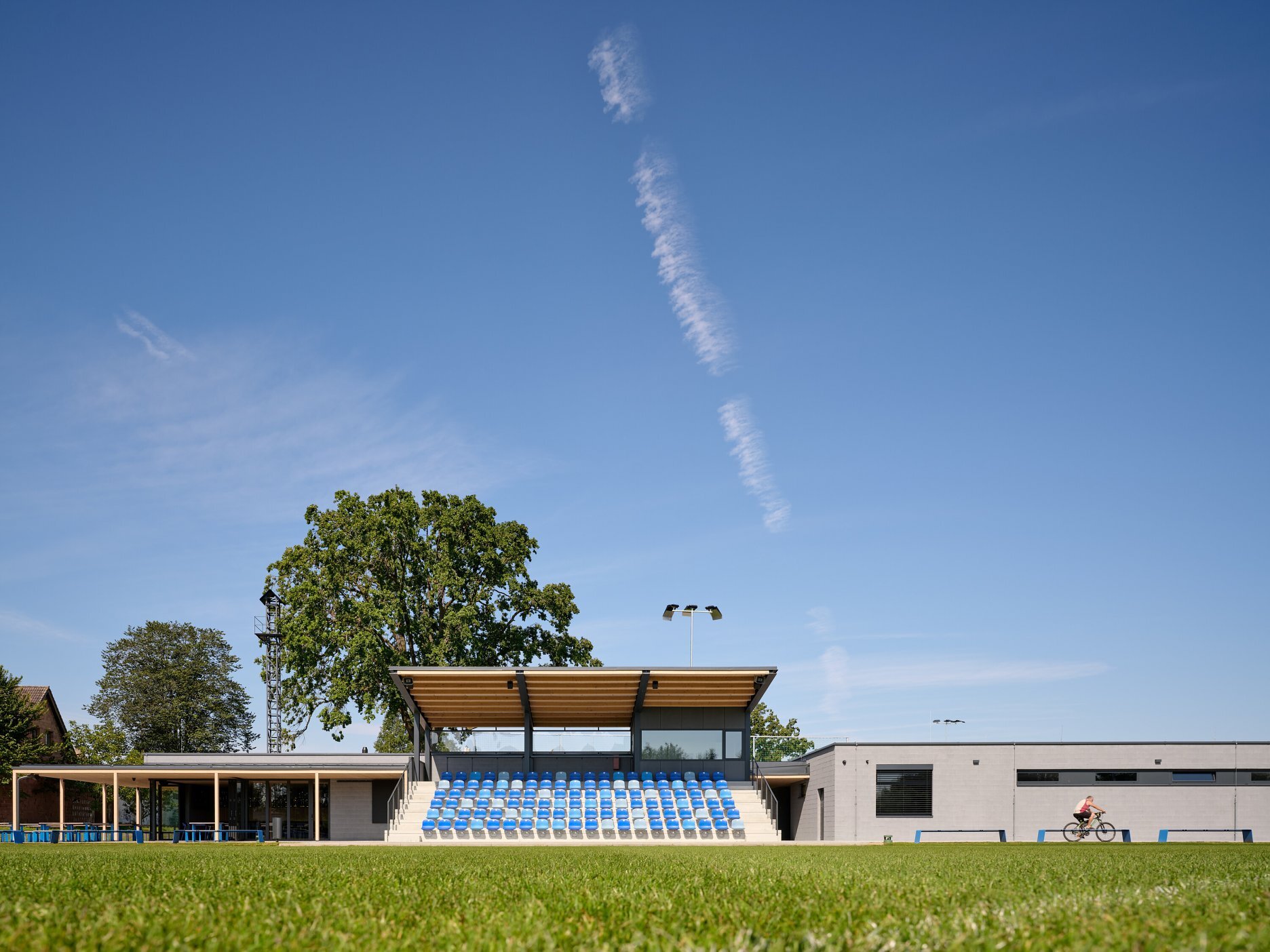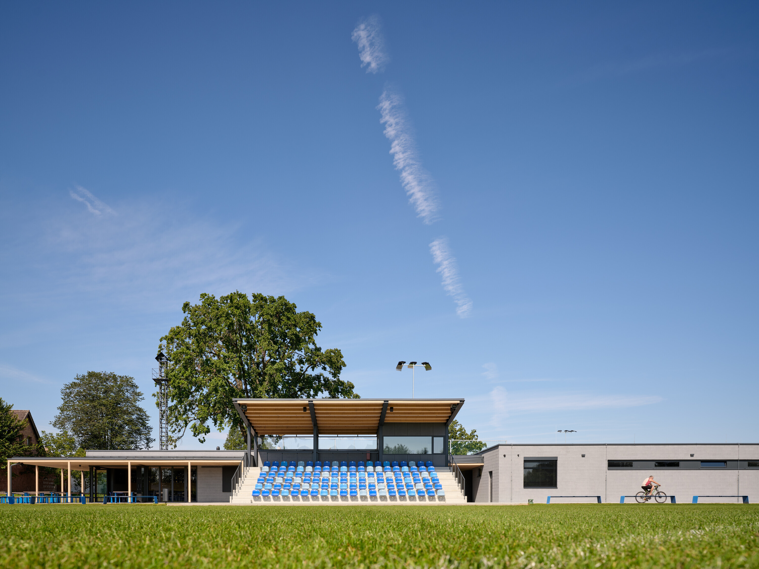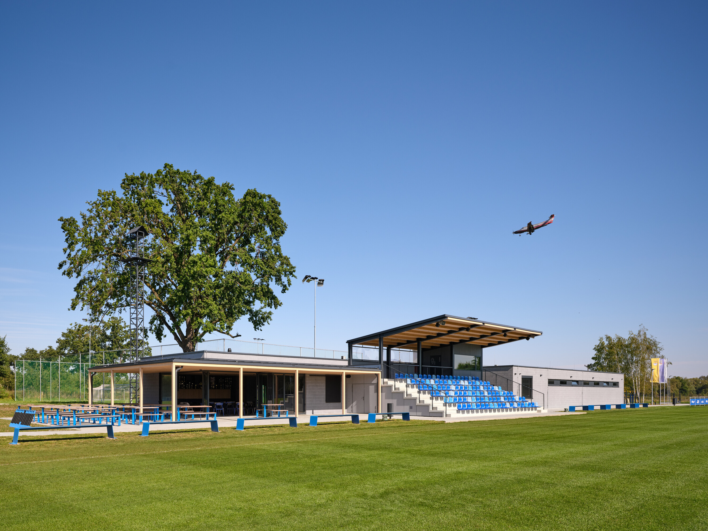 Obvodové steny tvorí pohľadový betón s vloženou tepelnou izoláciou. Betónová štruktúra a modulovosť tvárnic sú priznané v exteriéri aj interiéri, rovnako ako monolitické železobetónové stropy. Tie sú v klubovni doplnené o akustický drevený podhľad, ktorý plynule prechádza do exteriéru. Protikladom k sivému betónu sú výrazné klubové farby – leitmotívom celého projektu je modrá v niekoľkých odtieňoch, inšpirovaná vizuálnou identitou klubu.
